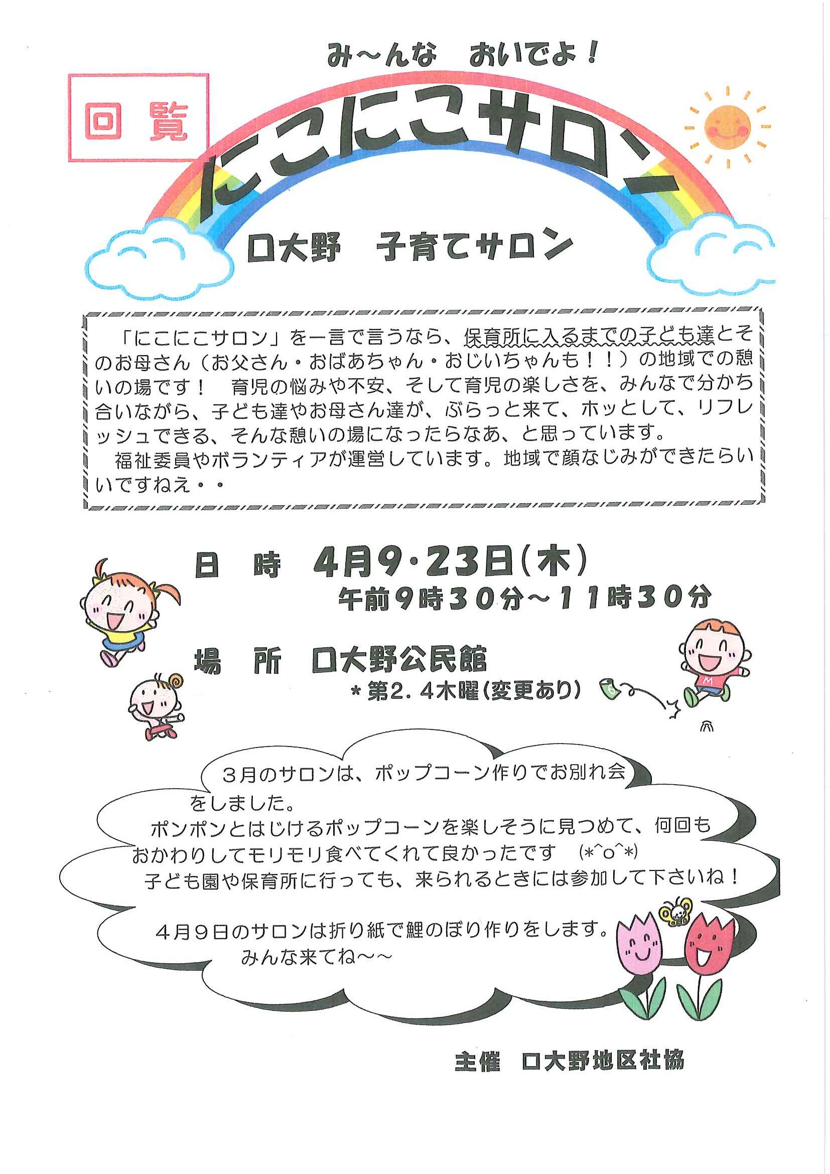 ・令和7年度区費納付についてのお知らせ ・大野神社令和7年度会計収支予算書の修正版 裏面 ・赤十字活動資金募集のお願い ・草刈りボランティア募集 ・口大野公民館歩こう会 ・5月にこにこサロン(子育てサロン) ・食生活改善推進員養成講座のお知らせ 裏面 ・下水道工事の予定表4/25- ・大宮市民局NEWSおおみやトピックス ・口大野図書館ハロウィンだより4月号 ・大野神社歳時記第25号 ・保幼小中一貫教育だより 裏面 ・大宮中学校だより 裏面 ・一小の子4/7 裏面 ・一小の子4/15 裏面