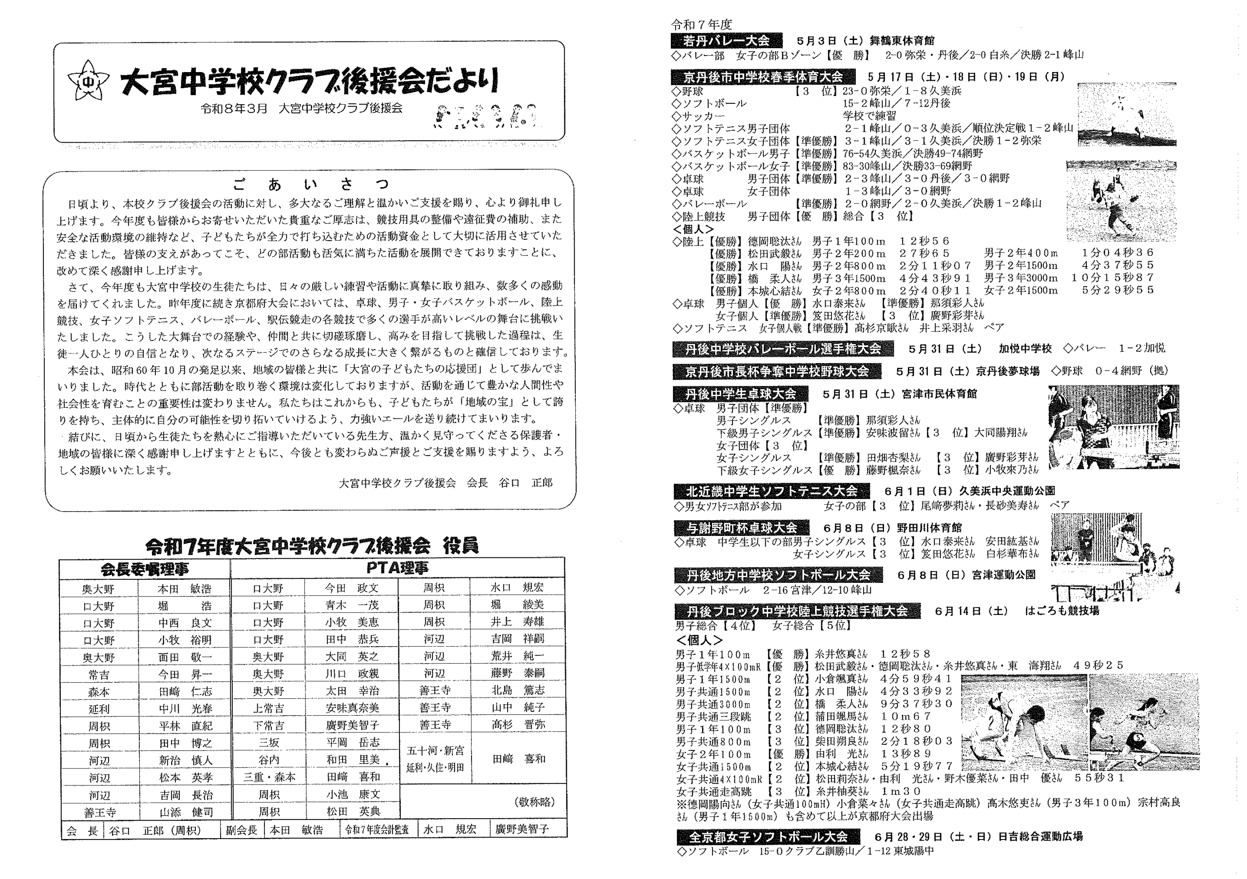 ・口大野夏まつり 裏面 ・あつまれ子ども祭衆 応募様式 ・令和7年神社例大祭樂太鼓子ども祭衆の募集について 応募様式 ・7月ふれあいサロン ・口大野区敬老会 ・大宮駐在所ミニ広報紙大宮パトロール7月号 ・一小の子7月号 裏面 ・大中だより7月号 裏面 ・きたほいくしょだより ・保幼小中一貫教育だより 裏面