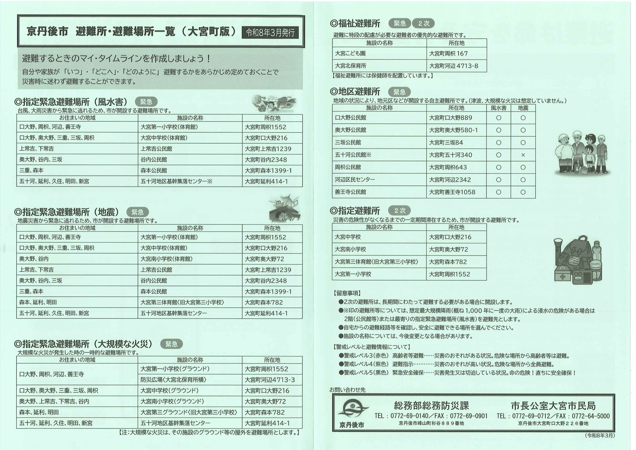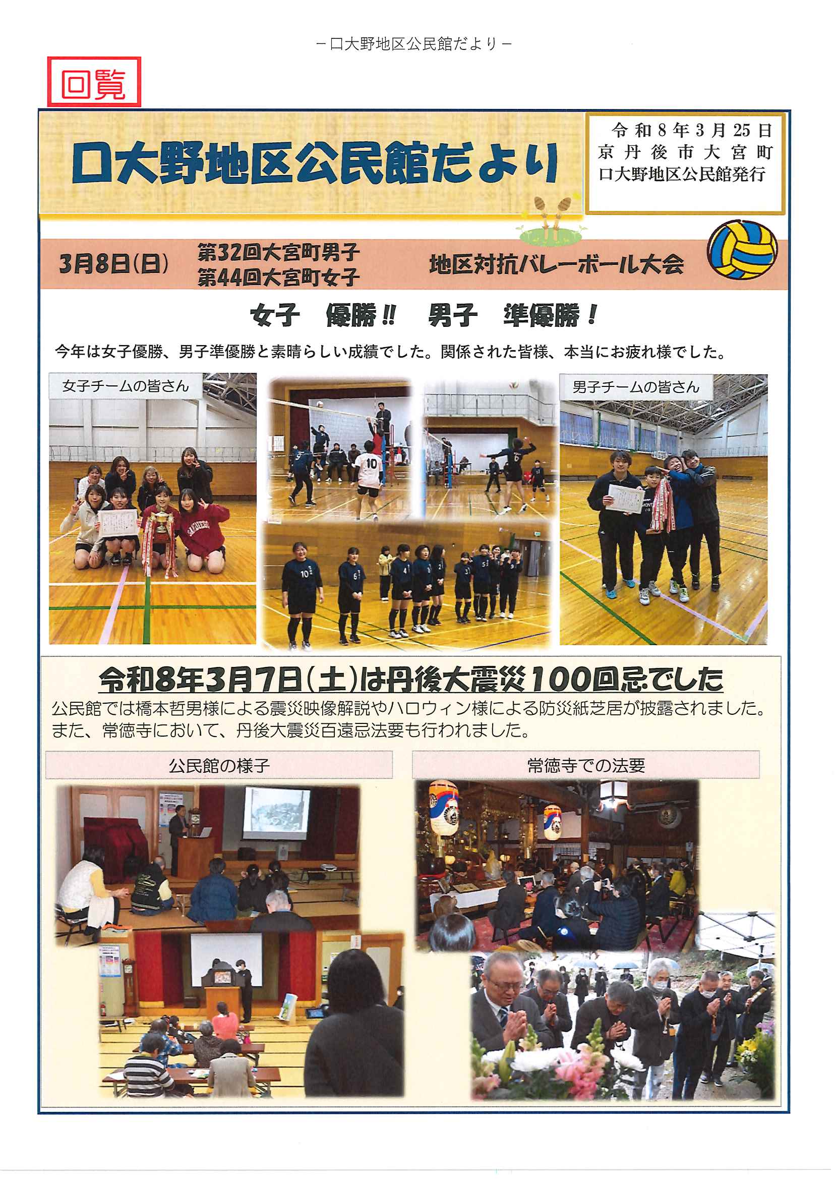 <3月26日> ・広報京丹後4月号 ・京丹後市青少年健全育成会だより 裏面 ・京丹後市社協だより こころ第110号 ・地域で支える学校地域で支える子どもの学び 裏面 ・京丹後市スポーツ協会広報どっと.こむ! 裏面 ・シルバーきょうたんご 裏面 ・京丹後農業委員会だより ・京丹後市避難所・避難場所一覧(大宮町版) 裏面 ・京丹後市民大学受講案内 裏面 ・京丹後市家庭教育支援チーム通信 ・京丹後市総合防災アプリ 裏面 ・大宮中学校クラブ後援会だより 裏面 ・4月にこにこサロン(子育てサロン) ・口大野地区公民館だより3/25 ・モルック教室を開催します(主催;市教委) ・大野神社歳時記第29号 裏面 ・大中だより第14号 裏面 ・下水道工事予定表3/25- ・大宮市民局NEWSおおみやトピックス <隣組長さま宛て>・お礼と回覧配布袋の返却のお願い ・令和8年度隣組長さまへ お願い 裏面 回覧版は読み終えたらすぐにお隣さんへ! 次回配布は4月13日の予定です 令和7年度隣組長さま、大変お世話になりました <3月11日> ・京丹後市公共交通ガイドブック ・京丹後市の人権だより ・京丹後市文化協会通信「文化や芸術の力でまちをもっと元気に」 裏面 ・令和8年度京丹後市家庭ごみ収集カレンダー ・令和7年度赤い羽根共同募金運動について(お礼) ・令和7年度歳末たすけあい運動について(お礼) ・3月ふれあいサロン ・大宮駐在所ミニ広報紙大宮パトロール 裏面 ・ミュージックライブらくざ ・きもので遊ぼうIN京丹後 裏面 ・保幼小中一貫教育だより大宮学園 裏面 ・大中だより 裏面 ・一小の子 裏面 ・きたほいくしょだより3月