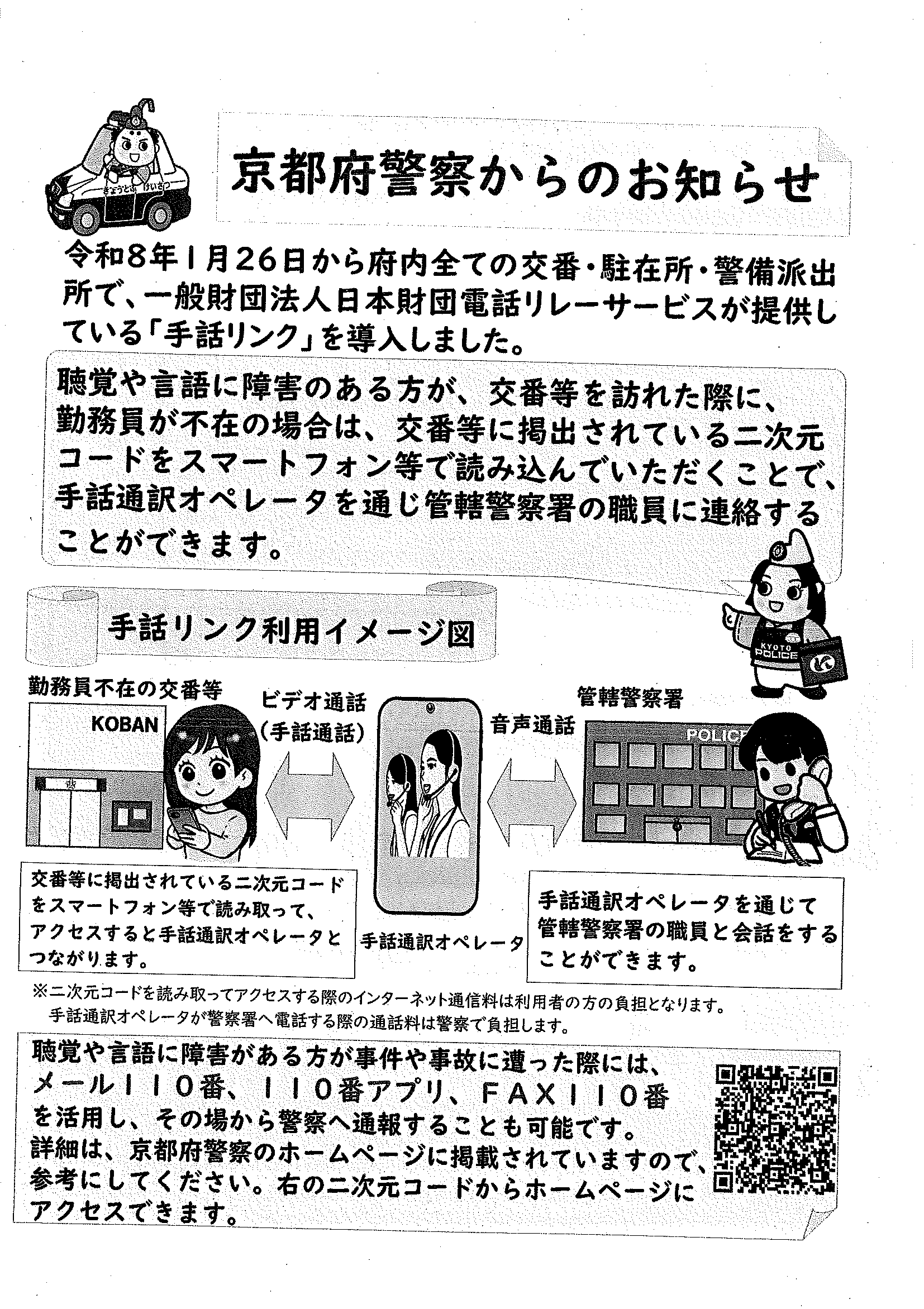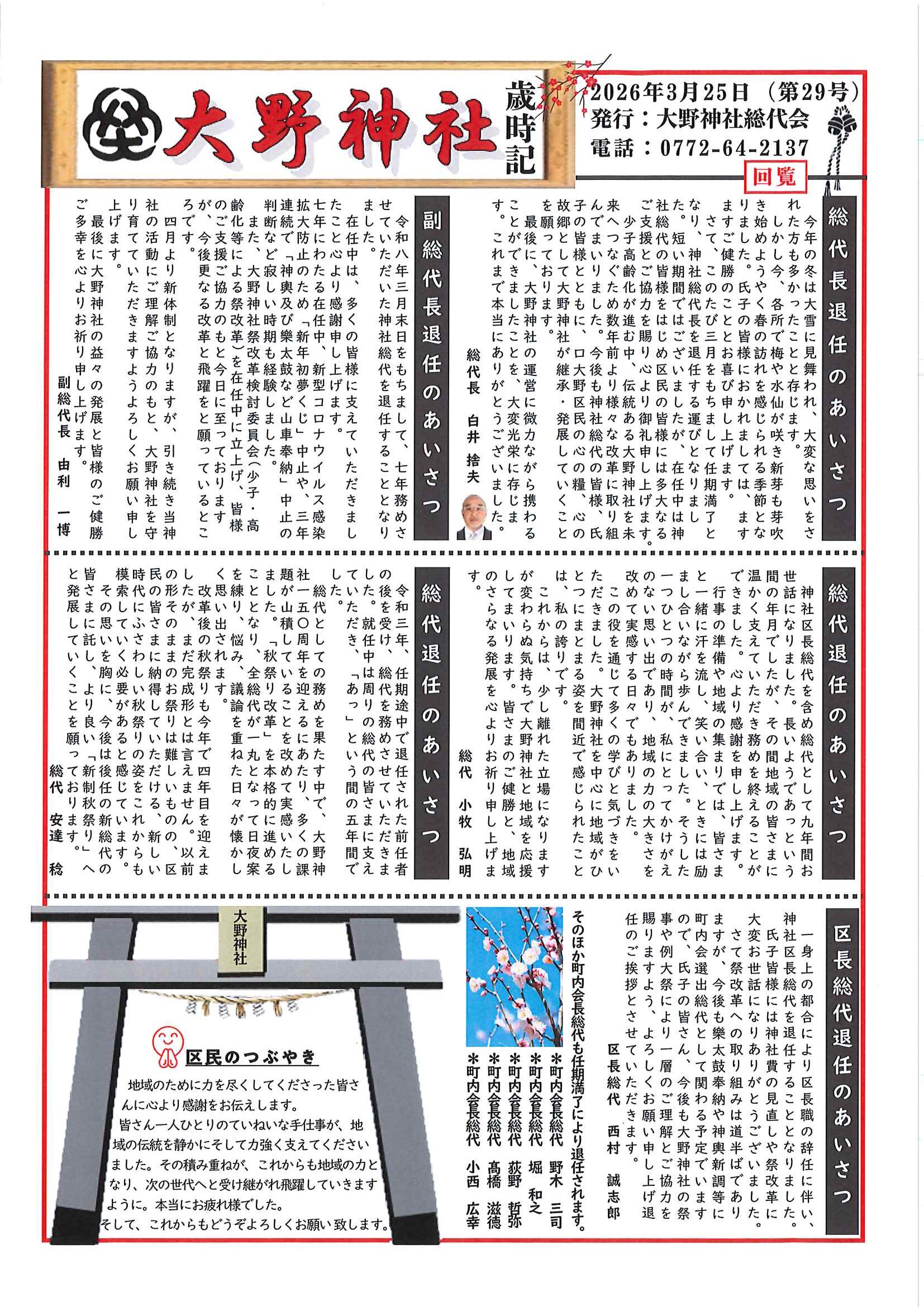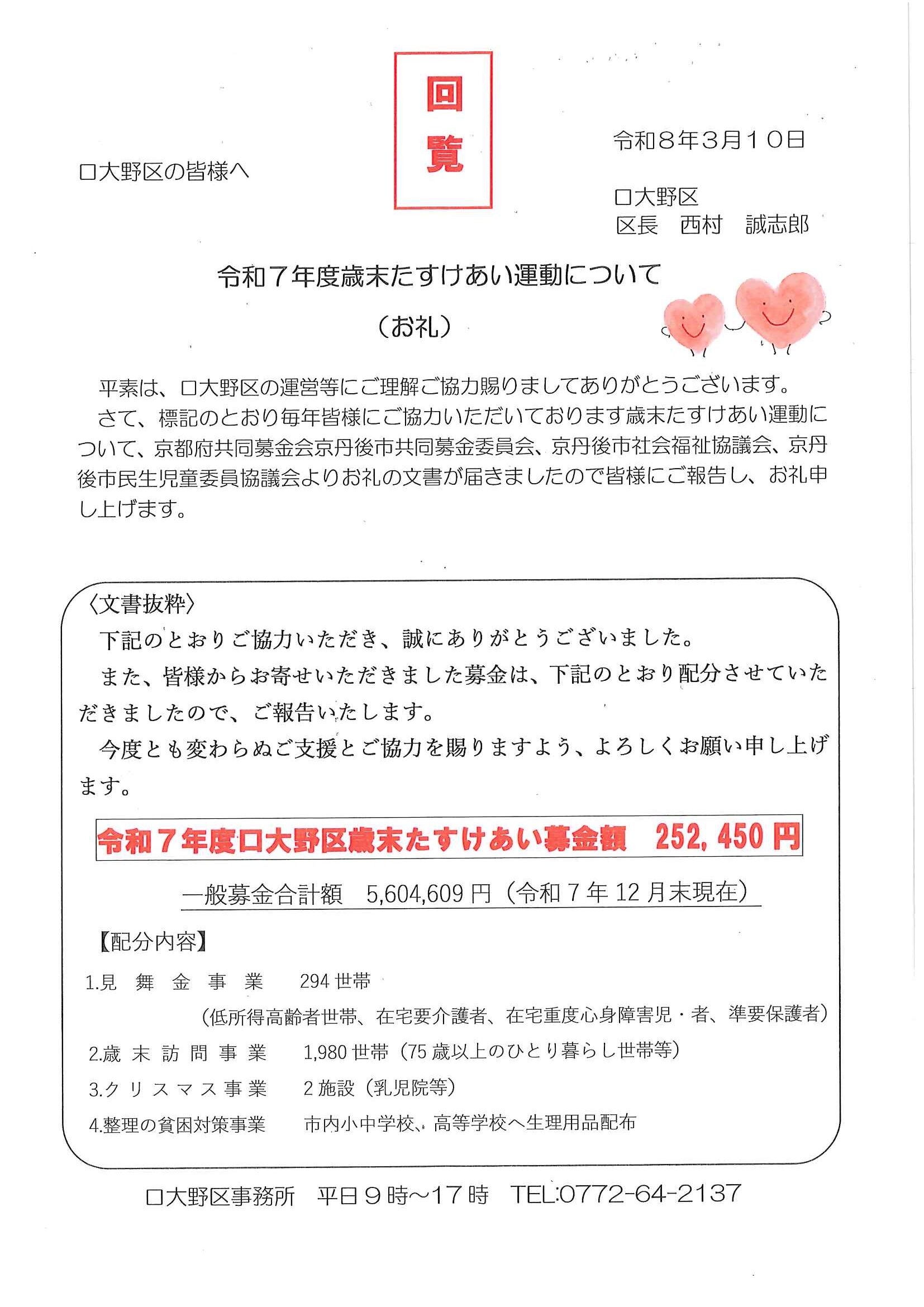 回覧版は読み終えたらすぐにお隣さんへ! 次回配布は1月13日の予定です 良い年をお迎えください <12月11日> ・京丹後市農業委員会だよりN062 ・京丹後警察署からのお知らせ&2026カレンダー ・市社協主催レクレーション講座 ・「賀正」札 ・区事務所年末年始のお知らせ ・年越しそば予約受付中(麺打ち倶楽部) ・大野神社の初詣 ・大野神社秋の例大祭(神輿・樂太鼓)決算書 ・令和7年歳末たすけあい募金の集計 ・口大野区民だより 裏面 ・おうちでラクラク&スマホ申告 裏面 ・大宮駐在所ミニ広報紙 大宮パトロール ・保幼小中一貫教育だより 裏面 ・大中だより 裏面 ・一小の子 裏面 ・きたほいくしょだより <隣組長あて>・神札の配布と集金のお願い 回覧版は読み終えたらすぐにお隣さんへ! 次回配布は12月26日の予定です <11月26日> ・広報京丹後12月号 ・京丹後市議会だより第86号 ・京丹後市社協だより こころ第108号 ・シニア向け求人情報