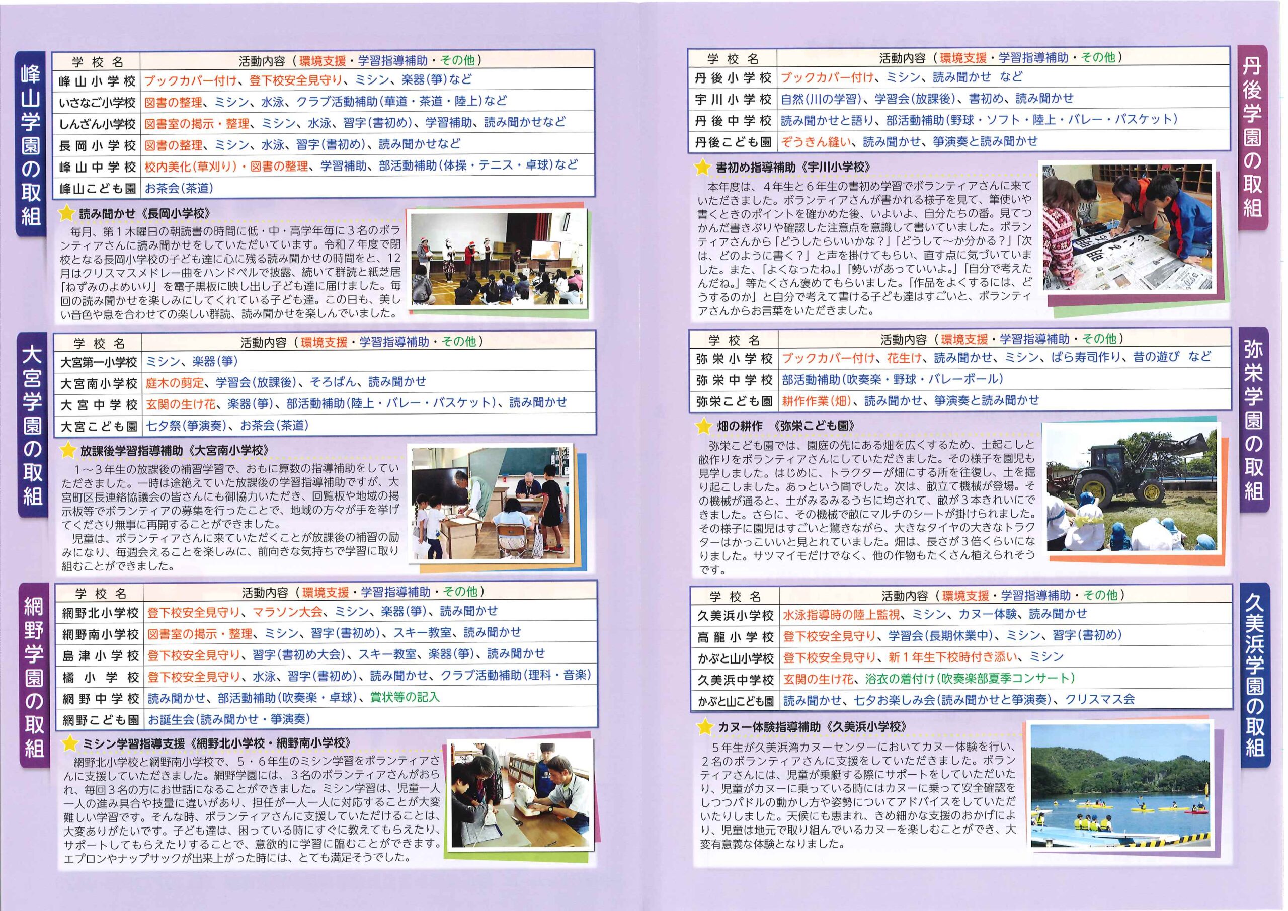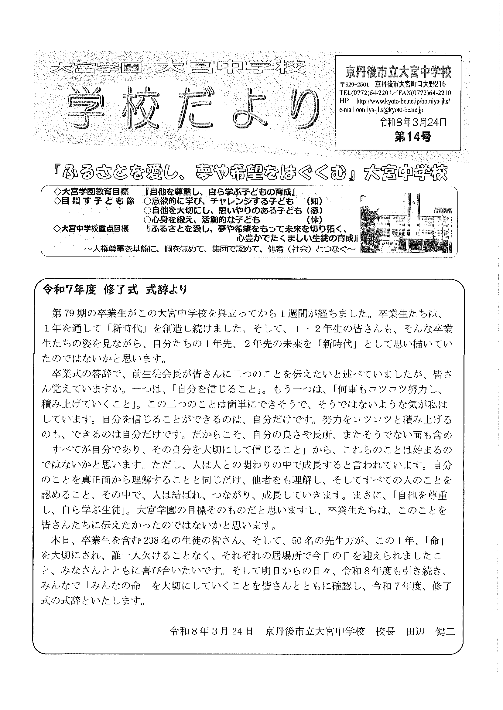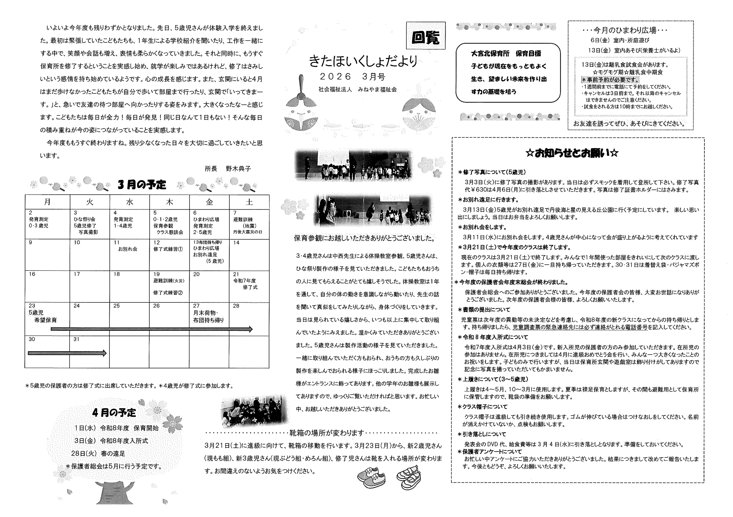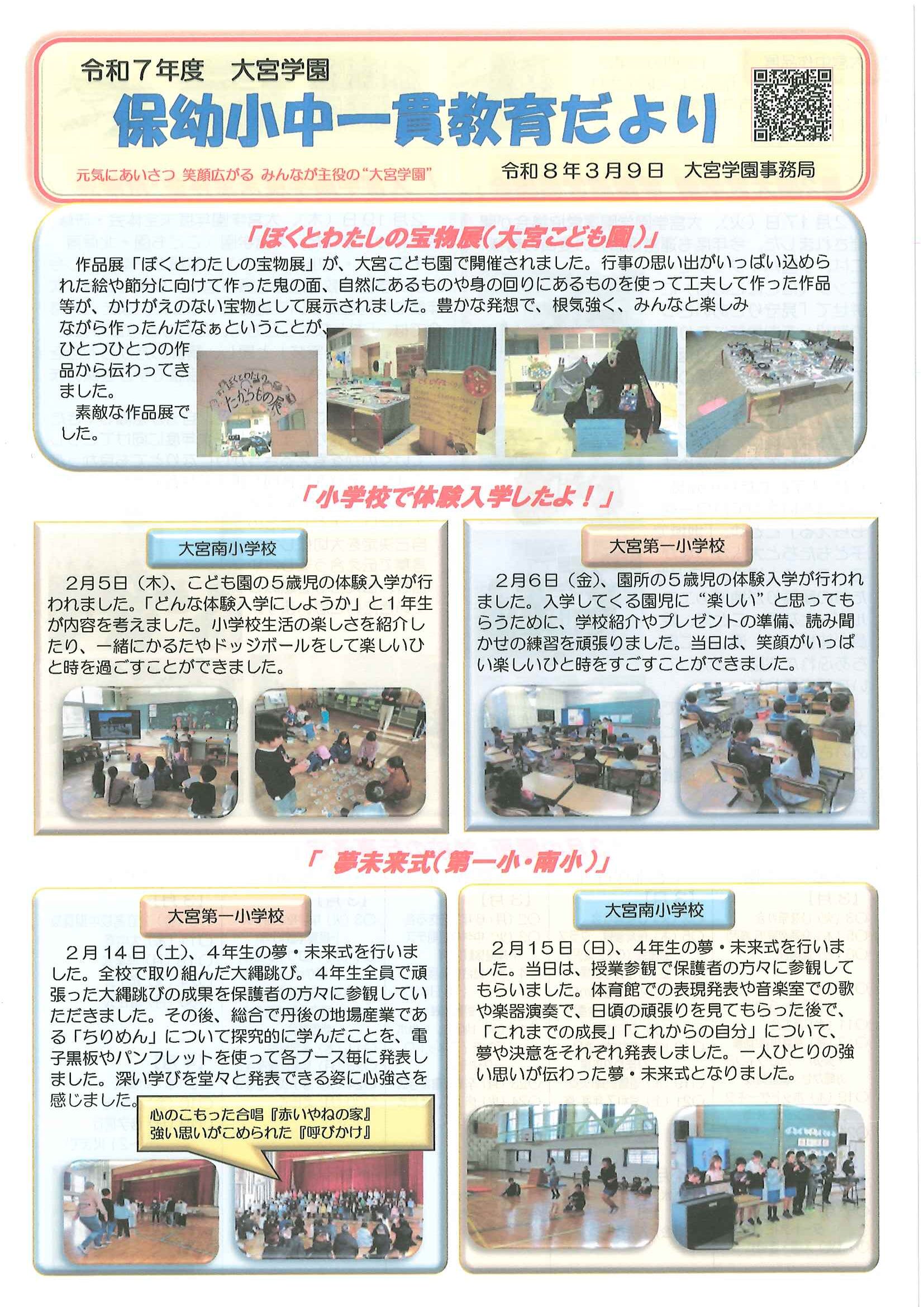 ・大宮市民局NEWSおおみやトピックス ・令和6年度歳末たすけあい運動について(お礼) ・令和6年度赤い羽根共同募金運動について(お礼) ・3月ふれあいサロン ・大宮駐在所ミニ広報紙大宮パトロール ・口大野農地環境保全員会だより ・大内峠一字観公園ノルディックウオーキング ・女性消防団員募集中 ・らくざミュージックライブ ・保幼小中一貫教育だより3/6号 裏面 ・保幼小中一貫教育だより3/10号 裏面 ・大宮中学校だより 裏面 ・一小の子 裏面