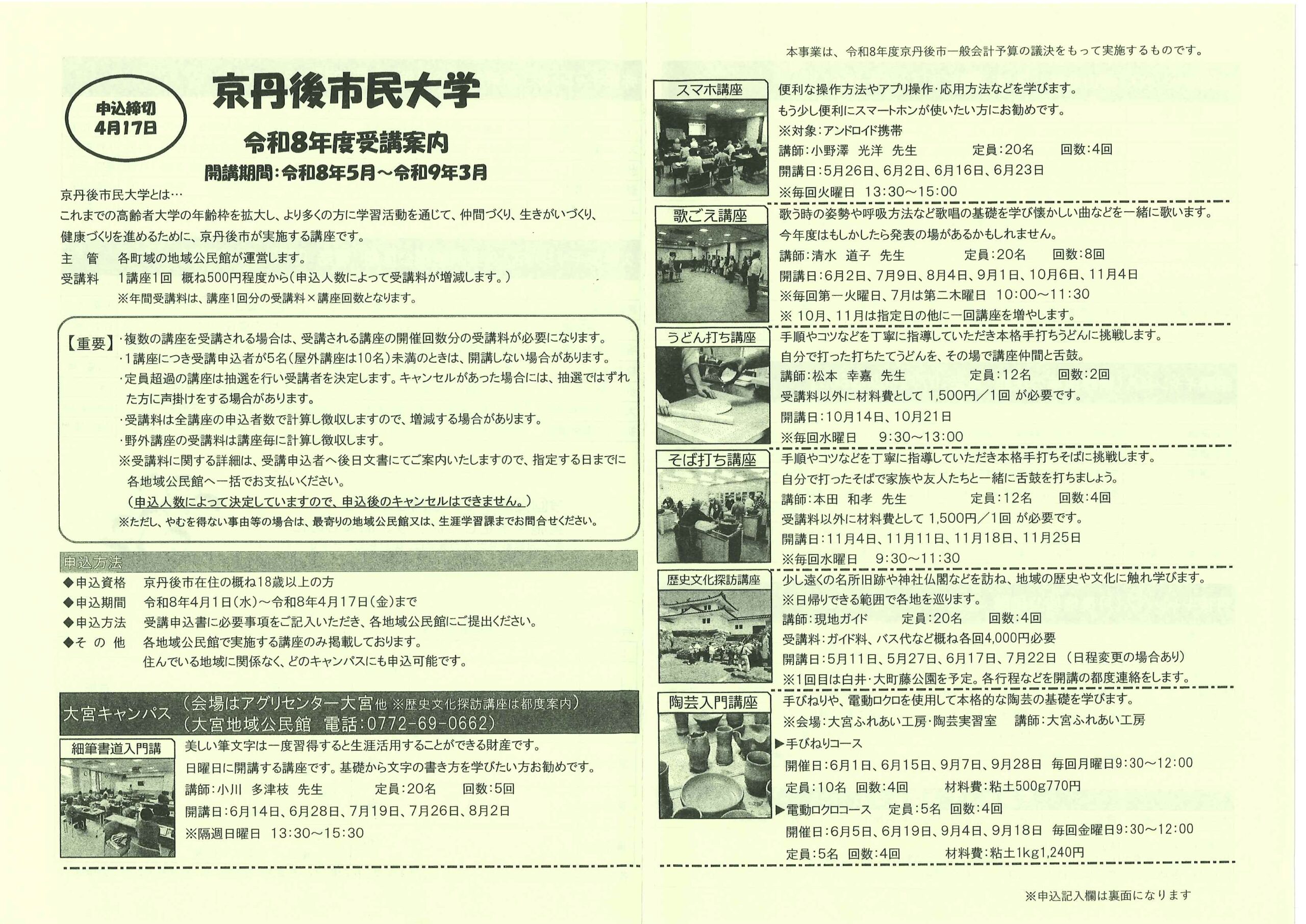 回覧版は読み終えたらすぐにお隣さんへ! 次回配布は3月26日の予定です <2月26日> ・広報京丹後3月 ・大宮町民生委員・児童委員さんを紹介します P2 P3 P4 ・令和8年度職業訓練講座(夜間)ガイド P2 P3 P4 ・大宮地域公民館だより第108号 裏面 ・国際女性の日記念男女共同参画セミナー 裏面 ・きょうたんごローカルマッチングフェア京都ジョブ博 裏面 ・京丹後市健康づくり推進員募集 裏面 ・令和8年度から令和10年度口大野区費について 裏面 ・大野神社祈年祭 ・3月にこにこサロン(子育てサロン) ・峯山海軍航空隊歴史探訪ノルディックウォーキング参加者募集 ・気軽に始める体操公開講座 裏面 ・おおみや苑地域交流委員会新聞 ・下水道工事予定表2/25- 回覧版は読み終えたらすぐにお隣さんへ! 次回配布は3月26日の予定です <2月12日> ・京丹後市議会だより ・京丹後市農業委員会だより ・つながる絆フェス 裏面 ・司法書士による無料法律相談会 ・京丹後市医療確保奨学金看護師等修学資金 ・社会を明るくする運動優秀標語ステッカー