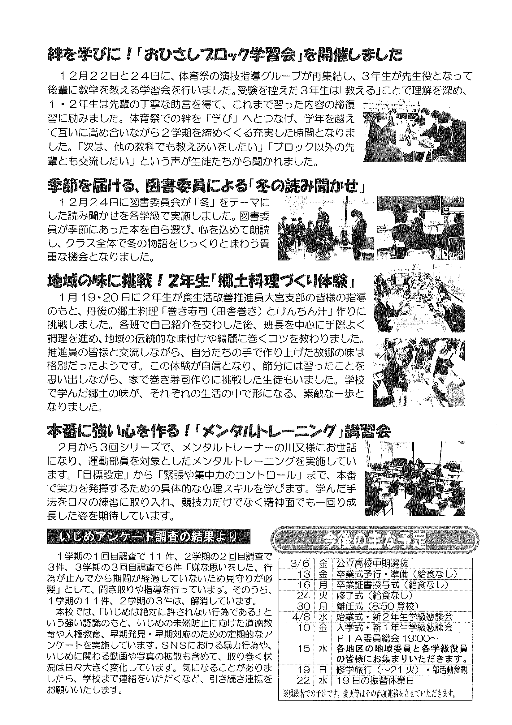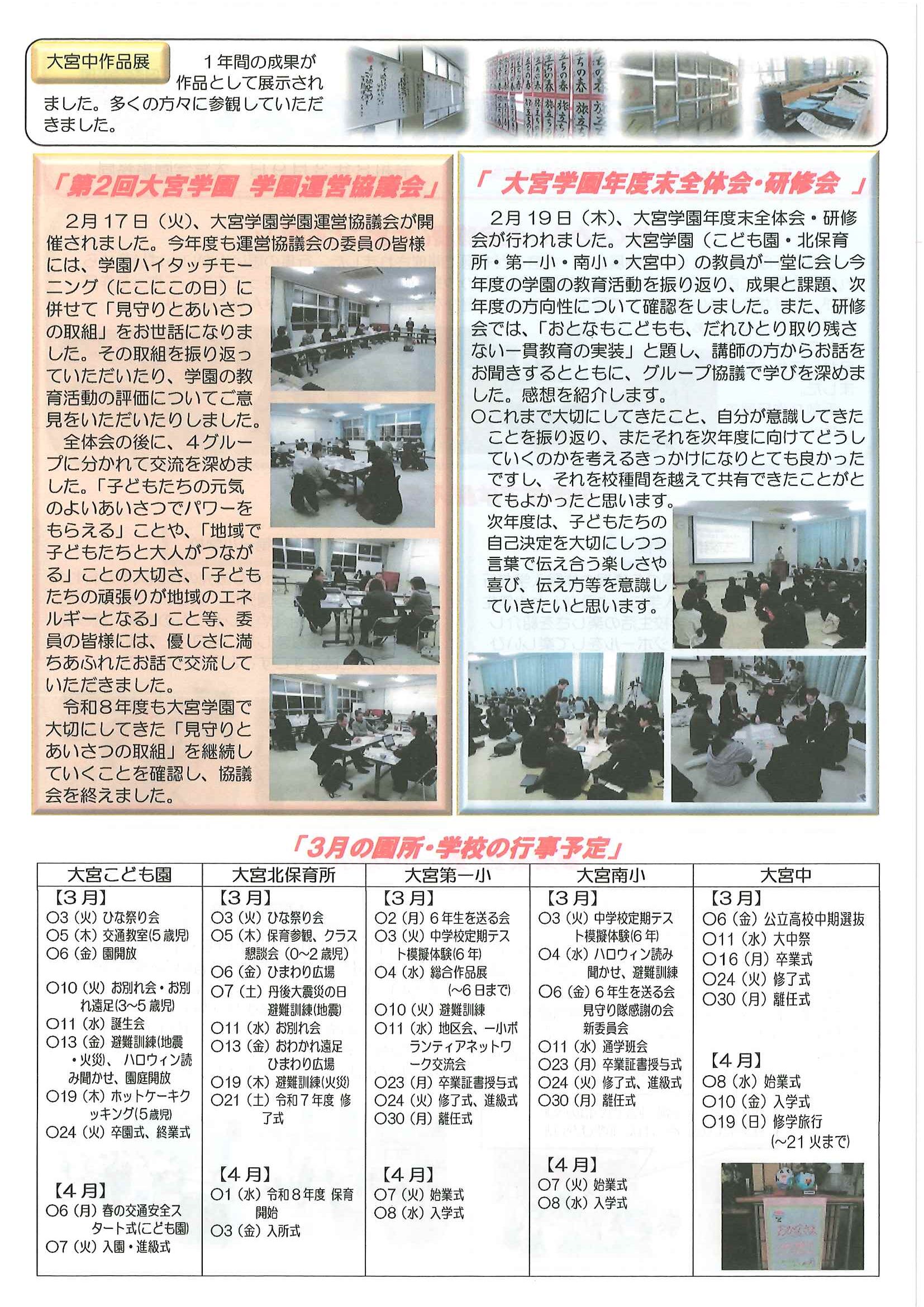 ・2月のふれあいサロン ・日米交流音楽会 ・大宮駐在所ミニ広報紙大宮パトロール2月号 ・保幼小中一貫教育だより2月号 裏面 ・大宮中学校だより第12号 裏面 ・一小の子2月号 裏面 ・きたほいくしょだより2月号 ・大宮市民局NEWSおおみやトピックス