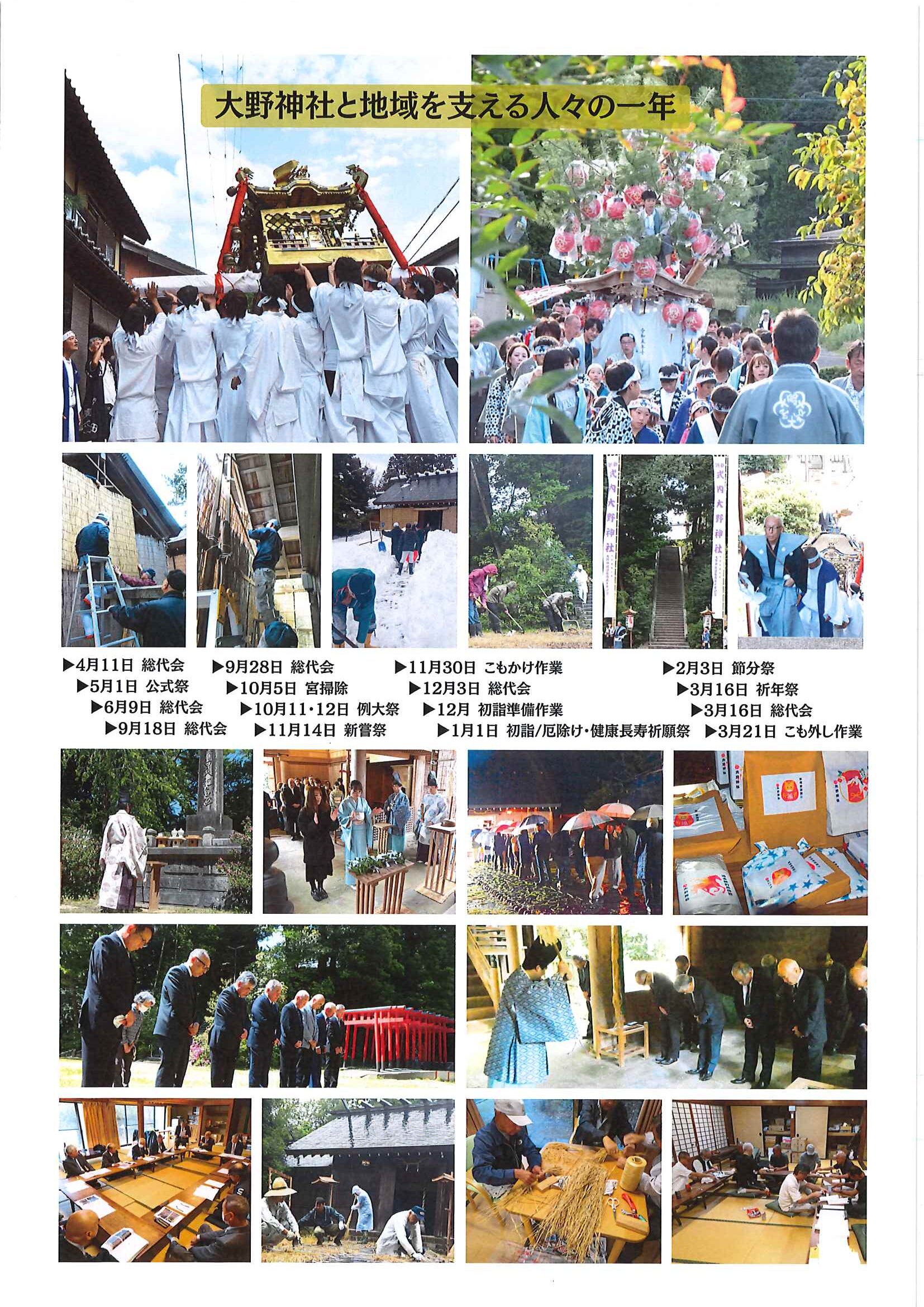 ・公民館大そうじのお願い ・10月ふれあいサロン<野外活動・遠足> ・10月にこにこサロン(子育てサロン) ・地区敬老会実行委員会から ・ハートフルフェスタみんなのつどい 裏面 ・定額減税補足給付金提出はお済みですか ・下水道工事予定表9/25- ・大宮市民局NEWSおおみやトピックス 裏面 ・大野神社歳時記No26 <各町内会から>・剱鉾町内会<樂太鼓町内花打ちについて> ・万歳町内会<太刀振り奉納に向けて第4弾> 日程表 ・高砂町内会<子供みこしのお知らせ> 巡行表 ・明治町内会<道具部だより> ・昭和町内会<秋祭りのご案内>