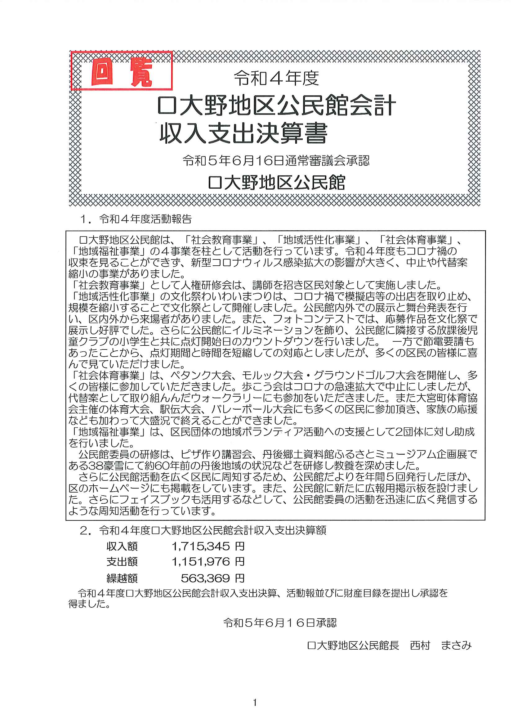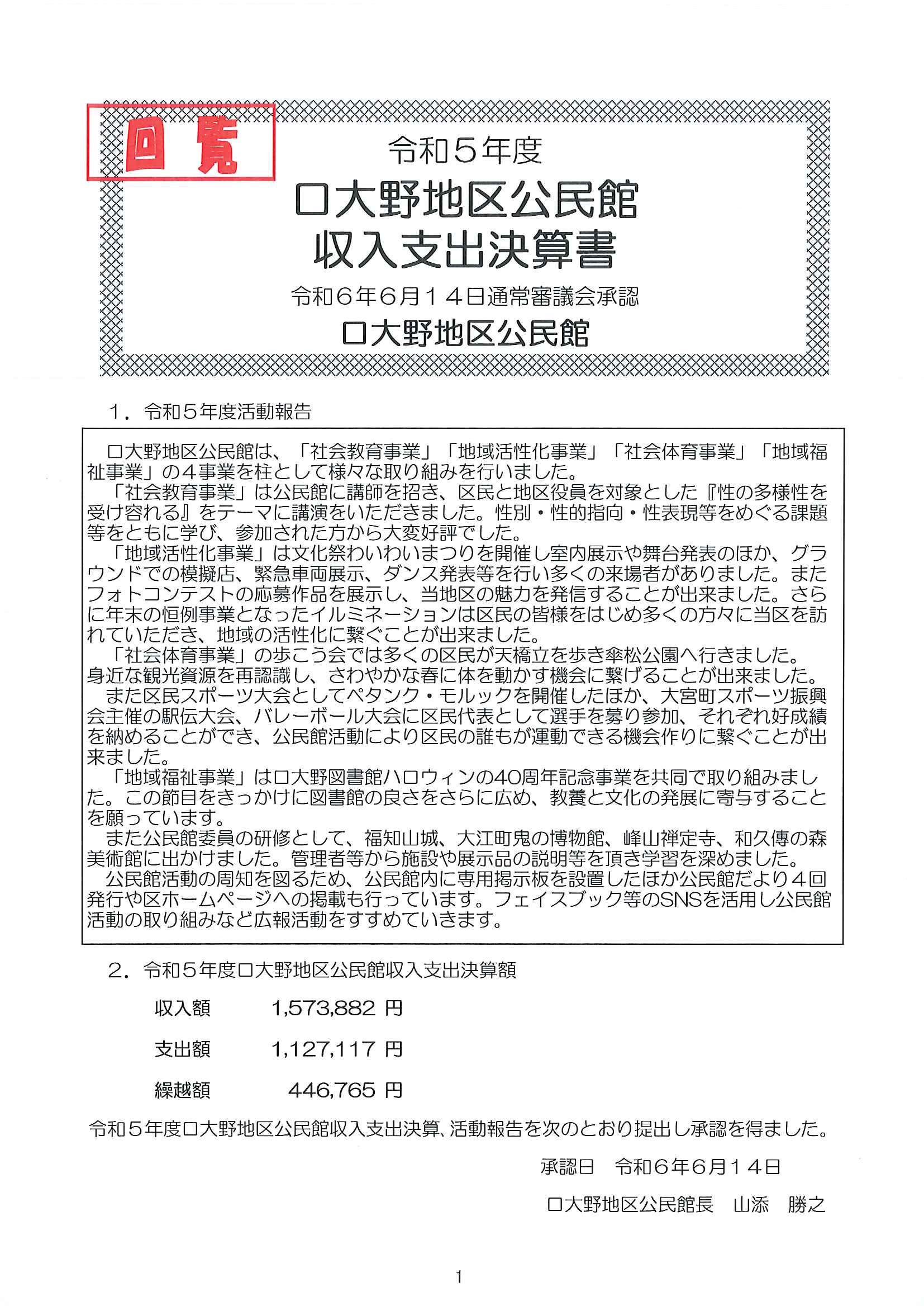 ◇◇ 令和5年度口大野地区公民館収支決算書 ◇◇