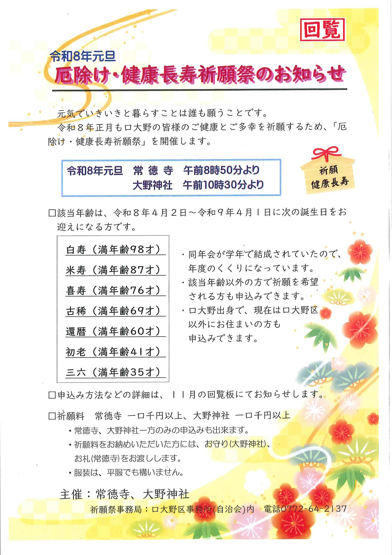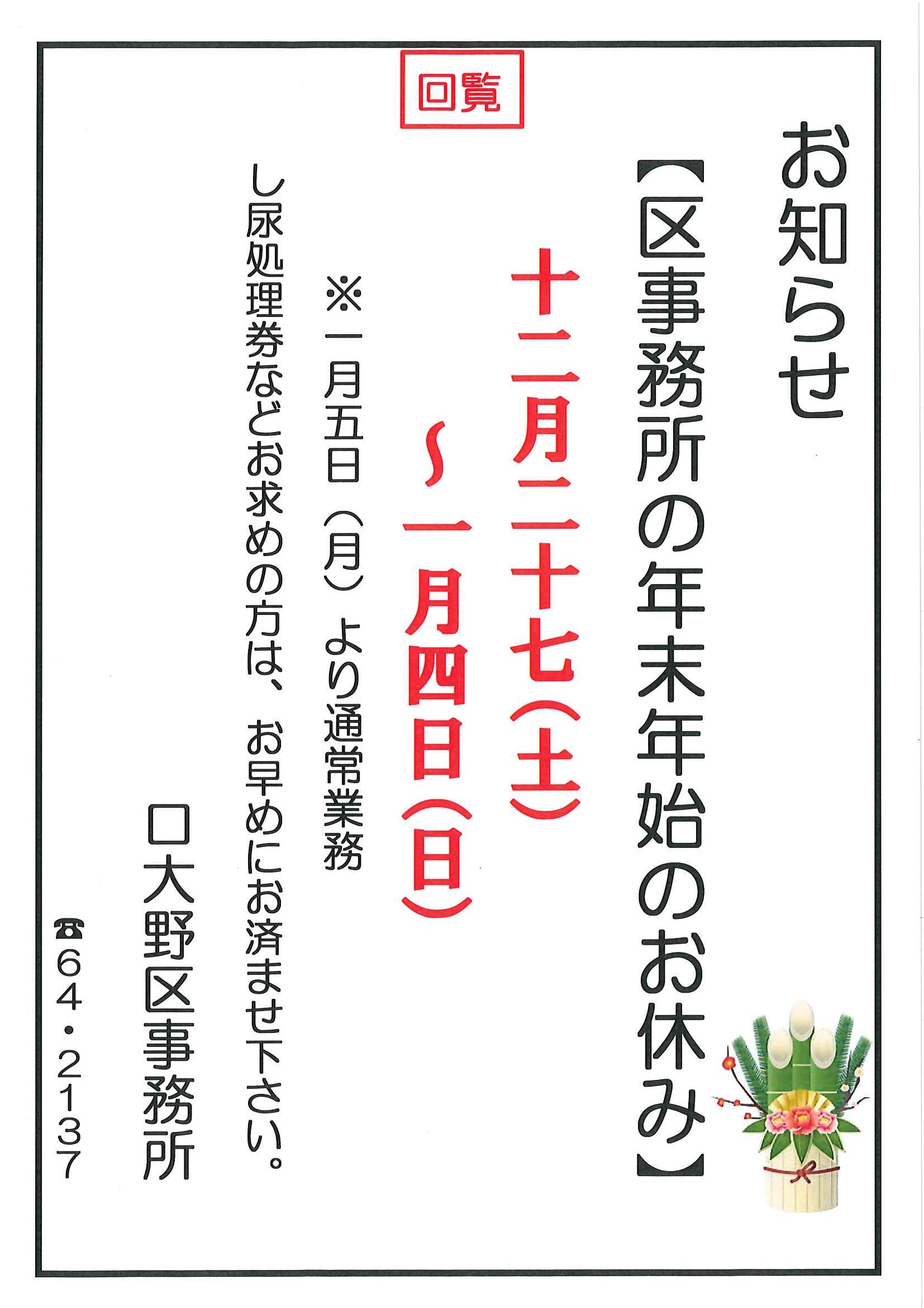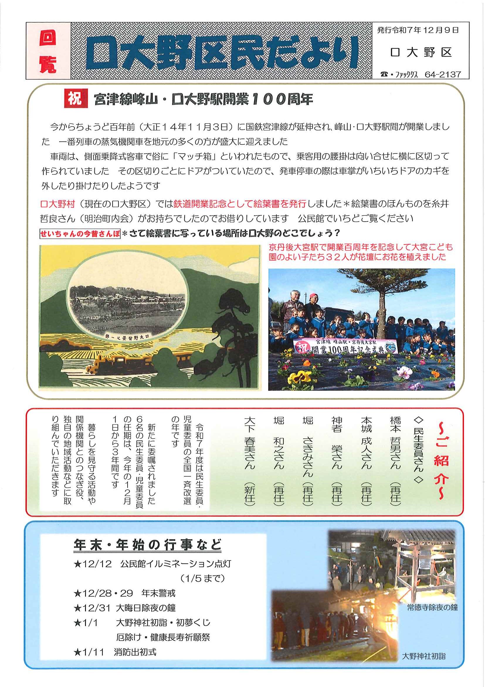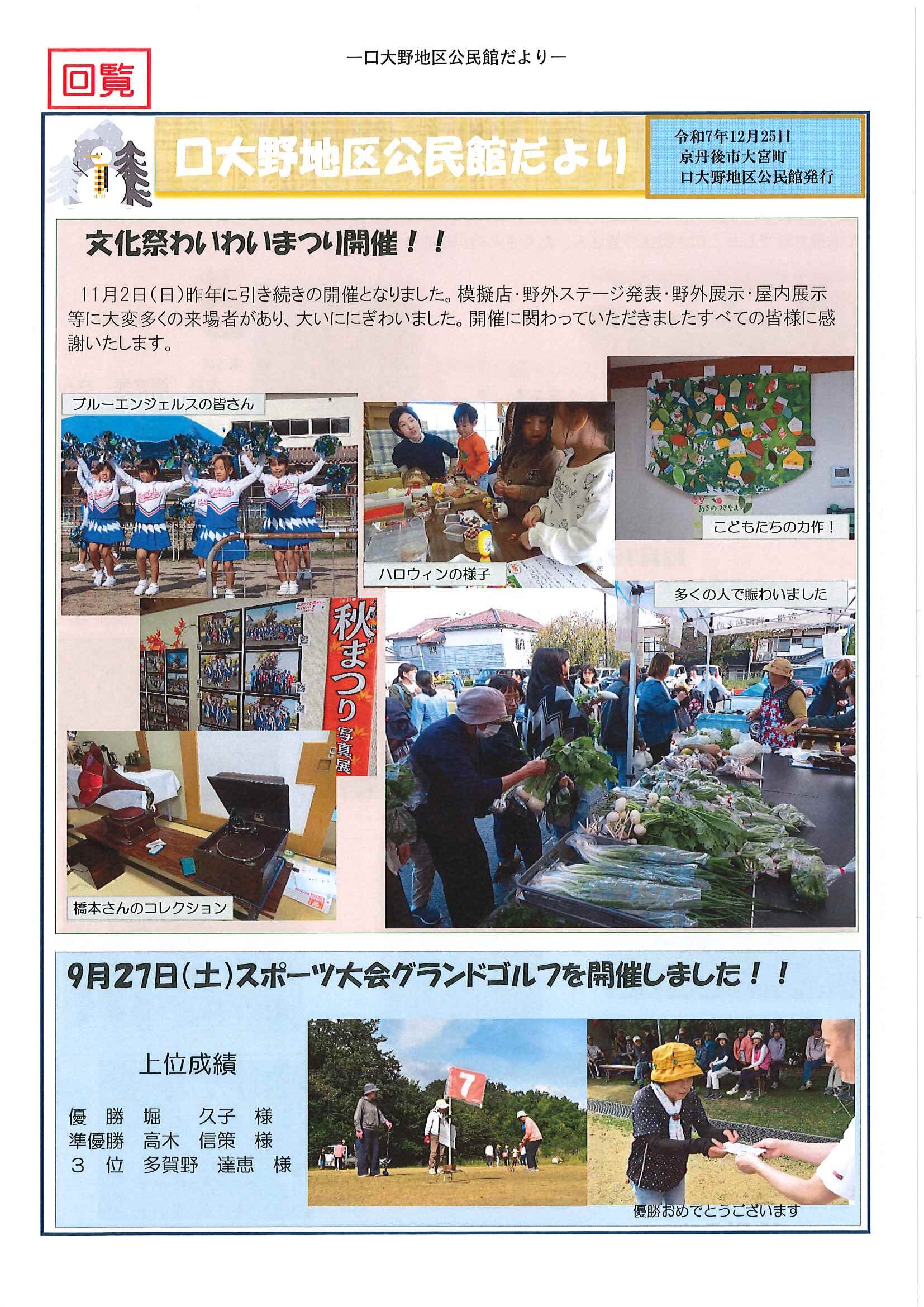 回覧版は読み終えたらすぐにお隣さんへ! 次回配布は1月13日の予定です 良い年をお迎えください <12月11日> ・京丹後市農業委員会だよりN062 ・京丹後警察署からのお知らせ&2026カレンダー ・市社協主催レクレーション講座 ・「賀正」札 ・区事務所年末年始のお知らせ ・年越しそば予約受付中(麺打ち倶楽部) ・大野神社の初詣 ・大野神社秋の例大祭(神輿・樂太鼓)決算書 ・令和7年歳末たすけあい募金の集計 ・口大野区民だより 裏面 ・おうちでラクラク&スマホ申告 裏面 ・大宮駐在所ミニ広報紙 大宮パトロール ・保幼小中一貫教育だより 裏面 ・大中だより 裏面 ・一小の子 裏面 ・きたほいくしょだより <隣組長あて>・神札の配布と集金のお願い 回覧版は読み終えたらすぐにお隣さんへ! 次回配布は12月26日の予定です <11月26日> ・広報京丹後12月号 ・京丹後市議会だより第86号 ・京丹後市社協だより こころ第108号 ・シニア向け求人情報