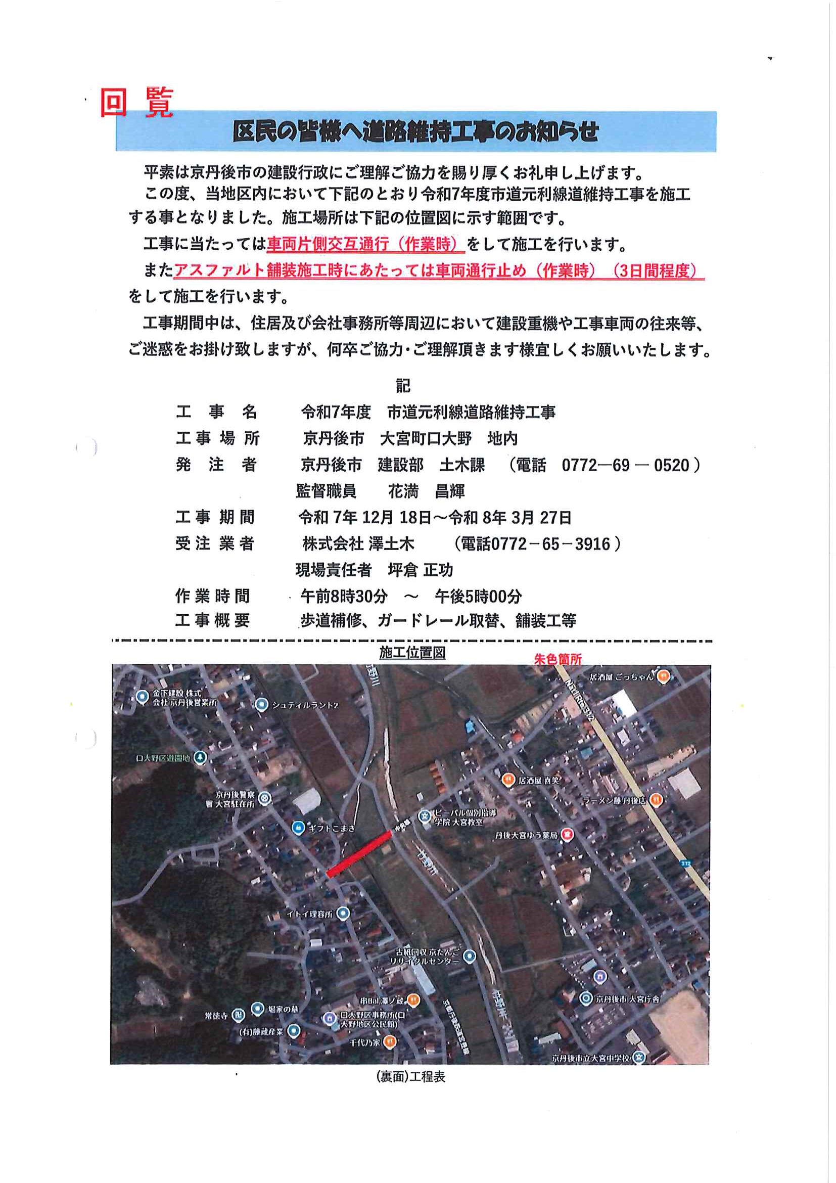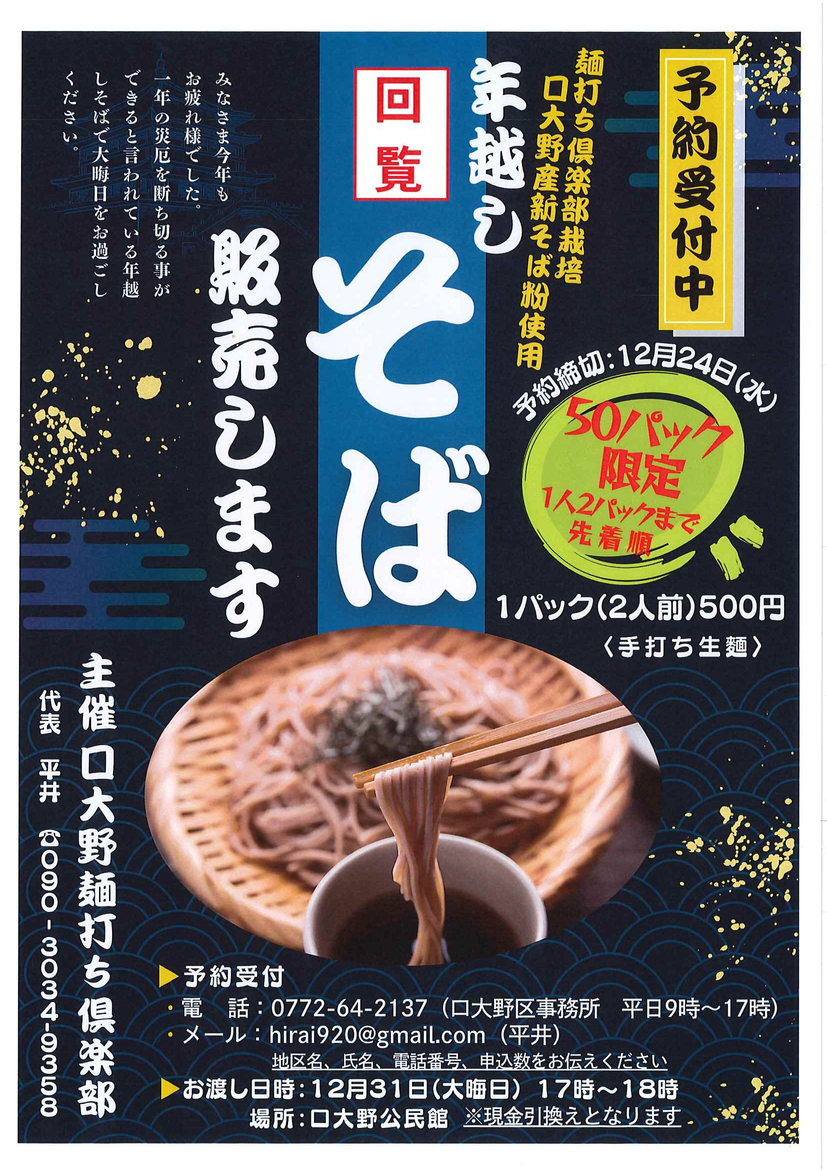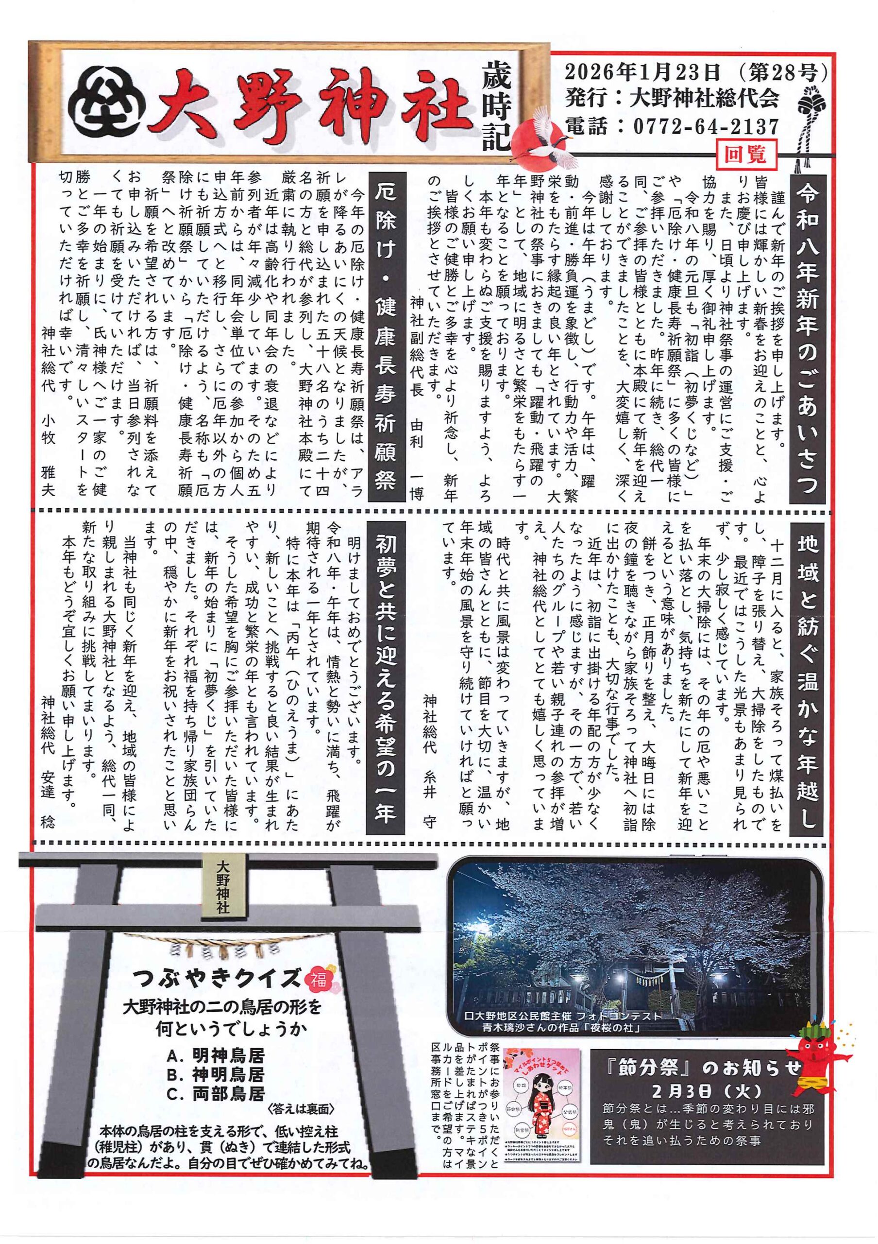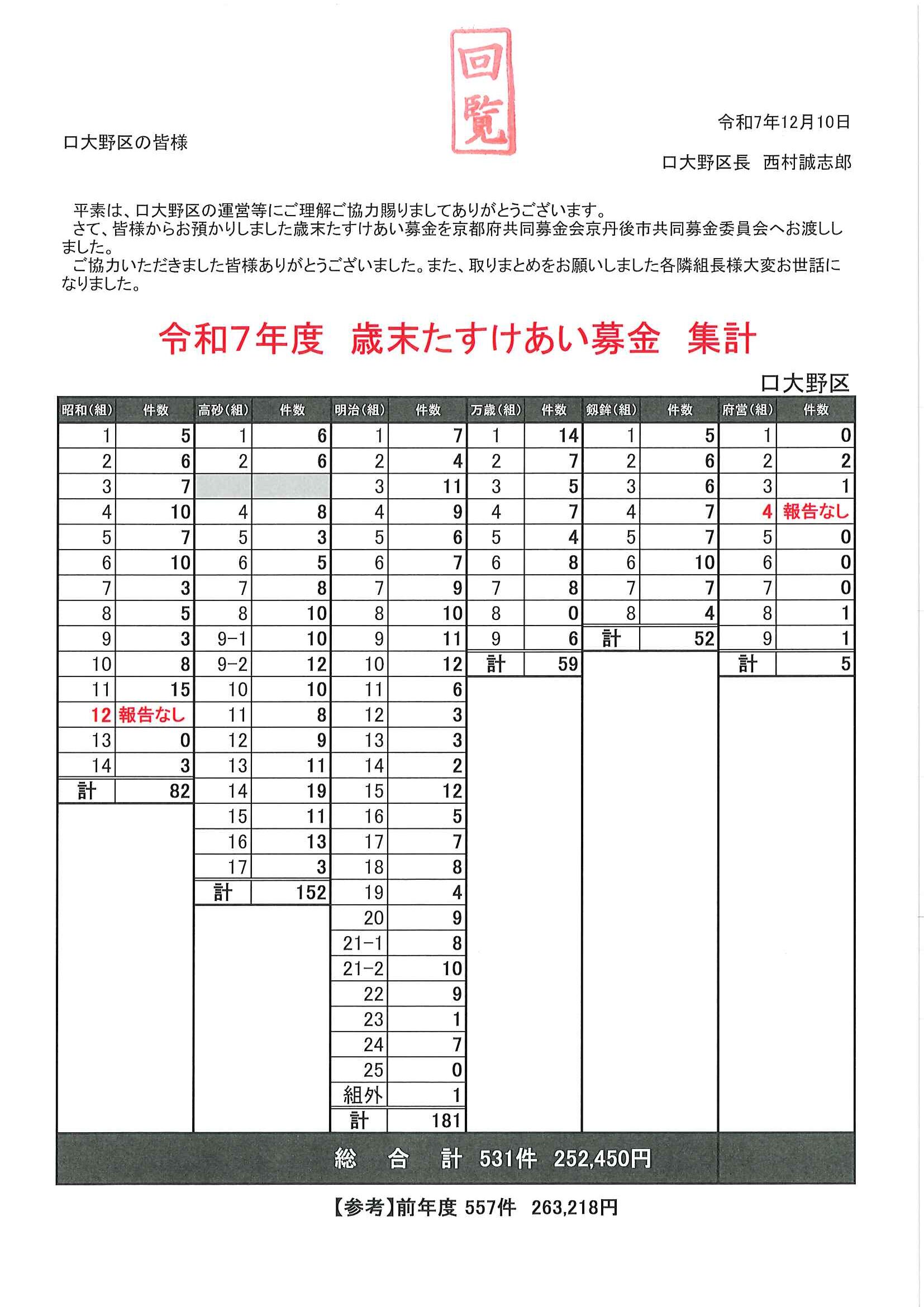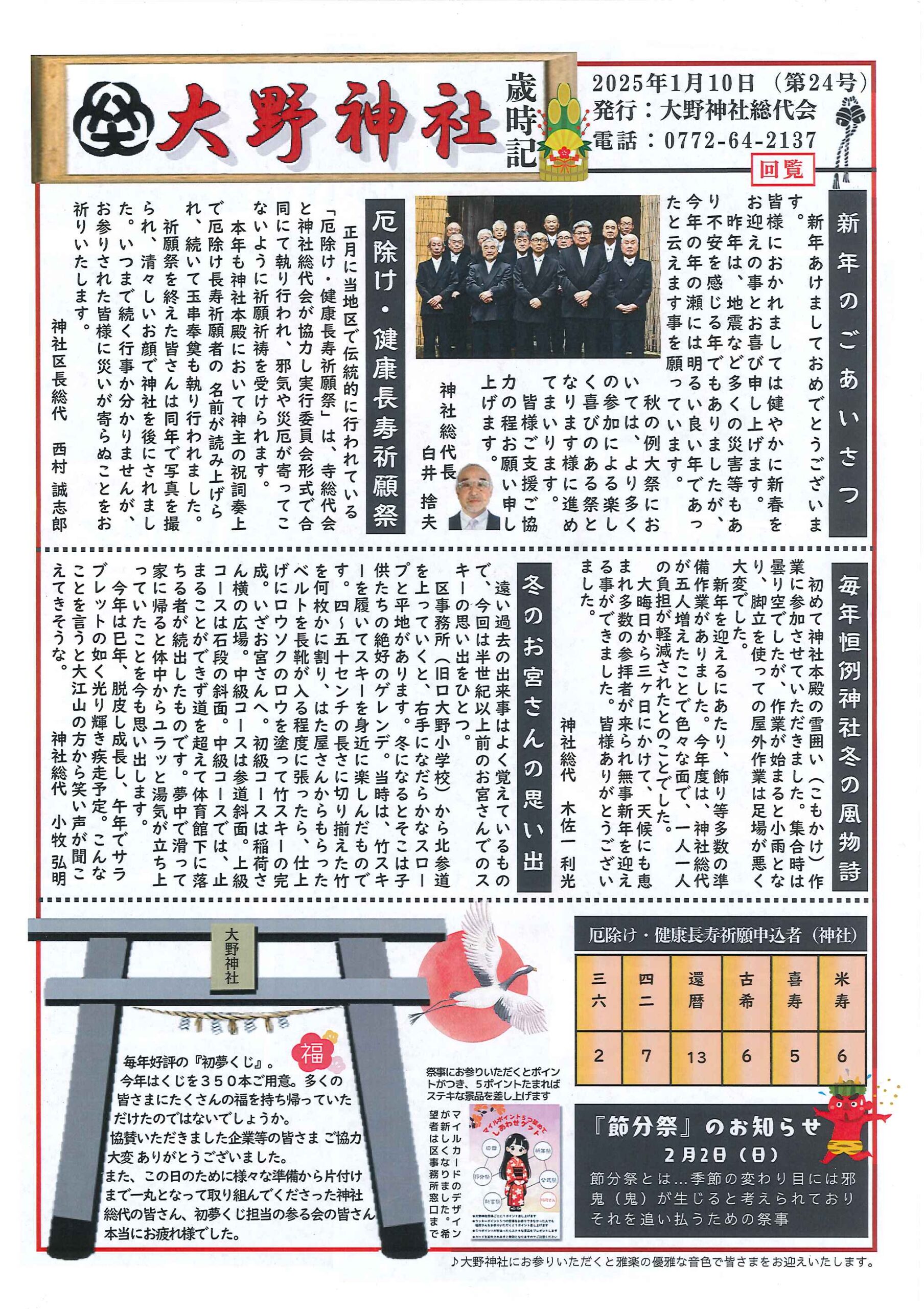 回覧版は読み終えたらすぐにお隣さんへ! 次回配布は1月13日の予定です 良い年をお迎えください <12月11日> ・京丹後市農業委員会だよりN062 ・京丹後警察署からのお知らせ&2026カレンダー ・市社協主催レクレーション講座 ・「賀正」札 ・区事務所年末年始のお知らせ ・年越しそば予約受付中(麺打ち倶楽部) ・大野神社の初詣 ・大野神社秋の例大祭(神輿・樂太鼓)決算書 ・令和7年歳末たすけあい募金の集計 ・口大野区民だより 裏面 ・おうちでラクラク&スマホ申告 裏面 ・大宮駐在所ミニ広報紙 大宮パトロール ・保幼小中一貫教育だより 裏面 ・大中だより 裏面 ・一小の子 裏面 ・きたほいくしょだより <隣組長あて>・神札の配布と集金のお願い 回覧版は読み終えたらすぐにお隣さんへ! 次回配布は12月26日の予定です <11月26日> ・広報京丹後12月号 ・京丹後市議会だより第86号 ・京丹後市社協だより こころ第108号 ・シニア向け求人情報