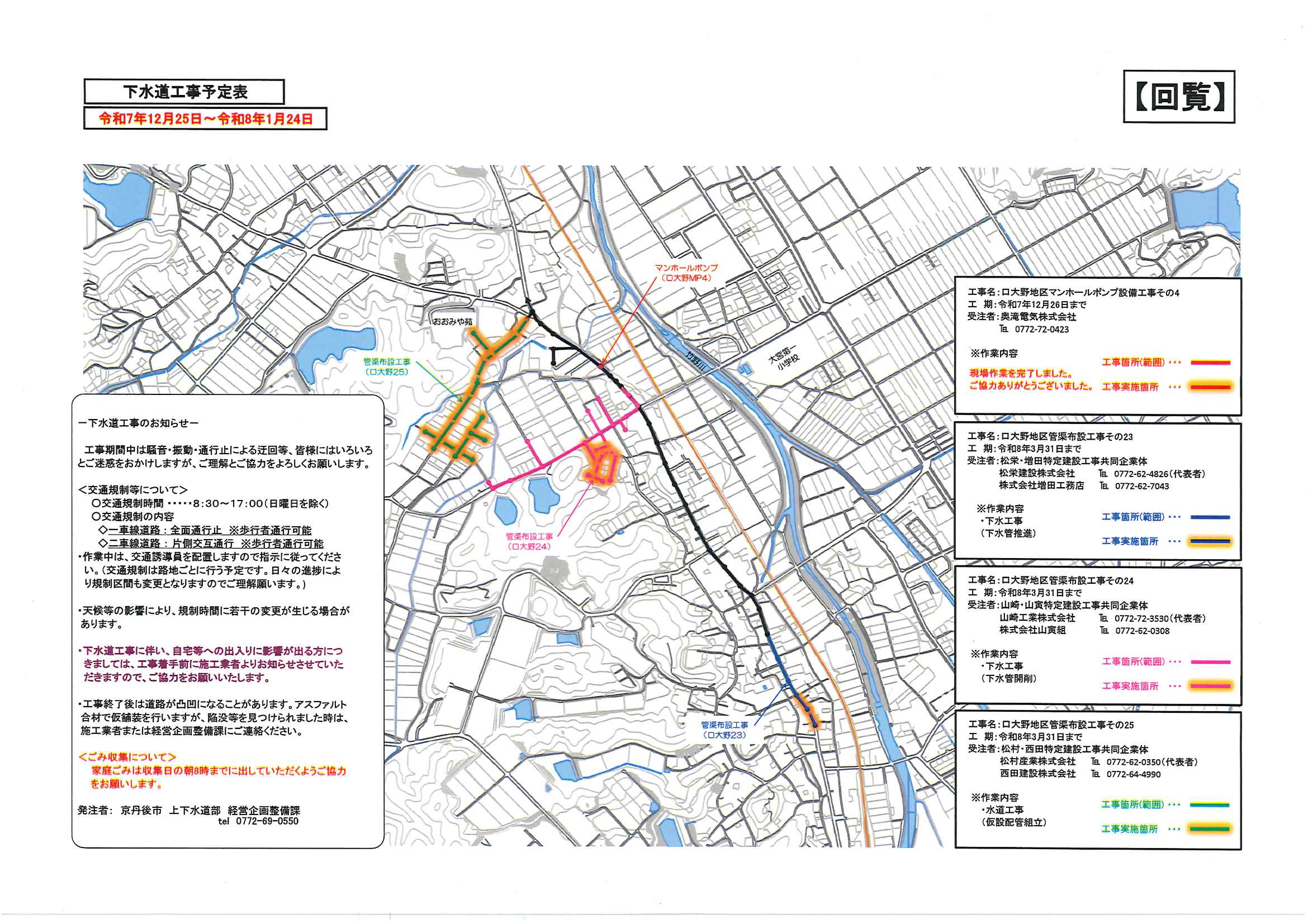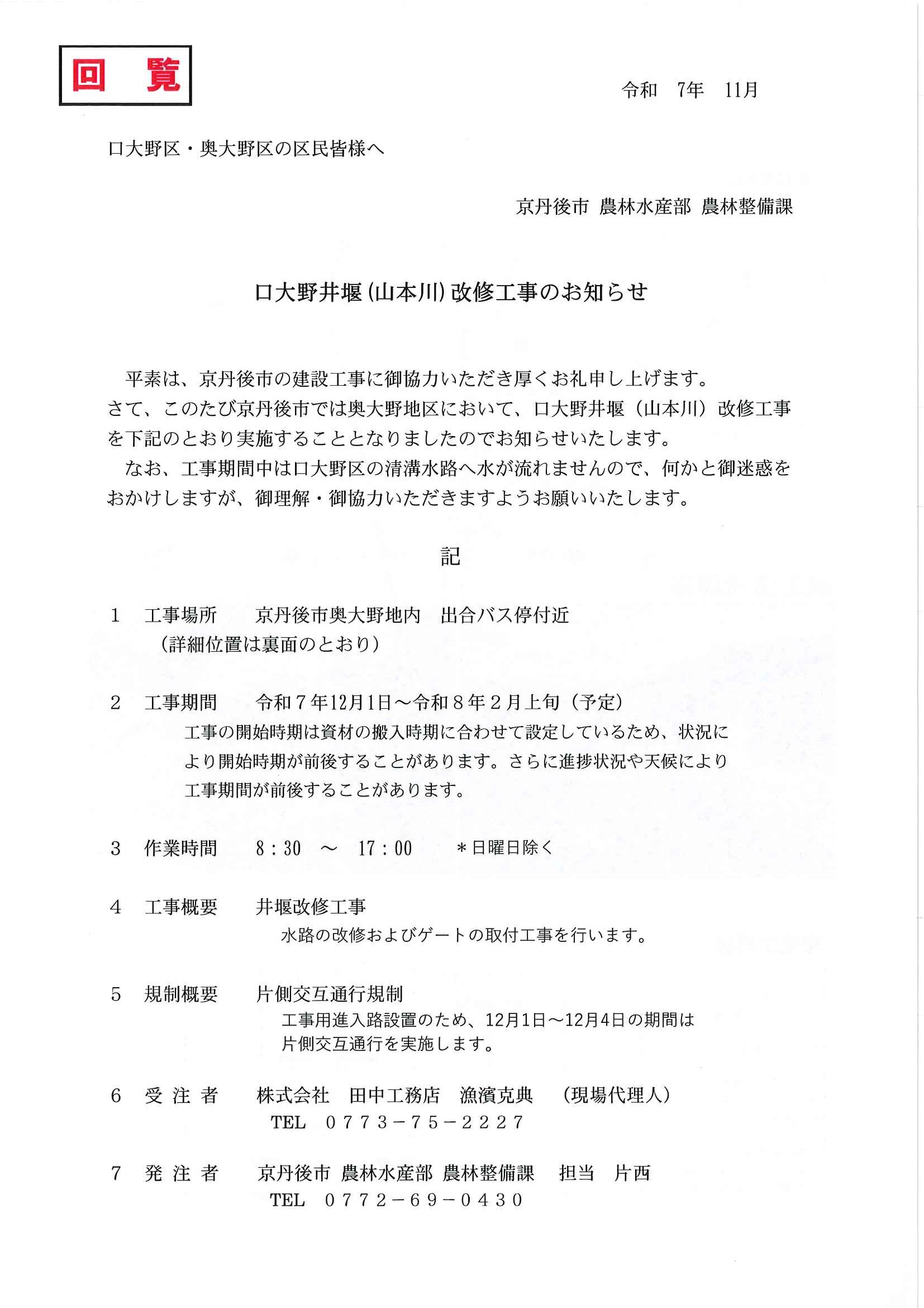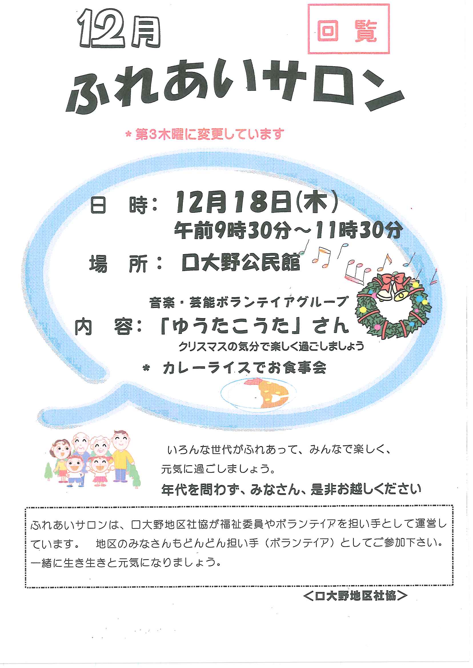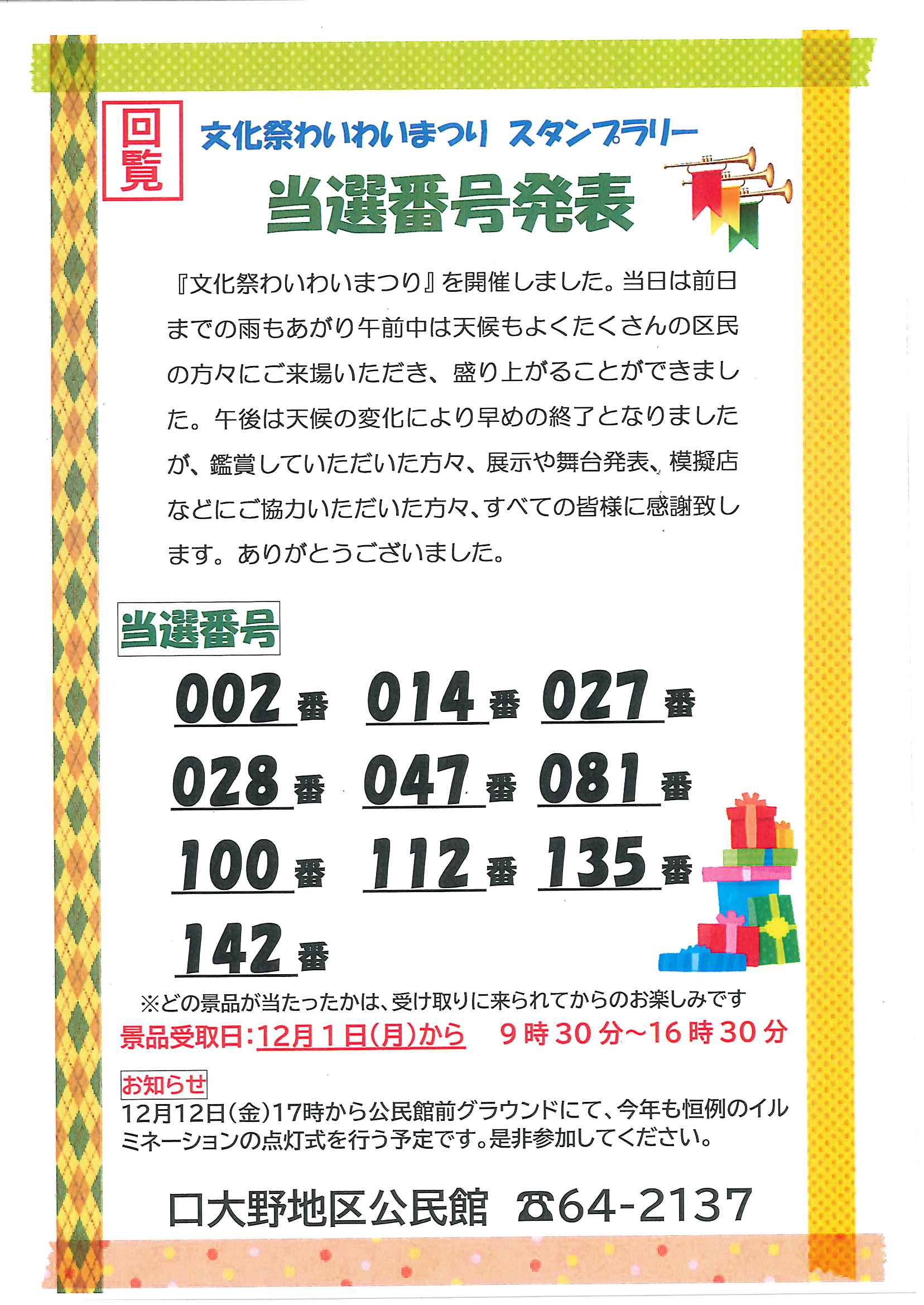 回覧版は読み終えたらすぐにお隣さんへ! 次回配布は1月13日の予定です 良い年をお迎えください <12月11日> ・京丹後市農業委員会だよりN062 ・京丹後警察署からのお知らせ&2026カレンダー ・市社協主催レクレーション講座 ・「賀正」札 ・区事務所年末年始のお知らせ ・年越しそば予約受付中(麺打ち倶楽部) ・大野神社の初詣 ・大野神社秋の例大祭(神輿・樂太鼓)決算書 ・令和7年歳末たすけあい募金の集計 ・口大野区民だより 裏面 ・おうちでラクラク&スマホ申告 裏面 ・大宮駐在所ミニ広報紙 大宮パトロール ・保幼小中一貫教育だより 裏面 ・大中だより 裏面 ・一小の子 裏面 ・きたほいくしょだより <隣組長あて>・神札の配布と集金のお願い 回覧版は読み終えたらすぐにお隣さんへ! 次回配布は12月26日の予定です <11月26日> ・広報京丹後12月号 ・京丹後市議会だより第86号 ・京丹後市社協だより こころ第108号 ・シニア向け求人情報
