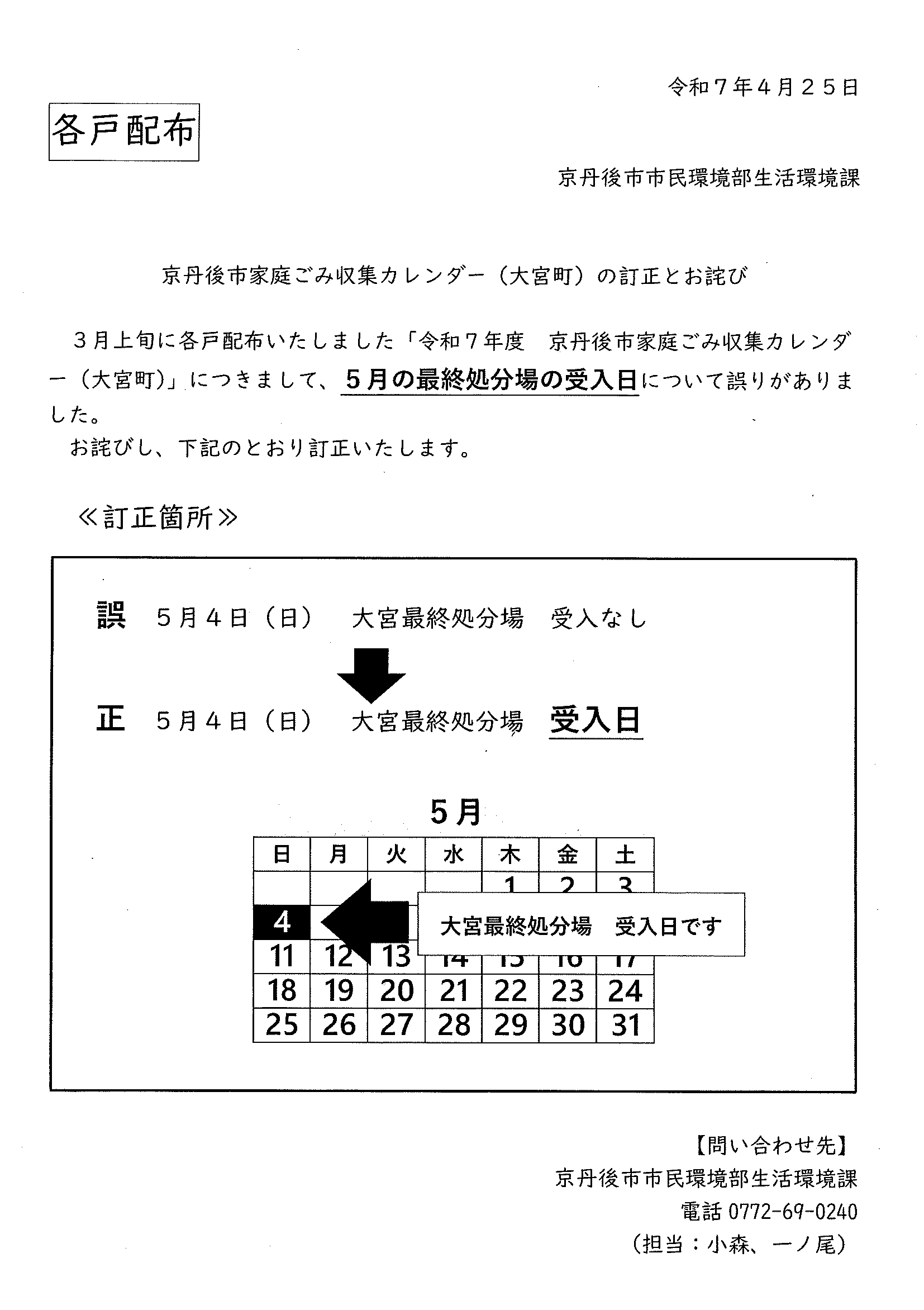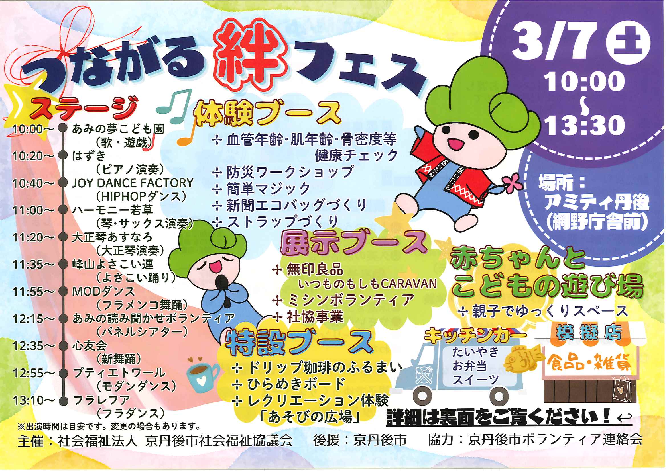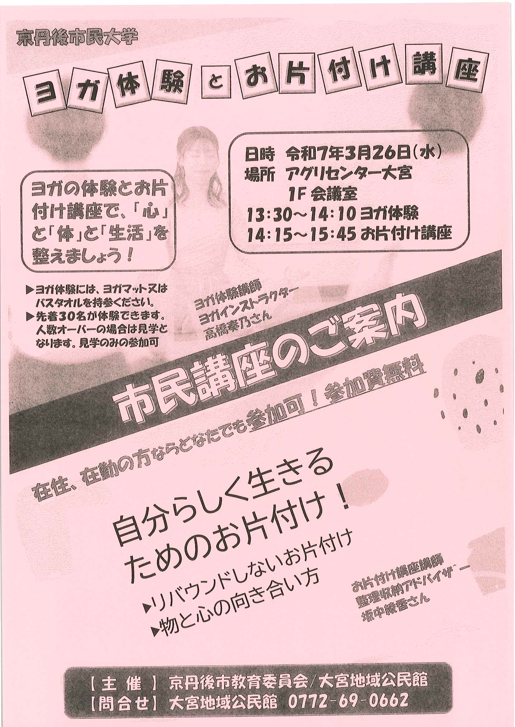 <3月11日> ・広報京丹後お知らせ版 ・京丹後市公共交通ガイドブック ・令和7年度家庭ごみ収集カレンダー ・大宮町新コミ区長協議会からのお知らせ 2面 3面 4面 ・つながる絆フェス 裏面 ・ヨガ体験とお片付け講座