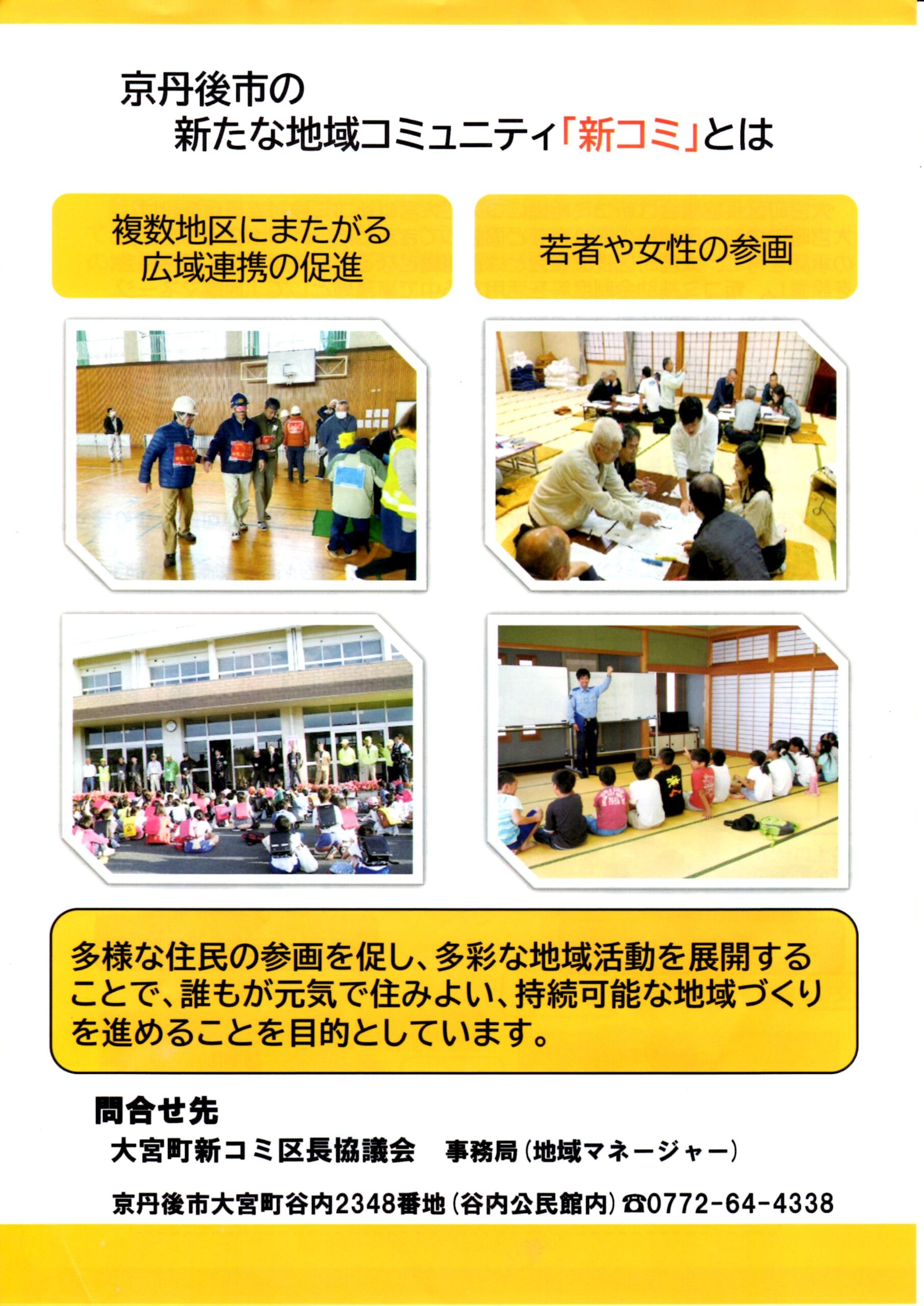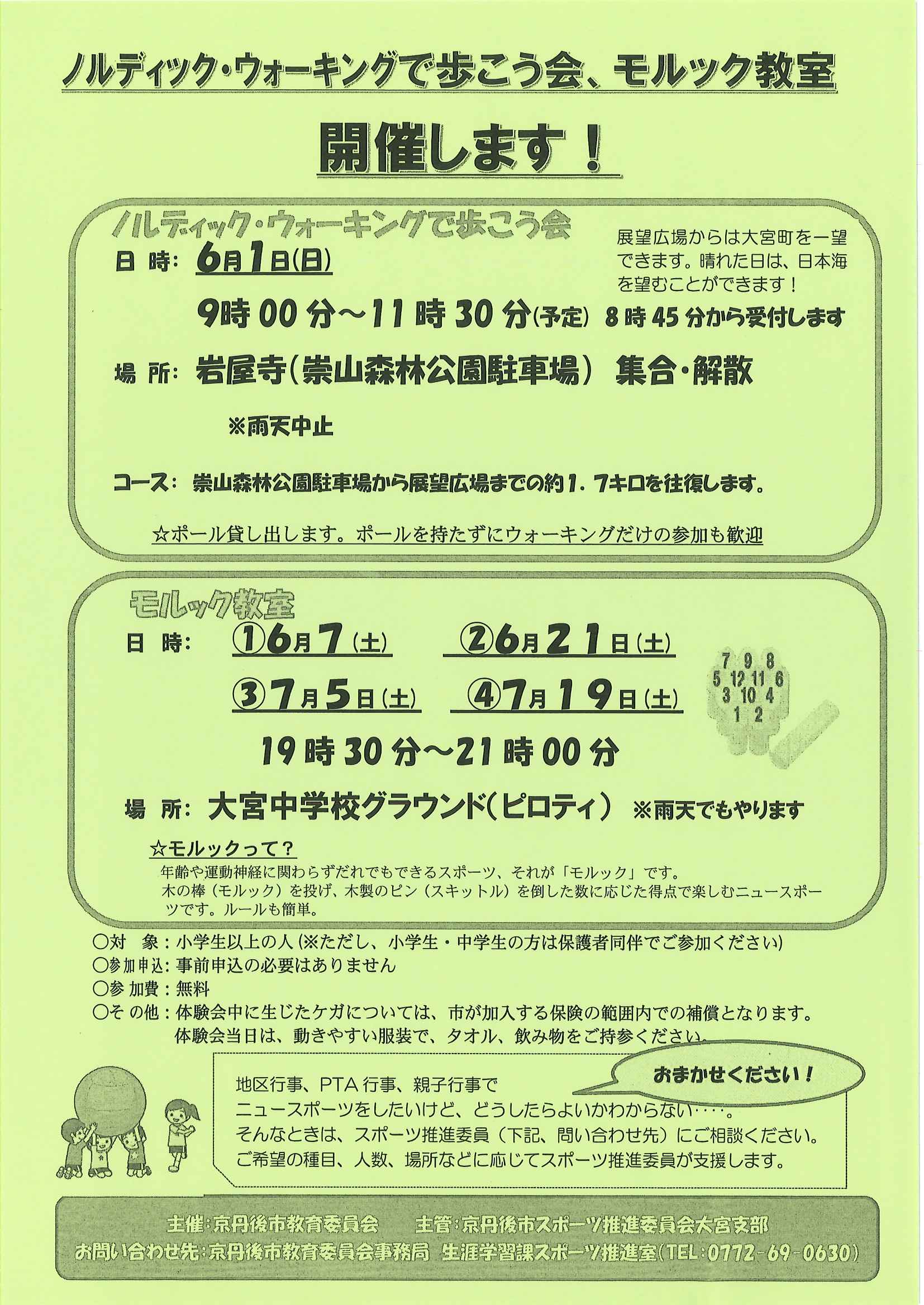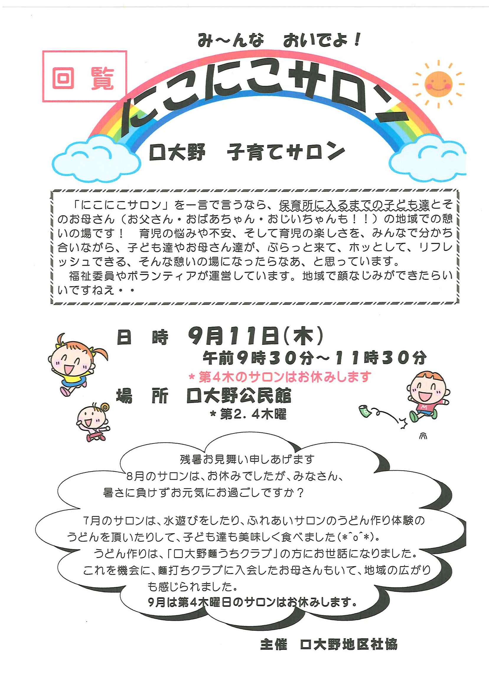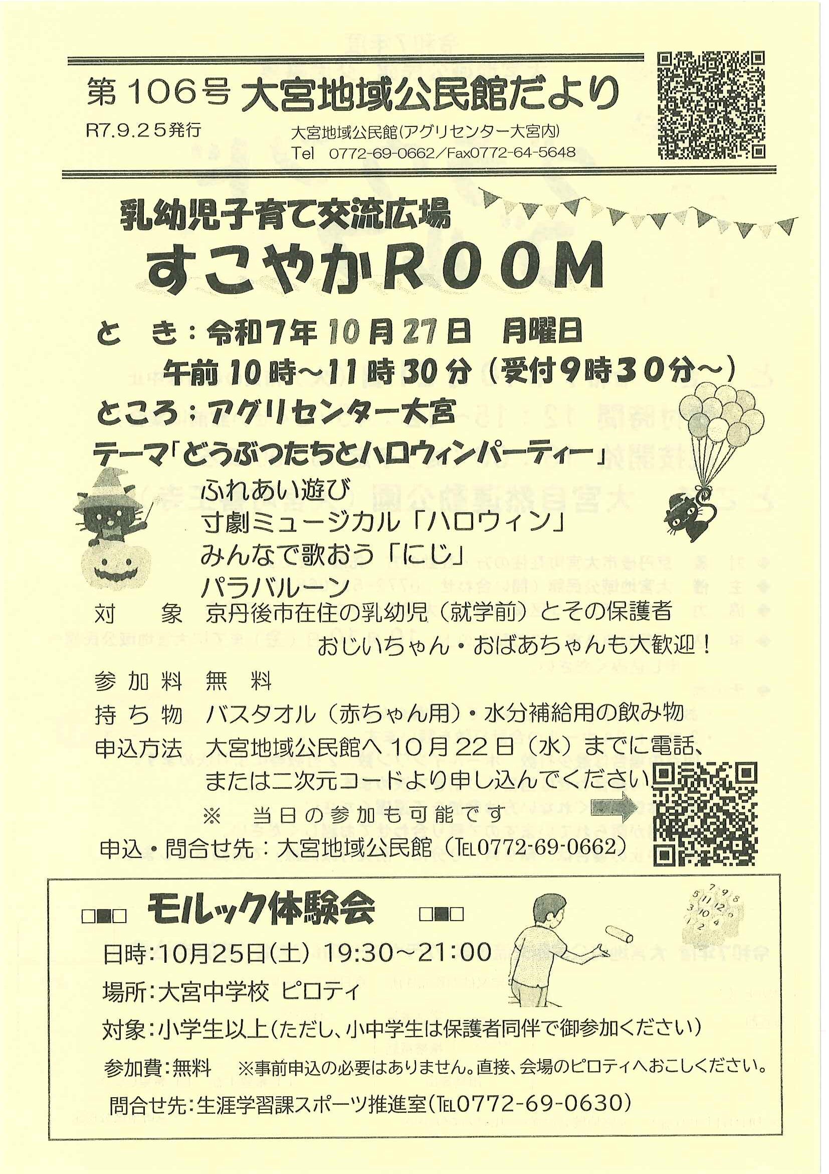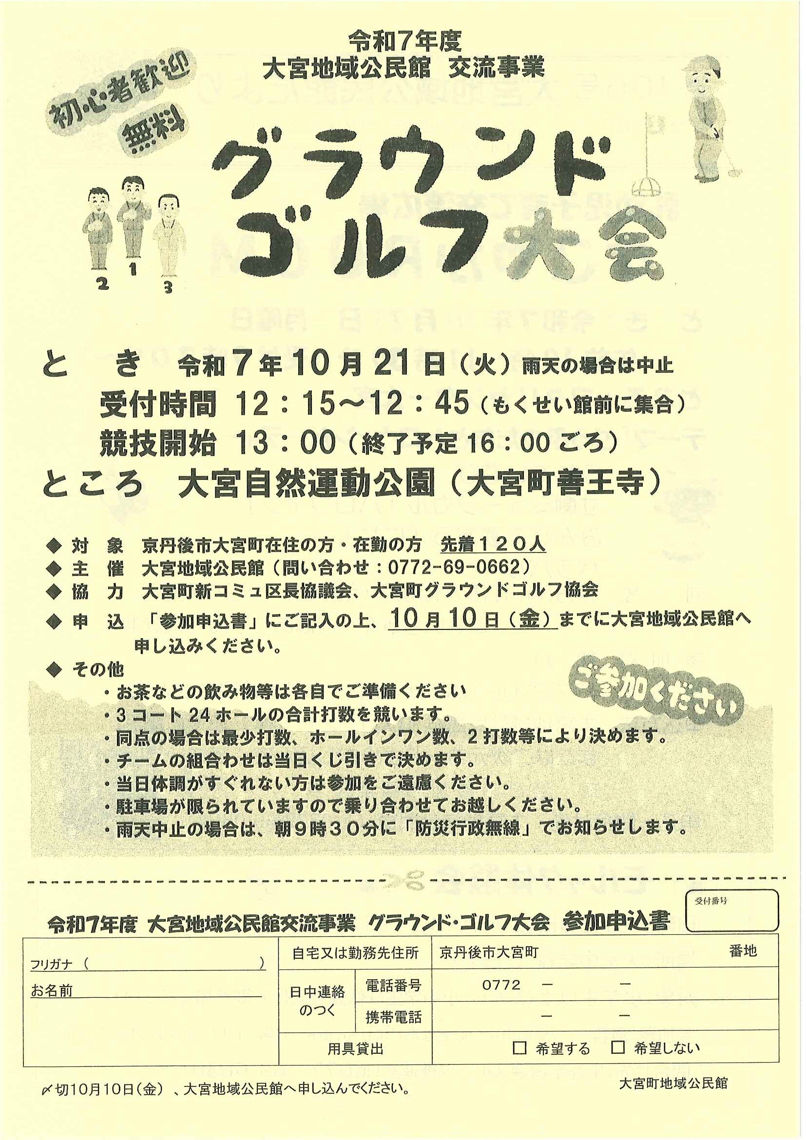 ・口大野公民館主催グラウンドゴルフ大会 ・にこにこサロン(子育てサロン)9月 ・口大野地区公民館だより 裏面 ・大宮市民局NEWSおおみやトピックス 裏面 ・モルック体験会 ・ゆかたノオト和装で紡ぐ夏の夕暮れ 裏面 ・地域おこしラジオ丹後を語る番組 ・下水道工事予定表(8/25-) ・きたほいくしょだより