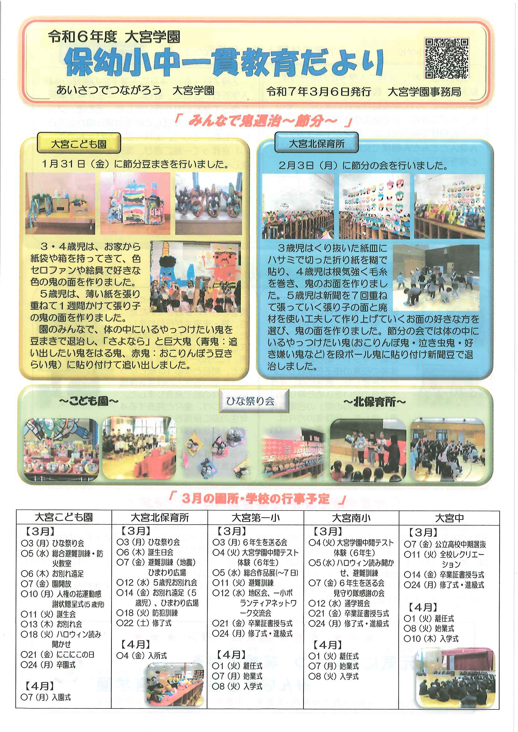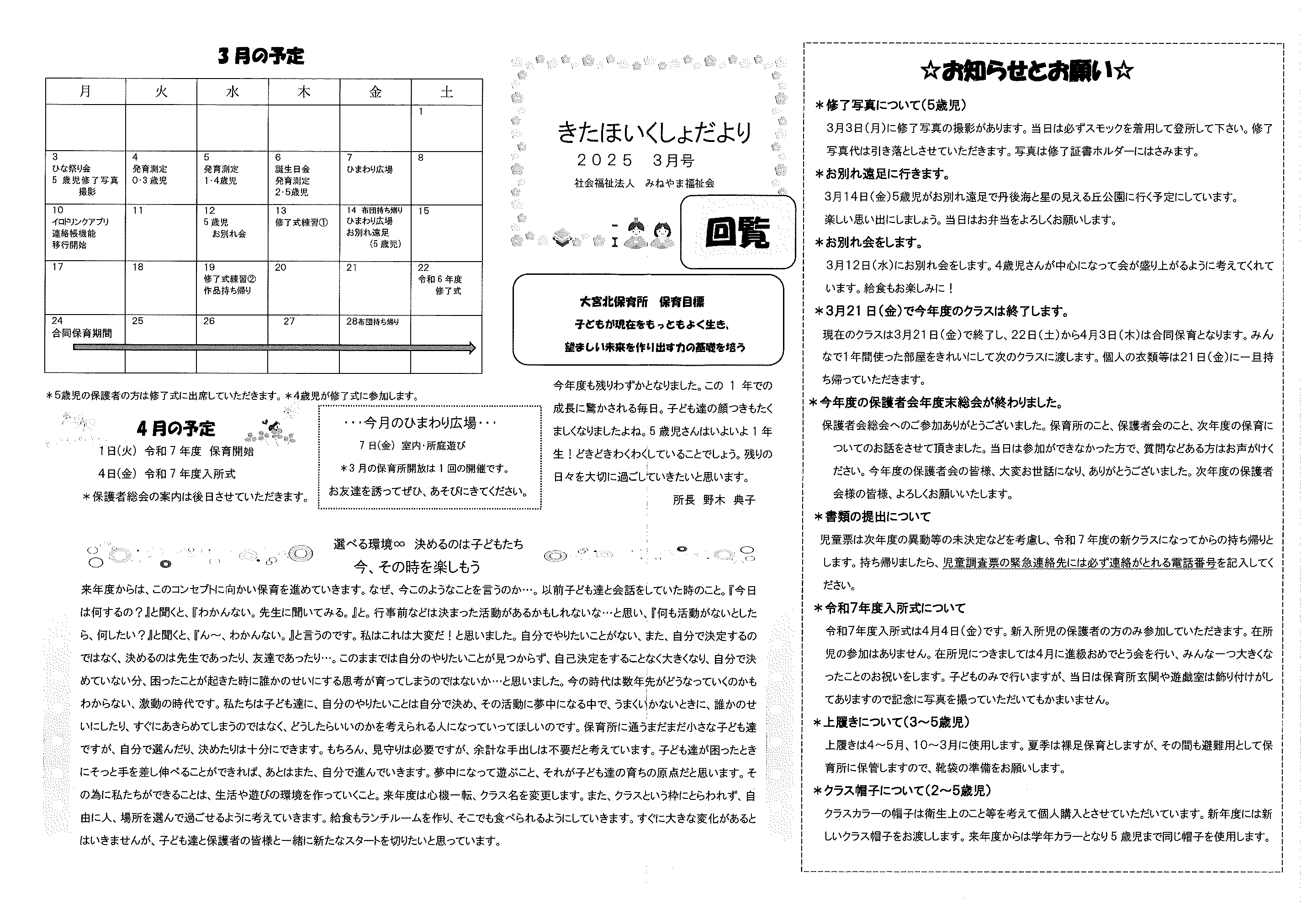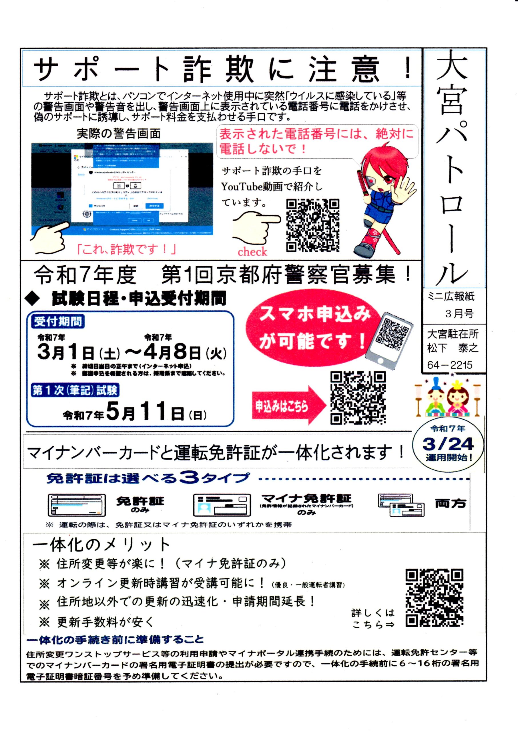 ・大宮市民局NEWSおおみやトピックス ・令和6年度歳末たすけあい運動について(お礼) ・令和6年度赤い羽根共同募金運動について(お礼) ・3月ふれあいサロン ・大宮駐在所ミニ広報紙大宮パトロール ・口大野農地環境保全員会だより ・大内峠一字観公園ノルディックウオーキング ・女性消防団員募集中 ・らくざミュージックライブ ・保幼小中一貫教育だより3/6号 裏面 ・保幼小中一貫教育だより3/10号 裏面 ・大宮中学校だより 裏面 ・一小の子 裏面