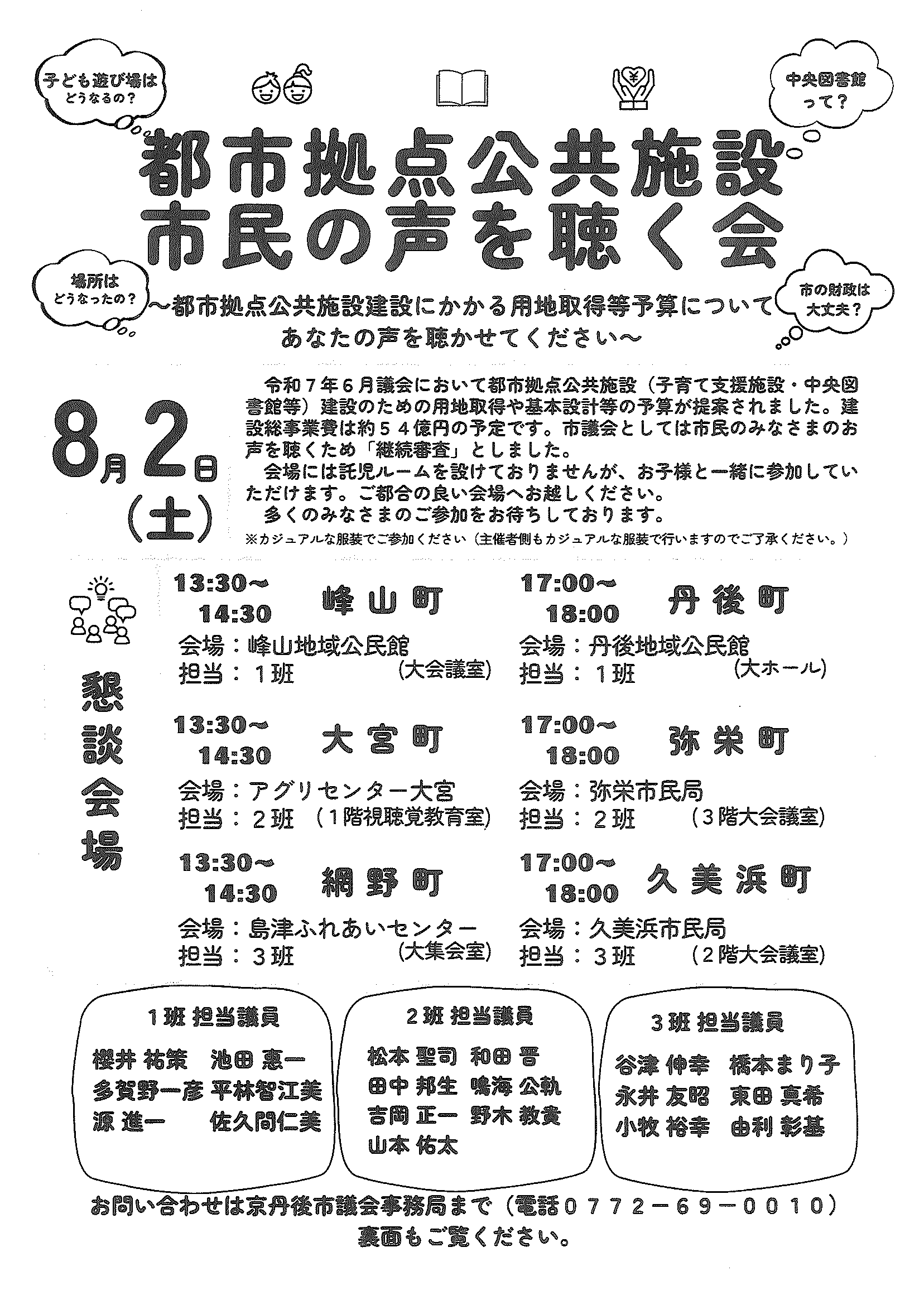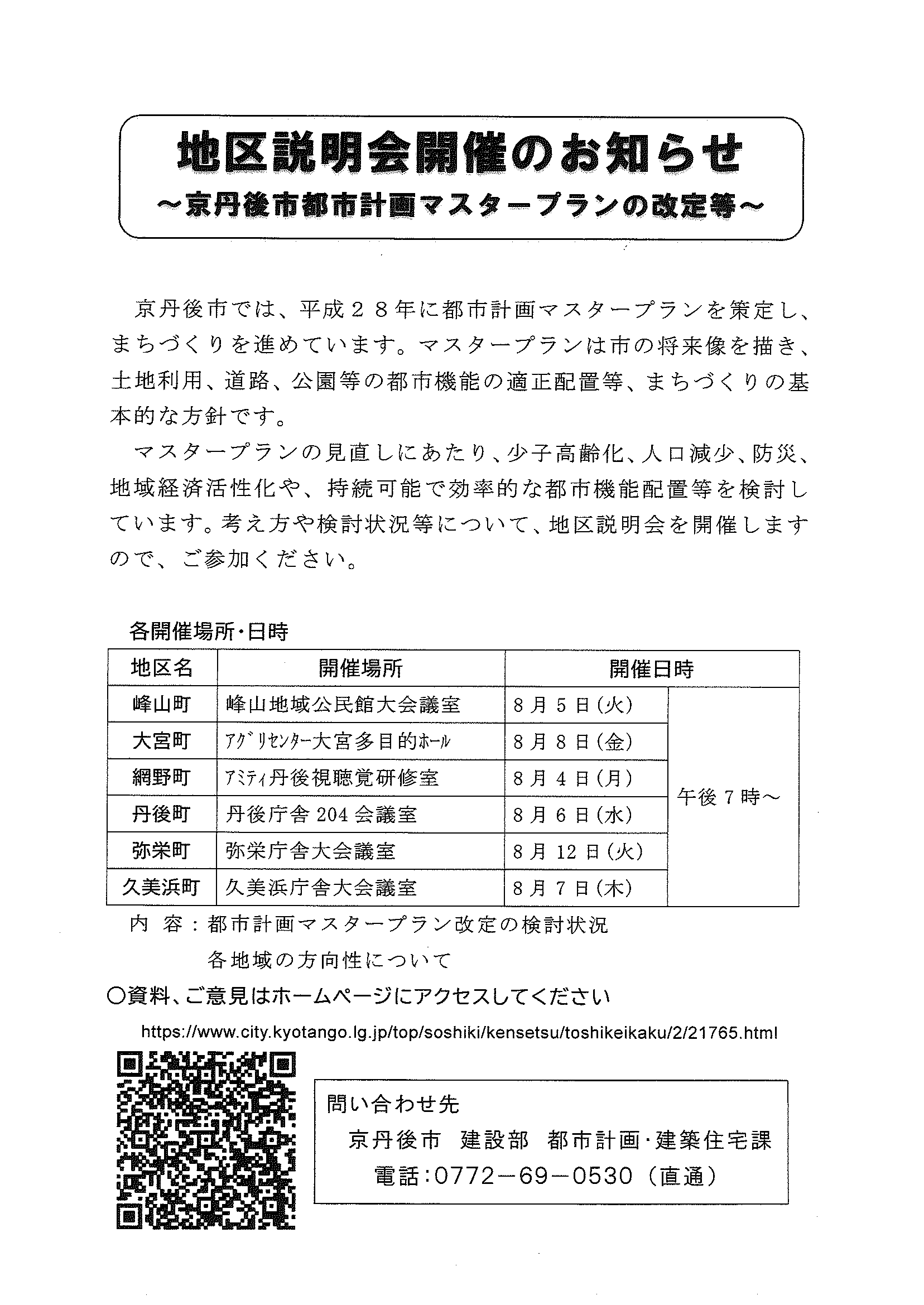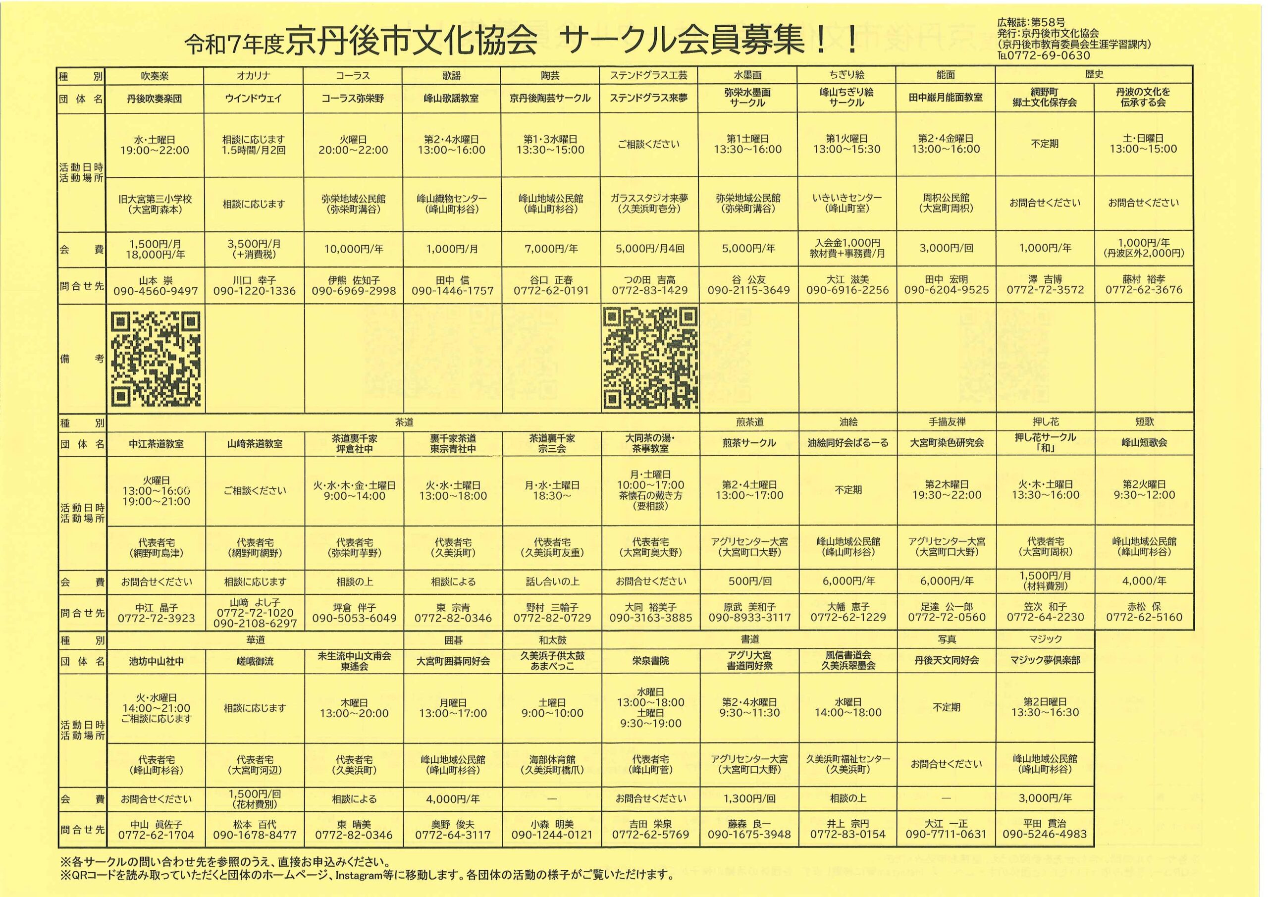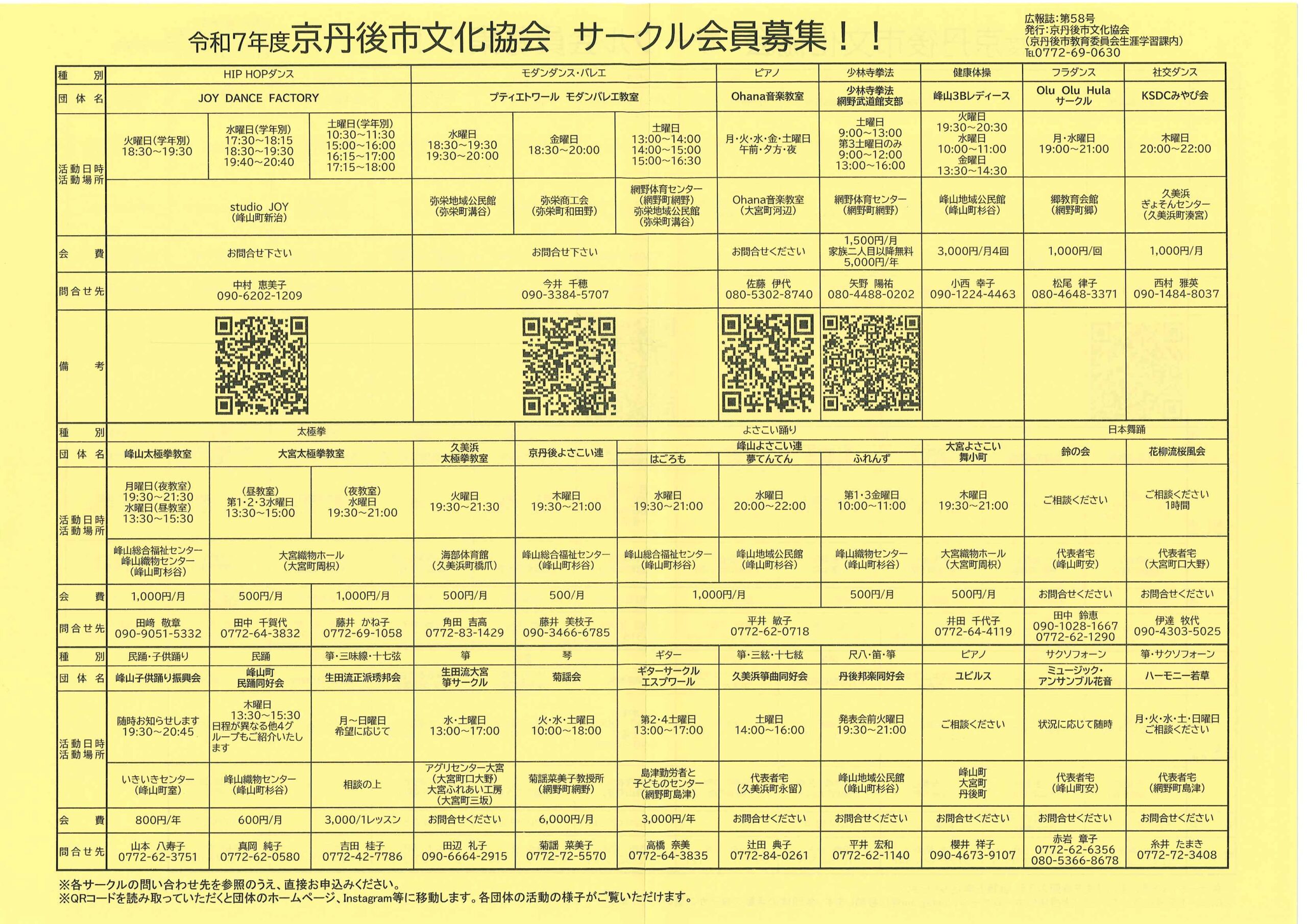 <7月28日> ・広報京丹後8月 ・都市拠点公共施設市民の声を聴く会 裏面 ・地域の居場所担い手養成講座 裏面 ・市社協だより こころ ・ものづくり基礎技術習得研修受講生募集 2面 3面 4面 ・市民と議会の懇談会参加者募集 裏面 ・市都市計画マスタープランの改定等地区説明会 ・森林の適正な維持管理セミナー開催 裏面 ・京丹後市文化協会サークル会員募集 裏面 ・京丹後アートフェスティバル2025