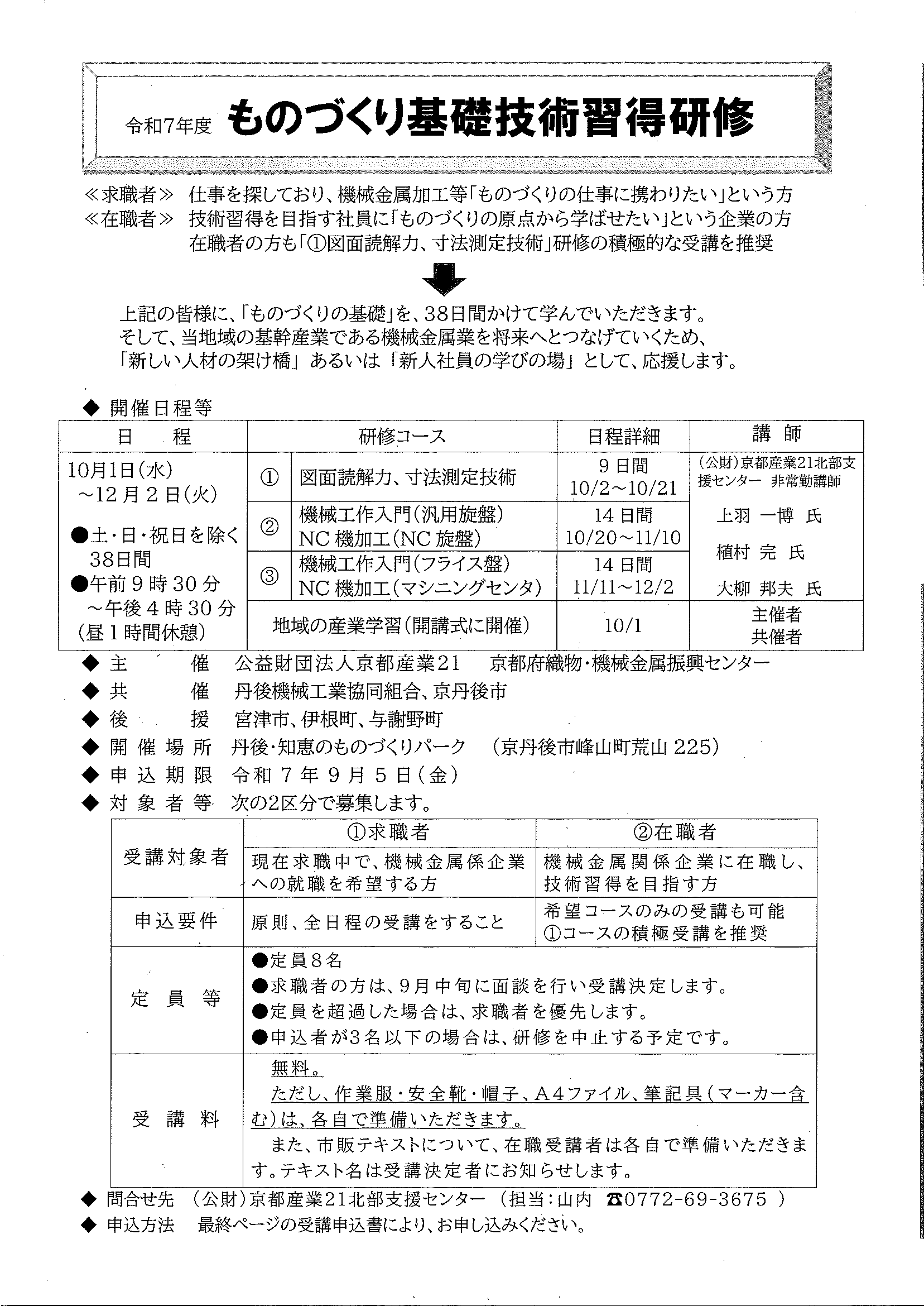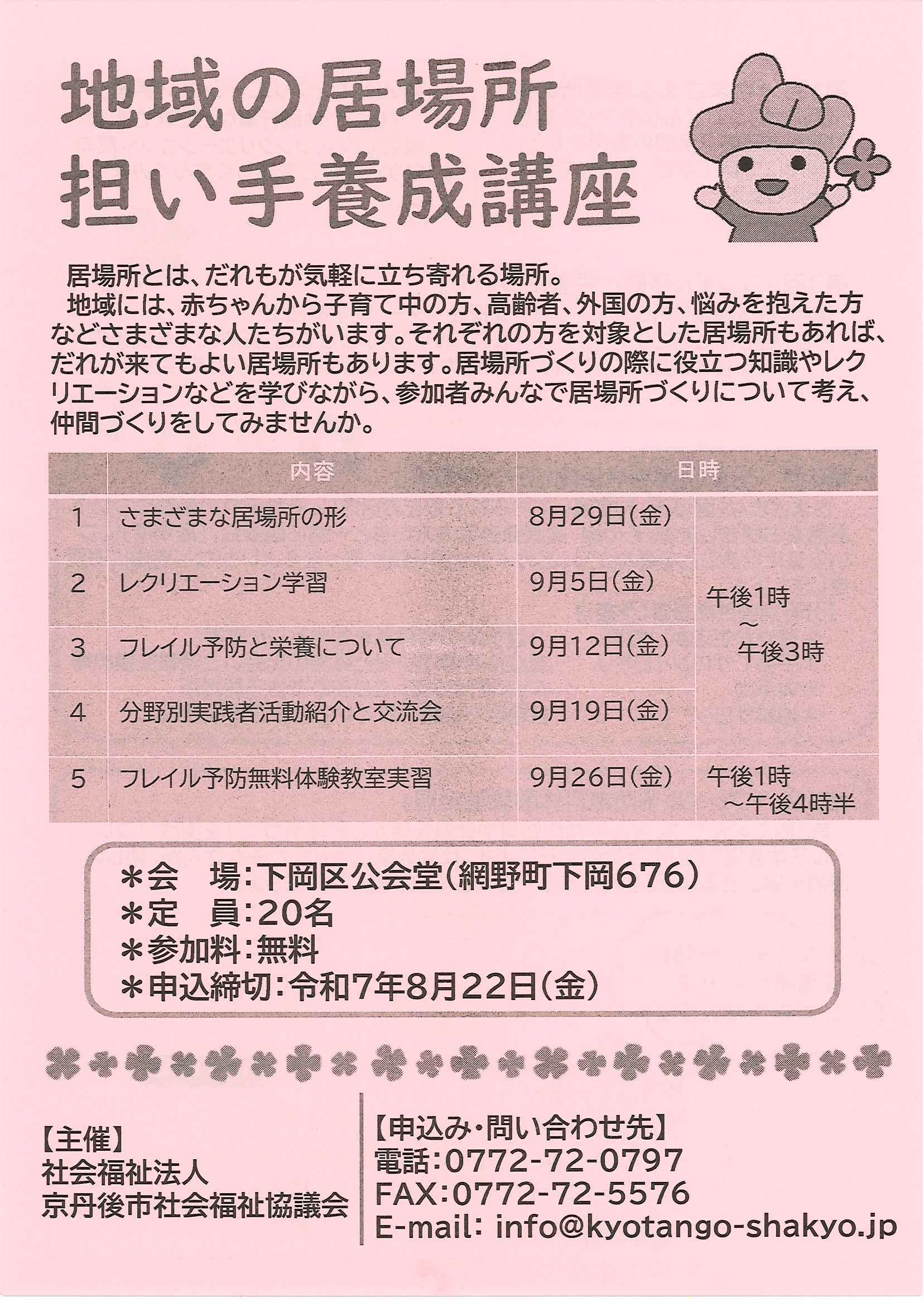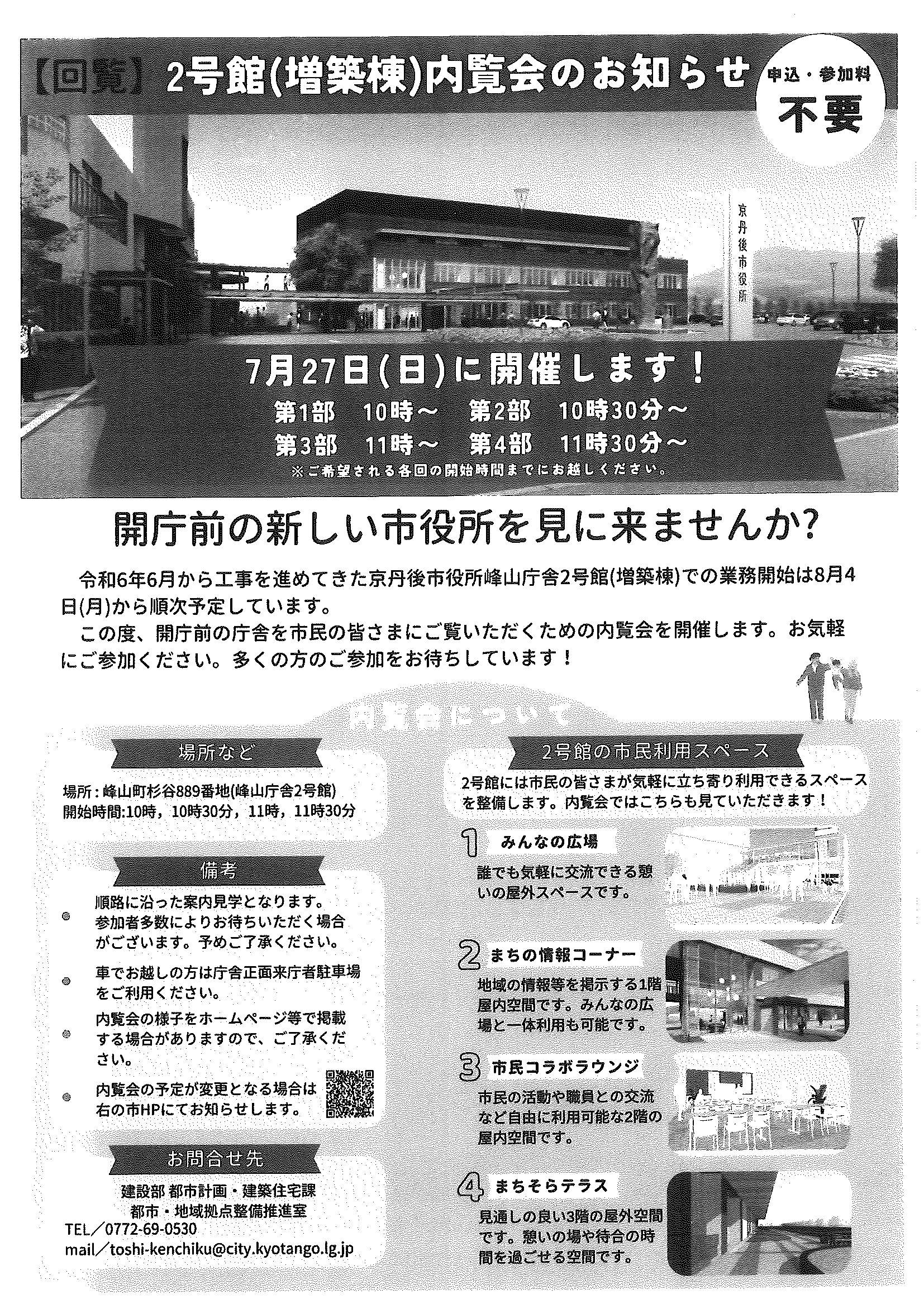 <7月28日> ・広報京丹後8月 ・都市拠点公共施設市民の声を聴く会 裏面 ・地域の居場所担い手養成講座 裏面 ・市社協だより こころ ・ものづくり基礎技術習得研修受講生募集 2面 3面 4面 ・市民と議会の懇談会参加者募集 裏面 ・市都市計画マスタープランの改定等地区説明会 ・森林の適正な維持管理セミナー開催 裏面 ・京丹後市文化協会サークル会員募集 裏面 ・京丹後アートフェスティバル2025