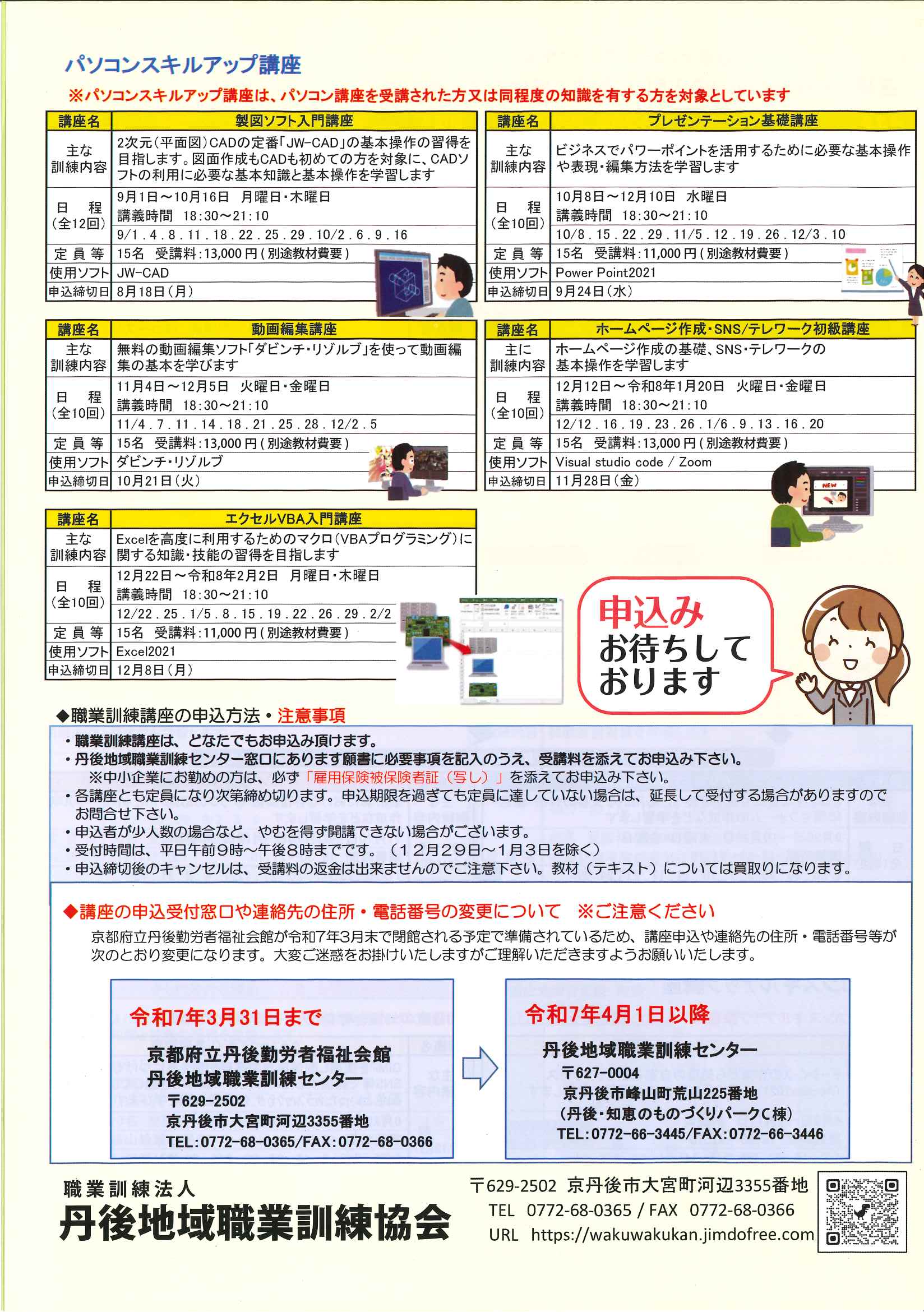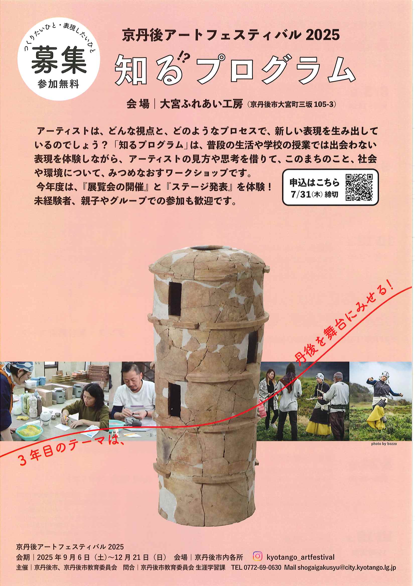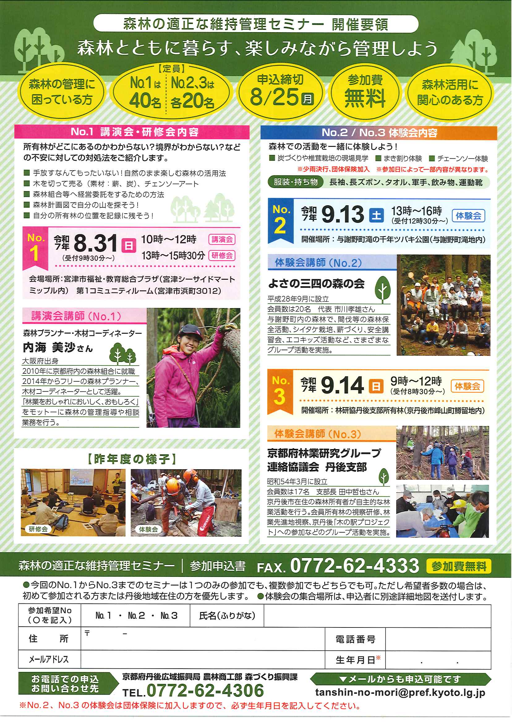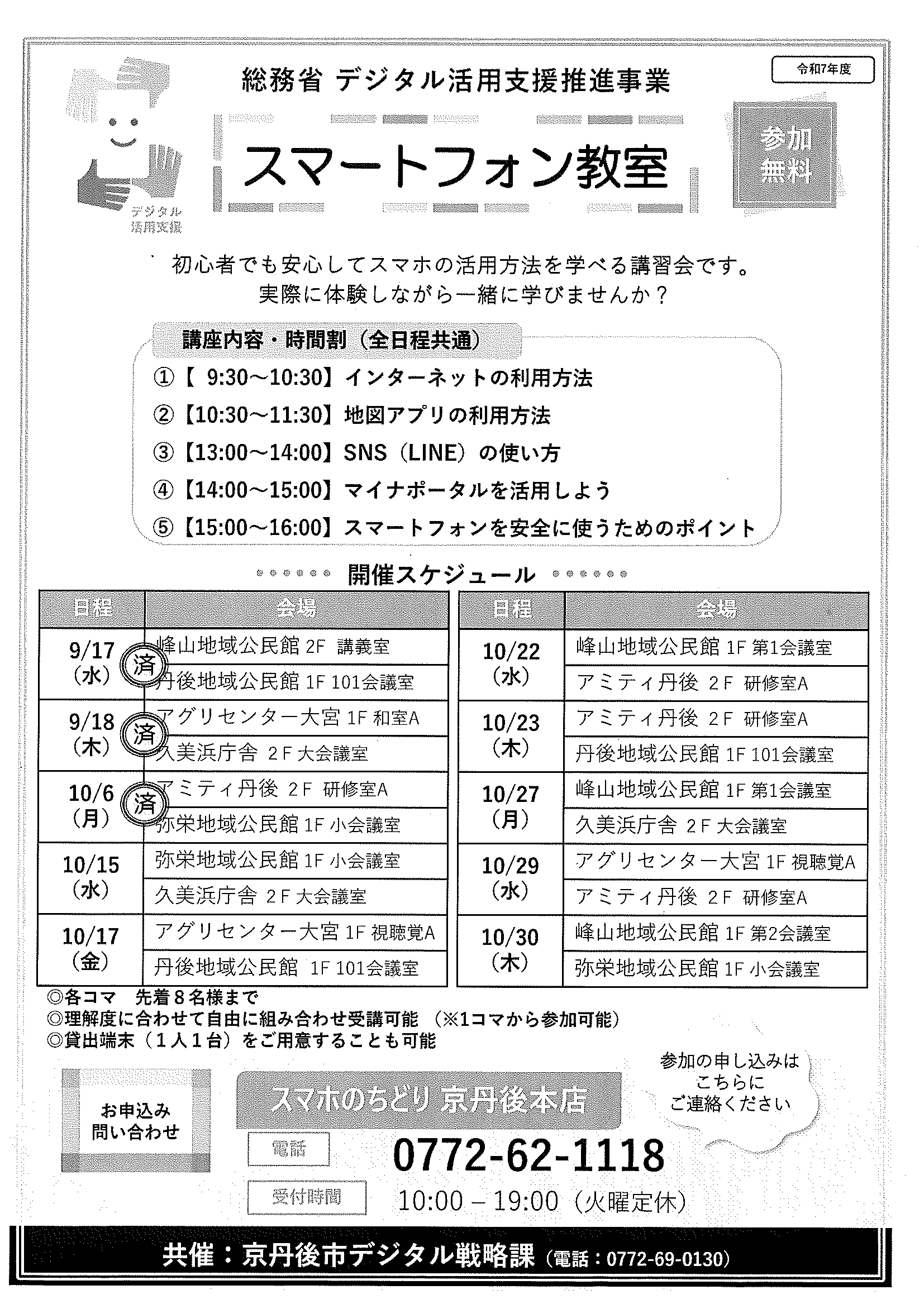 <7月28日> ・広報京丹後8月 ・都市拠点公共施設市民の声を聴く会 裏面 ・地域の居場所担い手養成講座 裏面 ・市社協だより こころ ・ものづくり基礎技術習得研修受講生募集 2面 3面 4面 ・市民と議会の懇談会参加者募集 裏面 ・市都市計画マスタープランの改定等地区説明会 ・森林の適正な維持管理セミナー開催 裏面 ・京丹後市文化協会サークル会員募集 裏面 ・京丹後アートフェスティバル2025