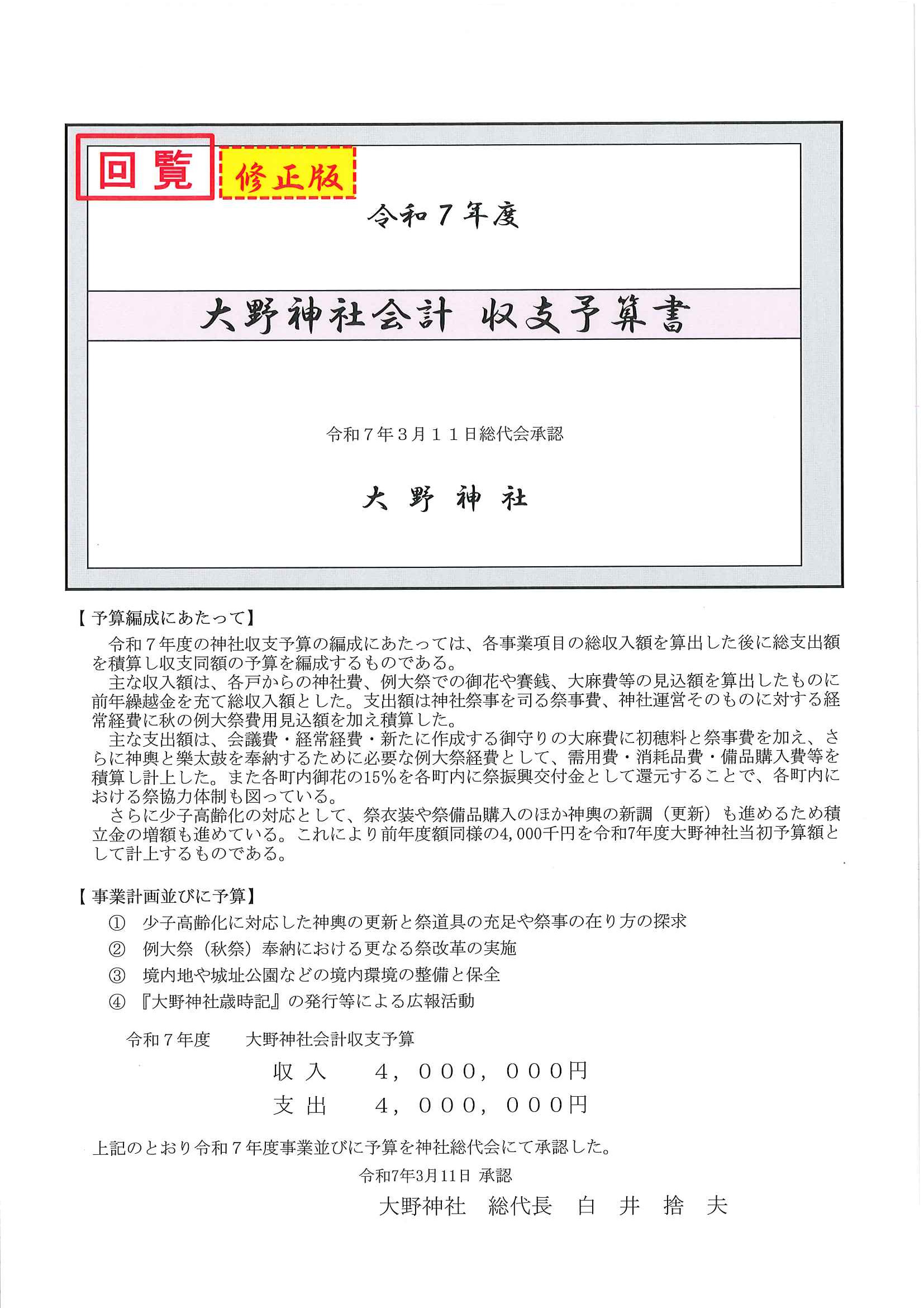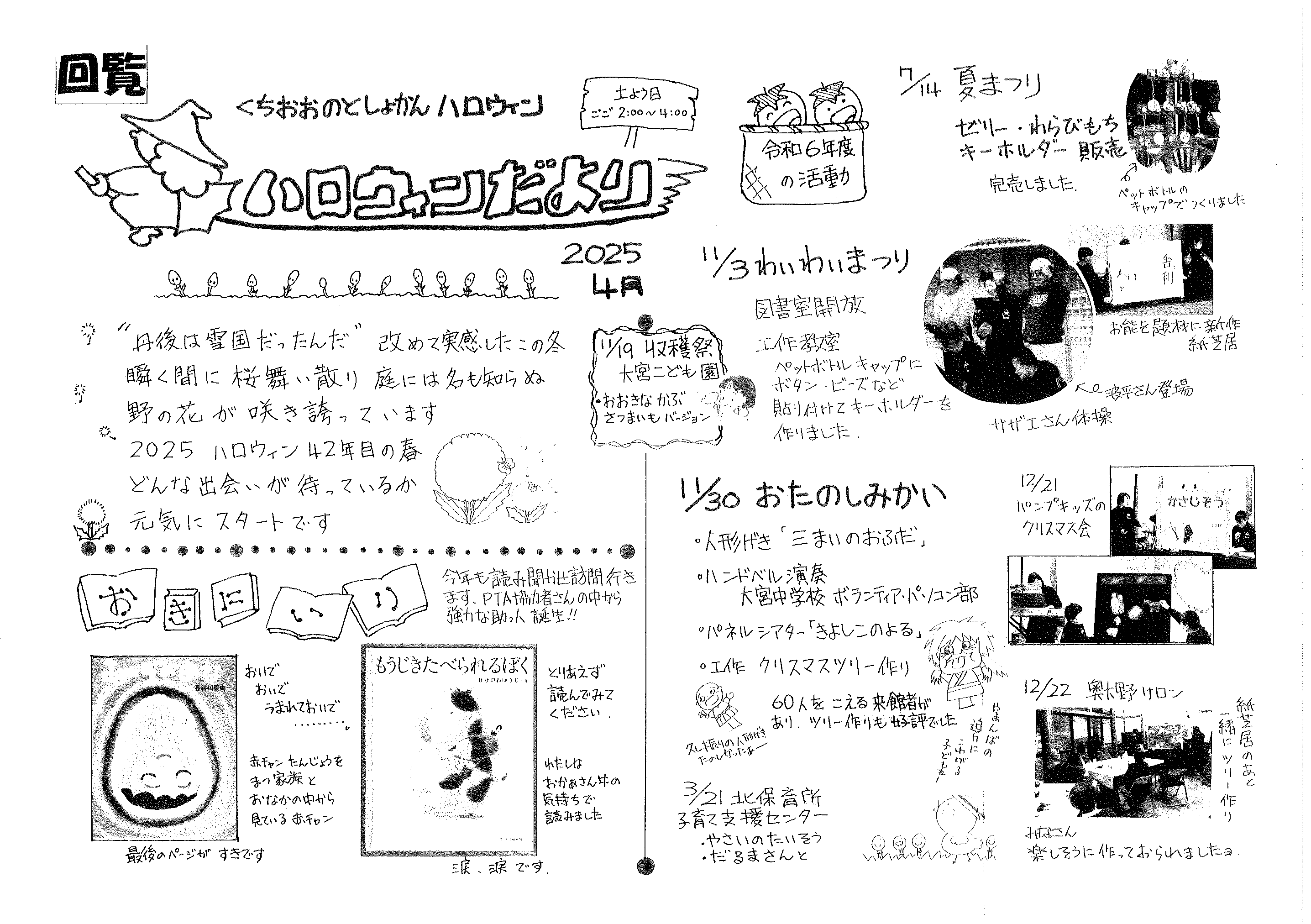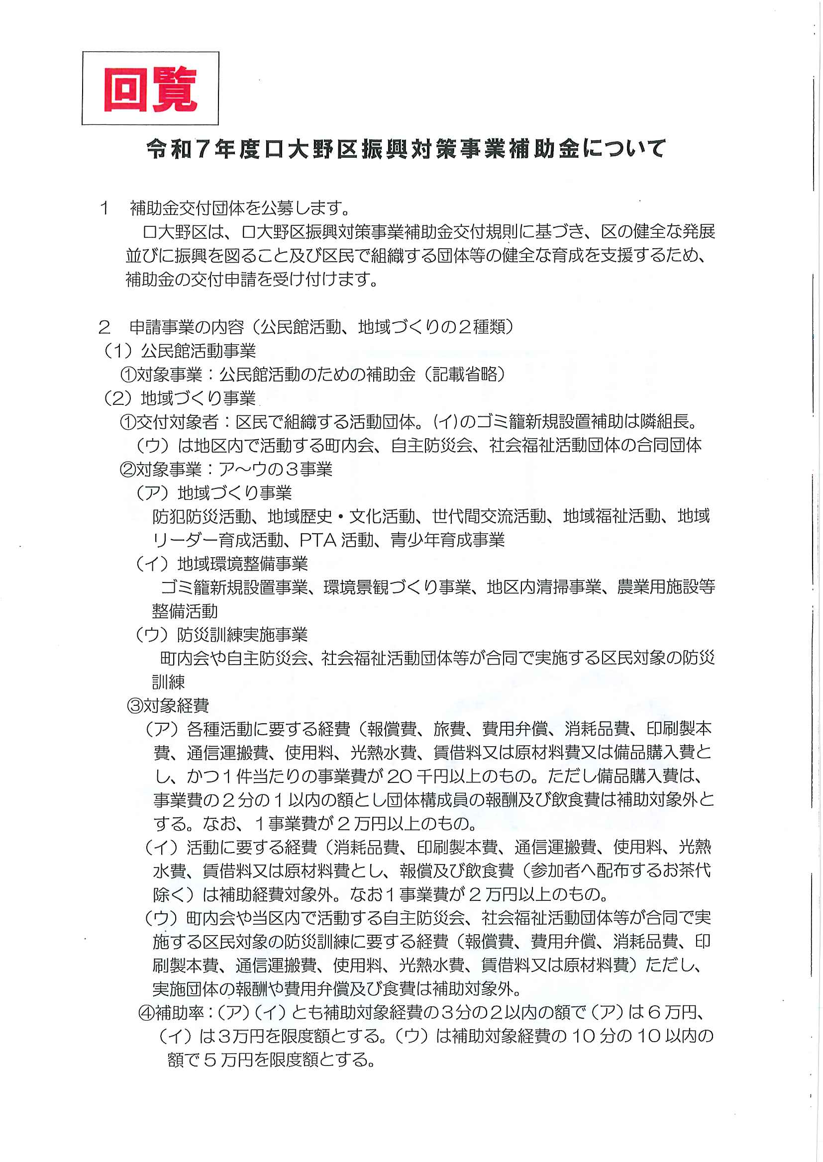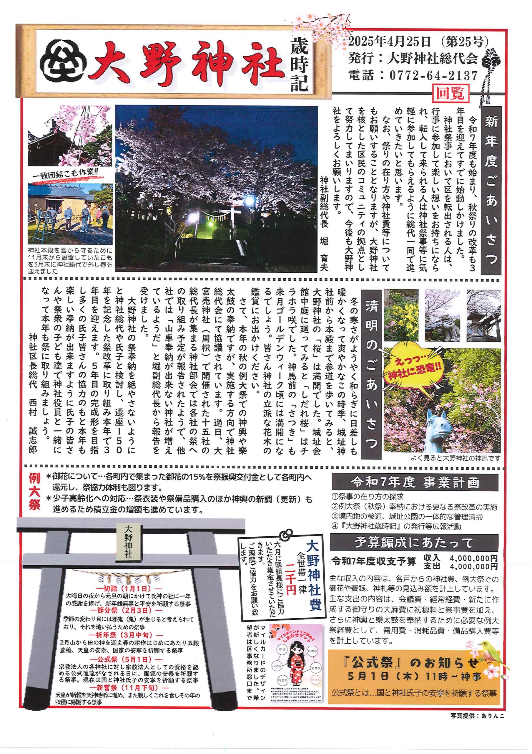 ・令和7年度区費納付についてのお知らせ ・大野神社令和7年度会計収支予算書の修正版 裏面 ・赤十字活動資金募集のお願い ・草刈りボランティア募集 ・口大野公民館歩こう会 ・5月にこにこサロン(子育てサロン) ・食生活改善推進員養成講座のお知らせ 裏面 ・下水道工事の予定表4/25- ・大宮市民局NEWSおおみやトピックス ・口大野図書館ハロウィンだより4月号 ・大野神社歳時記第25号 ・保幼小中一貫教育だより 裏面 ・大宮中学校だより 裏面 ・一小の子4/7 裏面 ・一小の子4/15 裏面