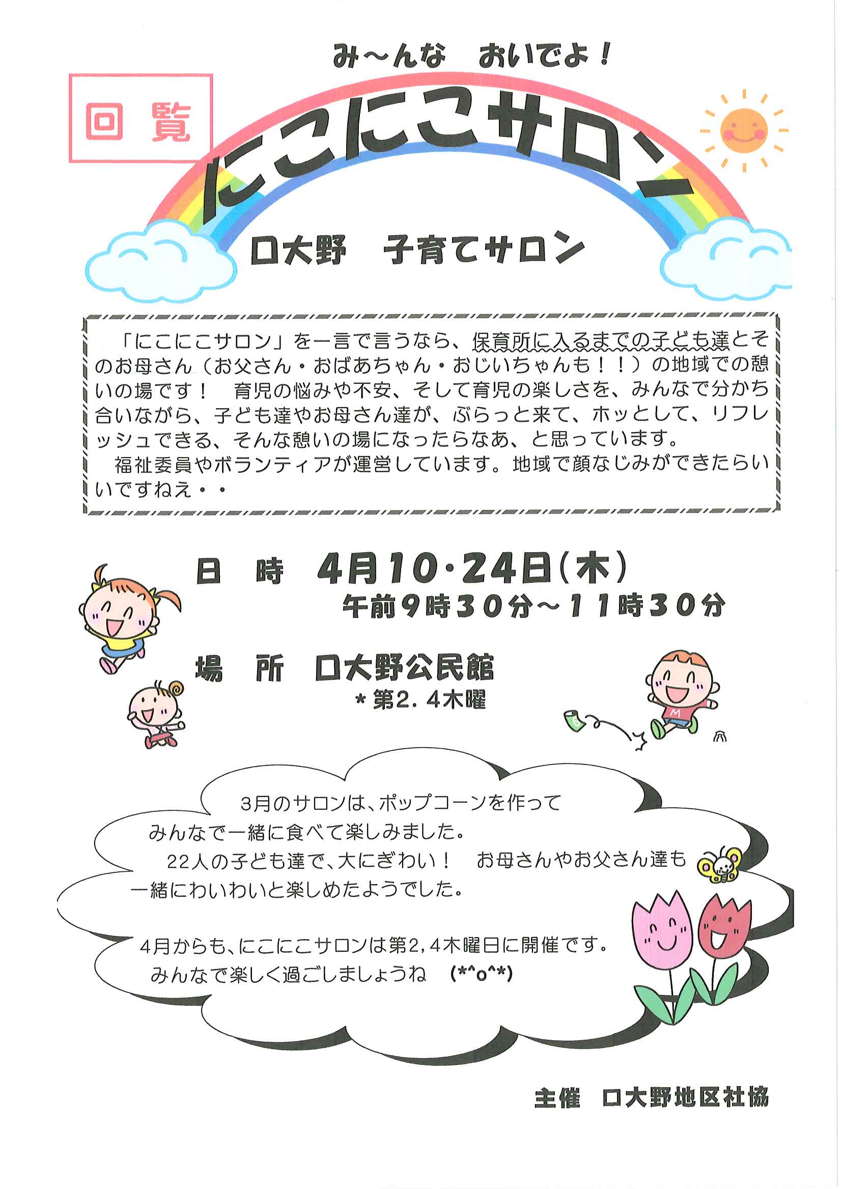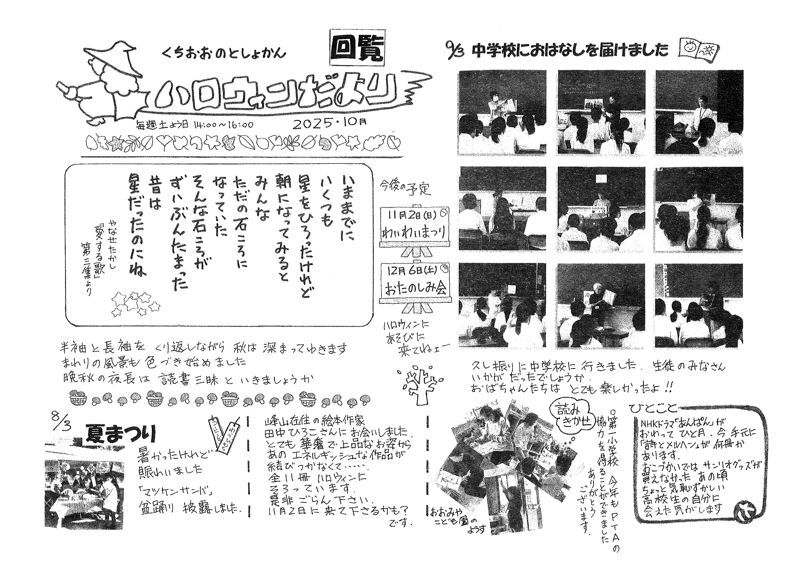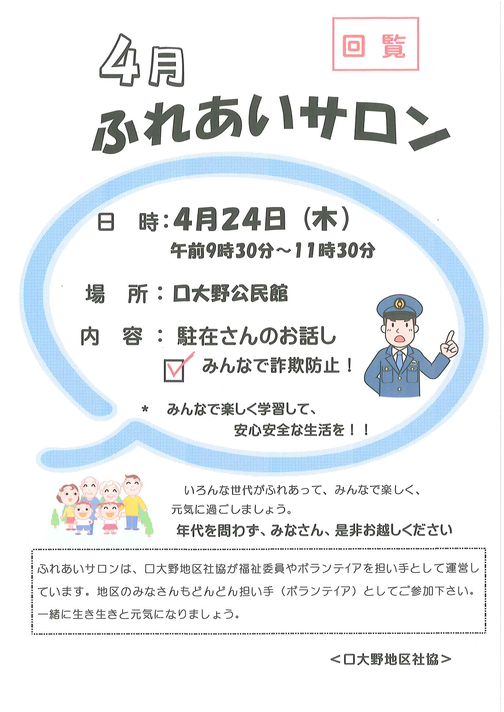 ・令和7年度区費納付についてのお知らせ ・大野神社令和7年度会計収支予算書の修正版 裏面 ・赤十字活動資金募集のお願い ・草刈りボランティア募集 ・口大野公民館歩こう会 ・5月にこにこサロン(子育てサロン) ・食生活改善推進員養成講座のお知らせ 裏面 ・下水道工事の予定表4/25- ・大宮市民局NEWSおおみやトピックス ・口大野図書館ハロウィンだより4月号 ・大野神社歳時記第25号 ・保幼小中一貫教育だより 裏面 ・大宮中学校だより 裏面 ・一小の子4/7 裏面 ・一小の子4/15 裏面