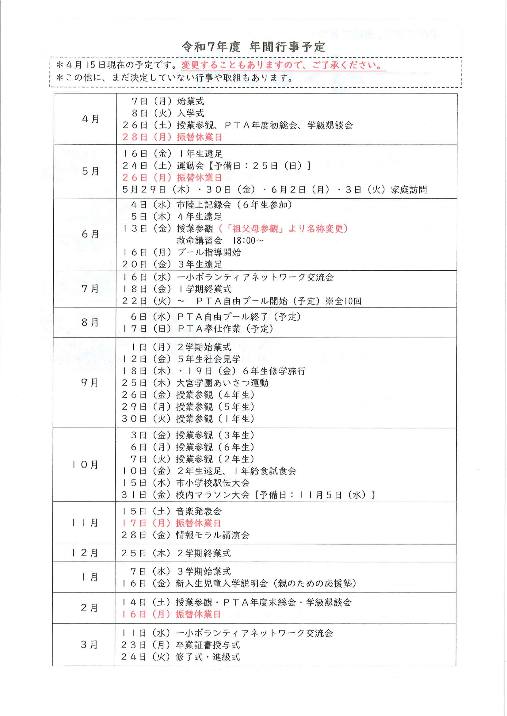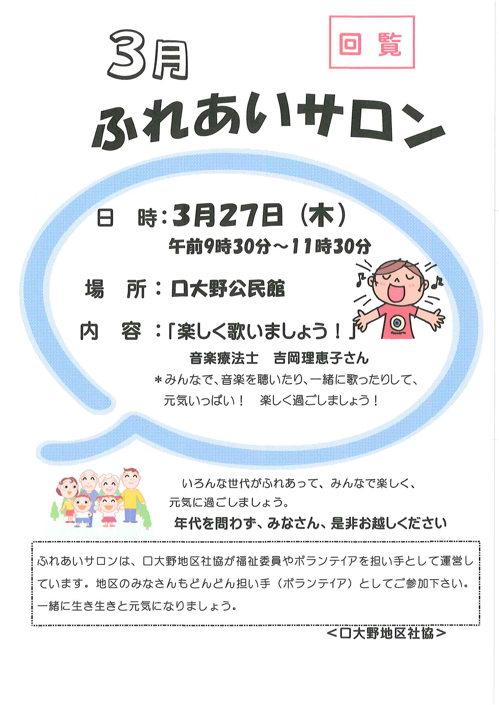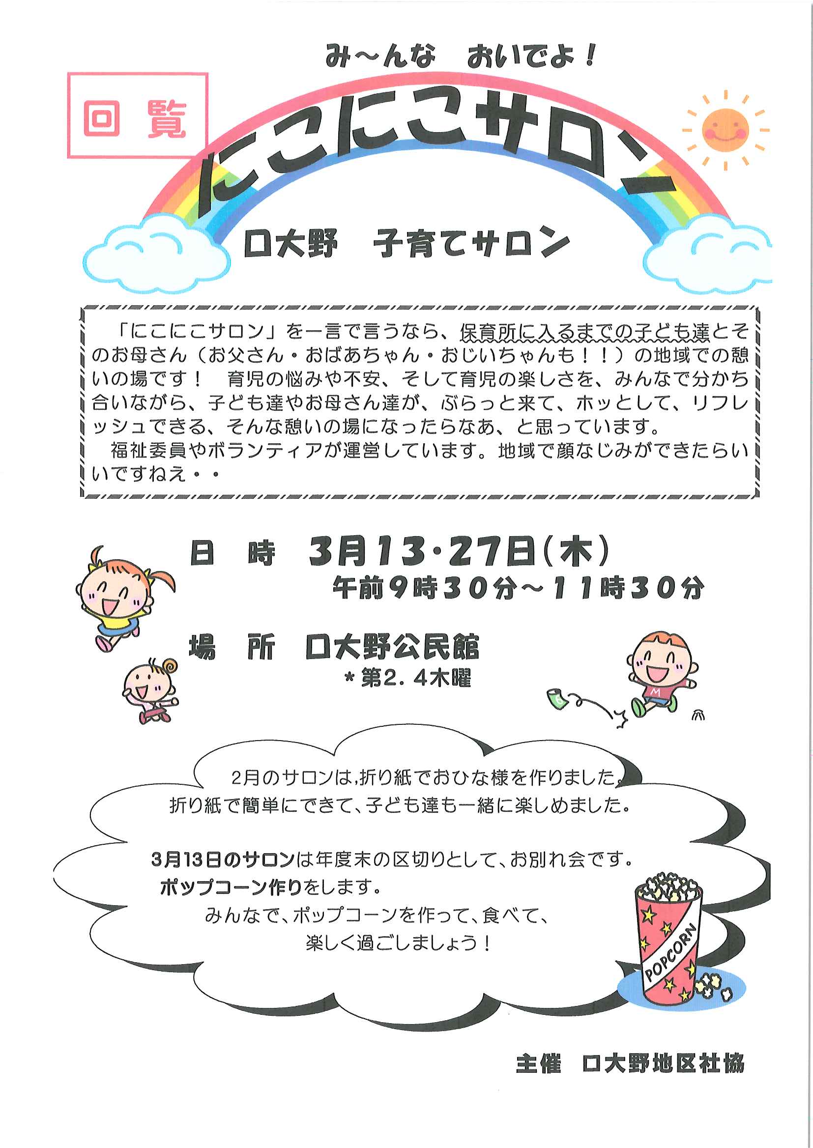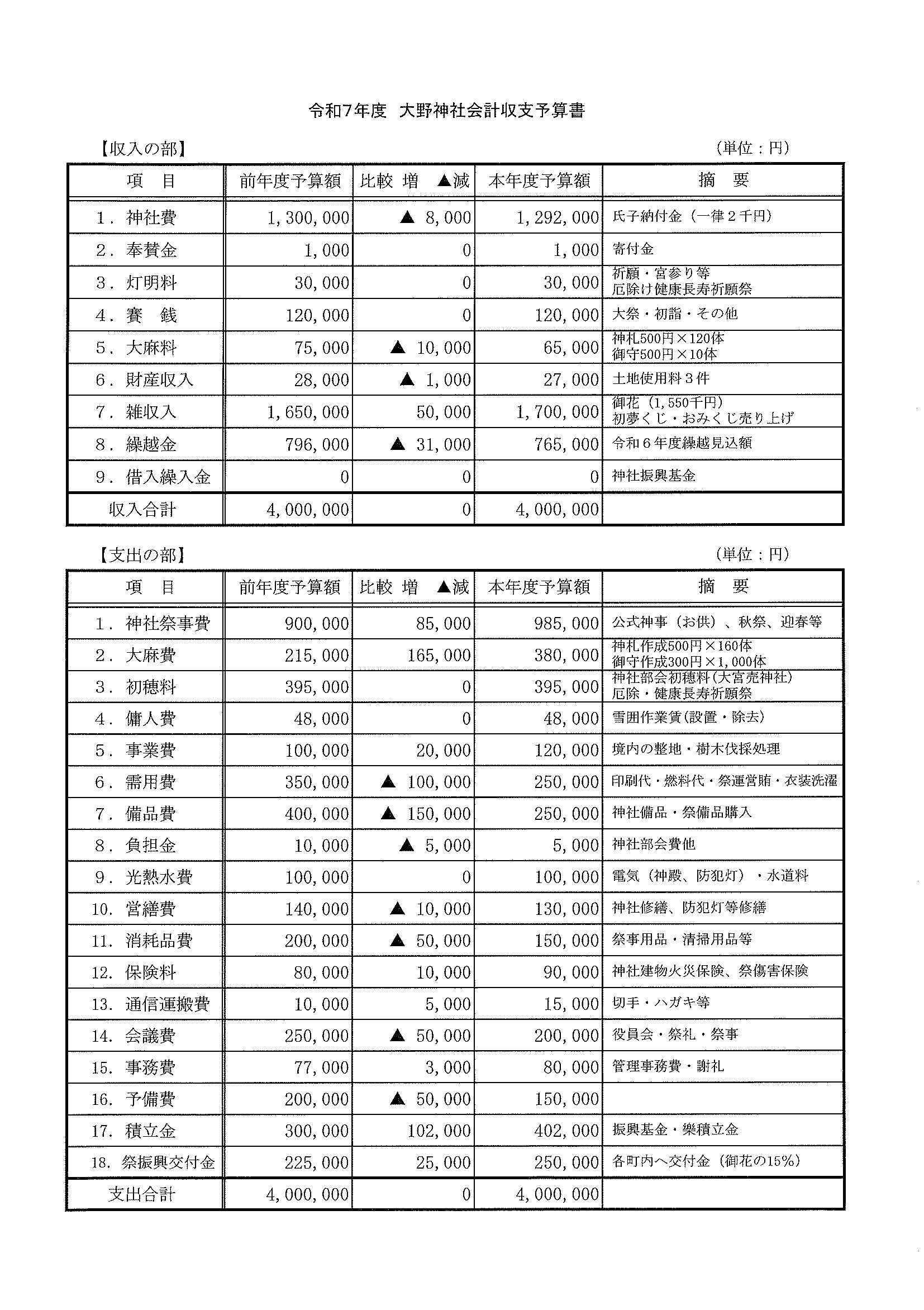 ・令和7年度区費納付についてのお知らせ ・大野神社令和7年度会計収支予算書の修正版 裏面 ・赤十字活動資金募集のお願い ・草刈りボランティア募集 ・口大野公民館歩こう会 ・5月にこにこサロン(子育てサロン) ・食生活改善推進員養成講座のお知らせ 裏面 ・下水道工事の予定表4/25- ・大宮市民局NEWSおおみやトピックス ・口大野図書館ハロウィンだより4月号 ・大野神社歳時記第25号 ・保幼小中一貫教育だより 裏面 ・大宮中学校だより 裏面 ・一小の子4/7 裏面 ・一小の子4/15 裏面