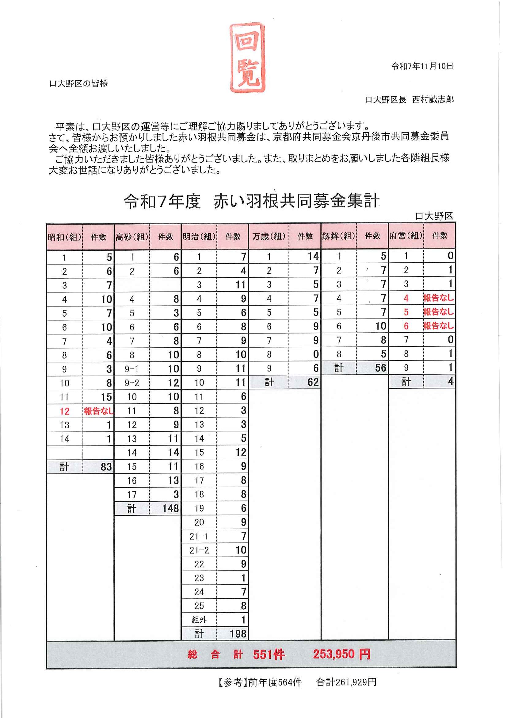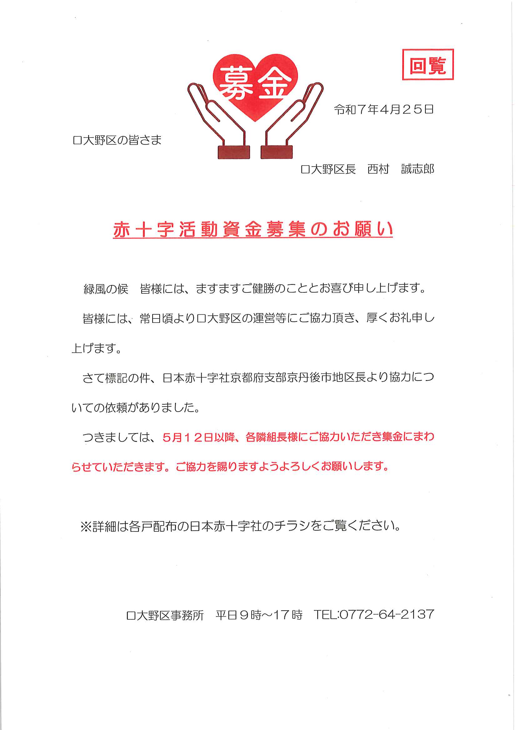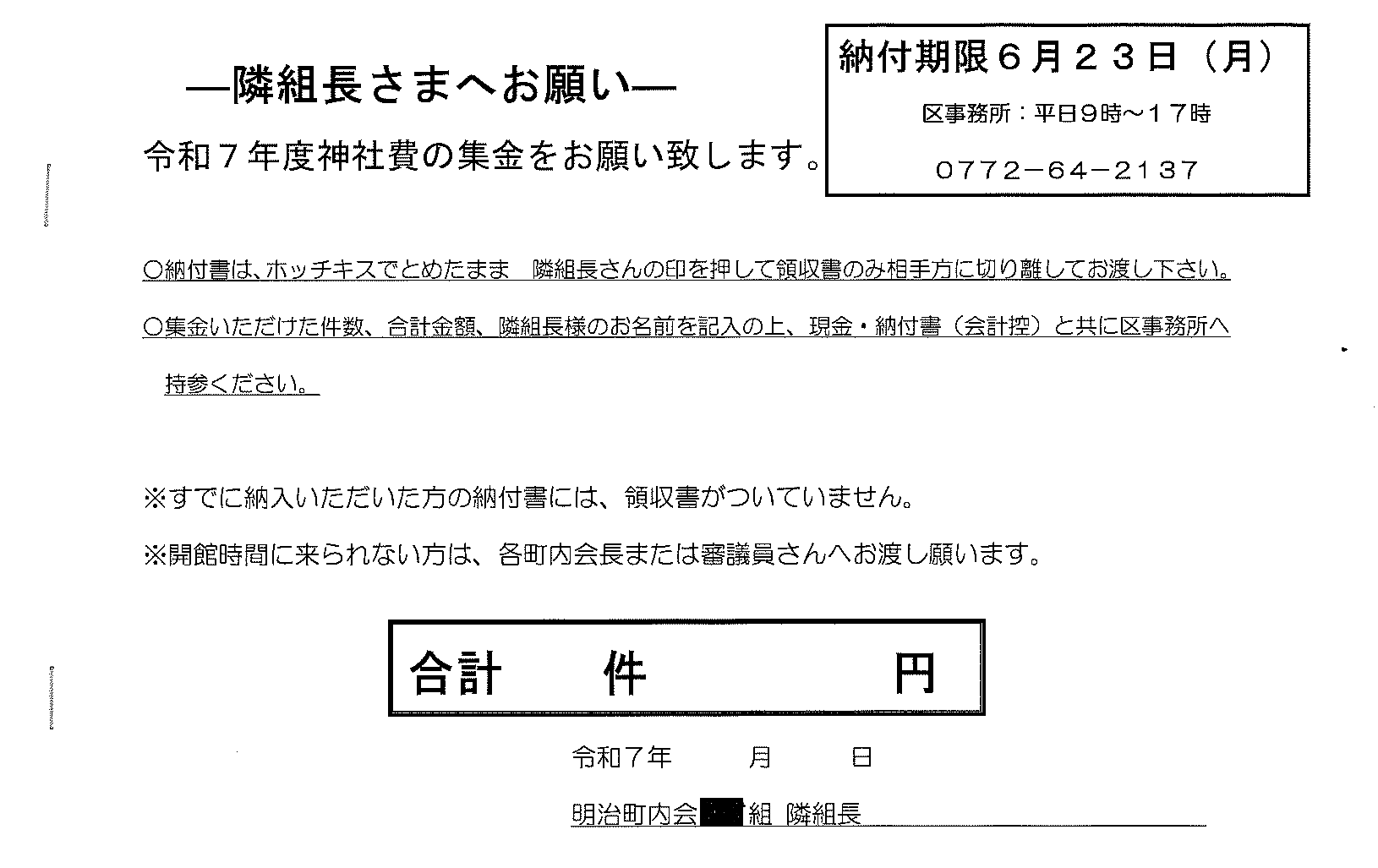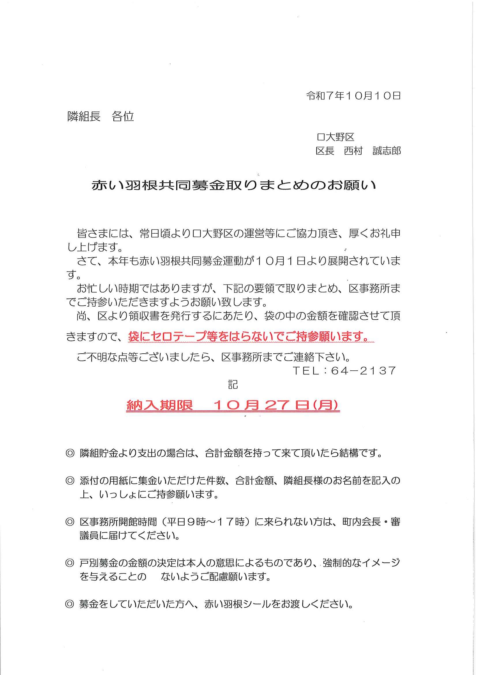 ・<隣組長様あて>・赤十字活動資金募集協力依頼 ・令和7年度区費納付のお知らせ