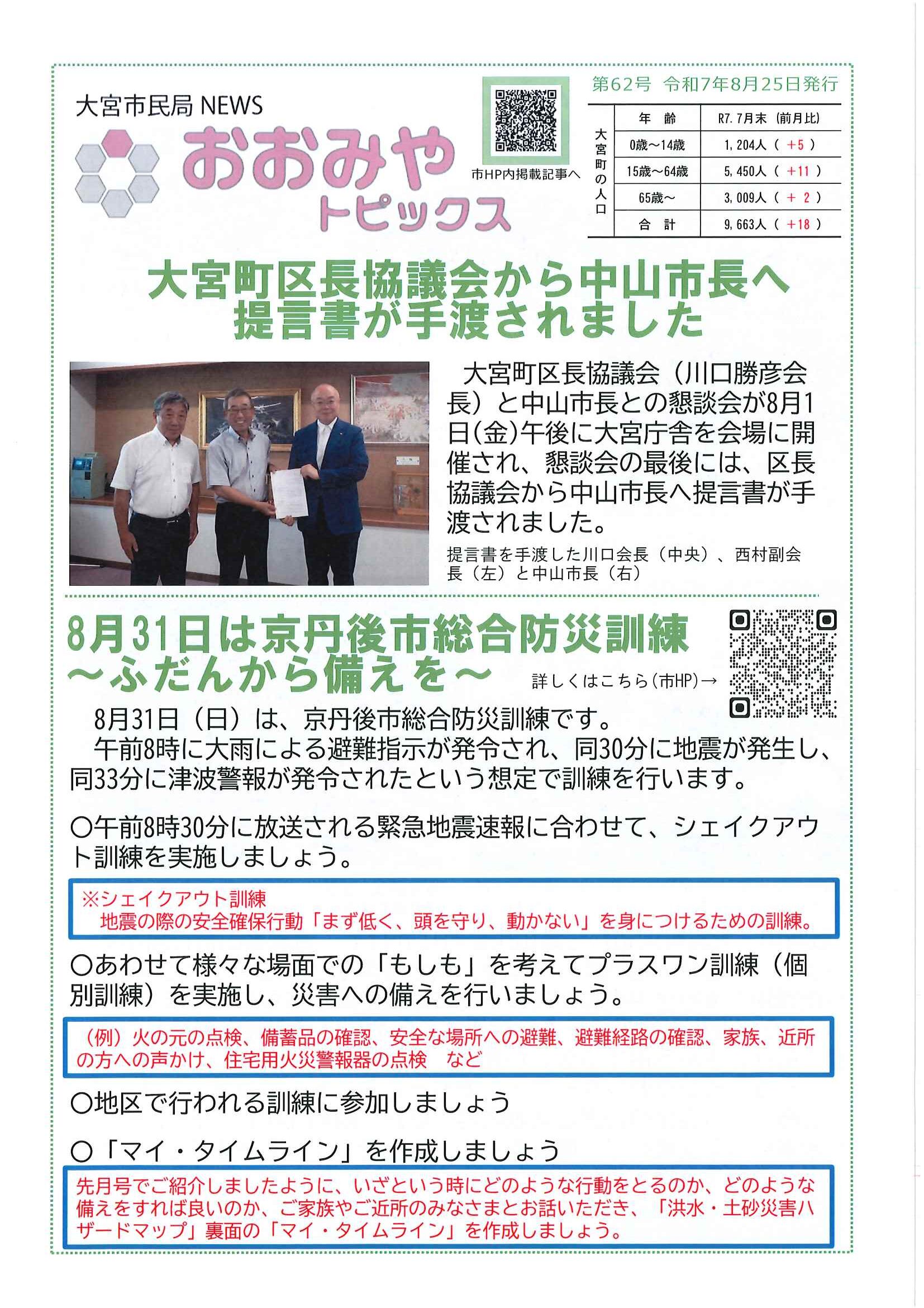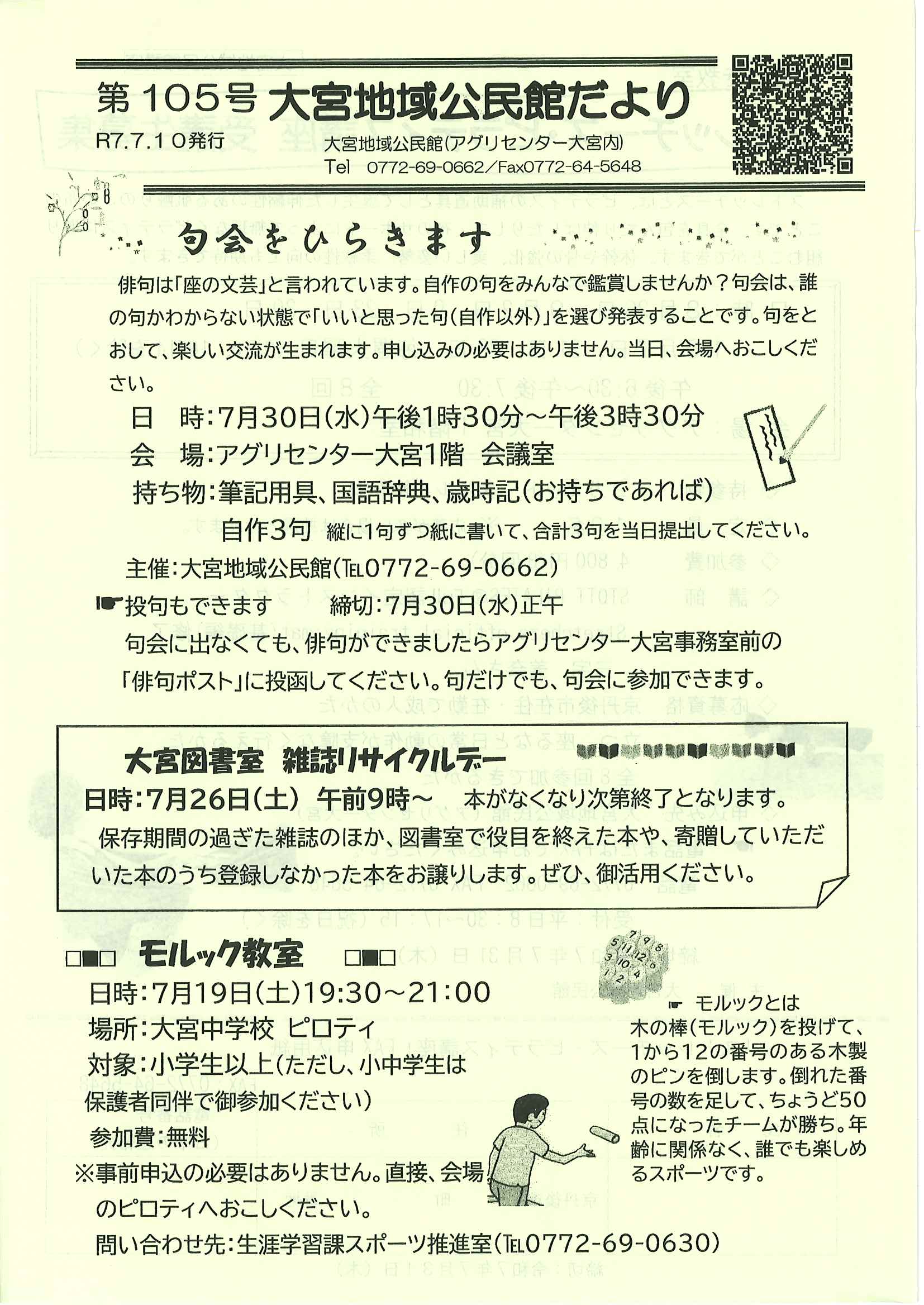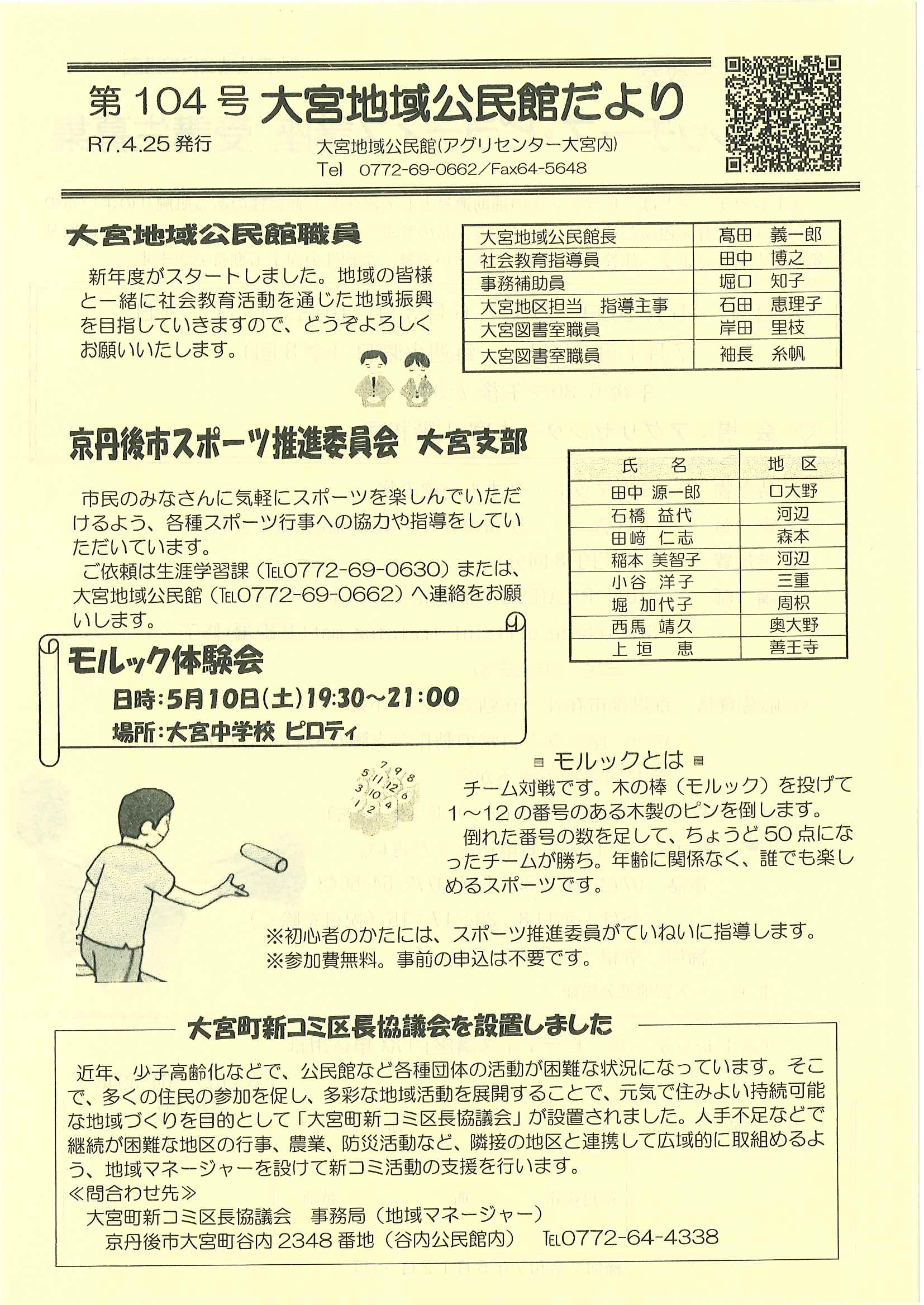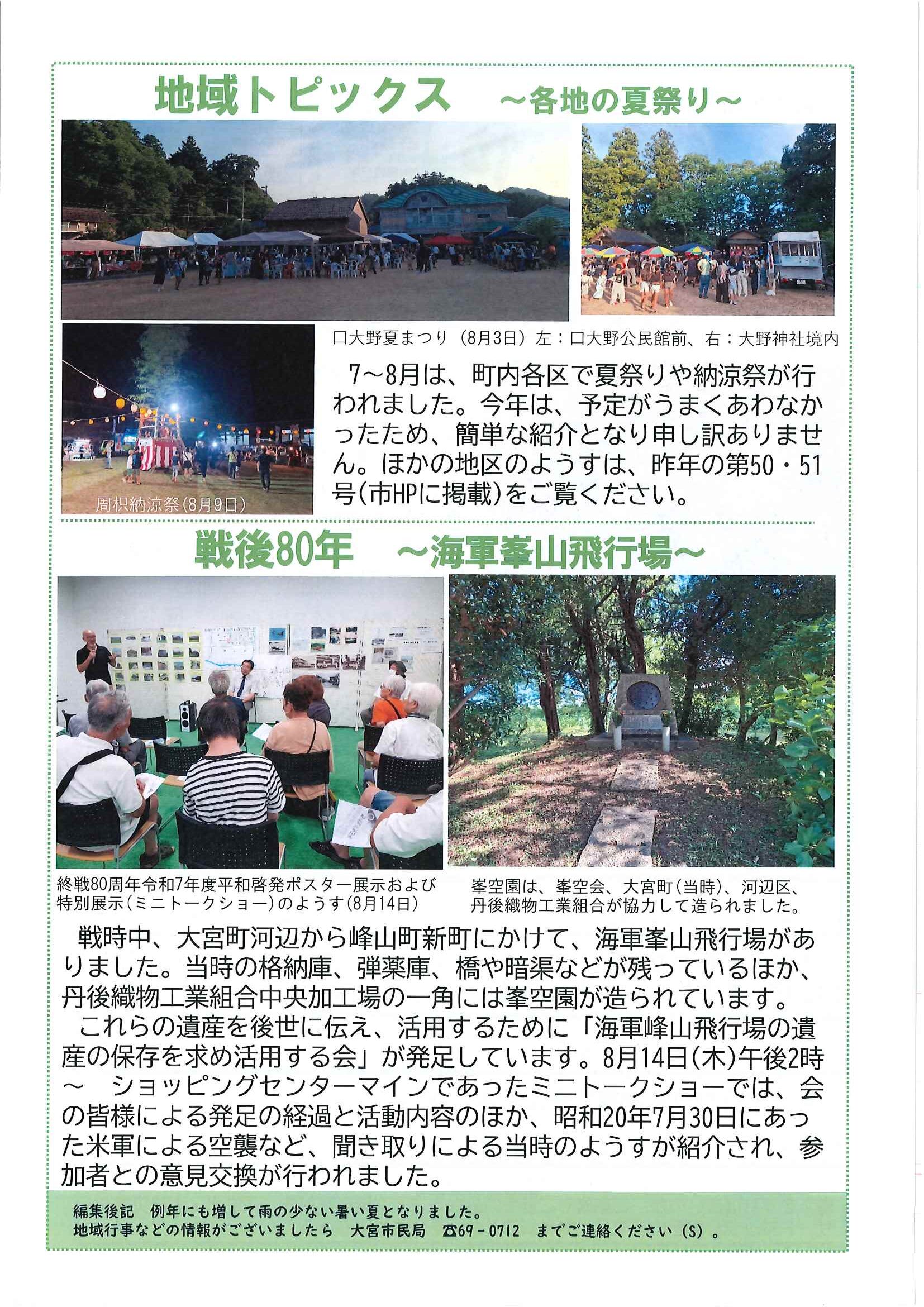 ・令和7年度神社費について ・川溝そうじ ・6月にこにこサロン ・大宮市民局NEWS 大宮トピックス 裏面 ・丹後を語る番組地域おこしラジオ放送中 ・峯山海軍航空隊歴史探訪ノルディックウオーキング参加者募集 ・下水道工事予定表5/25- ・保幼小中一貫教育だより 裏面
