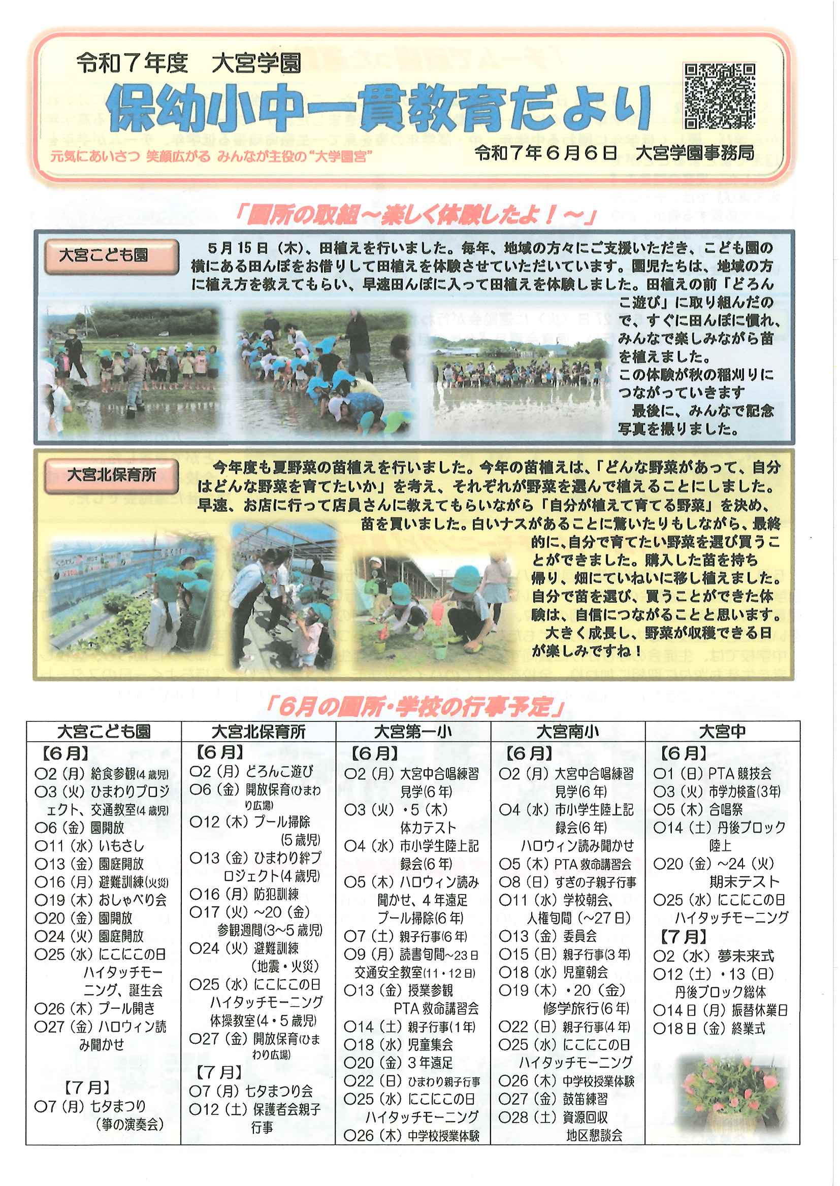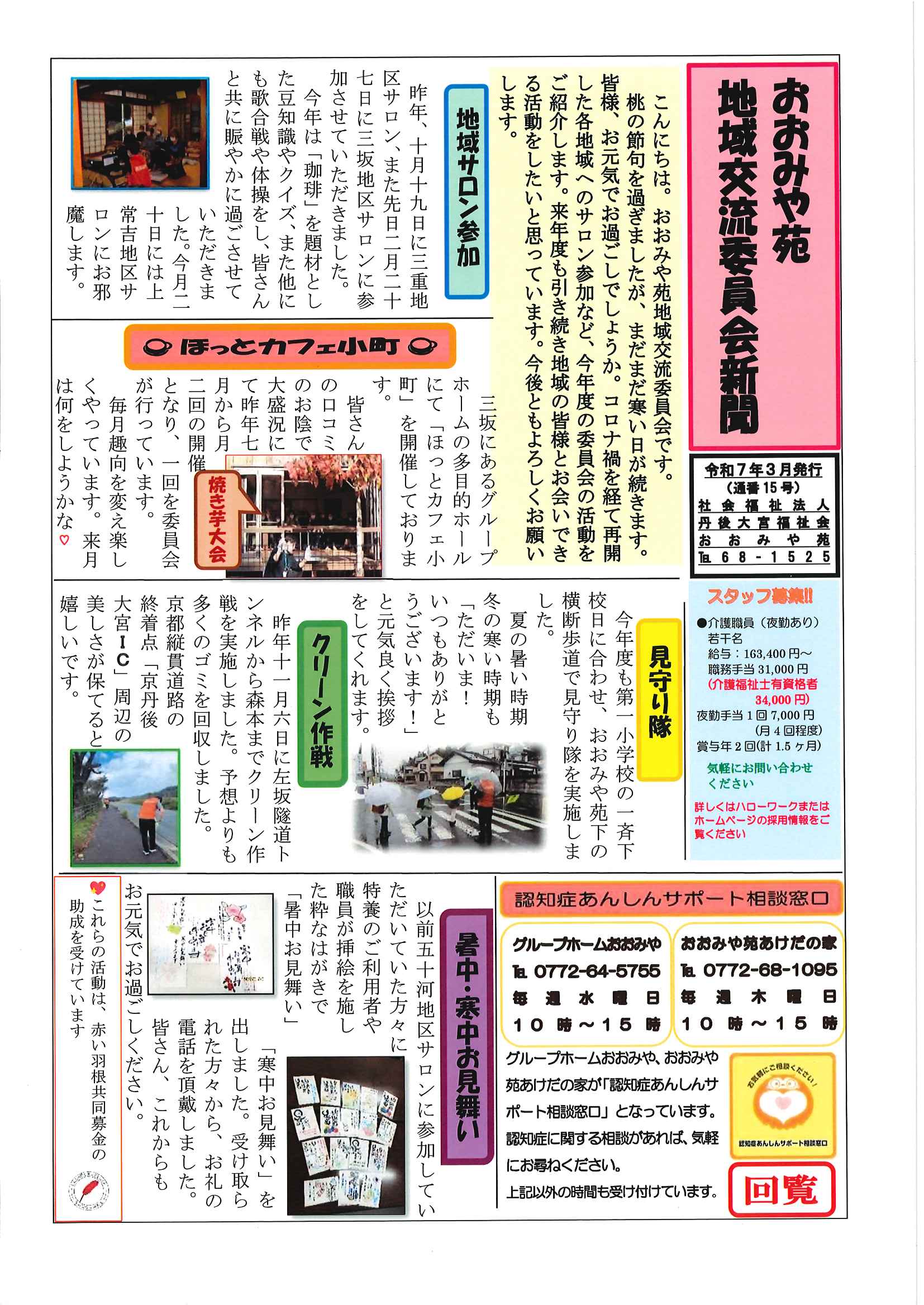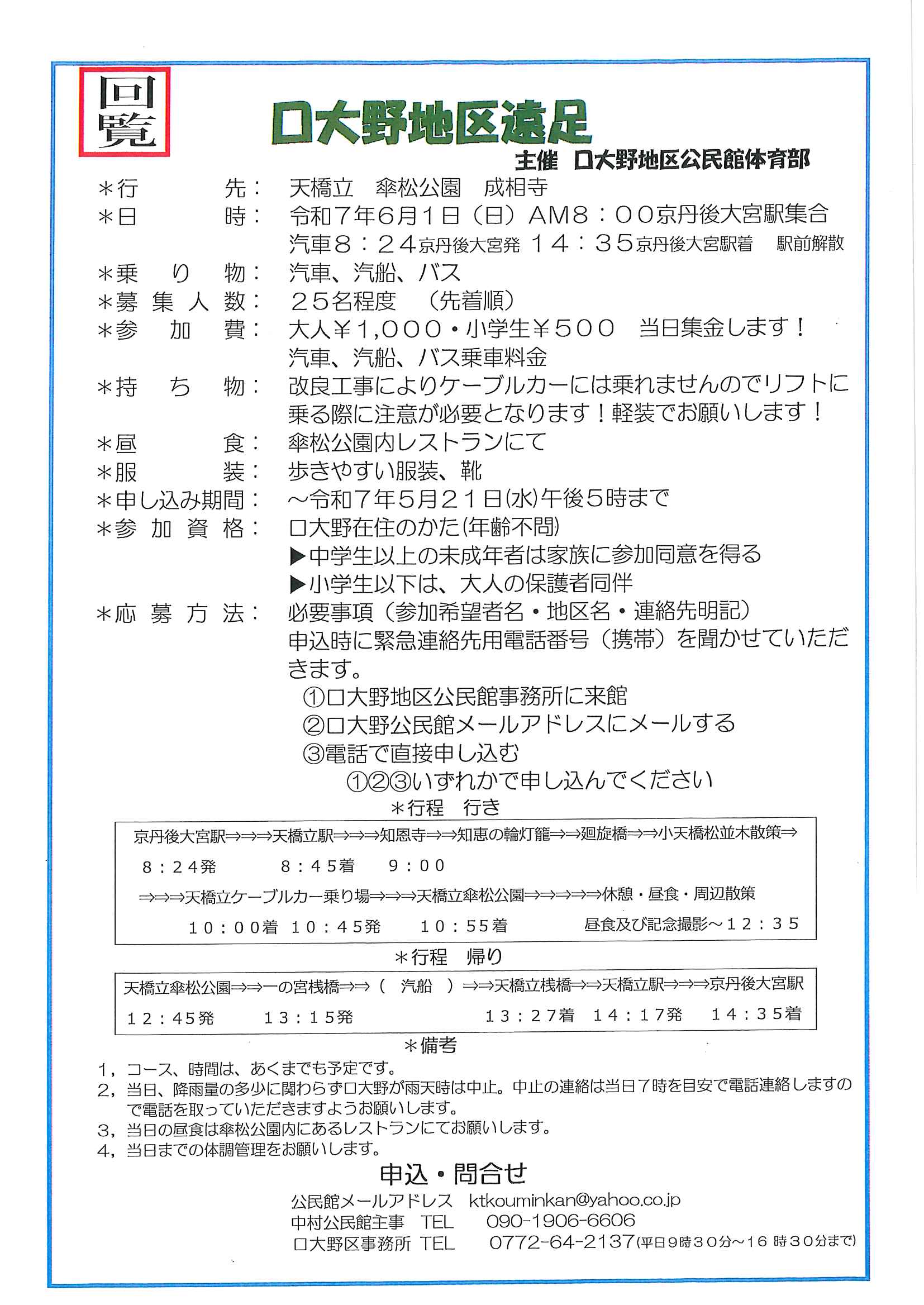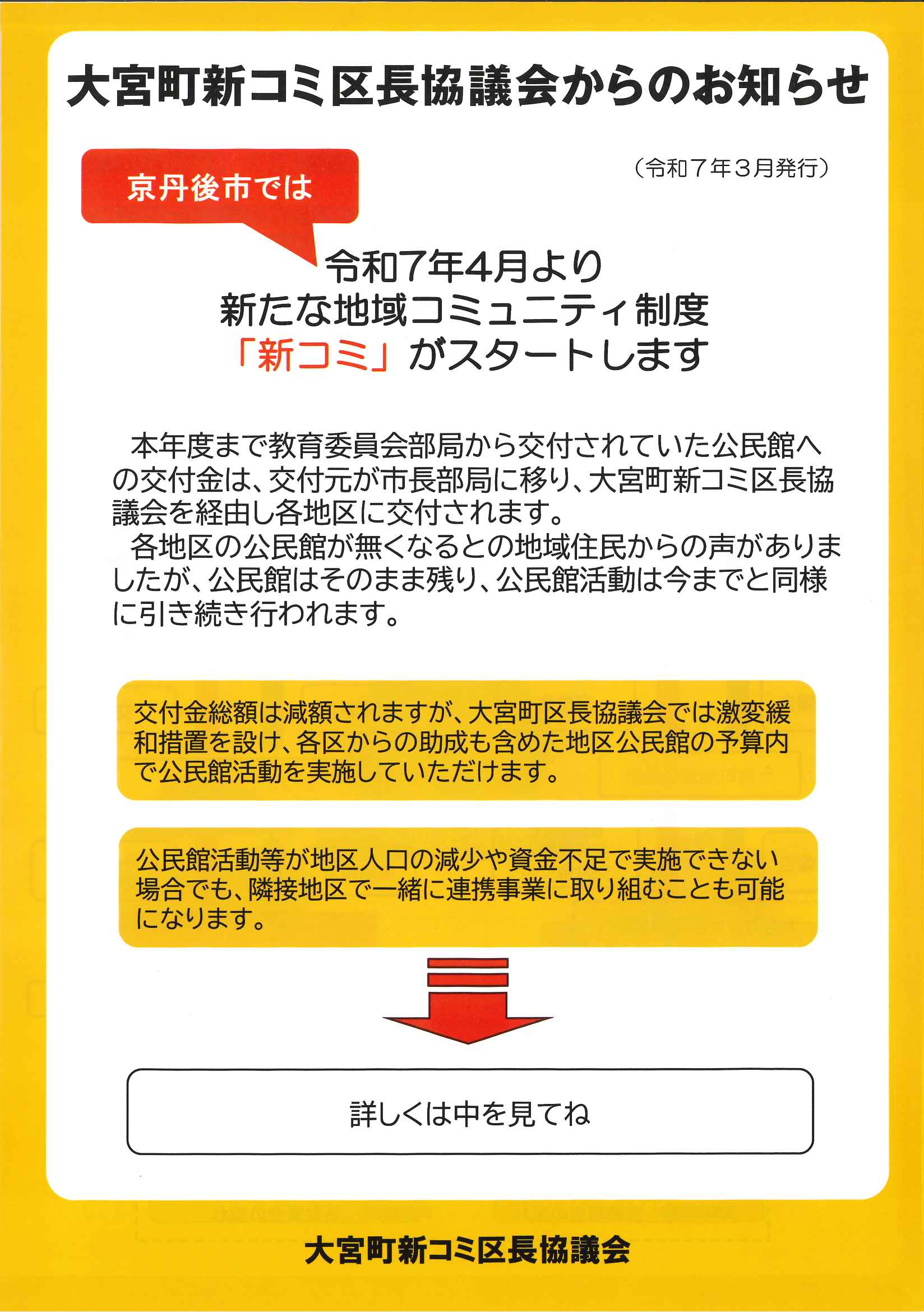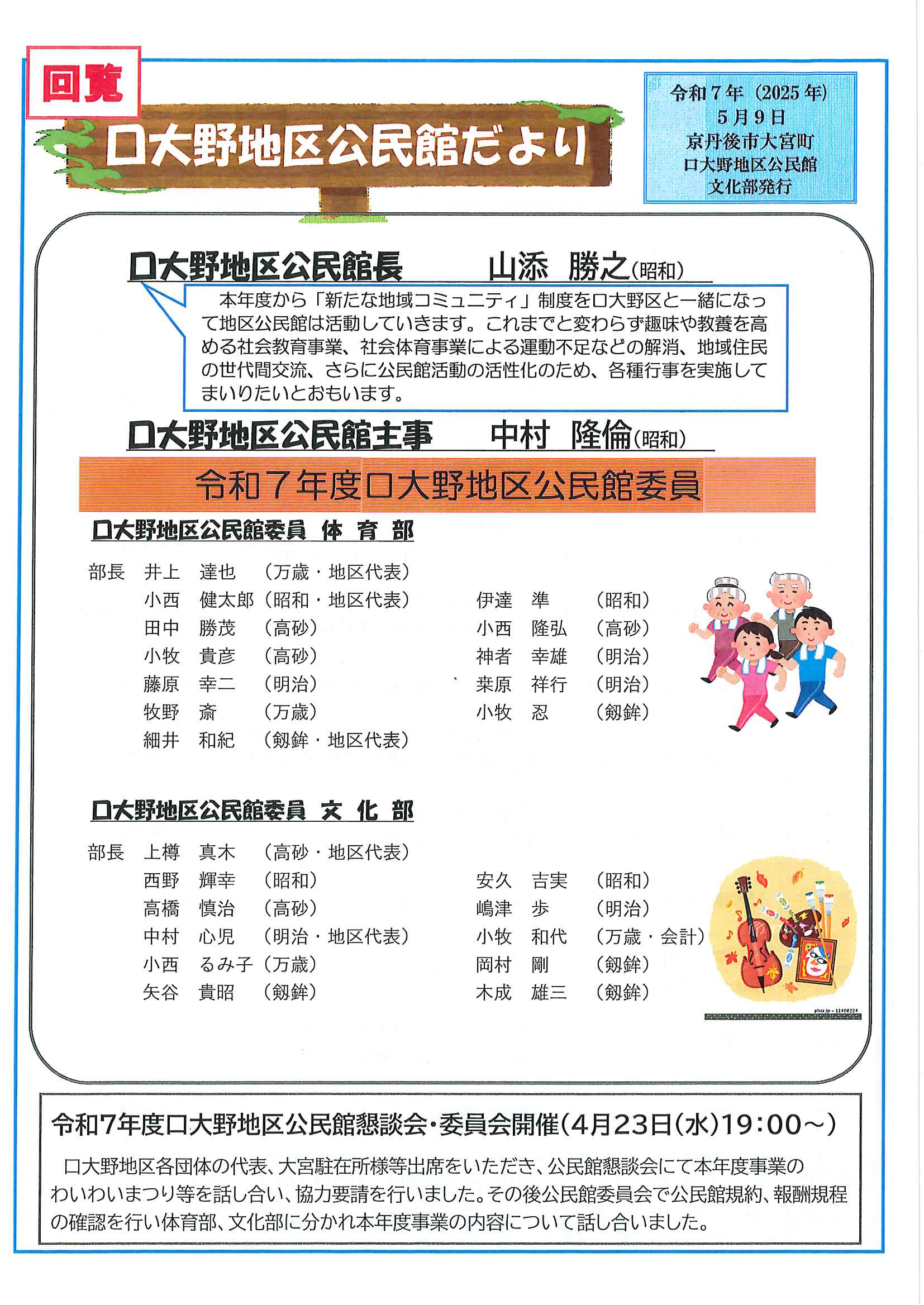 ・令和7年度神社費について ・川溝そうじ ・6月にこにこサロン ・大宮市民局NEWS 大宮トピックス 裏面 ・丹後を語る番組地域おこしラジオ放送中 ・峯山海軍航空隊歴史探訪ノルディックウオーキング参加者募集 ・下水道工事予定表5/25- ・保幼小中一貫教育だより 裏面