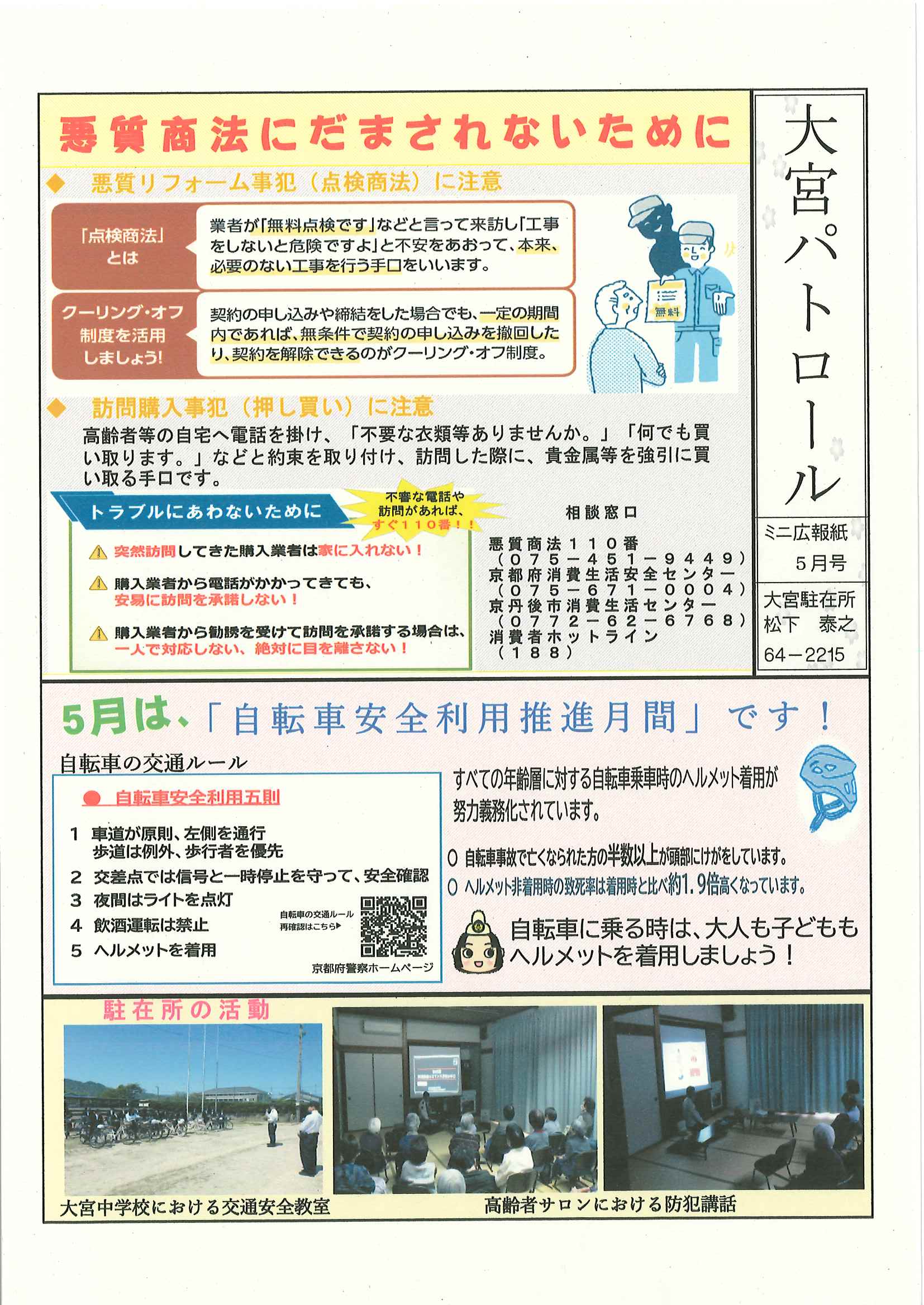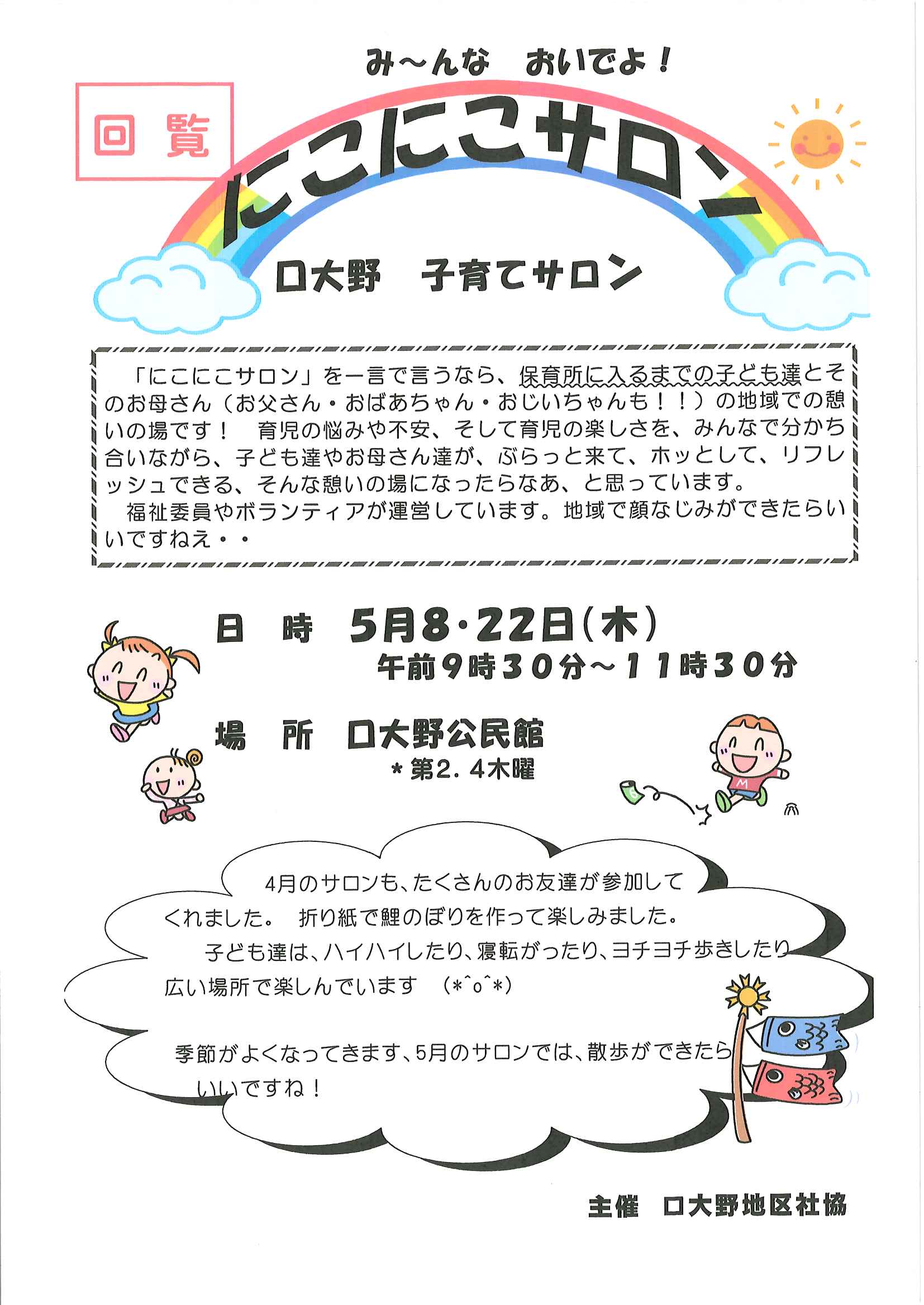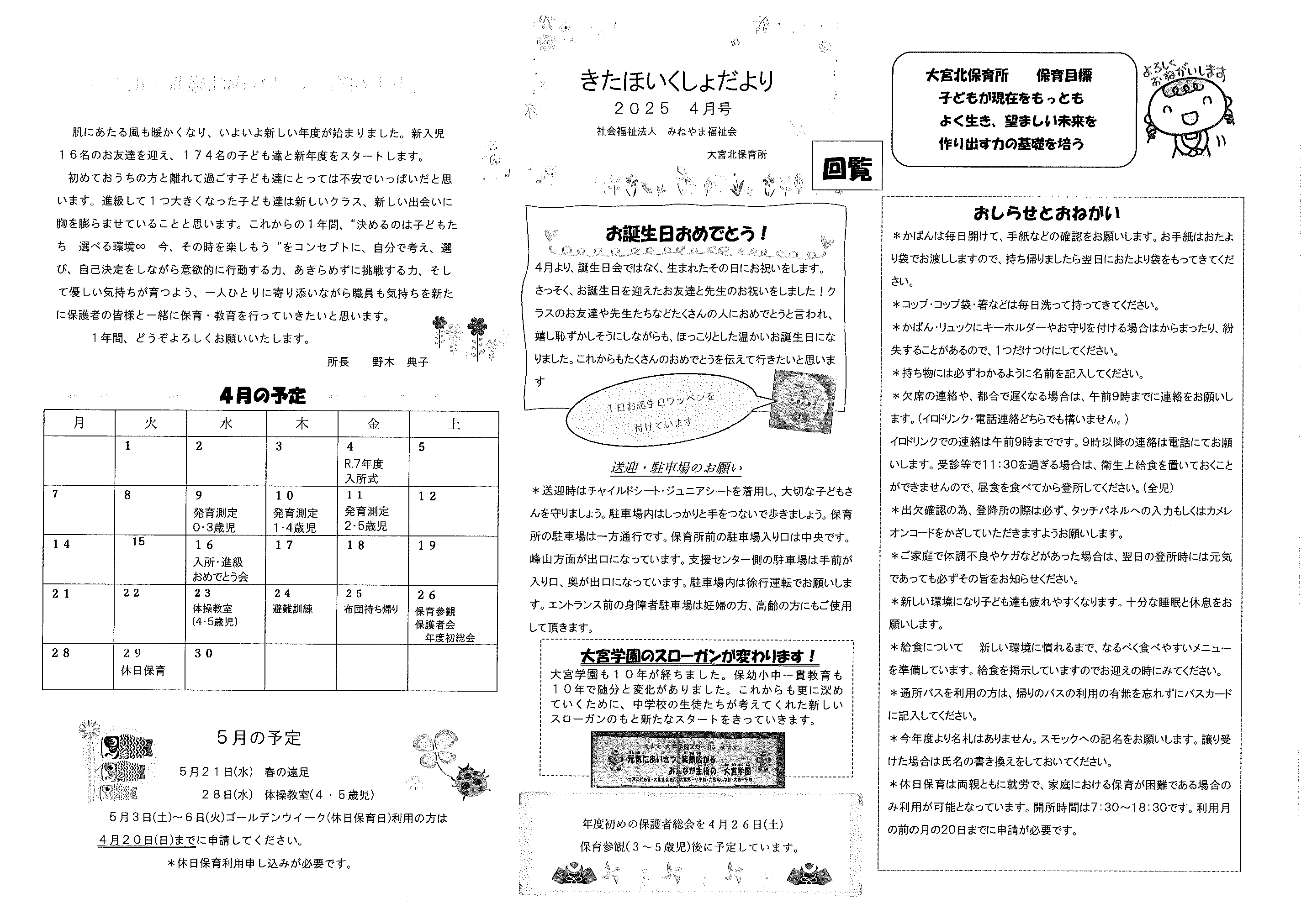 ・口大野地区遠足の案内 ・5月ふれあいサロン ・大宮駐在所ミニ広報誌大宮パトロール ・ノルディック・ウオーキングで歩こう会、モルック教室を開催します ・口大野地区公民館だより 裏面 ・大宮中学校だより第2号 裏面 ・一小の子5月1日号 裏面 ・きたほいくしょだより5月号