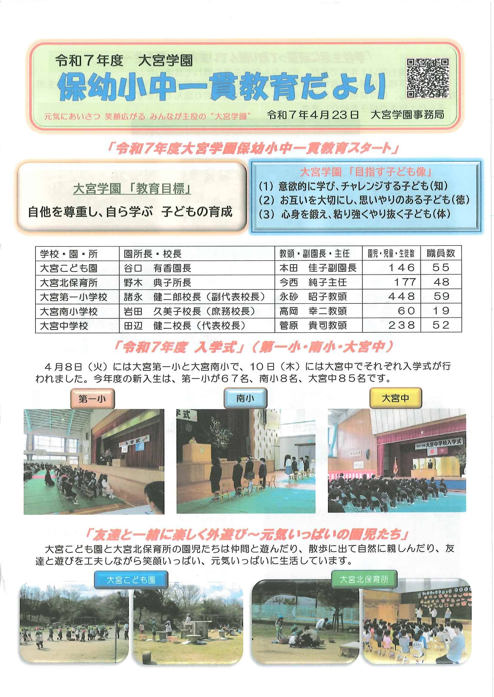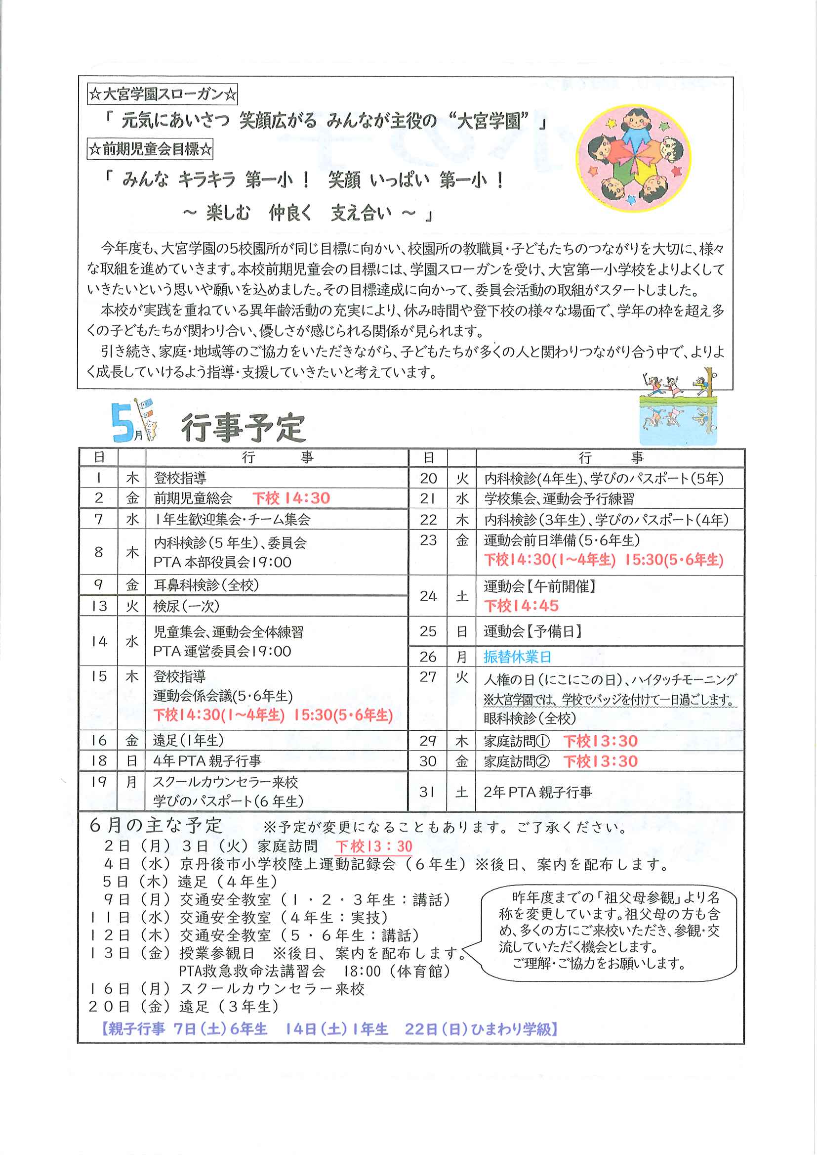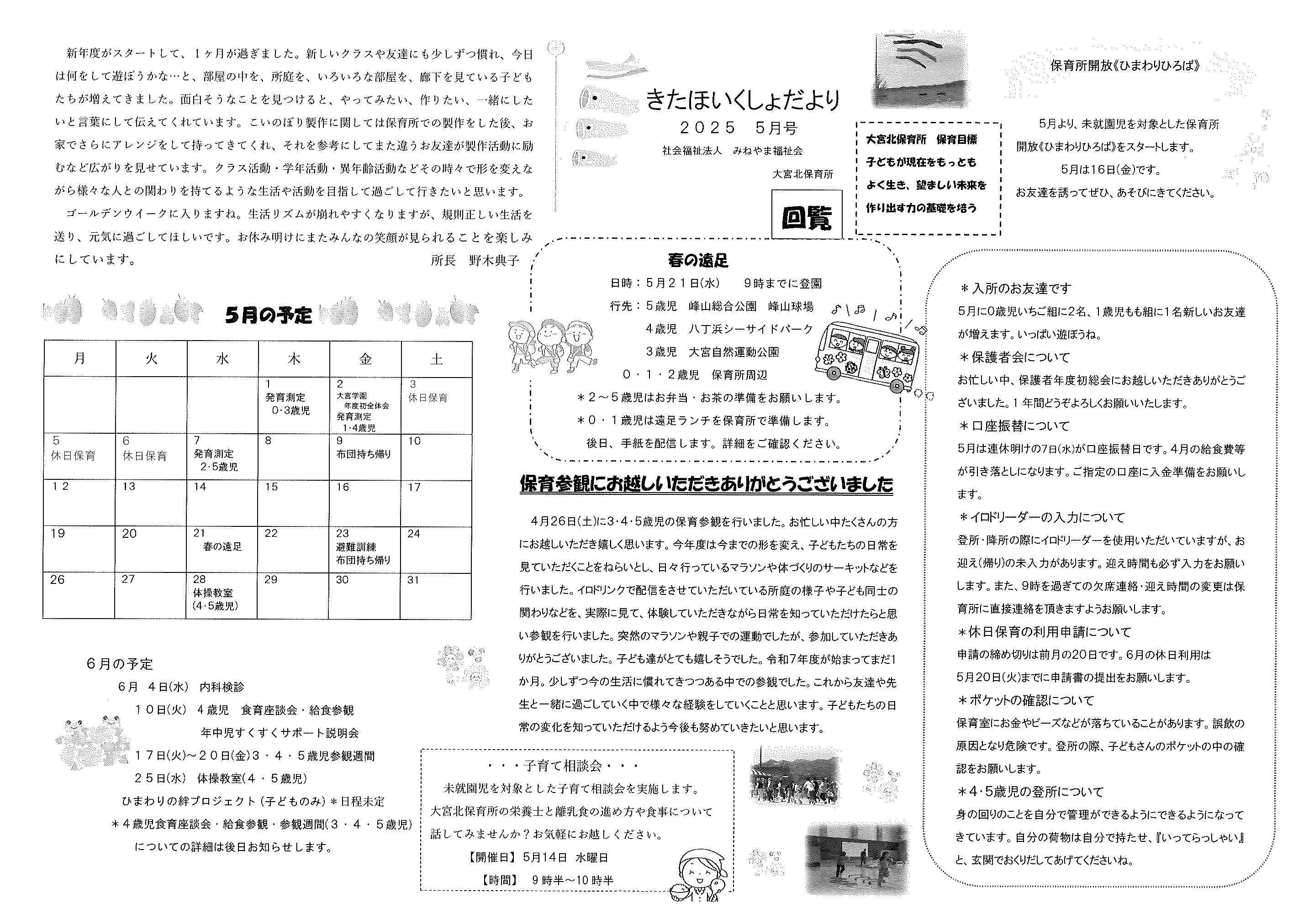 ・口大野地区遠足の案内 ・5月ふれあいサロン ・大宮駐在所ミニ広報誌大宮パトロール ・ノルディック・ウオーキングで歩こう会、モルック教室を開催します ・口大野地区公民館だより 裏面 ・大宮中学校だより第2号 裏面 ・一小の子5月1日号 裏面 ・きたほいくしょだより5月号
