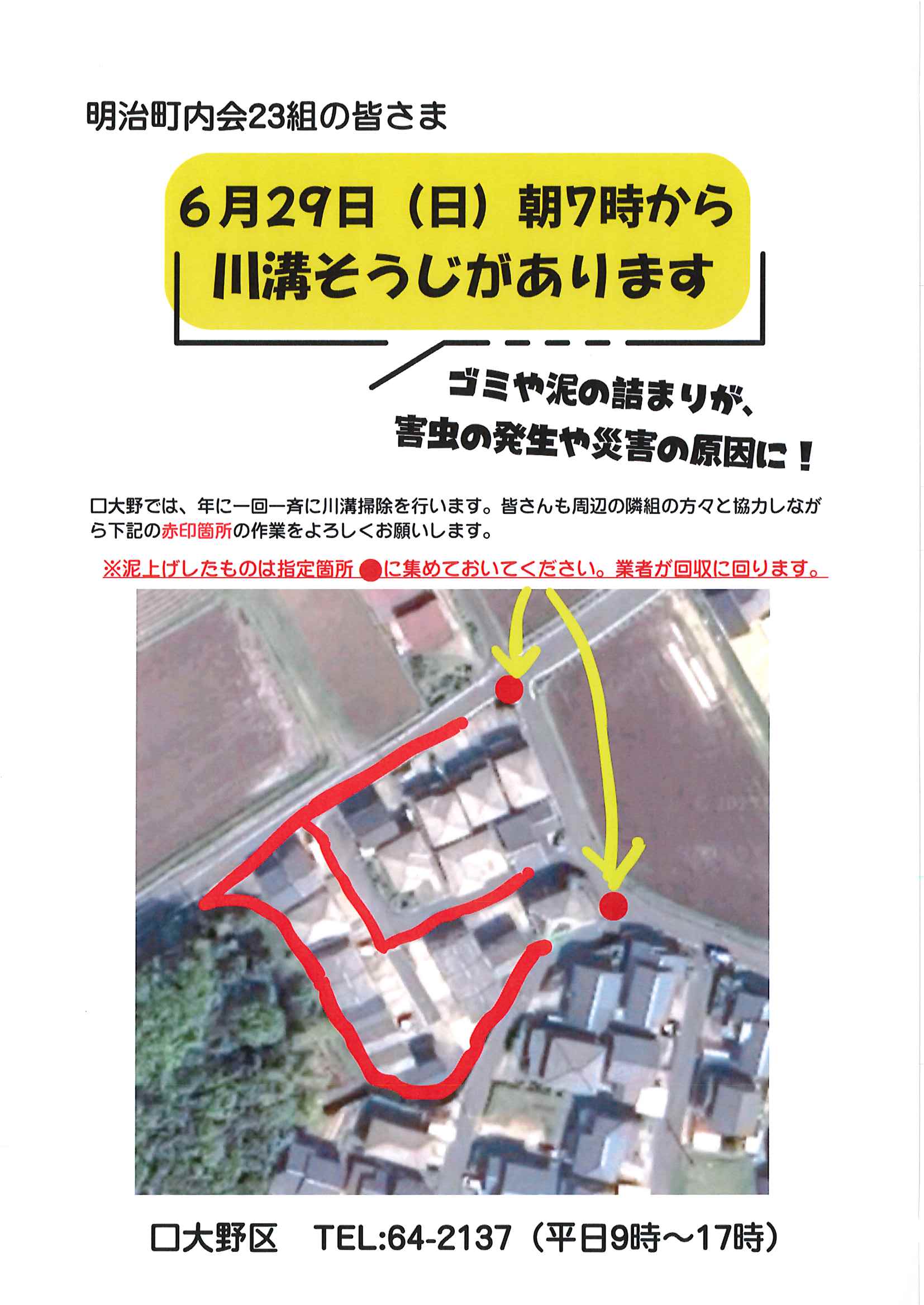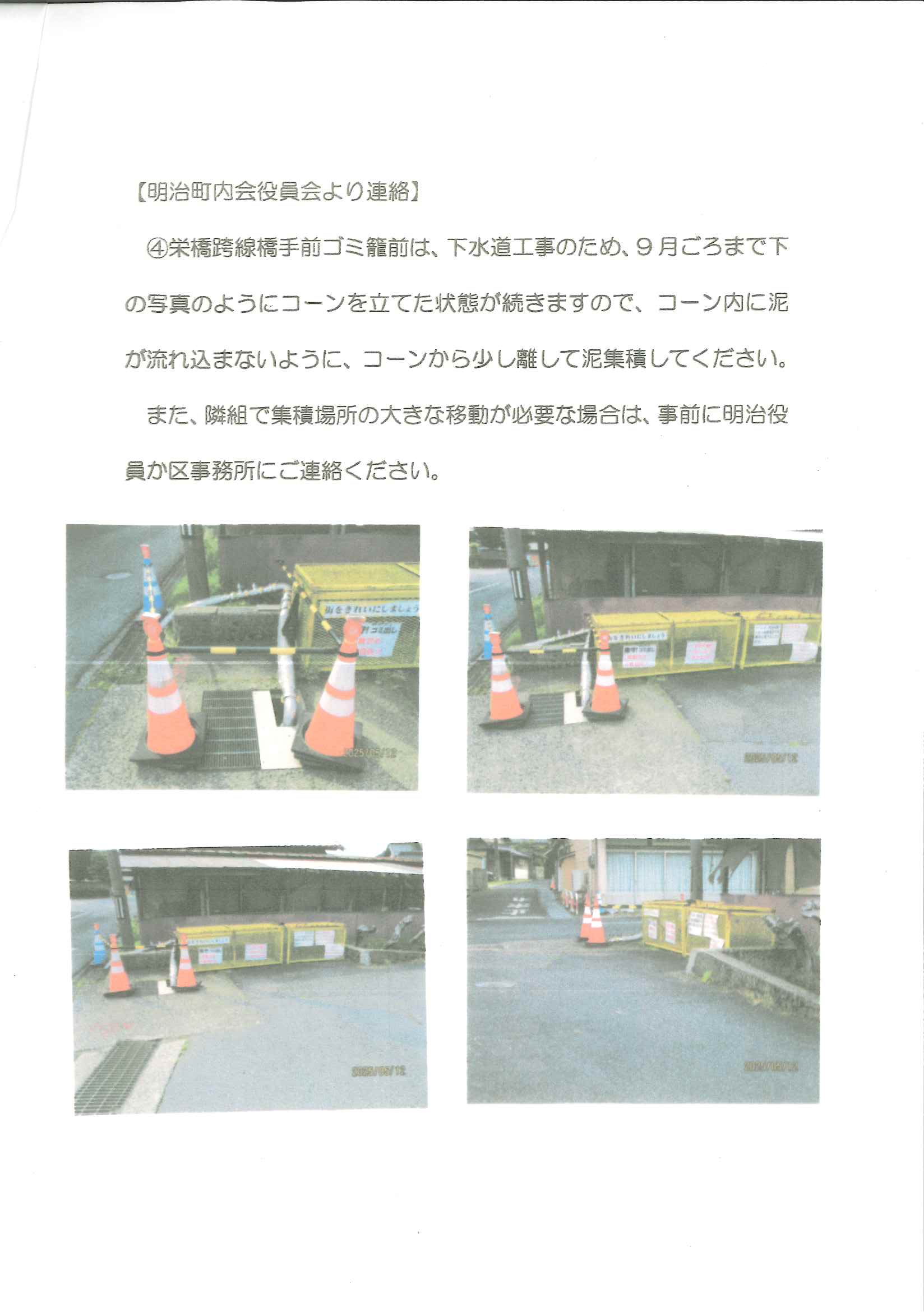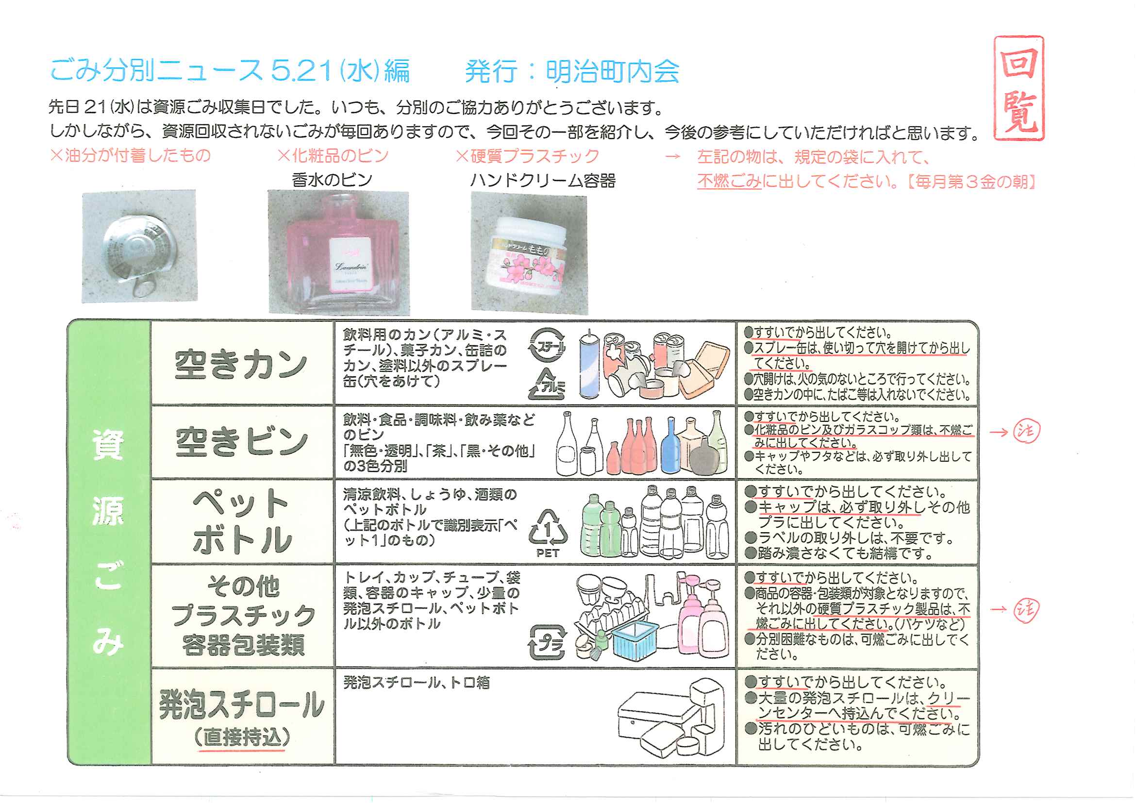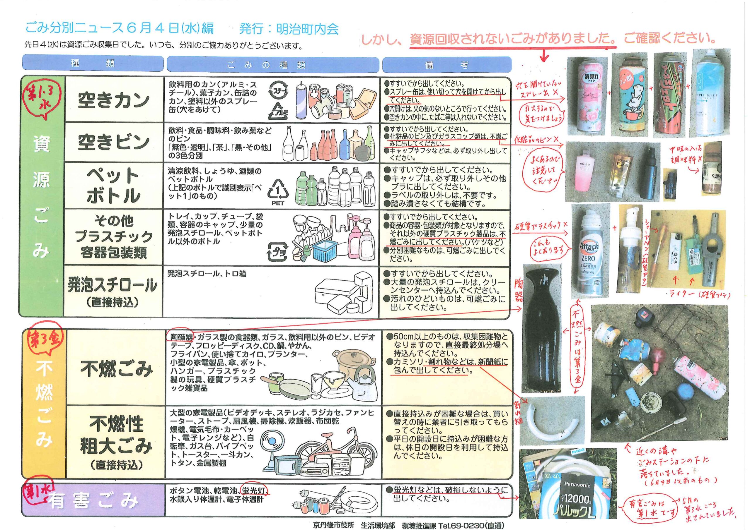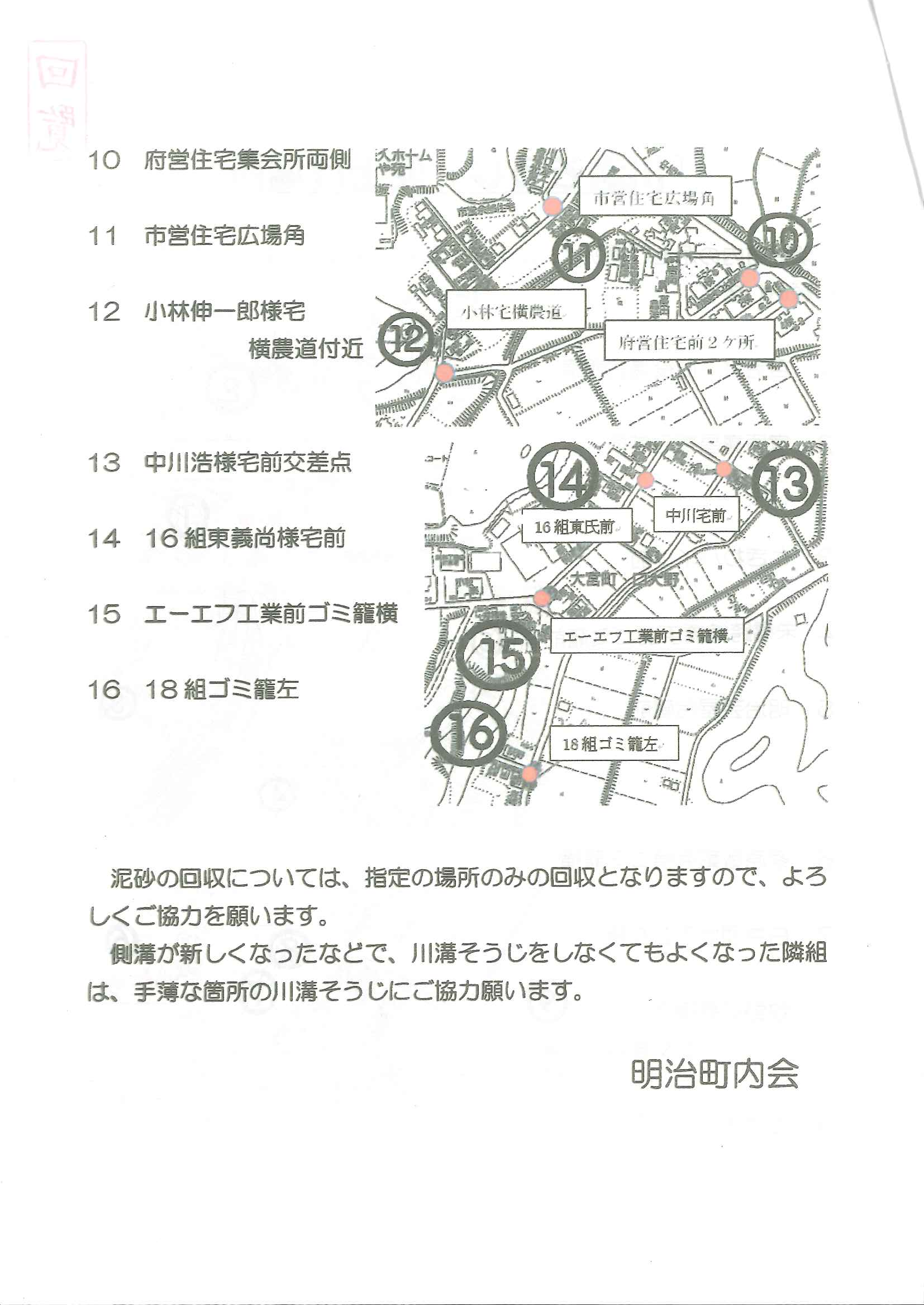 ・<明治町内会>➀ゴミ分別ニュース ・23組のみなさまへ ➁川溝そうじ泥上げ場所 2面 3面