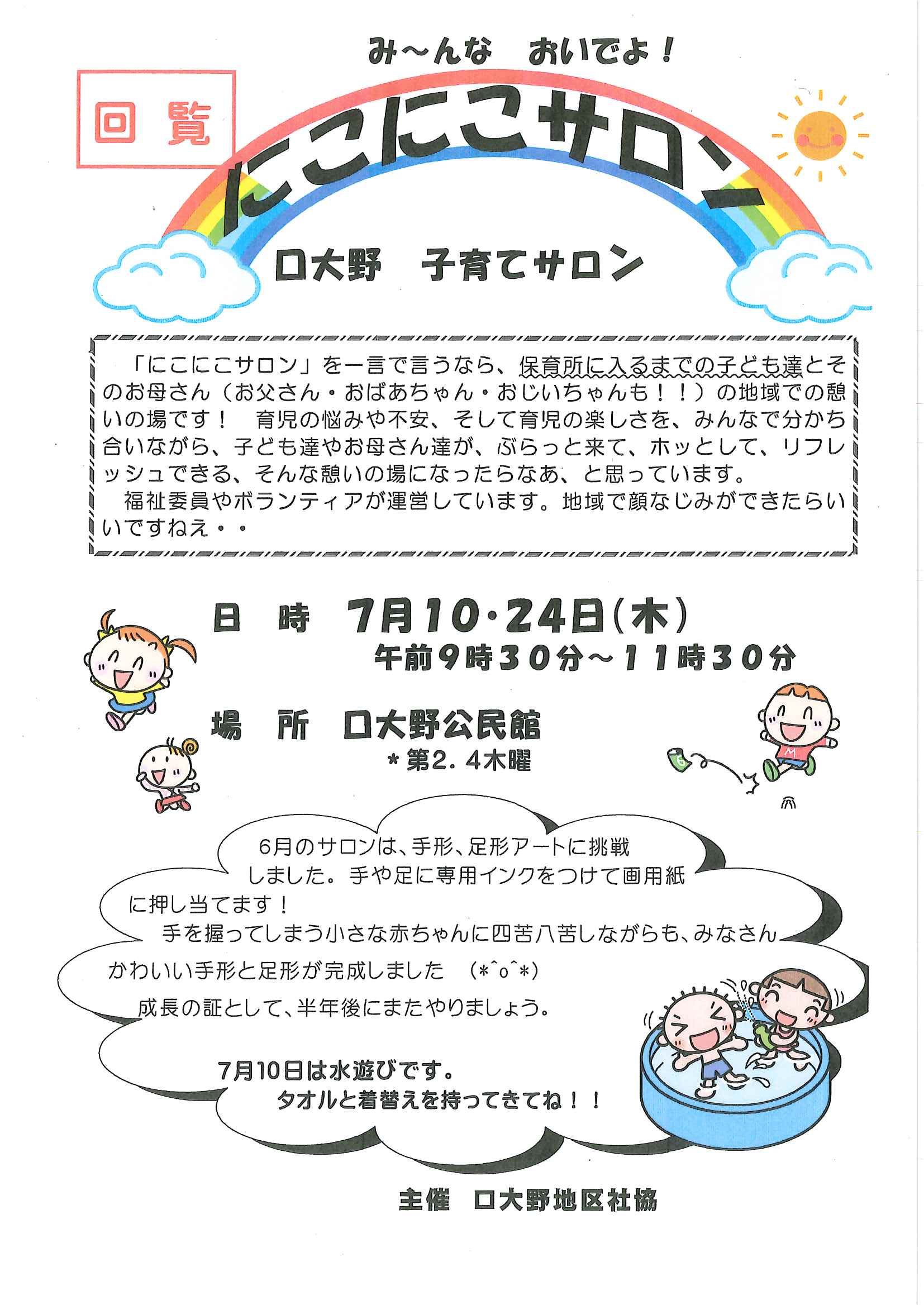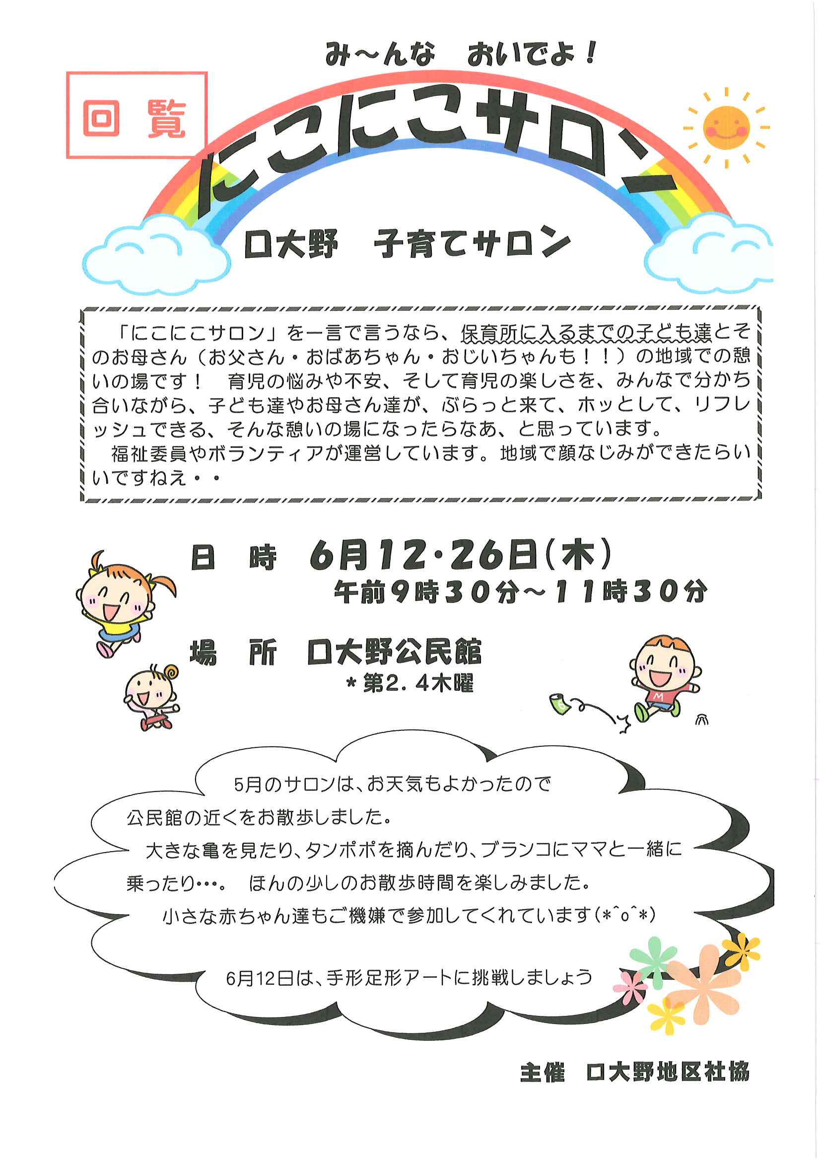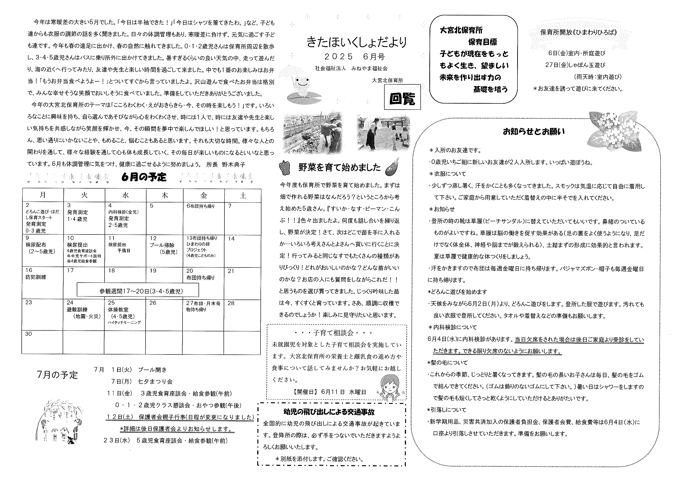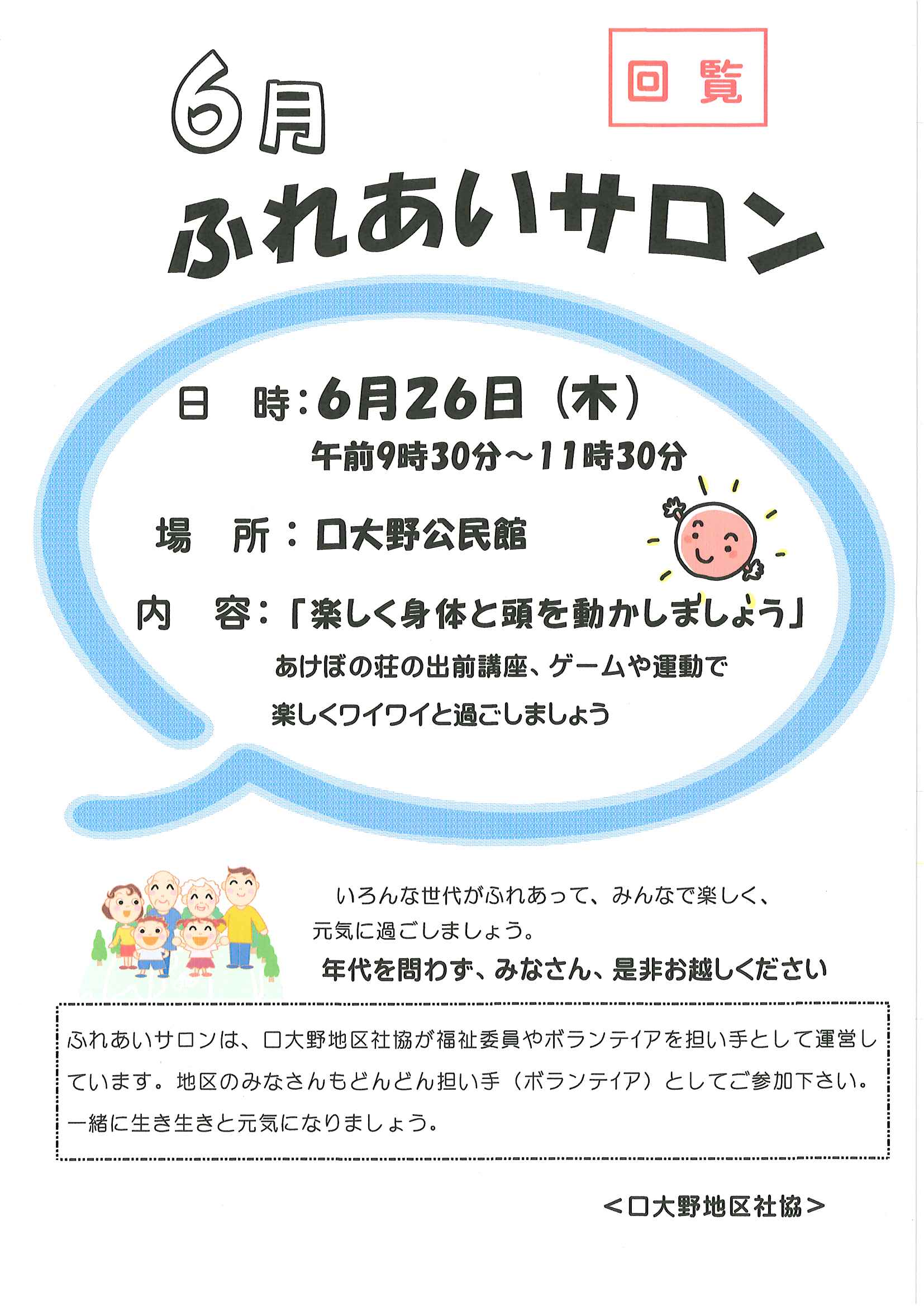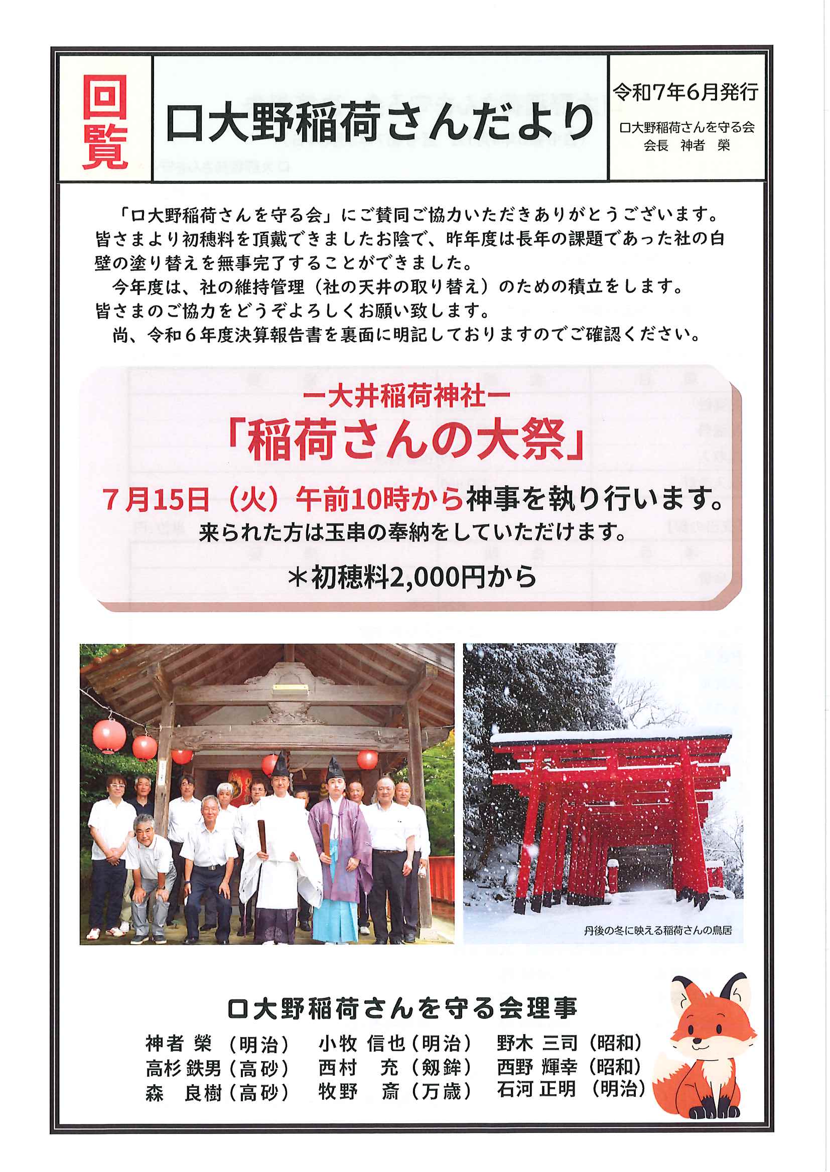 ・口大野夏まつり ・6月ふれあいサロン ・口大野稲荷さんだより 「稲荷さんの大祭」奉納 裏面 ・令和7年度赤十字活動資金の募金集計 ・優しさと行動で暮らしやすい口大野に ・大宮駐在所ミニ広報紙大宮パトロール ・シニア向け求人情報大募集 裏面 ・保幼小中一貫教育だより6/6 裏面 ・大中だより第3号 裏面 ・一小の子6/2 裏面 ・きたほいくしょだより6月号