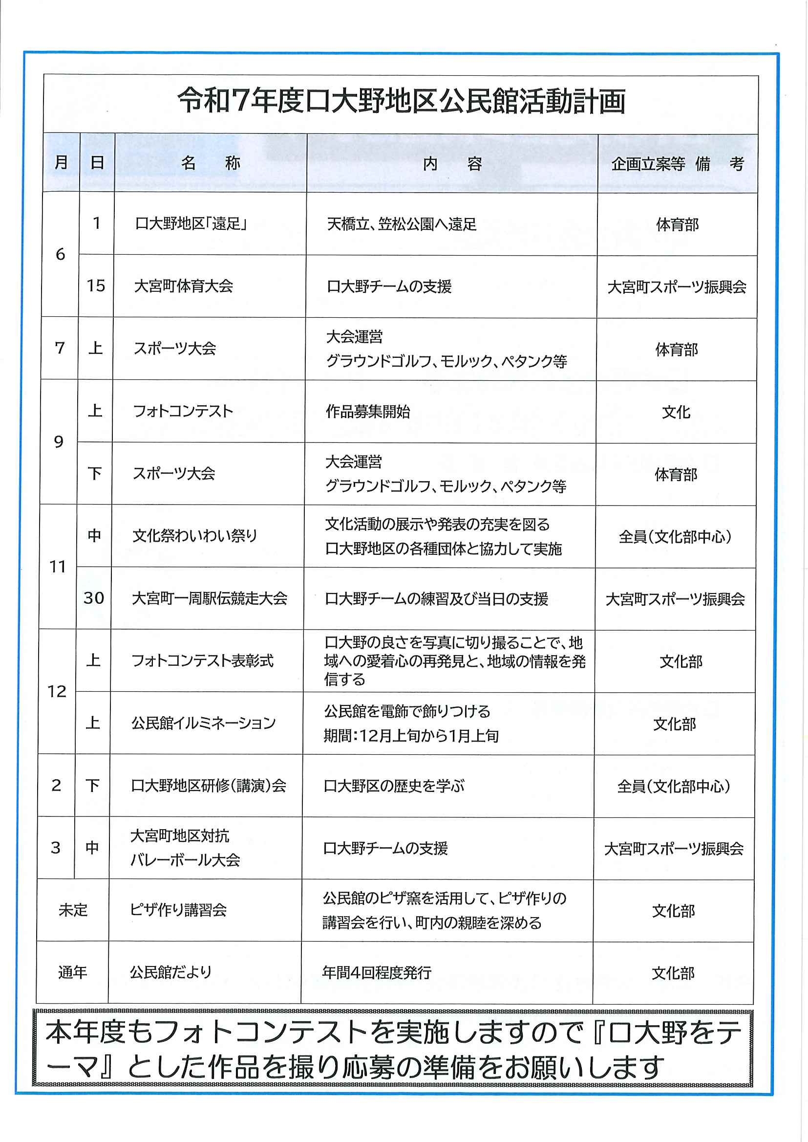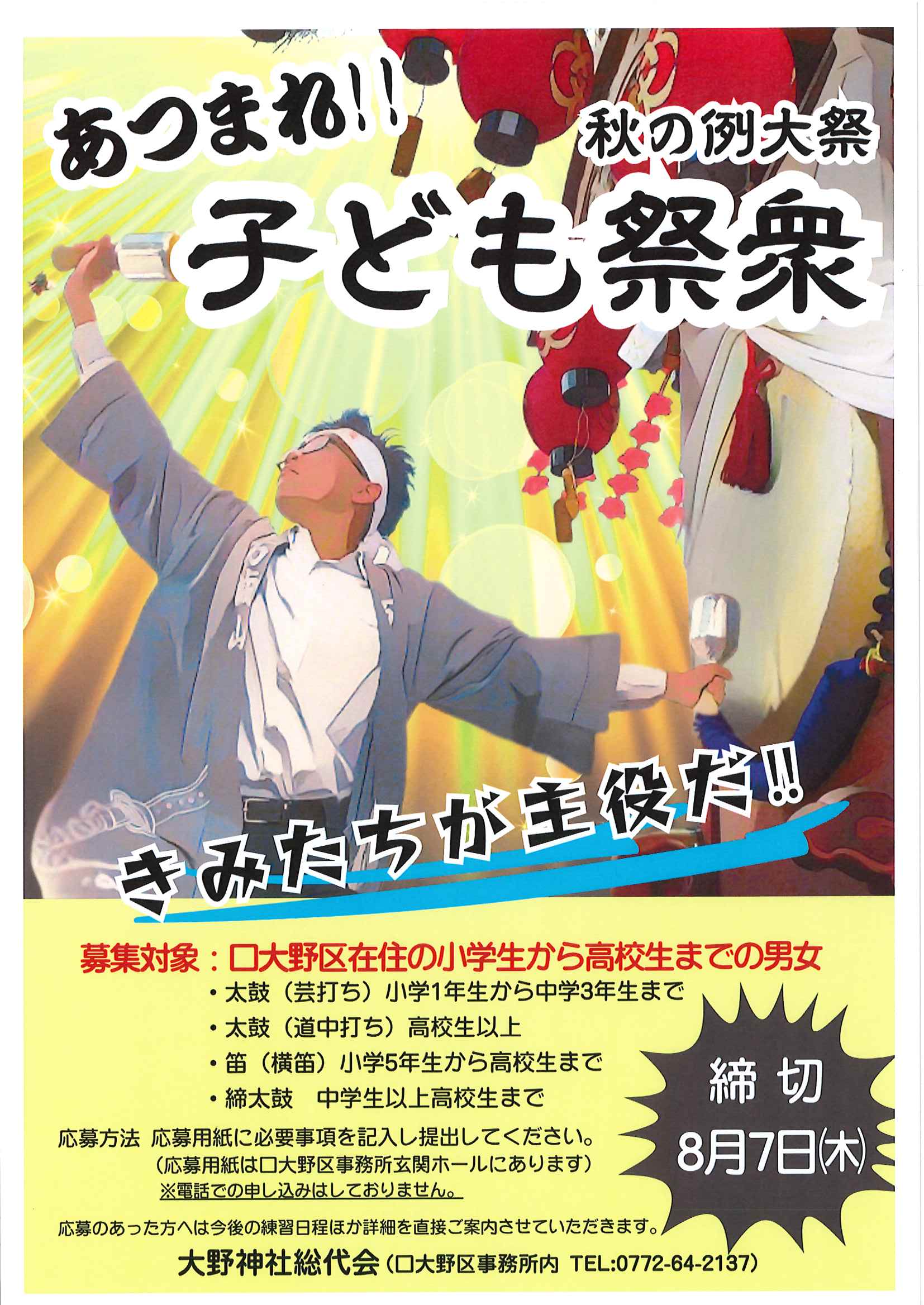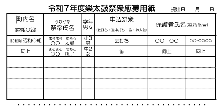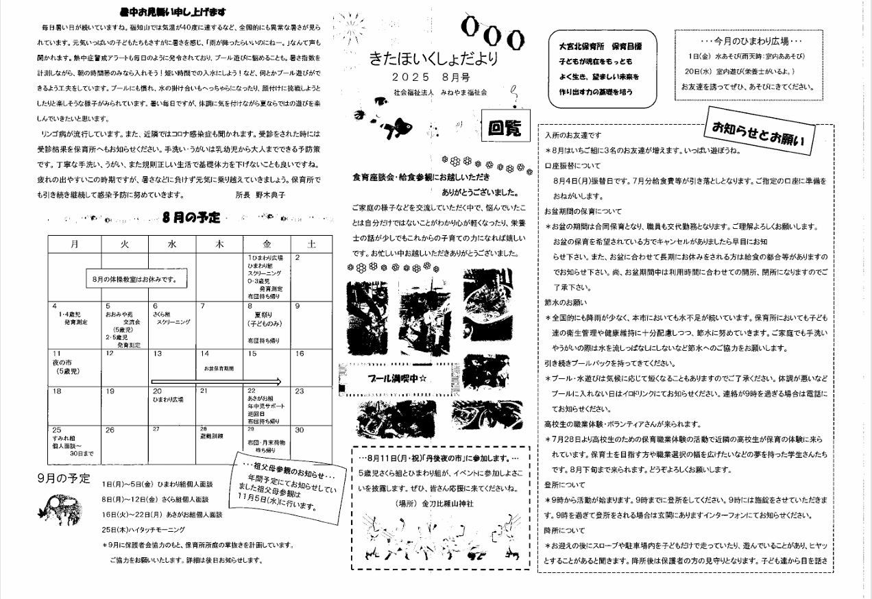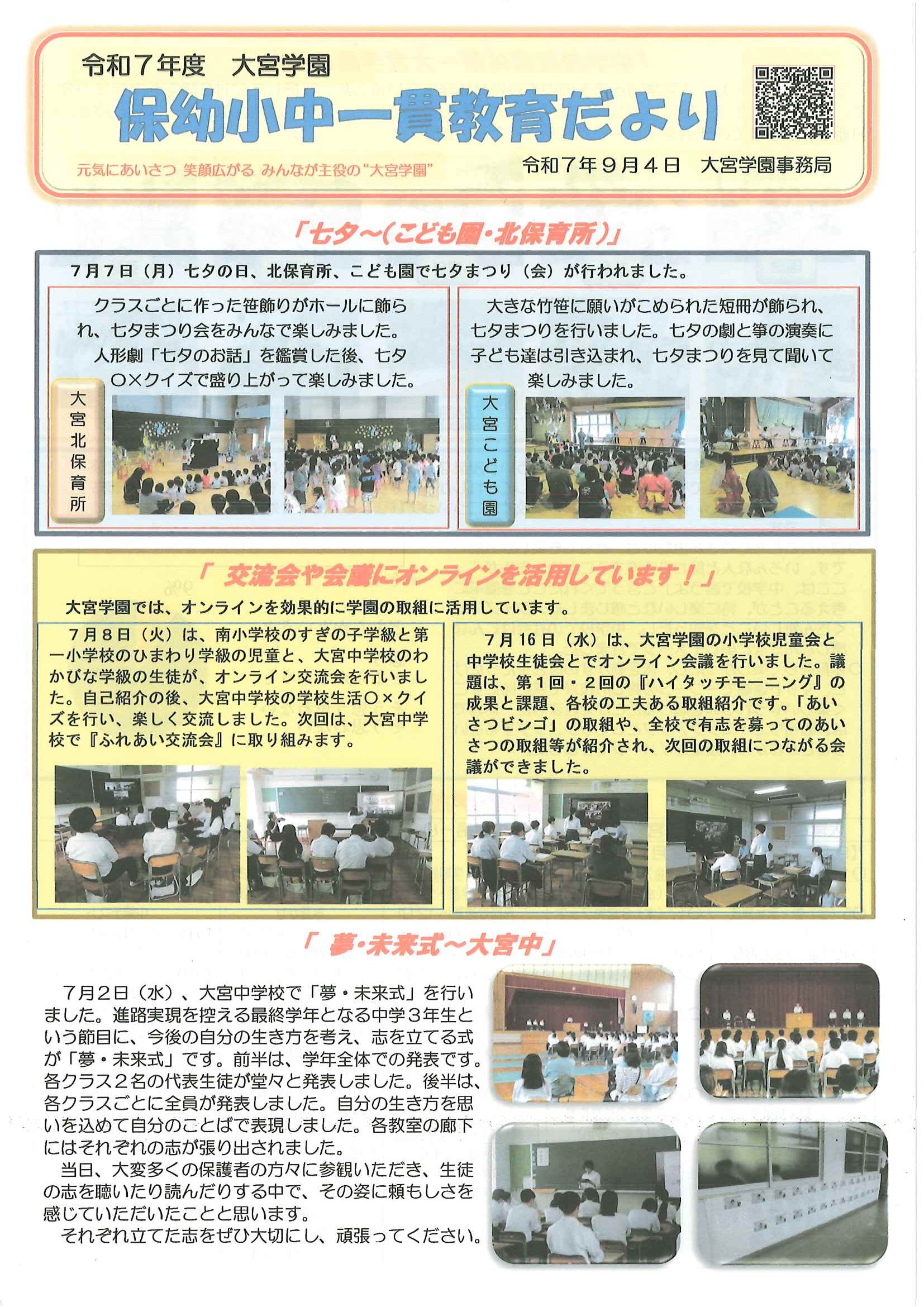 ・口大野夏まつり 裏面 ・あつまれ子ども祭衆 応募様式 ・令和7年神社例大祭樂太鼓子ども祭衆の募集について 応募様式 ・7月ふれあいサロン ・口大野区敬老会 ・大宮駐在所ミニ広報紙大宮パトロール7月号 ・一小の子7月号 裏面 ・大中だより7月号 裏面 ・きたほいくしょだより ・保幼小中一貫教育だより 裏面