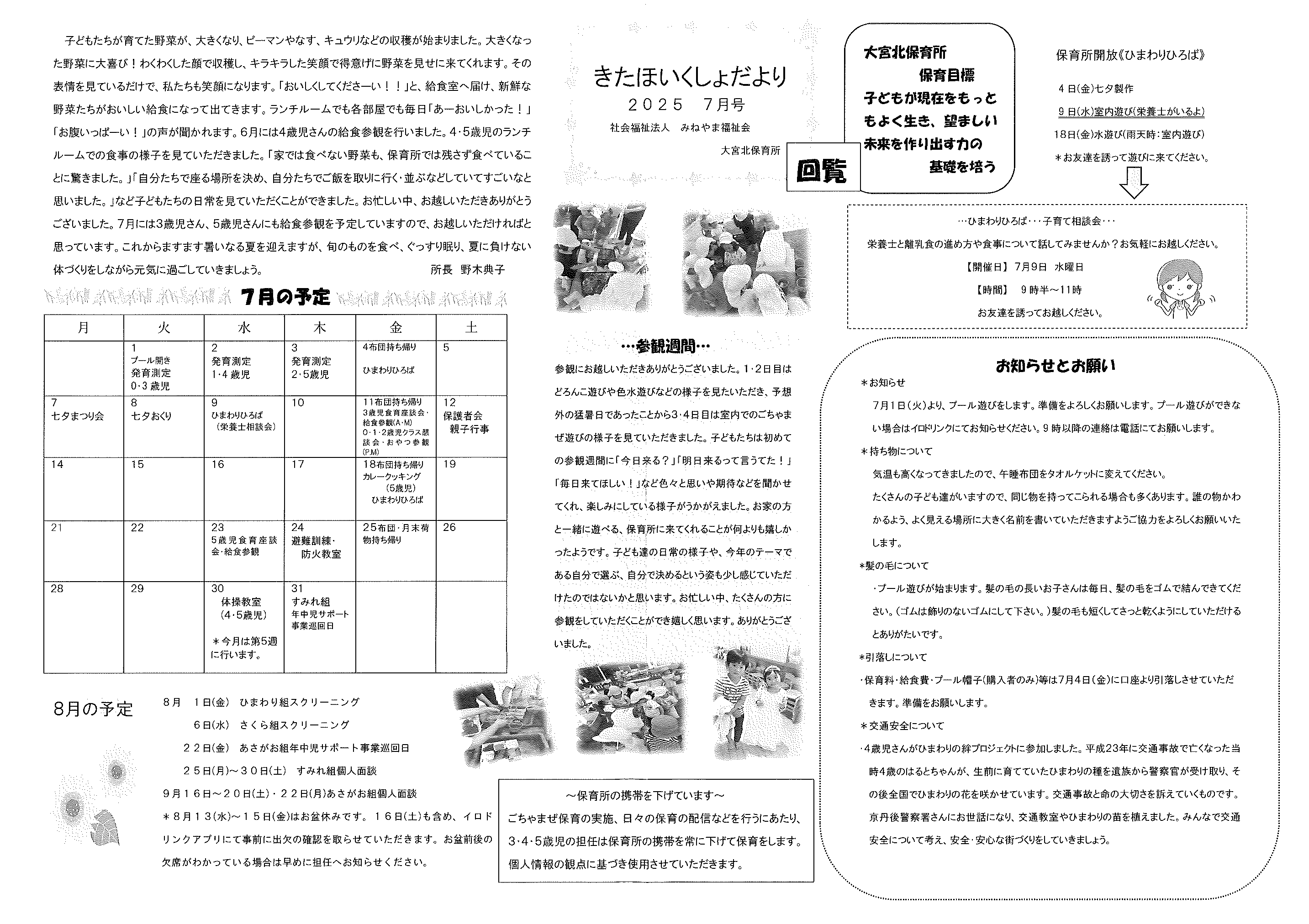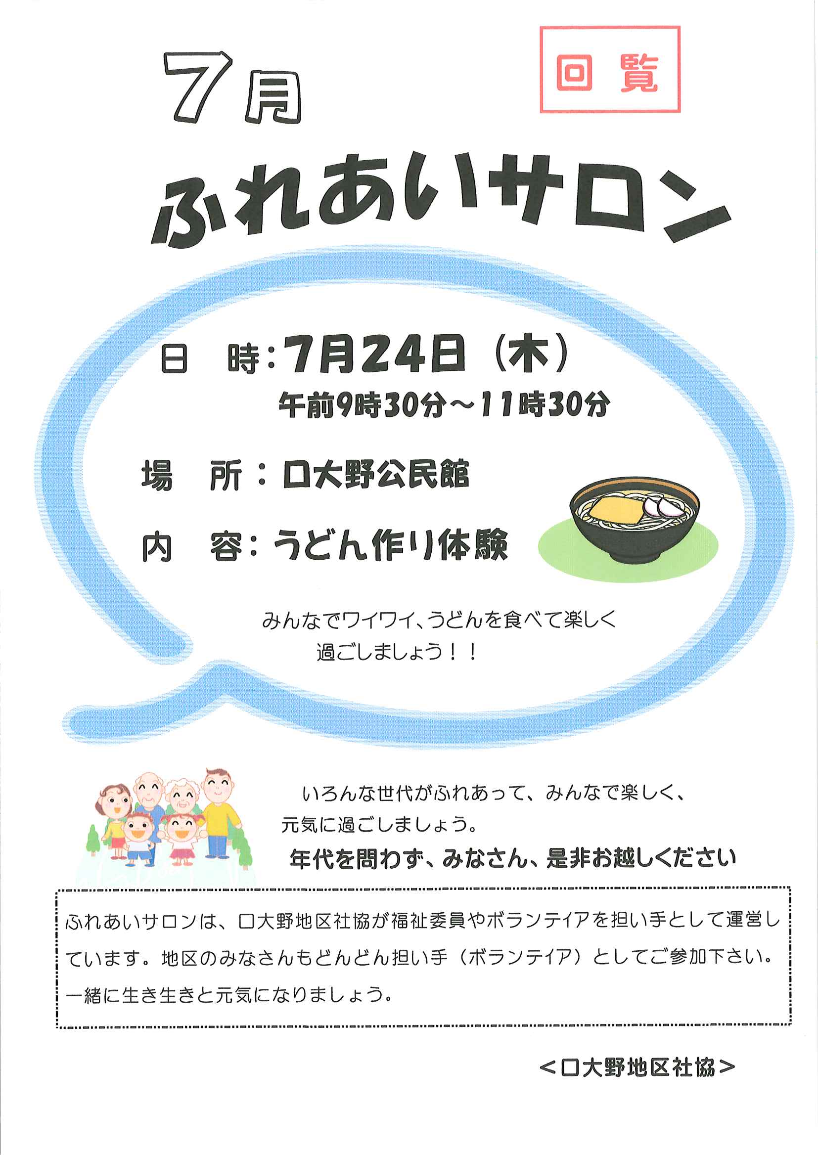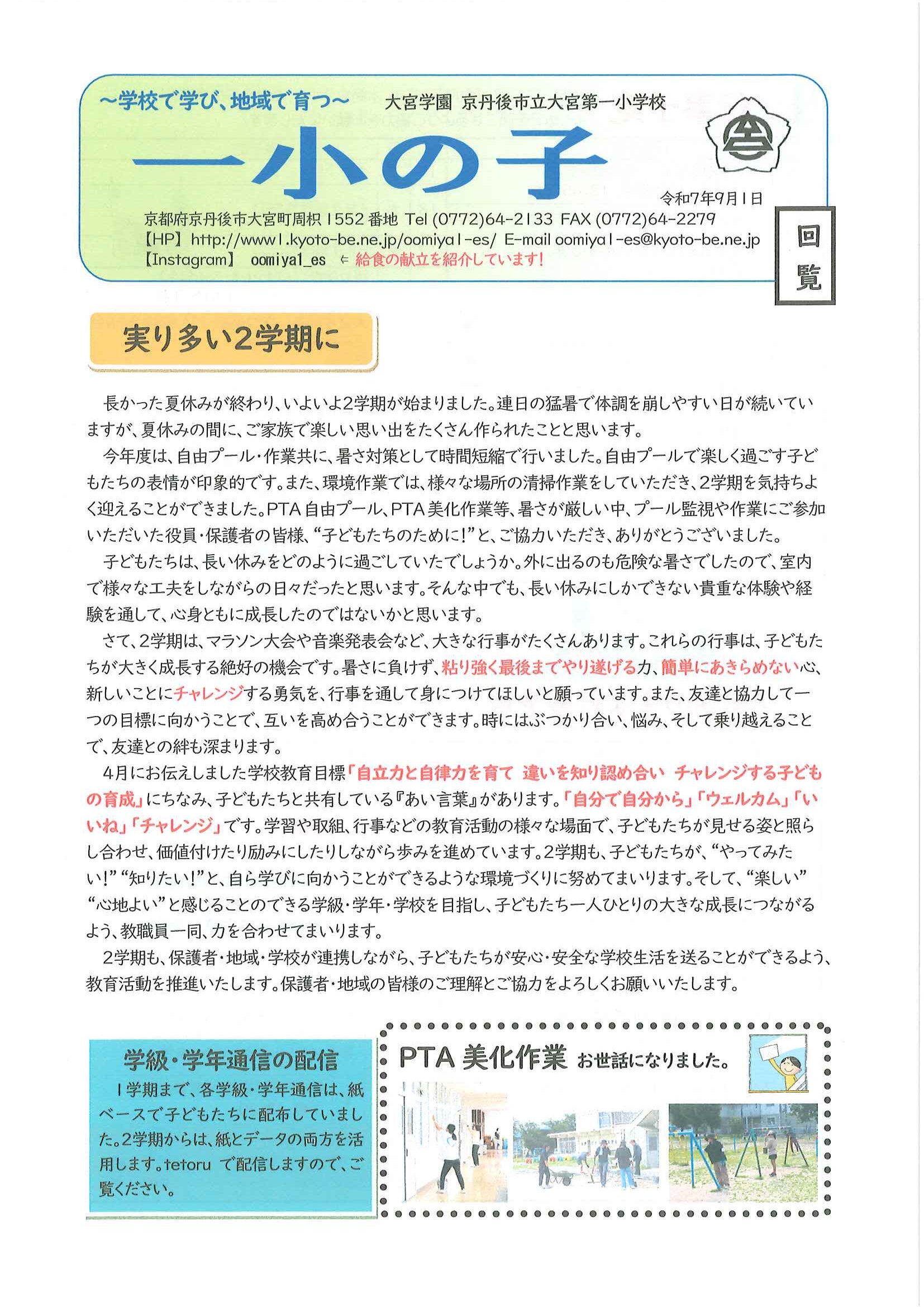 ・口大野夏まつり 裏面 ・あつまれ子ども祭衆 応募様式 ・令和7年神社例大祭樂太鼓子ども祭衆の募集について 応募様式 ・7月ふれあいサロン ・口大野区敬老会 ・大宮駐在所ミニ広報紙大宮パトロール7月号 ・一小の子7月号 裏面 ・大中だより7月号 裏面 ・きたほいくしょだより ・保幼小中一貫教育だより 裏面