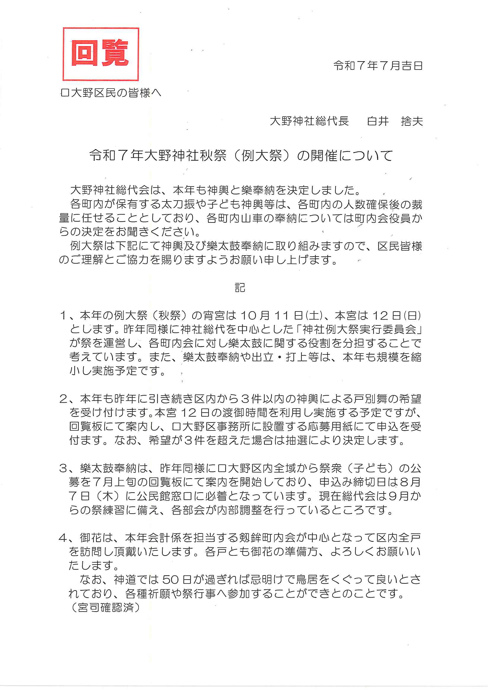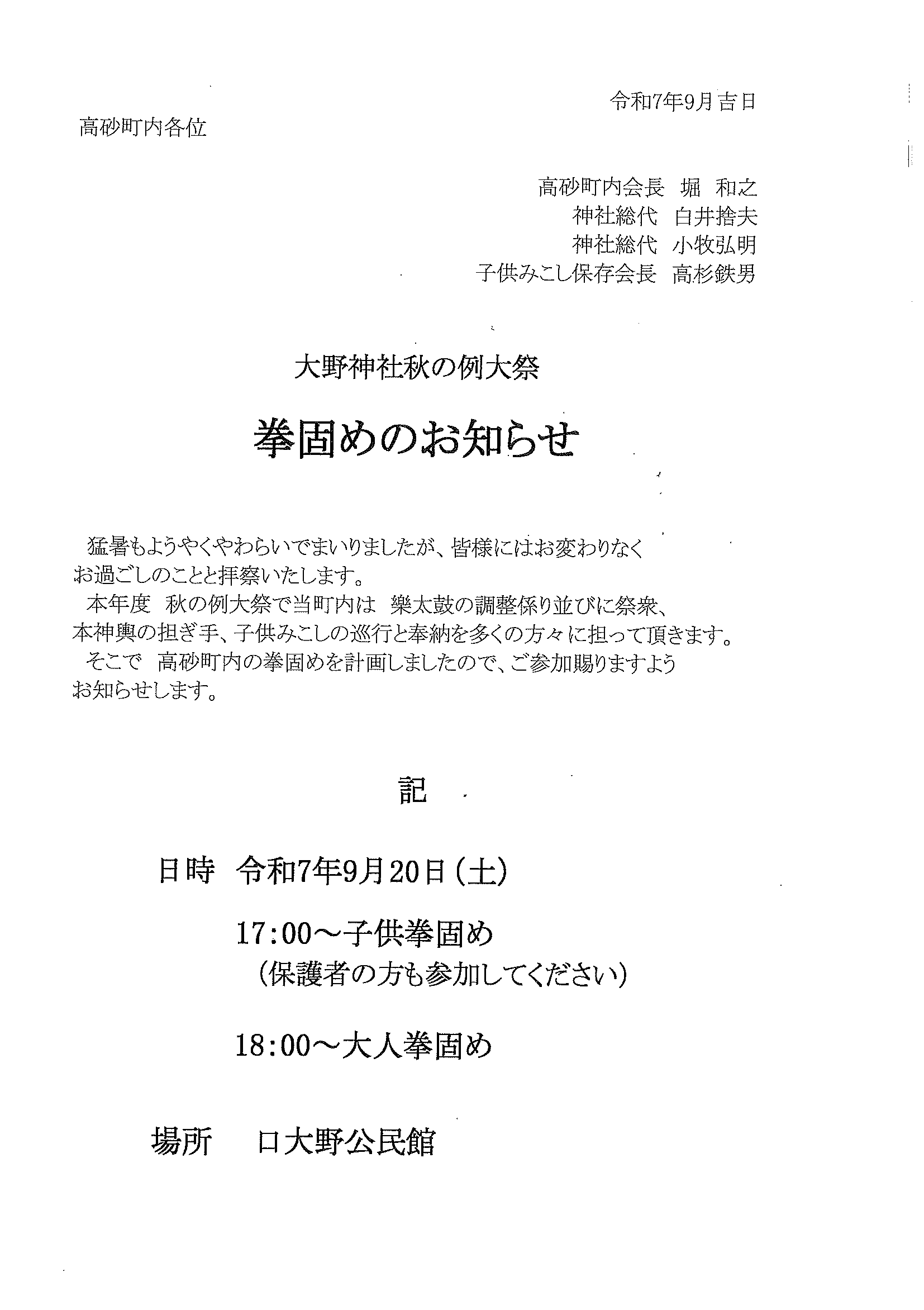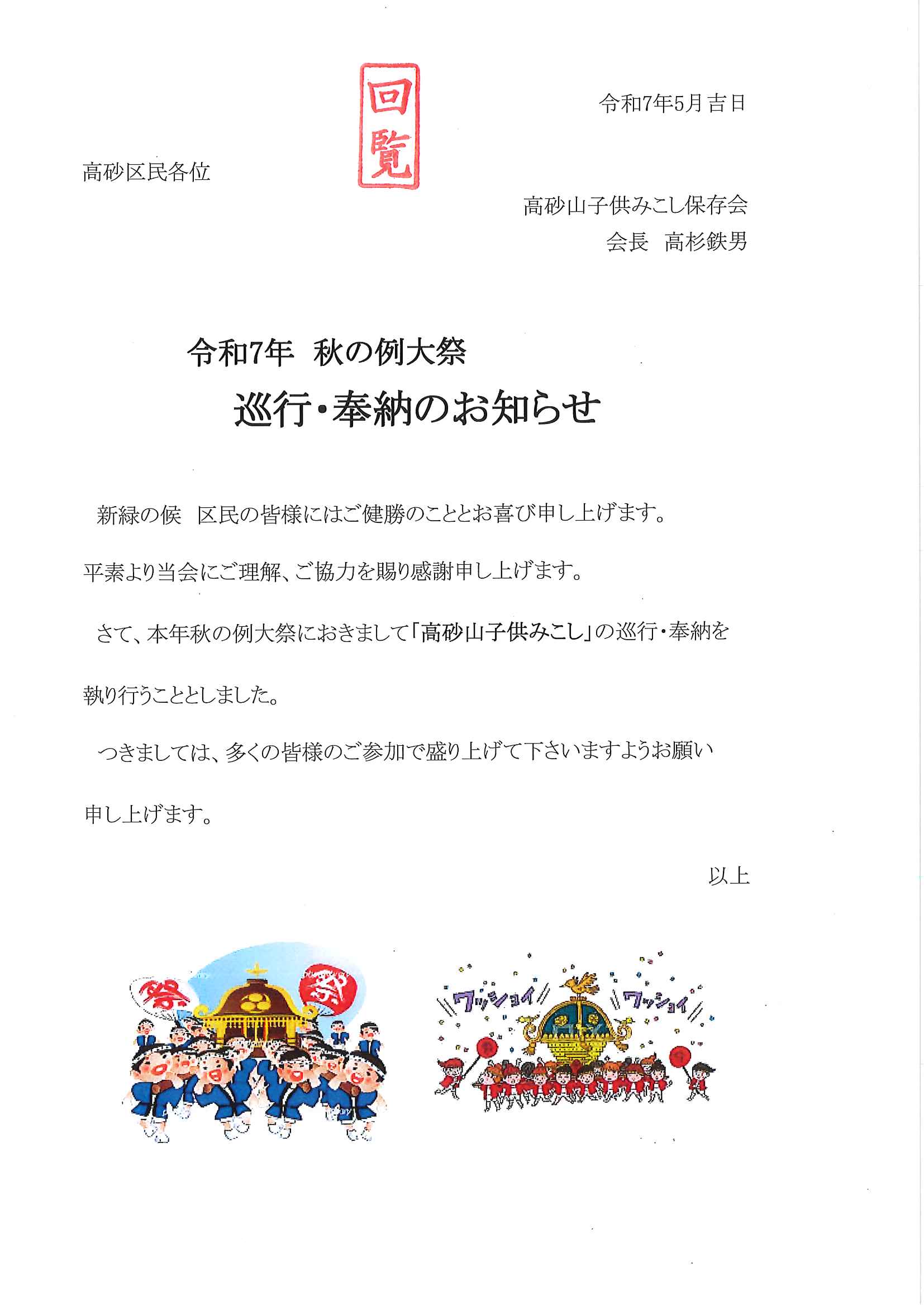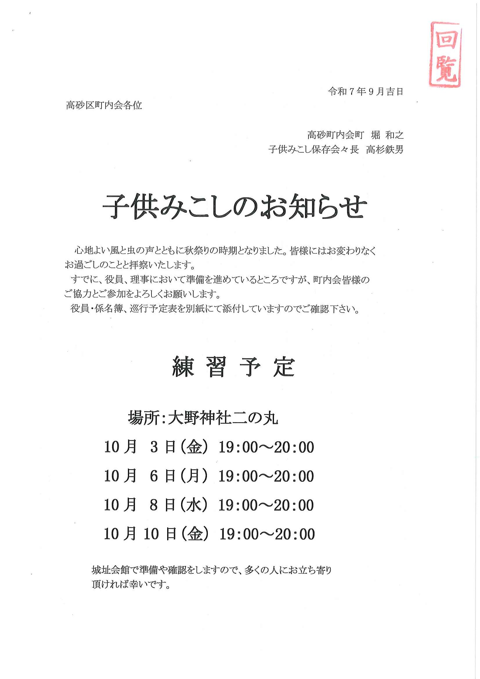 ・<高砂町内あて>秋祭り子どもみこし巡行奉納について
