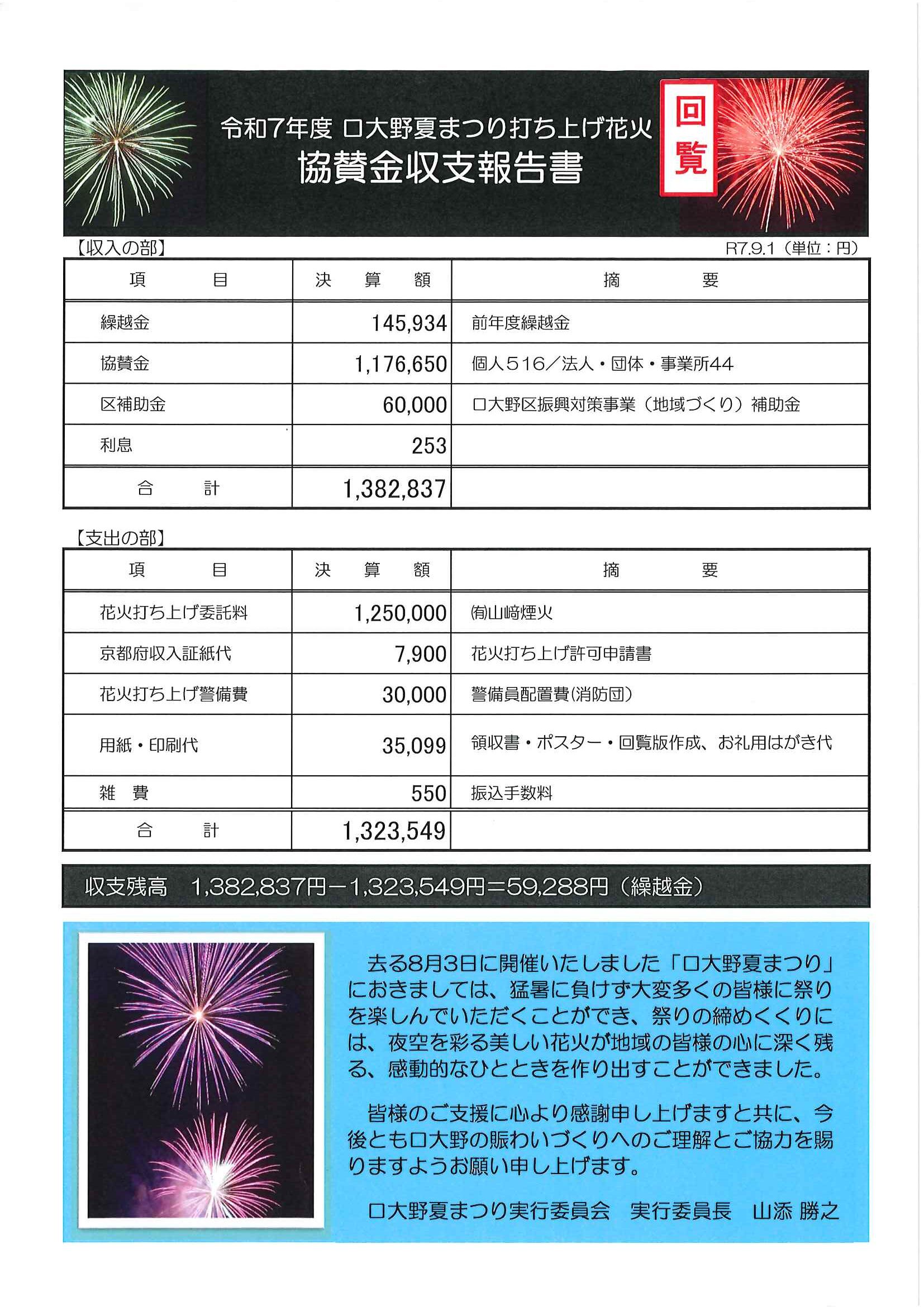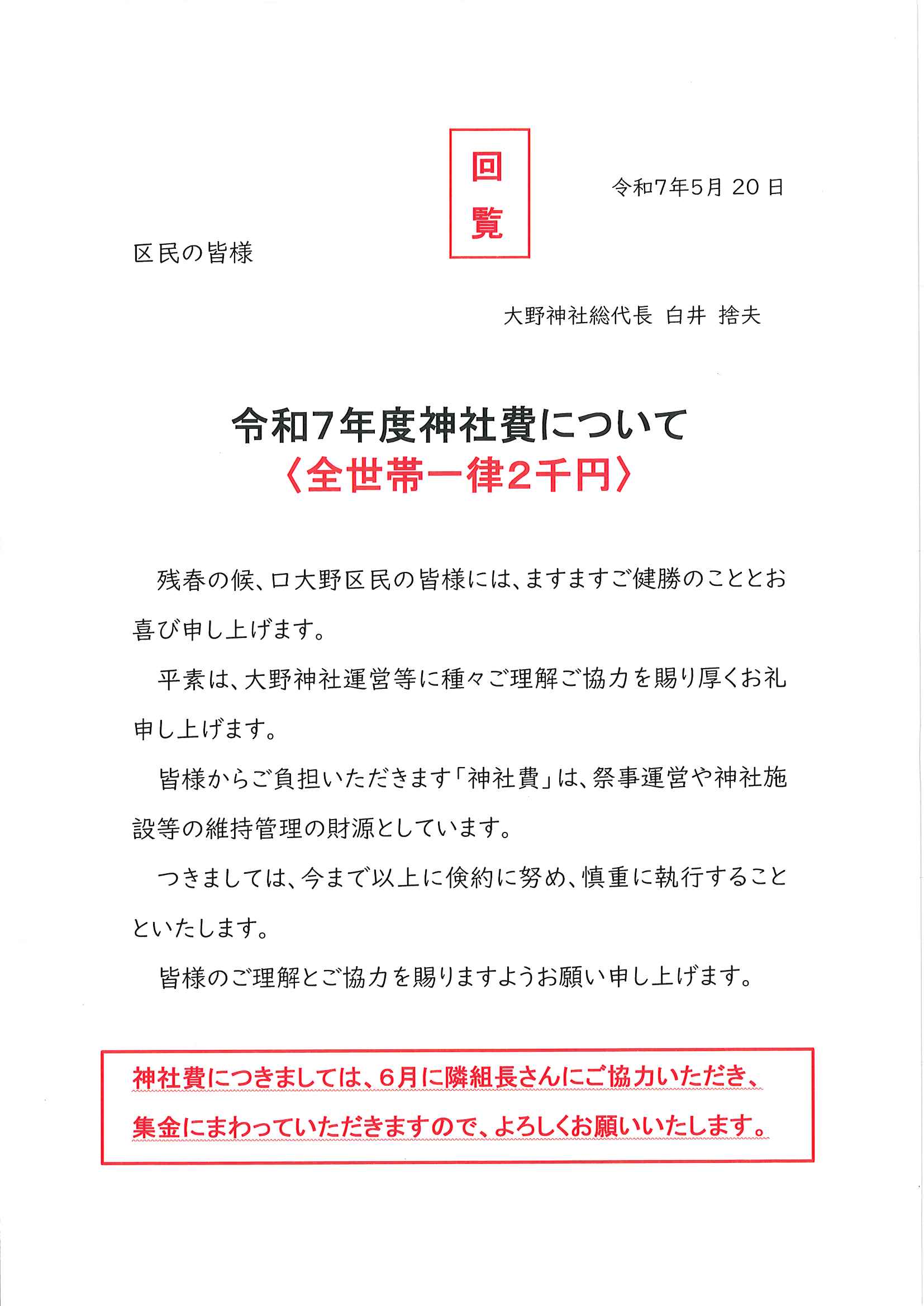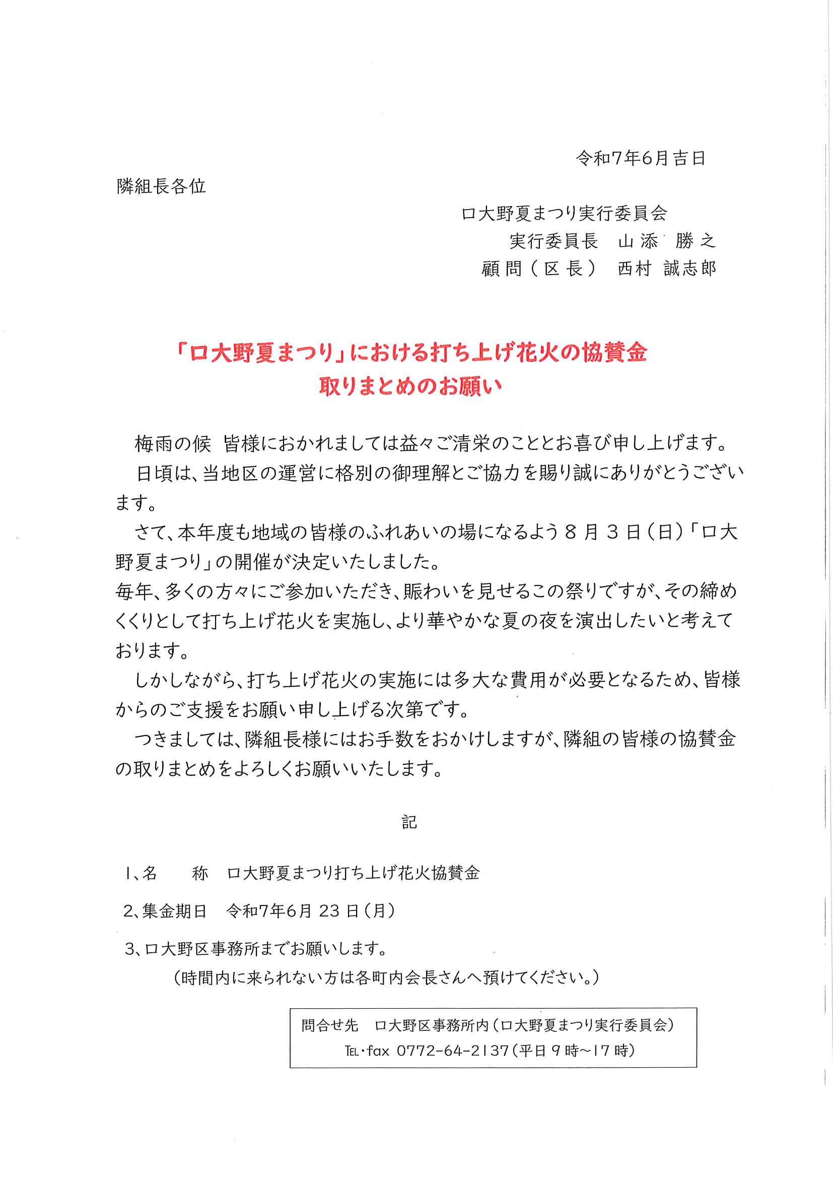 ・<各隣組長様あて>「口大野夏まつり」花火協賛金取りまとめのお願い ・神社費集金のお願い