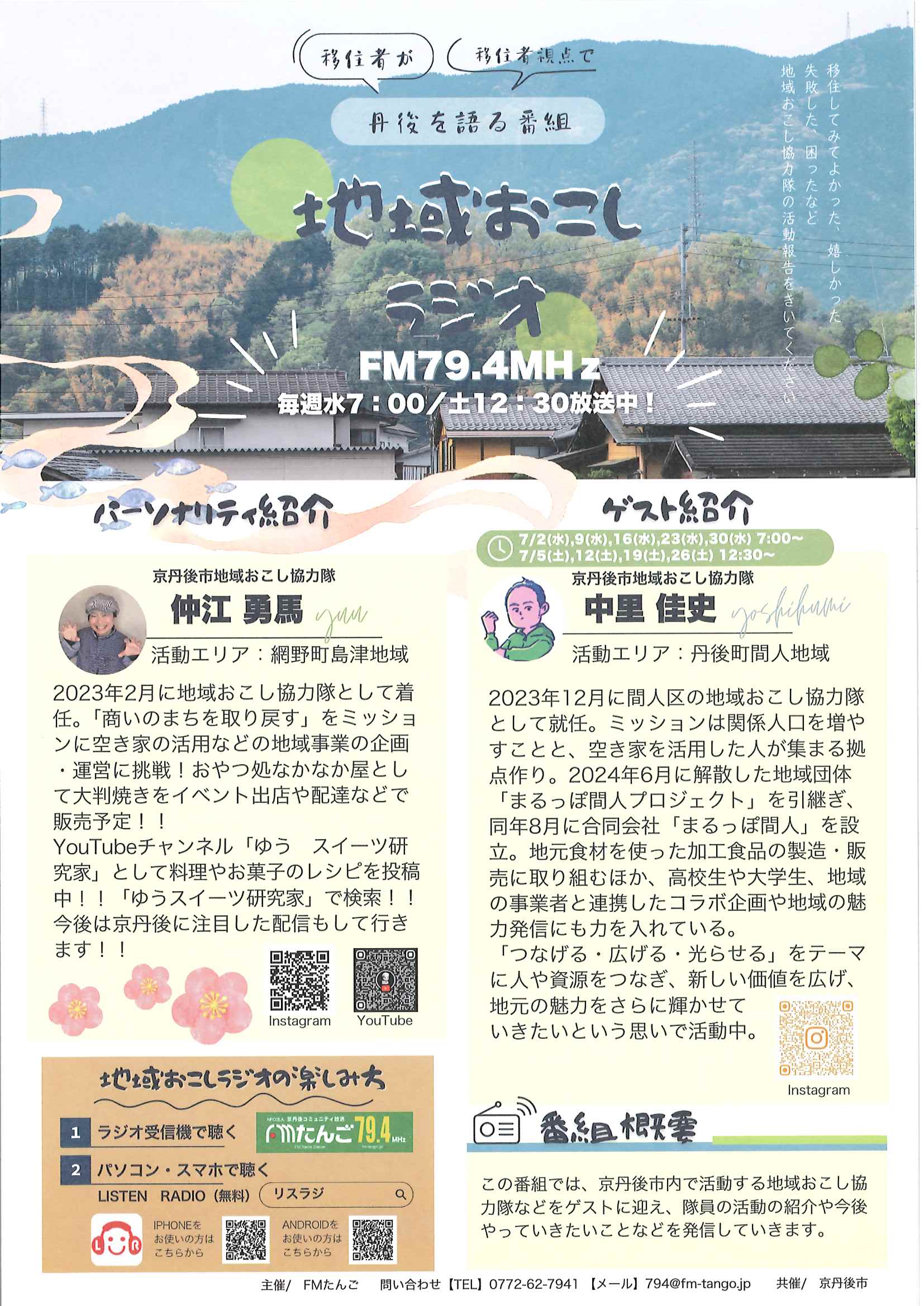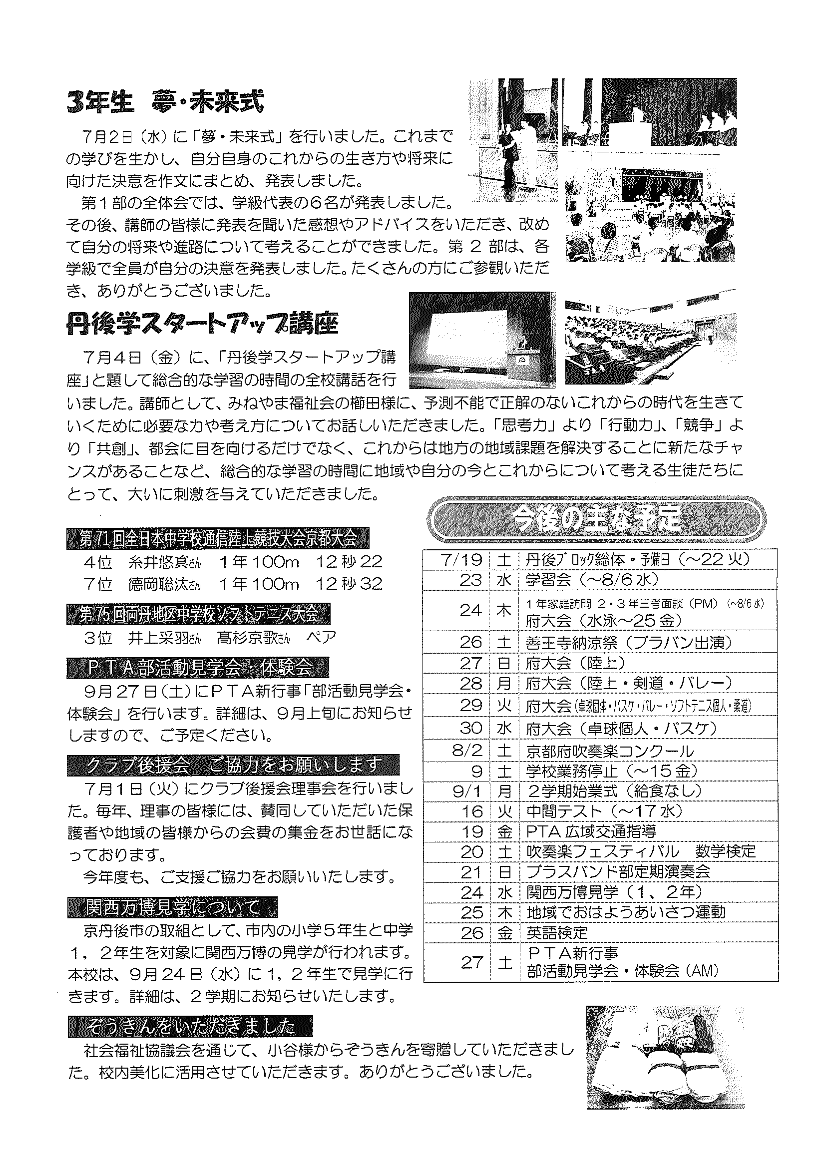 ・地域おこしラジオ 丹後を語る番組 ・奨学金の返還を支援します 裏面 ・下水道工事予定表7/25- ・大中だより7/18 裏面 ・一小の子7/18 裏面 ・丹後地区森林組合だより ・大宮市民局NEWSおおみやトピックス ・大野神社秋祭(例大祭)の開催について
