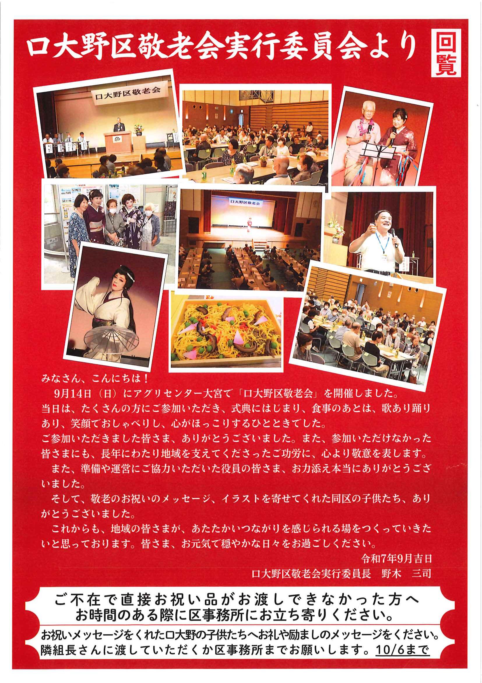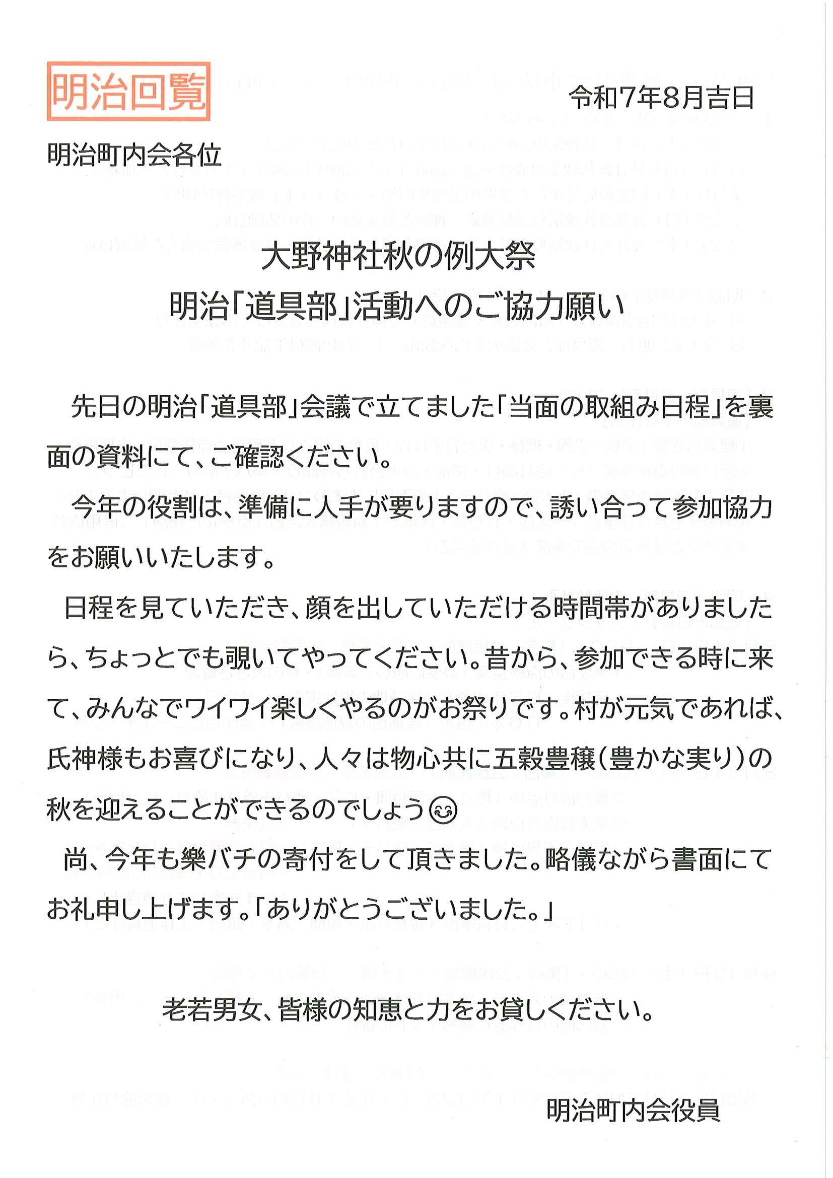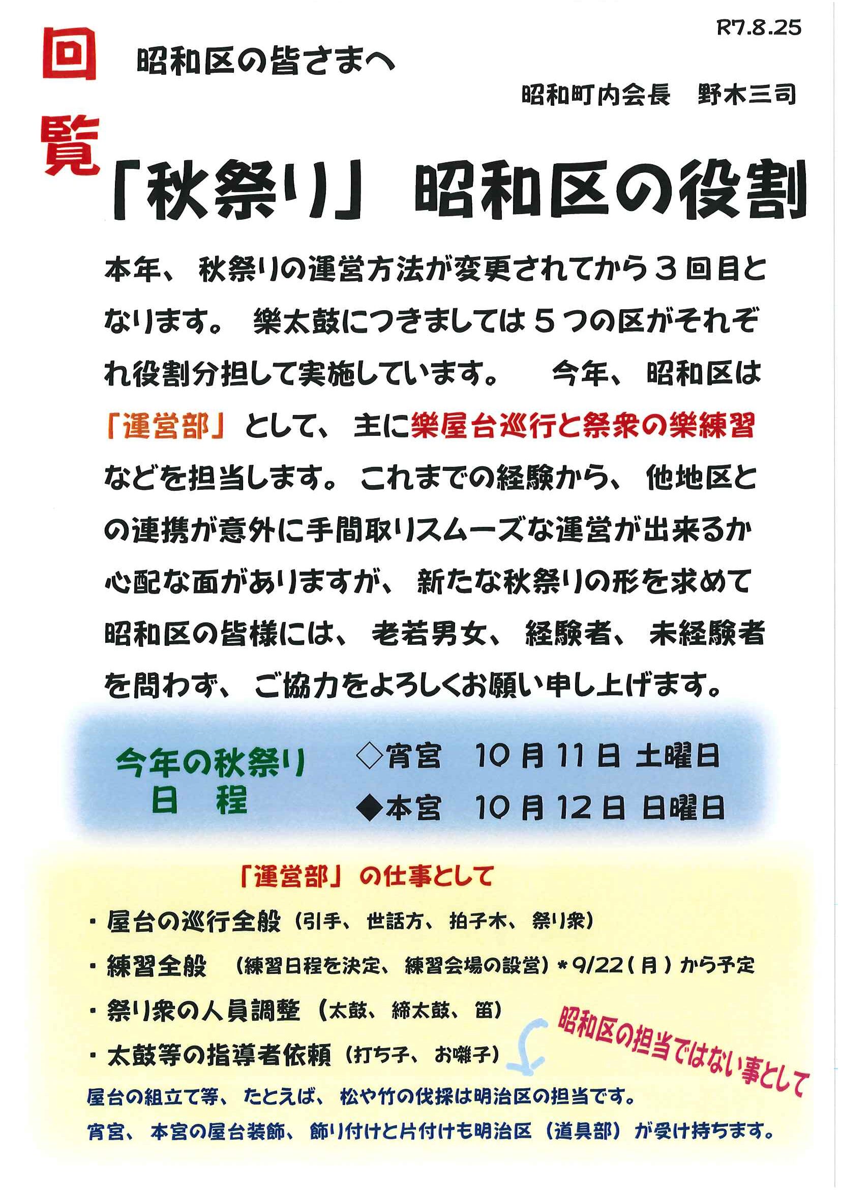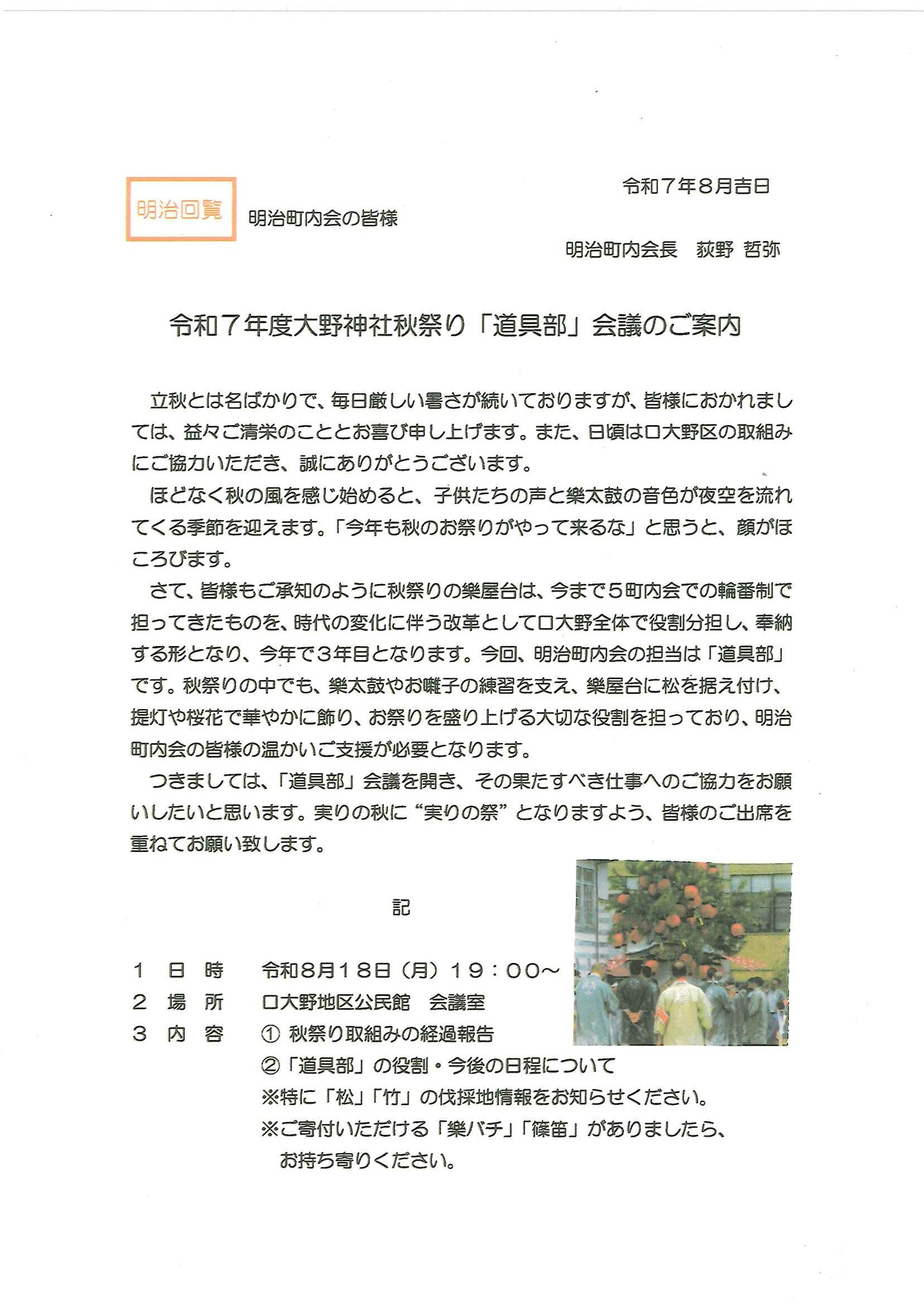 ・<敬老会参加者あて>口大野区敬老会最終お知らせ ・<昭和町内会あて>秋祭り昭和町内会の役割 ・<明治町内会あて>秋祭り道具部への協力について 裏面