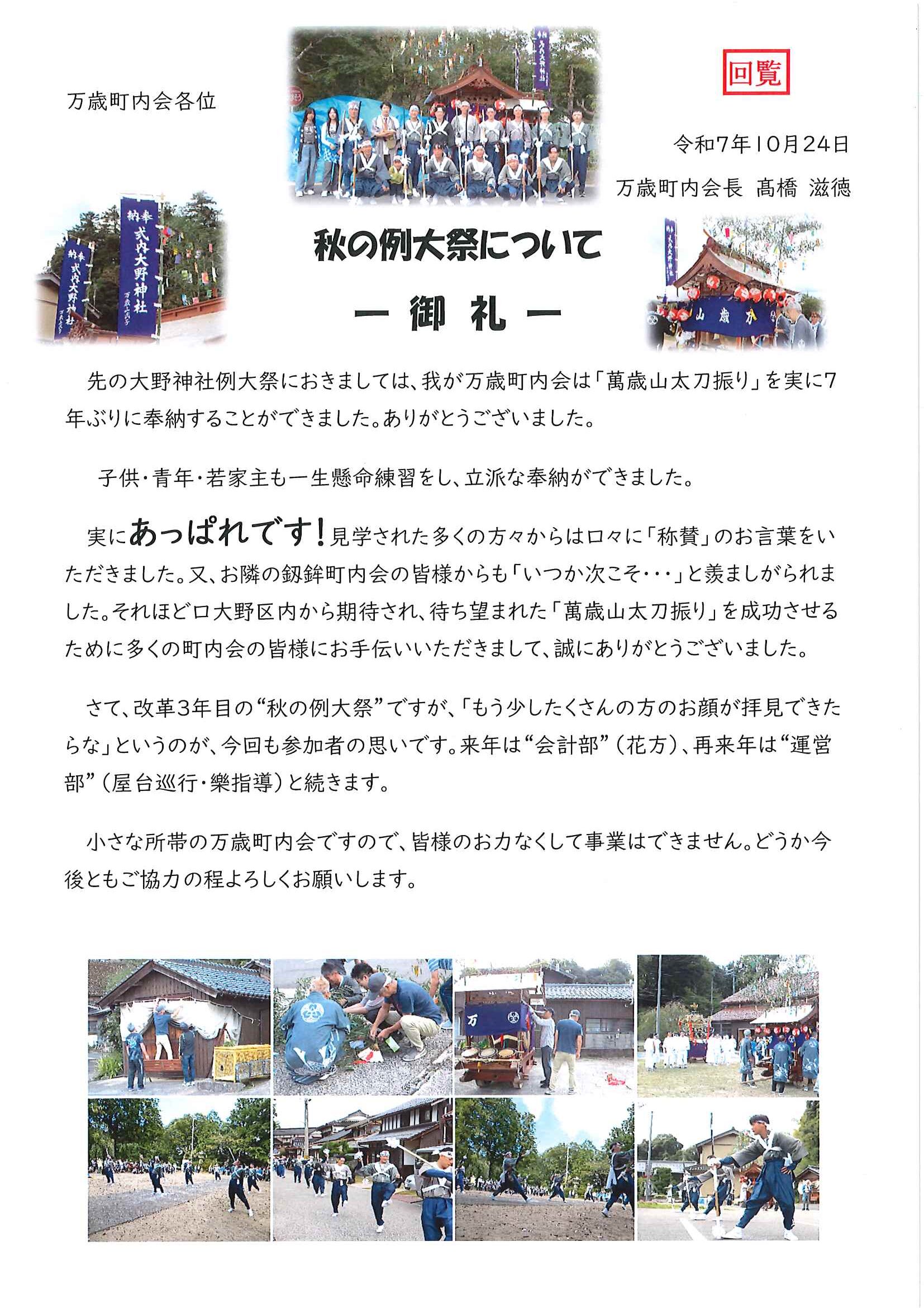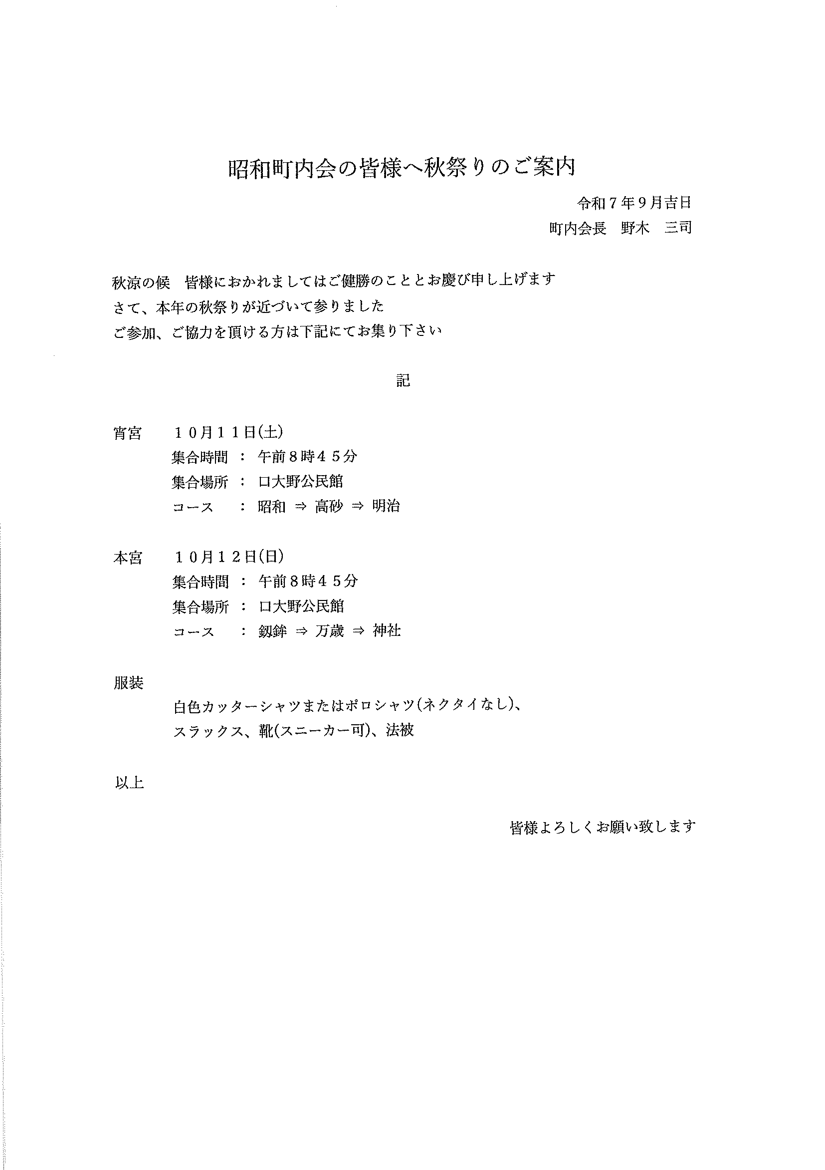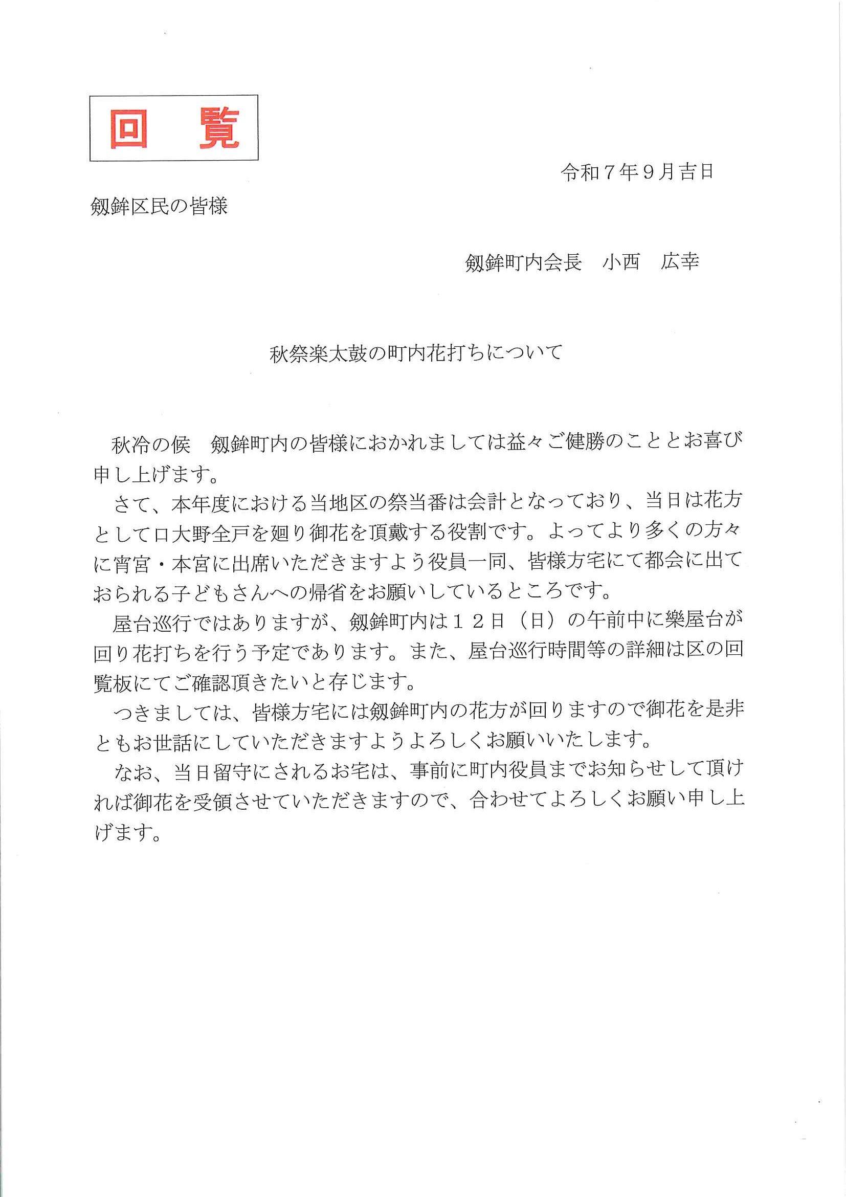 ・<敬老会参加者あて>口大野区敬老会最終お知らせ ・<昭和町内会あて>秋祭り昭和町内会の役割 ・<明治町内会あて>秋祭り道具部への協力について 裏面