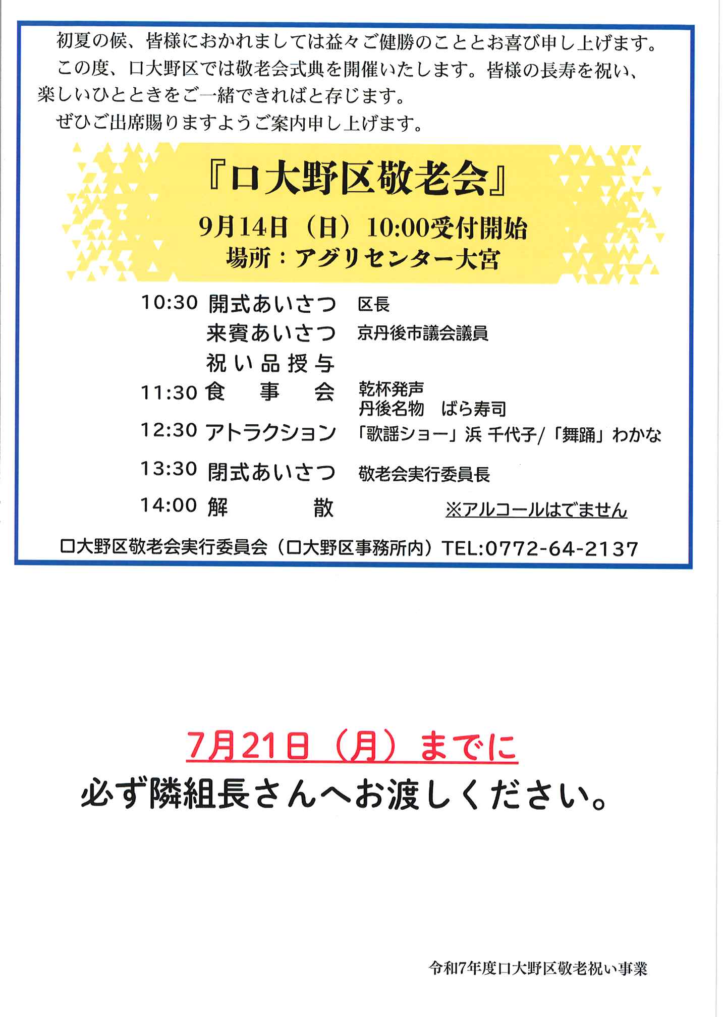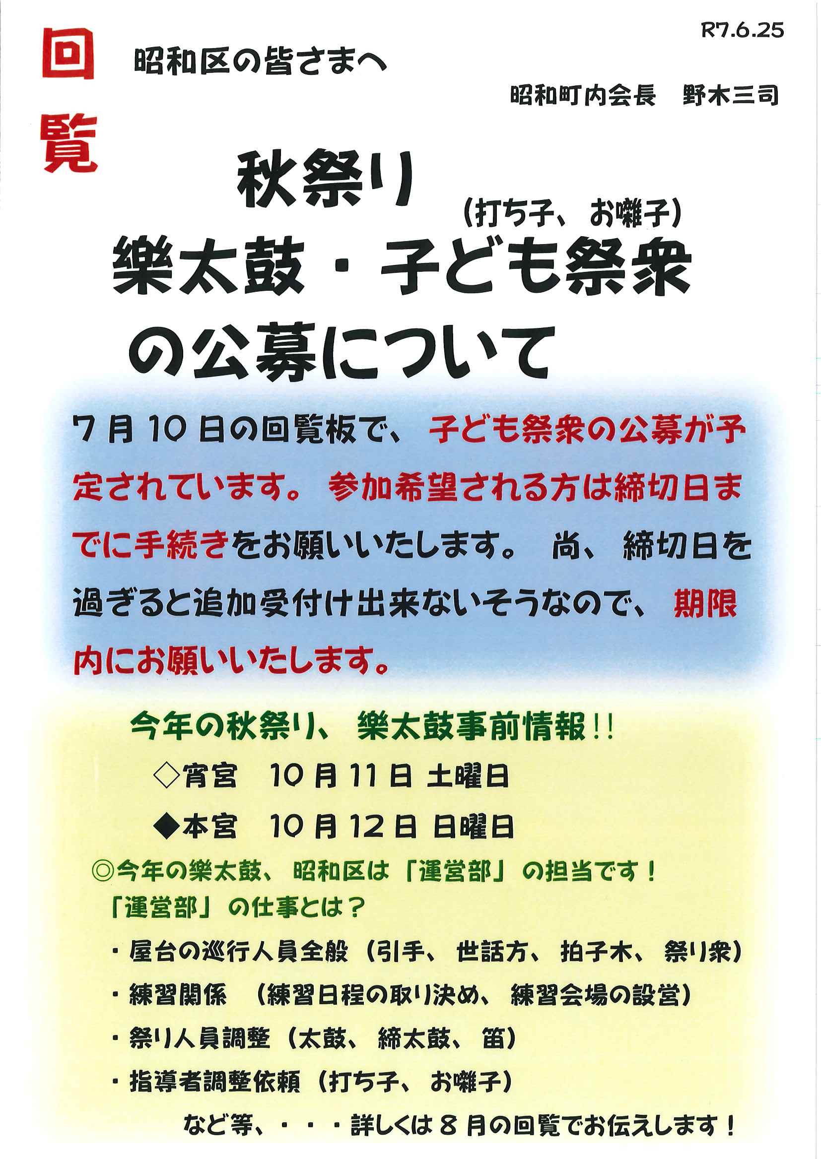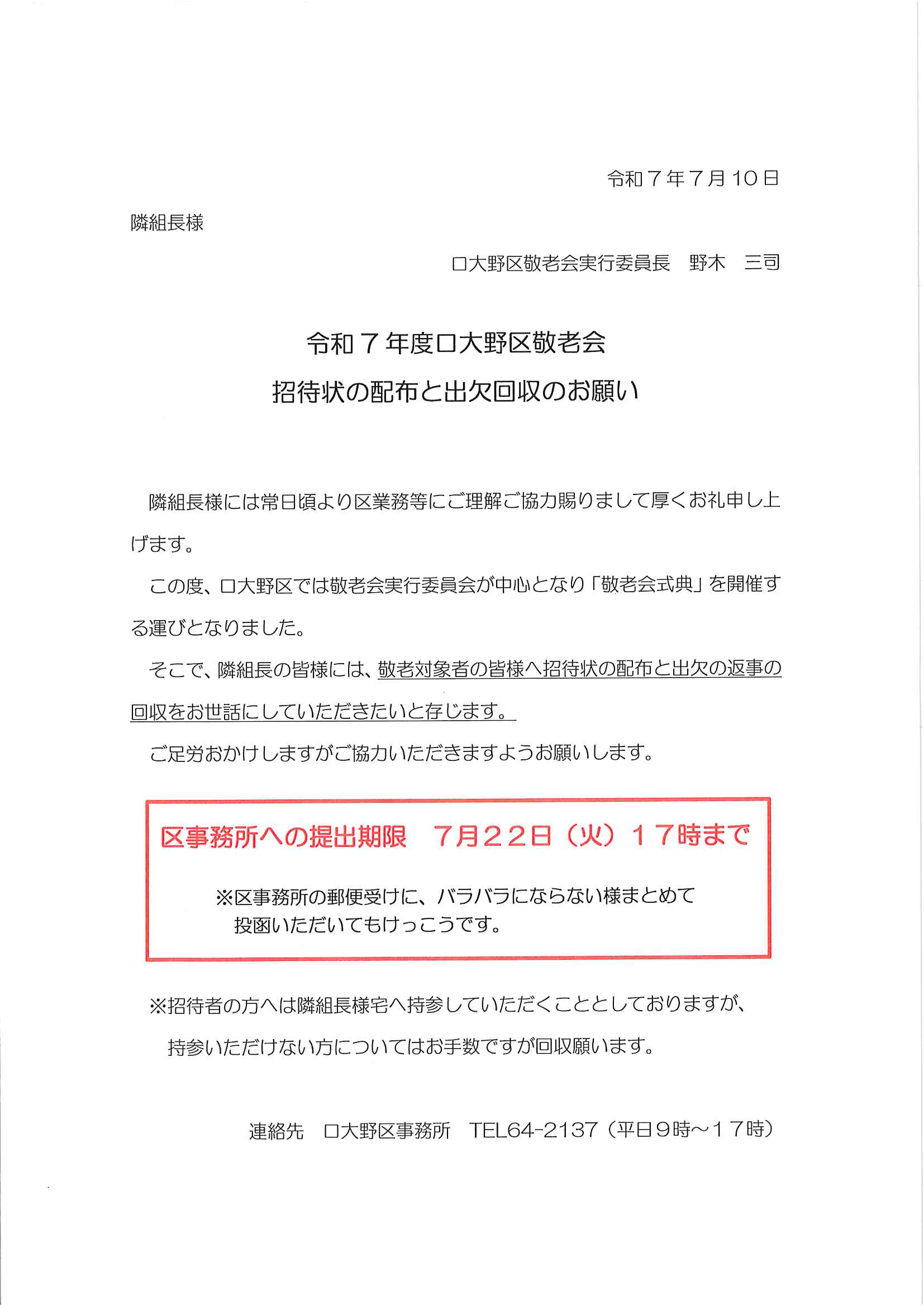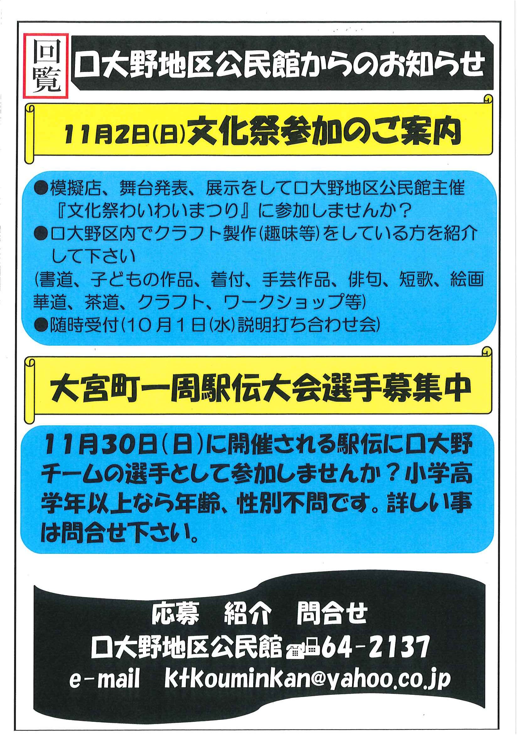 ・<敬老会参加者あて>口大野区敬老会最終お知らせ ・<昭和町内会あて>秋祭り昭和町内会の役割 ・<明治町内会あて>秋祭り道具部への協力について 裏面