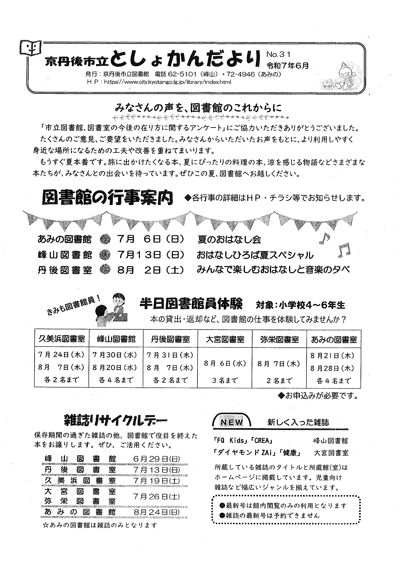 <6月26日> ・広報京丹後7月号 ・丹後環境シンポジウム 裏面 ・京丹後市立としょかんだより6月号 裏面 ・有機野菜つくりの基本を学びます ・木工広場 ・丹後文化会館だよりNo176 裏面