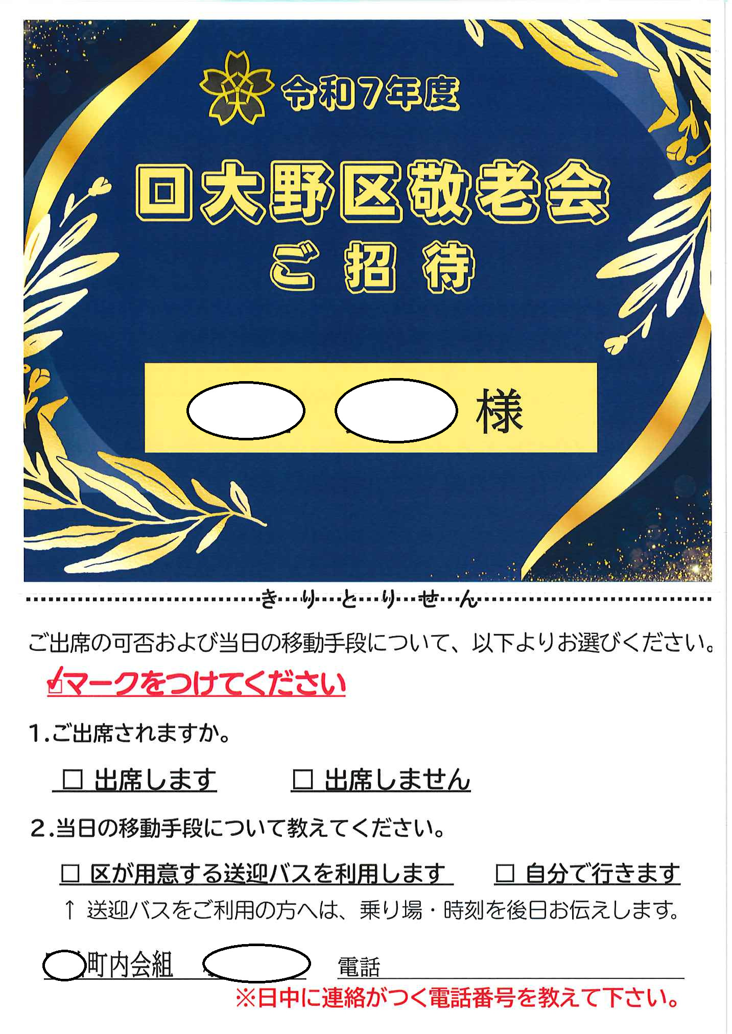 <隣組長さま宛て>・敬老会の招待状配布と出欠とりまとめについて(お願い) 招待状サンプル表面 裏面
