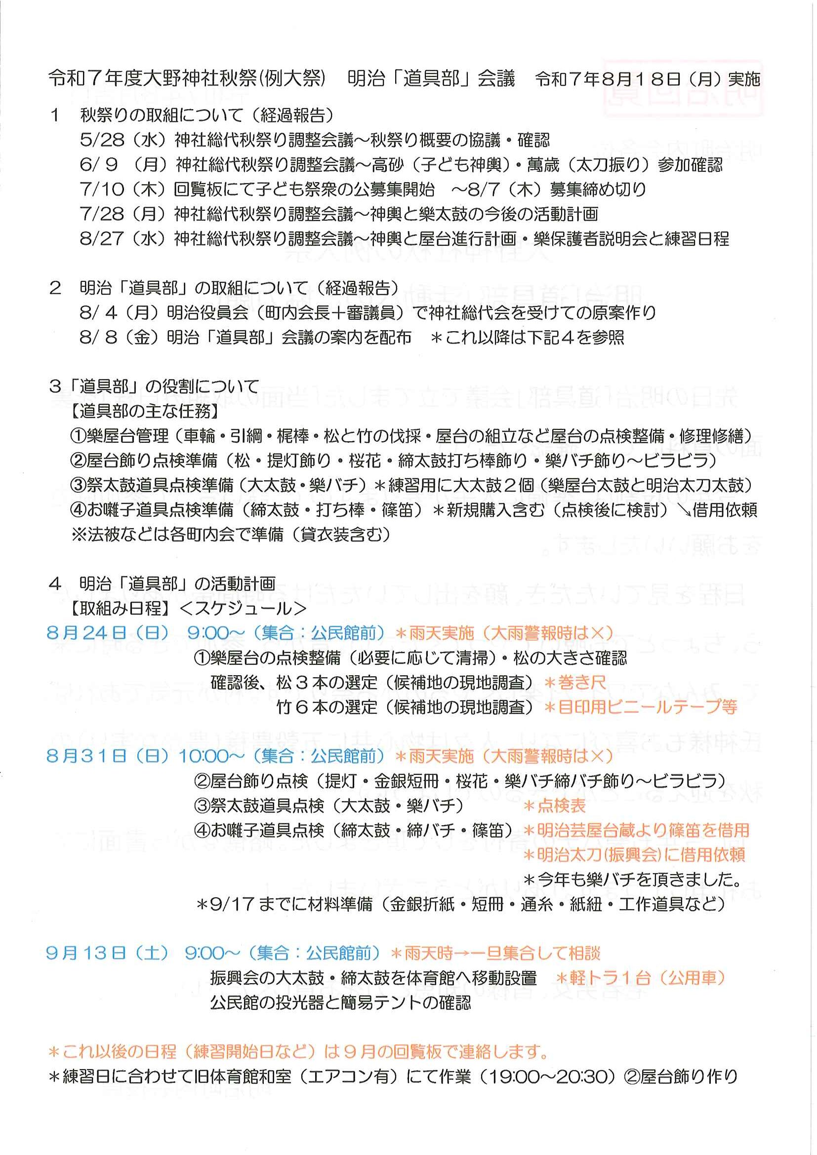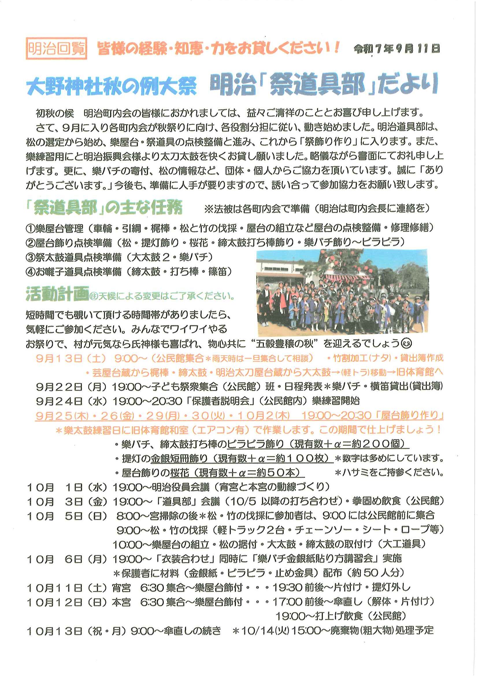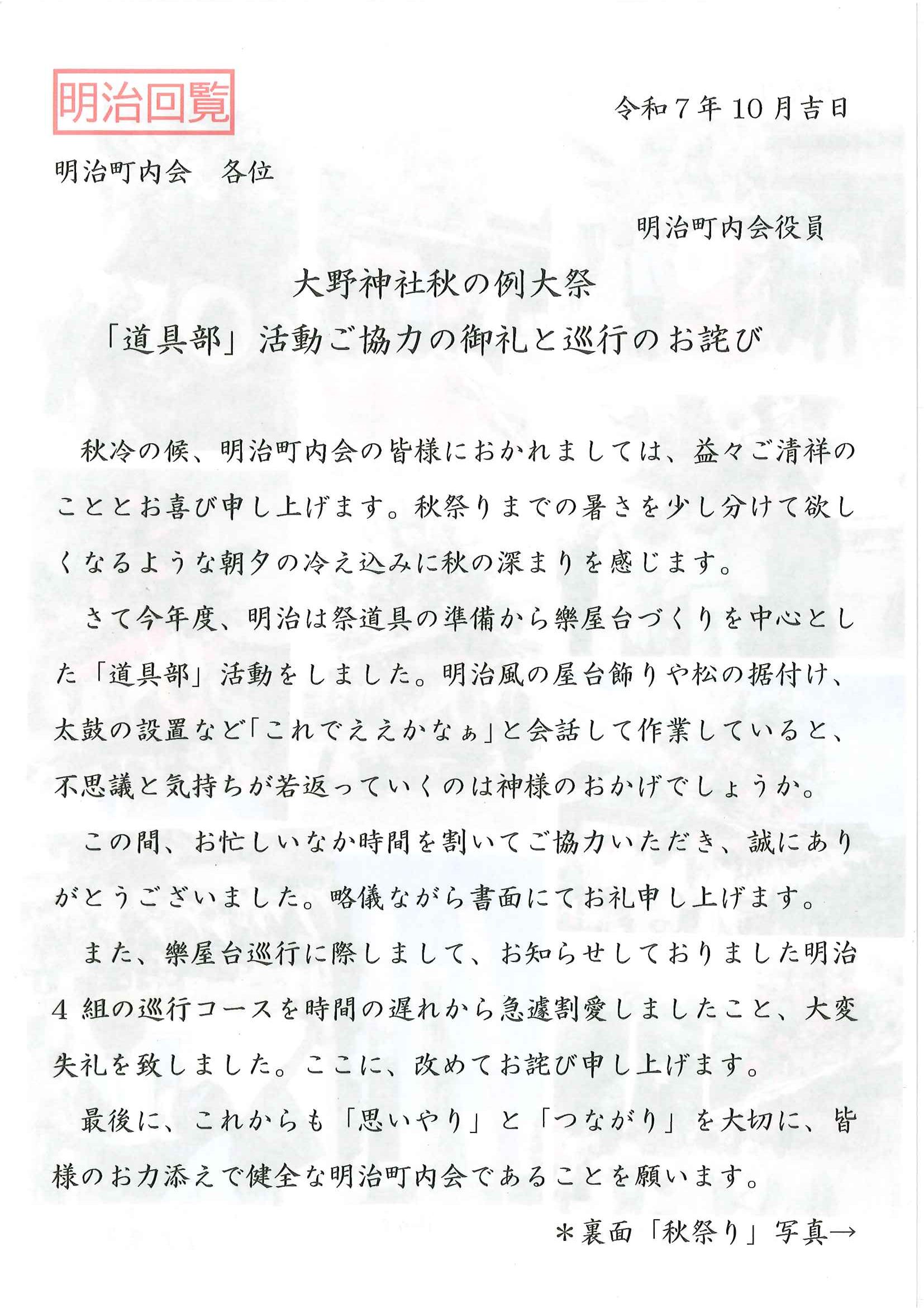 <明治町内会あて>・例大祭道具部だより
