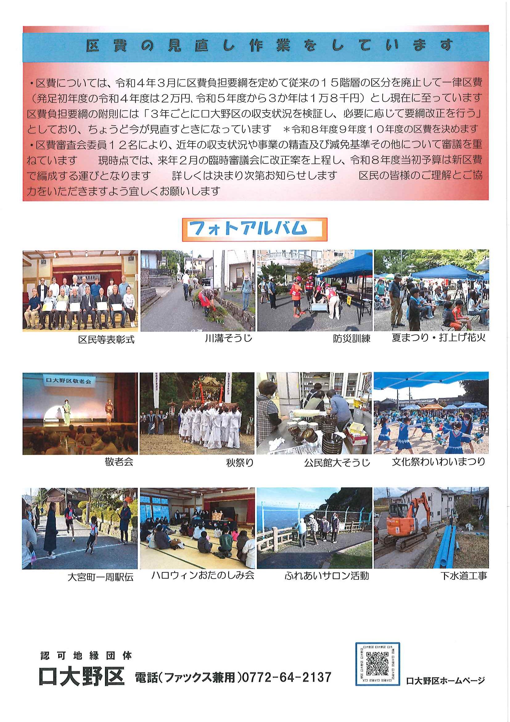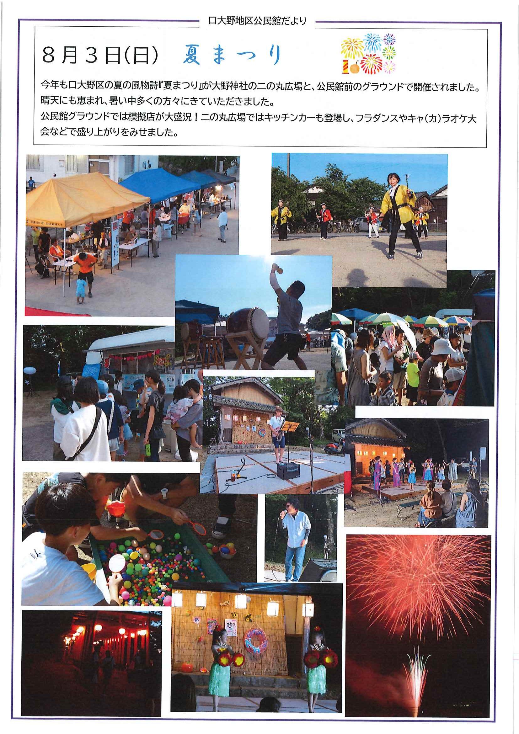 ・お宮の大そうじ ・口大野地区公民館からのお知らせ ・地区公民館第5回フォトコンテスト作品募集 ・恵美寿会新しい仲間を募集中 ・口大野夏まつり打上げ花火協賛金収支報告書 ・資源ごみは正しく出しましょう ・大宮駐在所ミニ広報紙 大宮パトロール ・クマ出没注意 裏面 ・定額減税を補足する給付金に関するお知らせ ・大中ブラスバンド部定期演奏会 ・久美浜湾一周駅伝競走大会出場者募集 裏面 ・こまねこまつり 裏面 ・3日間限定65歳未満対象200円レール取り組み実施 ・保幼小中一貫教育だより 裏面 ・大中だより 裏面 ・一小の子 裏面 ・きたほいくしょだより