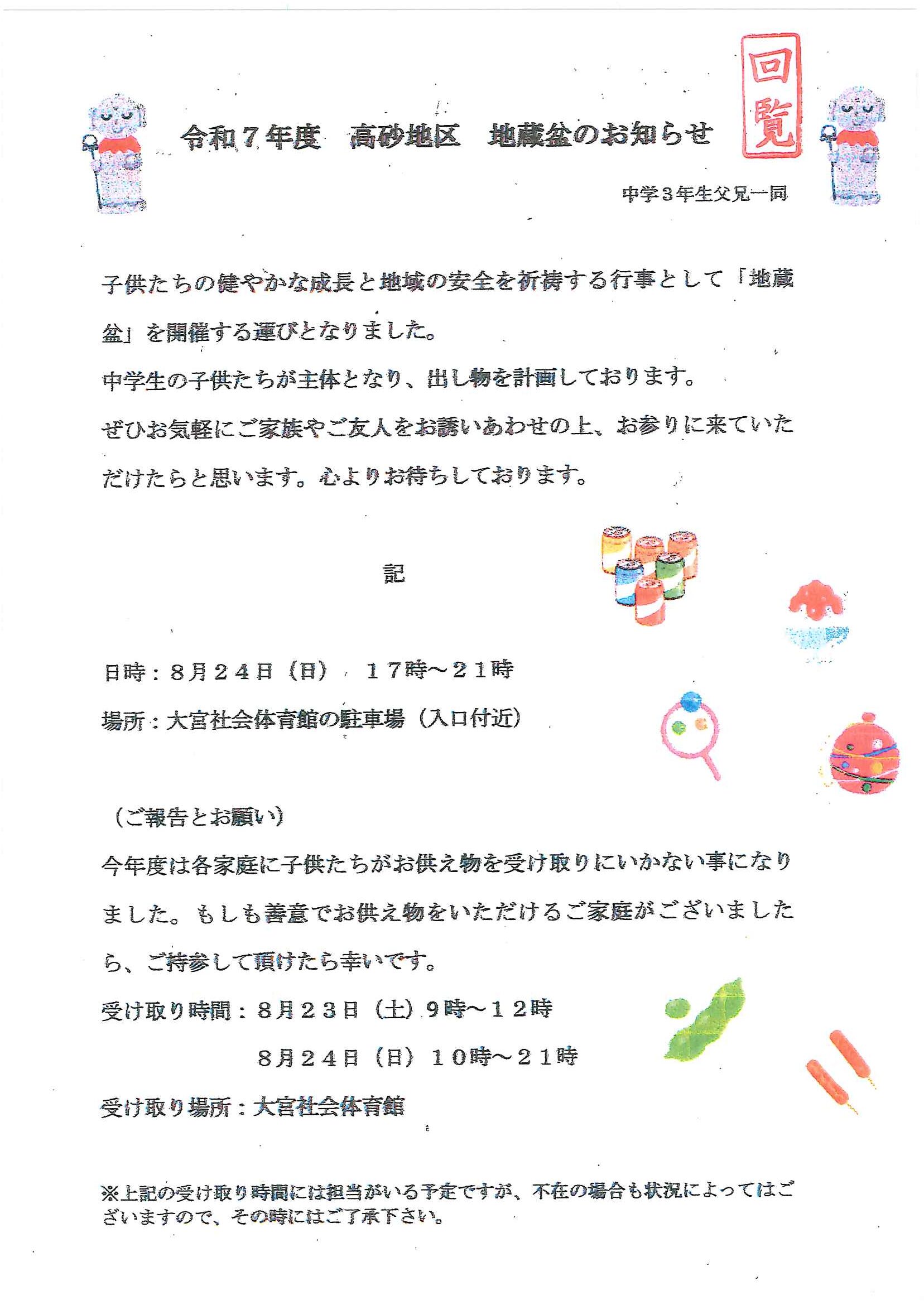 <高砂町内会>・高砂地区地蔵盆のお知らせ <明治町内会>・秋祭り「道具部」会議のお知らせ