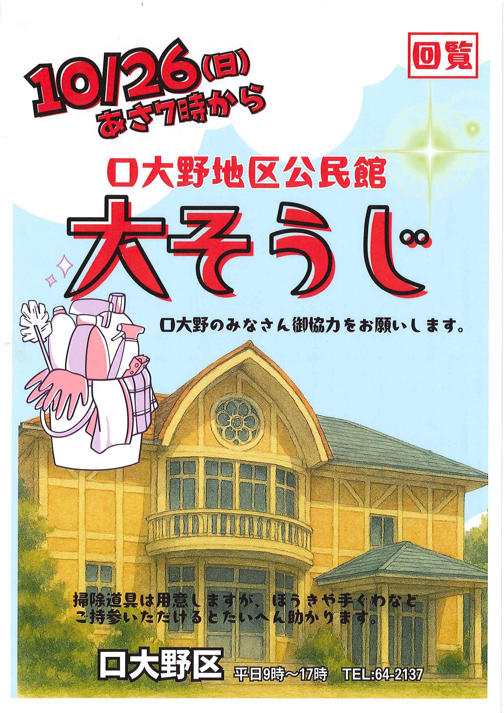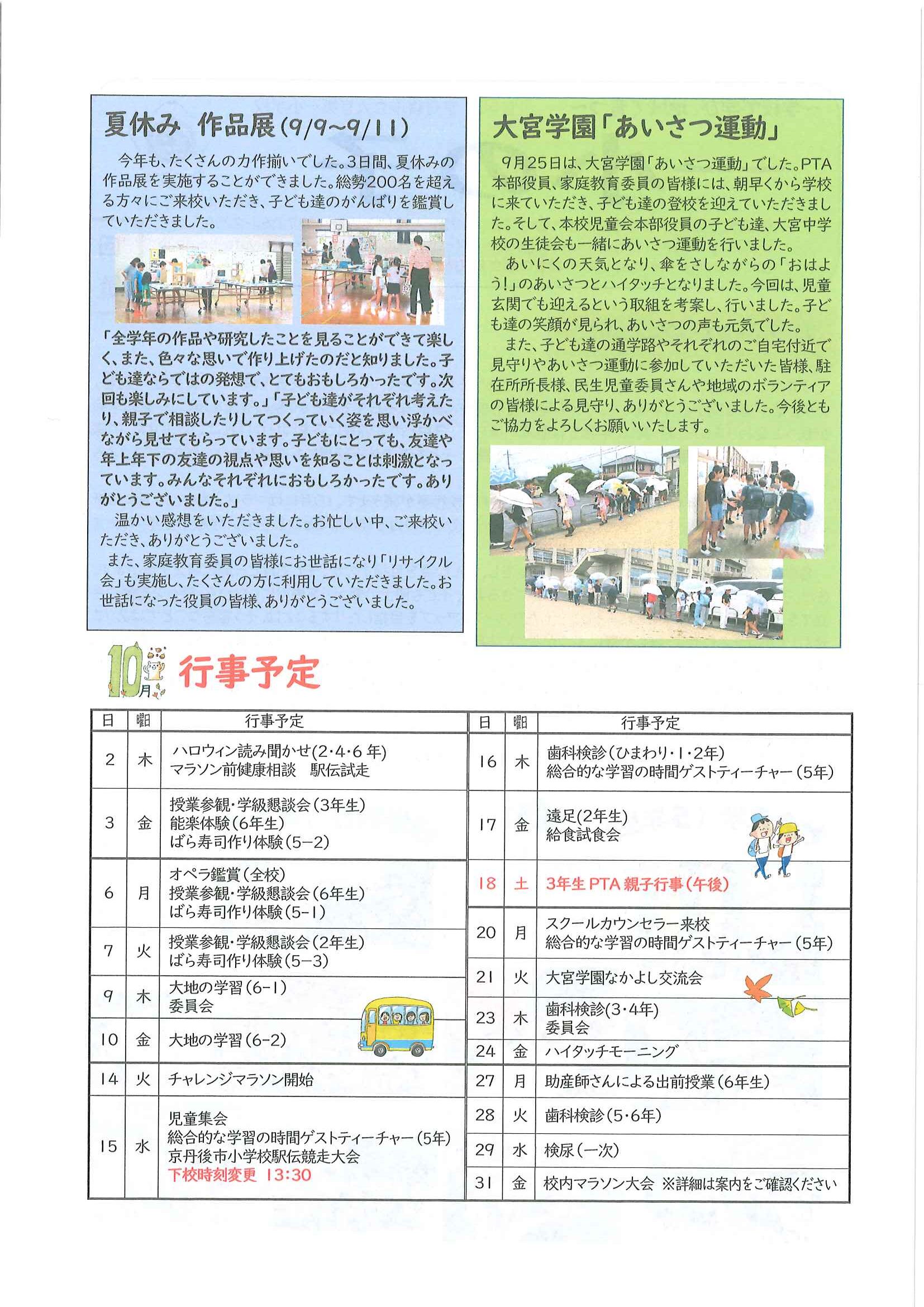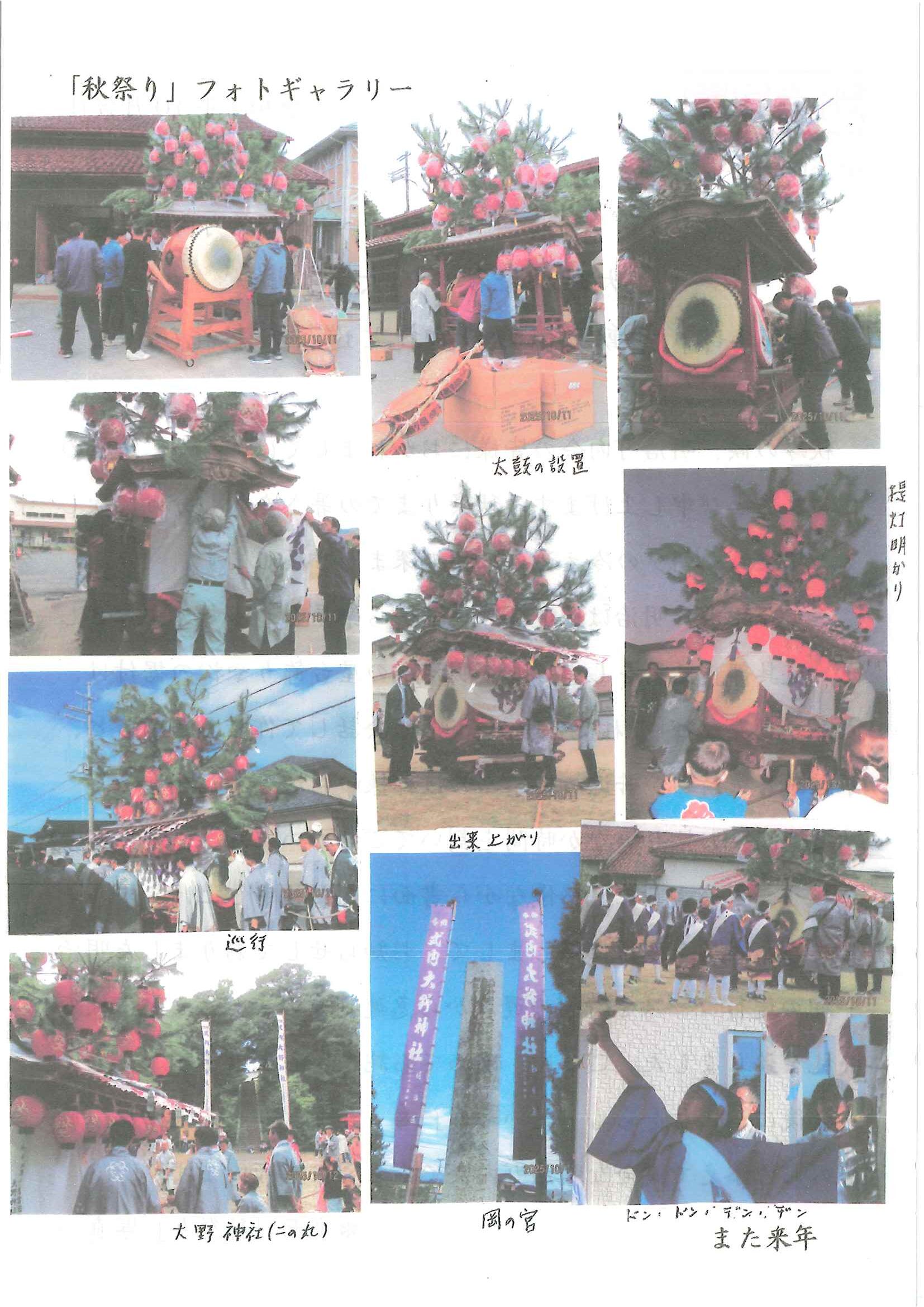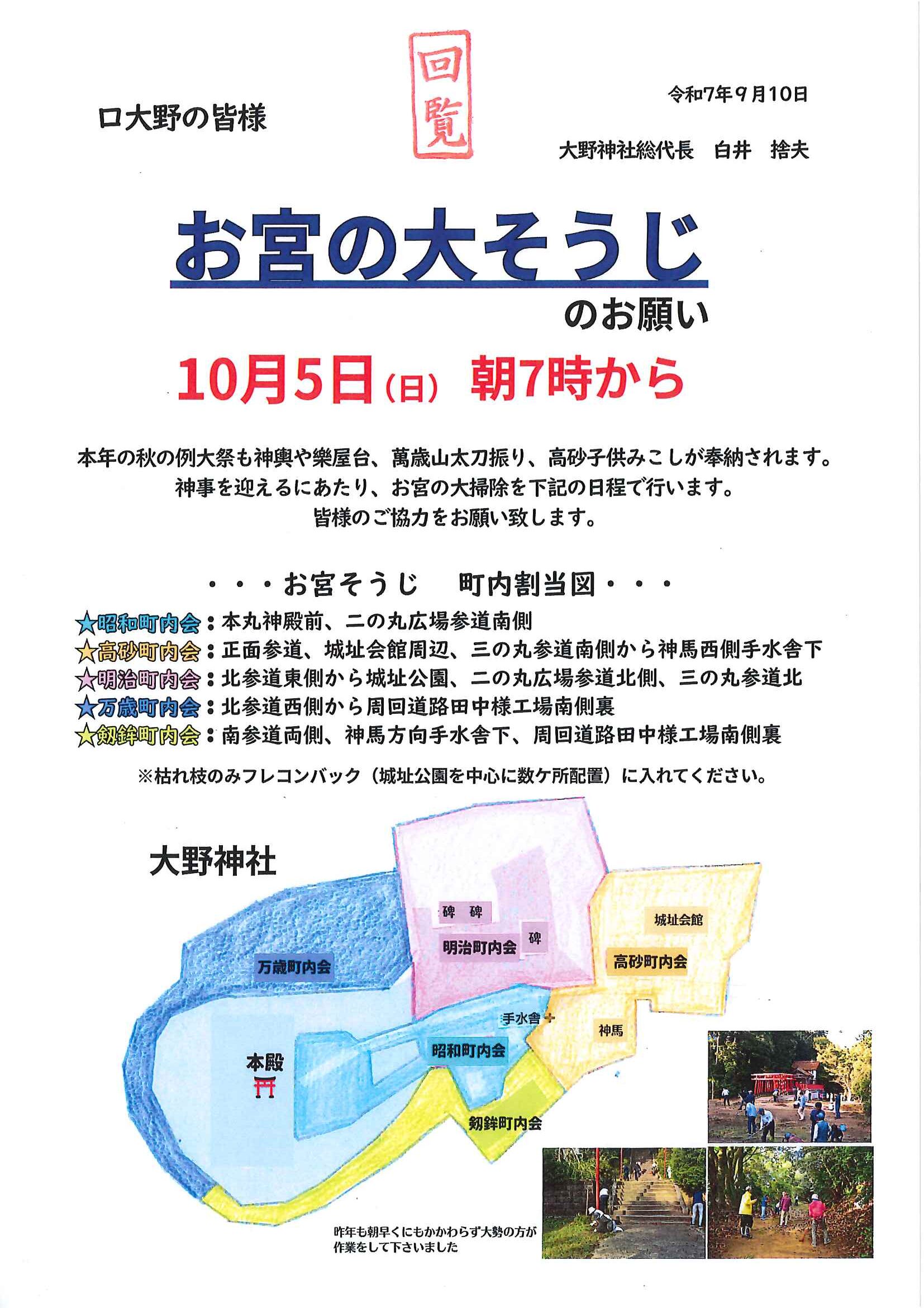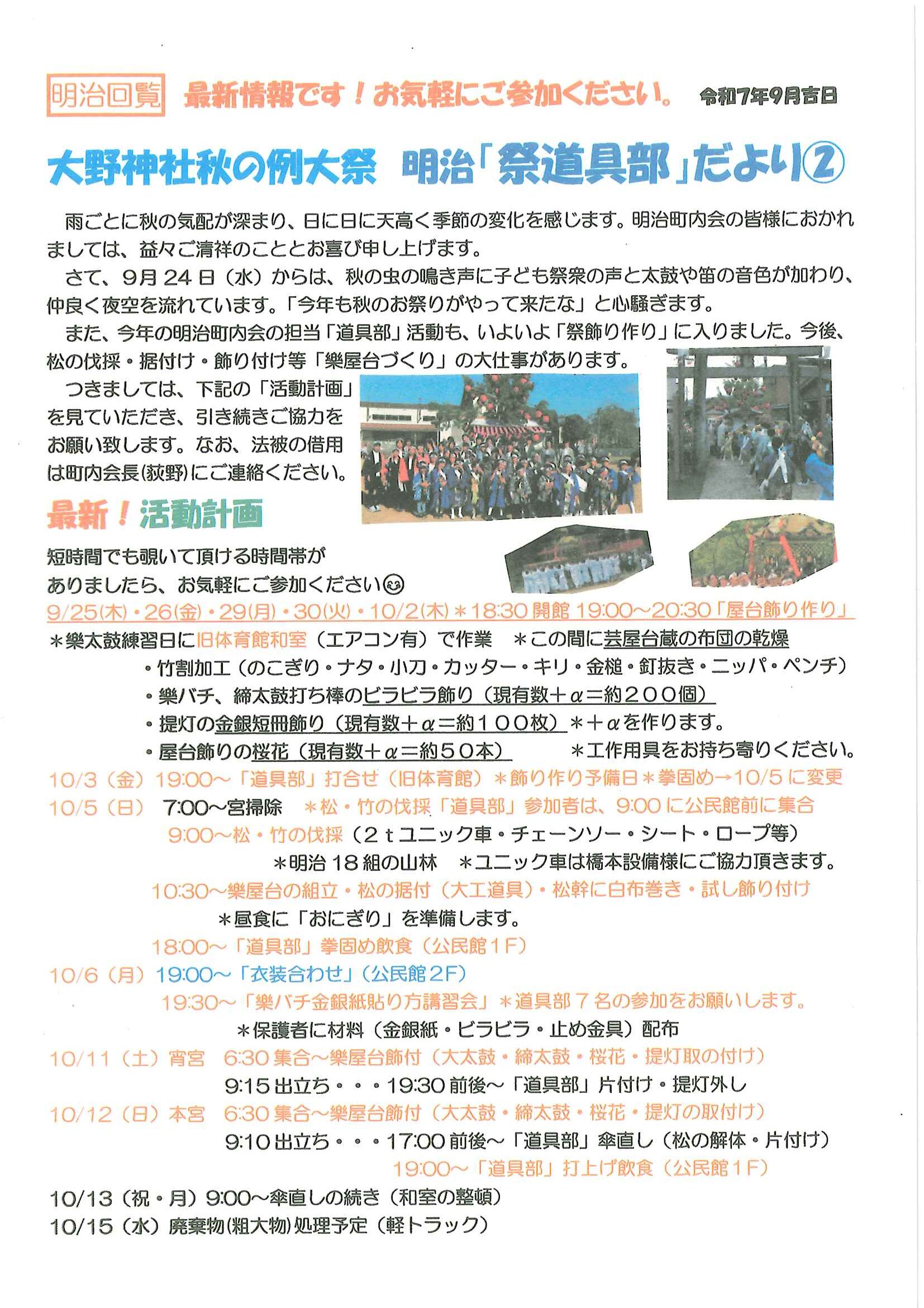 ・公民館大そうじのお願い ・10月ふれあいサロン<野外活動・遠足> ・10月にこにこサロン(子育てサロン) ・地区敬老会実行委員会から ・ハートフルフェスタみんなのつどい 裏面 ・定額減税補足給付金提出はお済みですか ・下水道工事予定表9/25- ・大宮市民局NEWSおおみやトピックス 裏面 ・大野神社歳時記No26 <各町内会から>・剱鉾町内会<樂太鼓町内花打ちについて> ・万歳町内会<太刀振り奉納に向けて第4弾> 日程表 ・高砂町内会<子供みこしのお知らせ> 巡行表 ・明治町内会<道具部だより> ・昭和町内会<秋祭りのご案内>