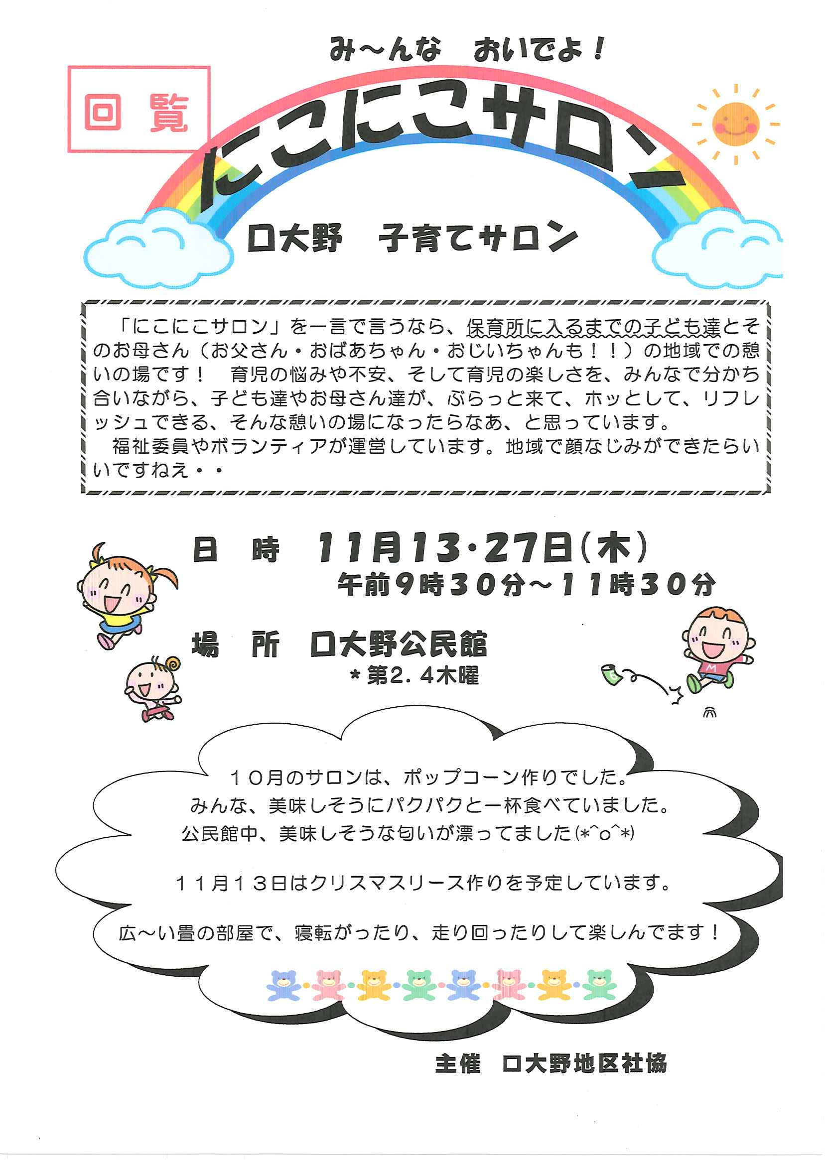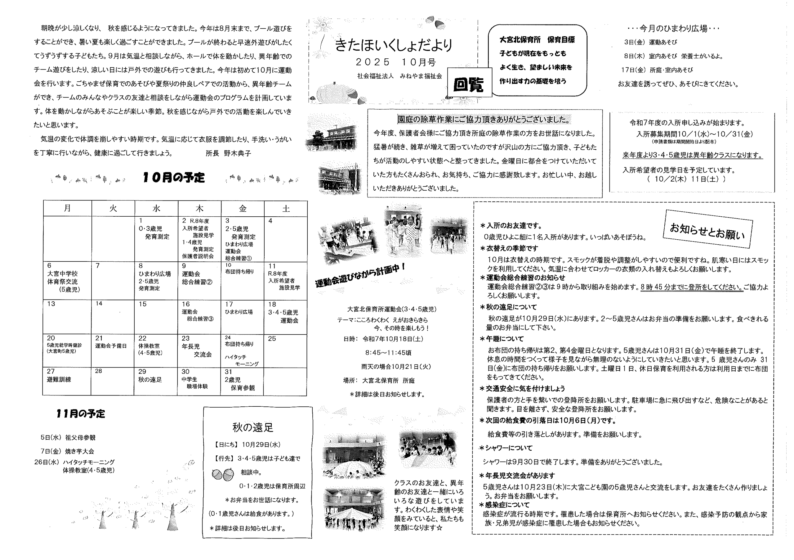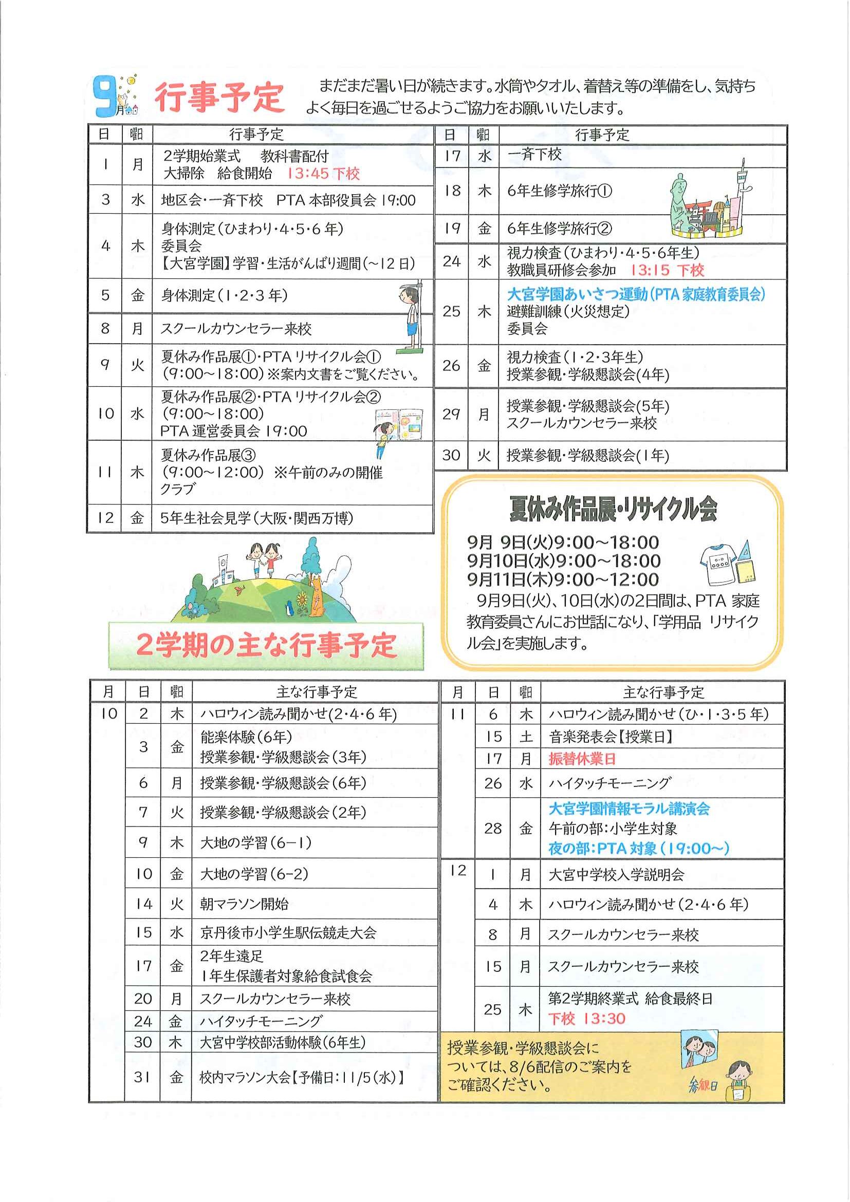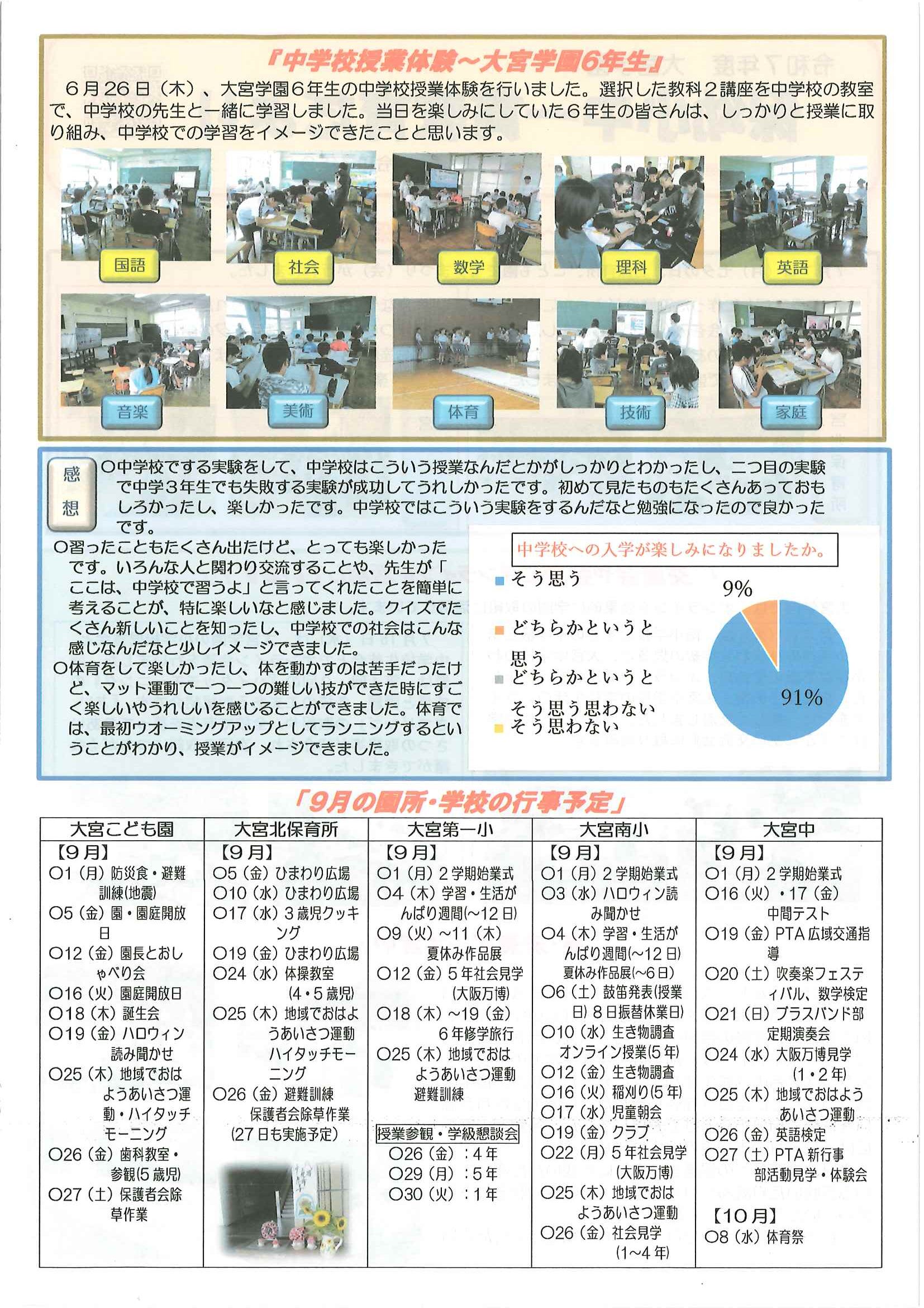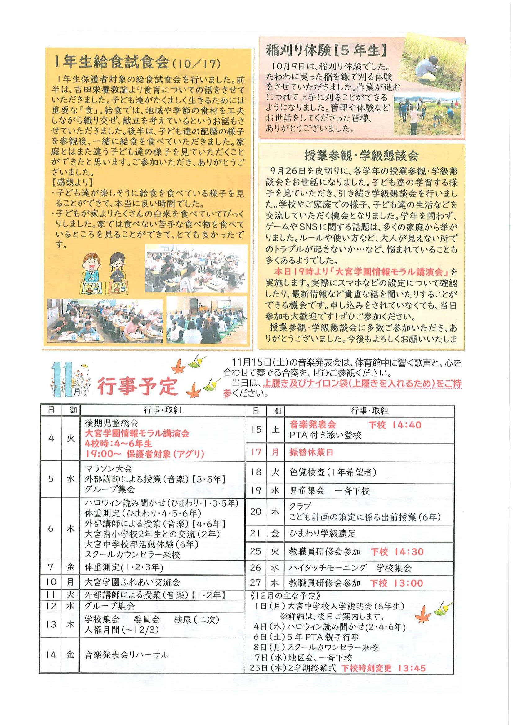 ・公民館大そうじのお願い ・10月ふれあいサロン<野外活動・遠足> ・10月にこにこサロン(子育てサロン) ・地区敬老会実行委員会から ・ハートフルフェスタみんなのつどい 裏面 ・定額減税補足給付金提出はお済みですか ・下水道工事予定表9/25- ・大宮市民局NEWSおおみやトピックス 裏面 ・大野神社歳時記No26 <各町内会から>・剱鉾町内会<樂太鼓町内花打ちについて> ・万歳町内会<太刀振り奉納に向けて第4弾> 日程表 ・高砂町内会<子供みこしのお知らせ> 巡行表 ・明治町内会<道具部だより> ・昭和町内会<秋祭りのご案内>