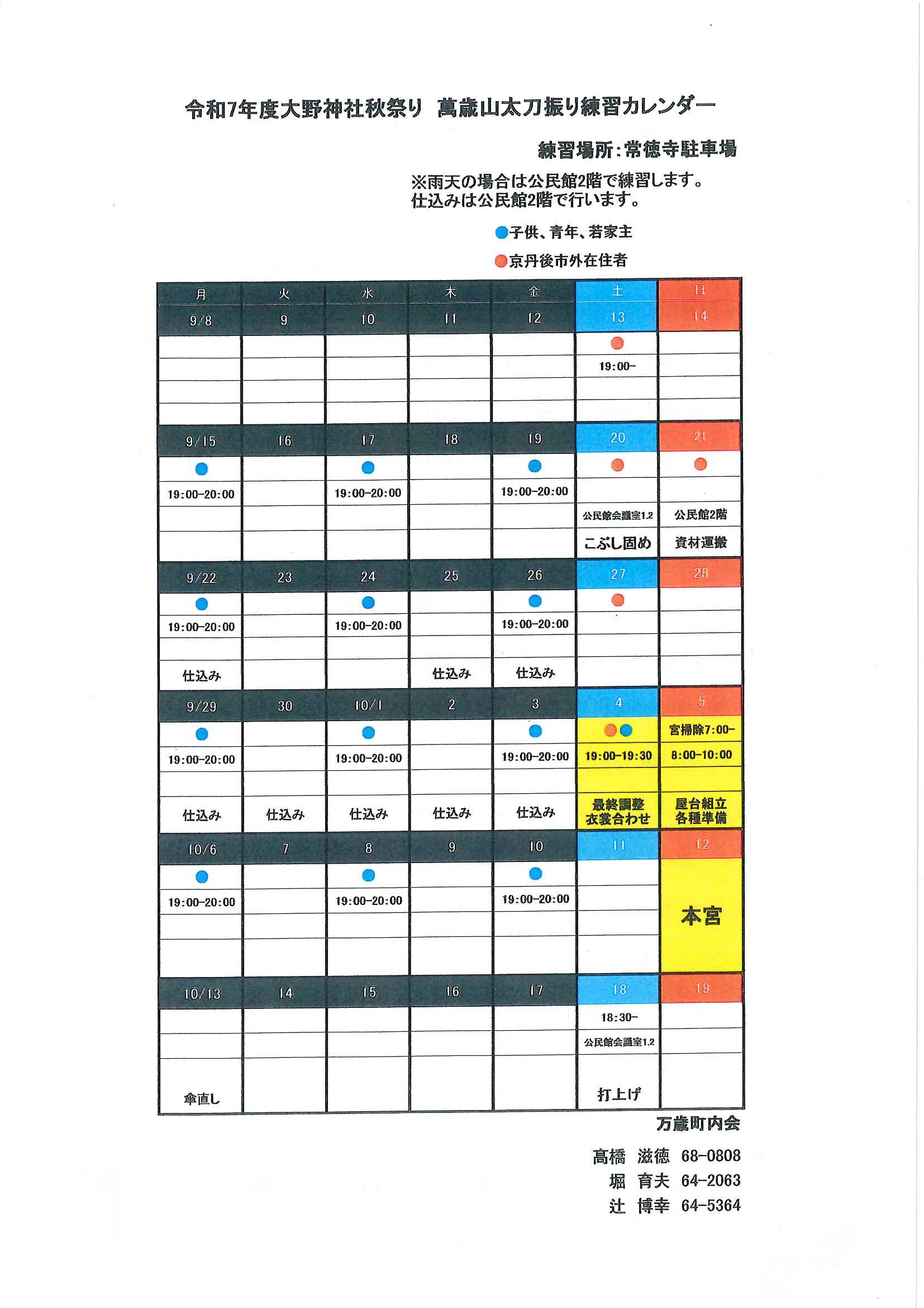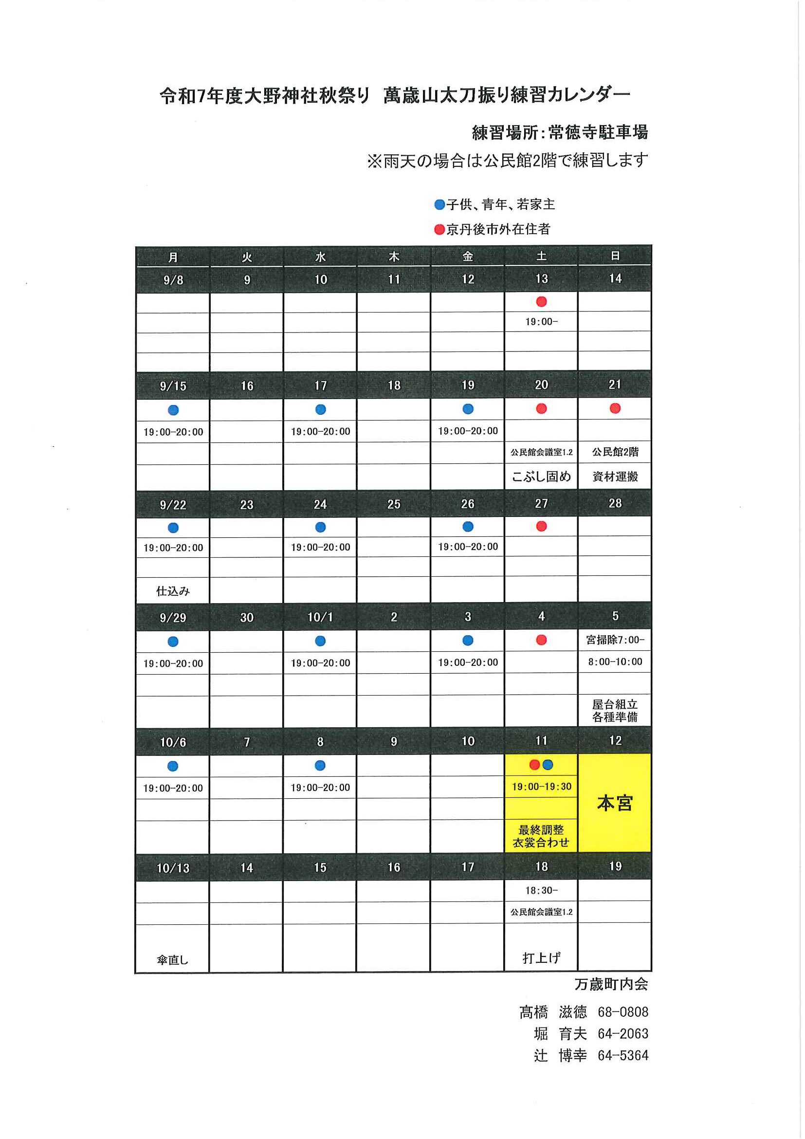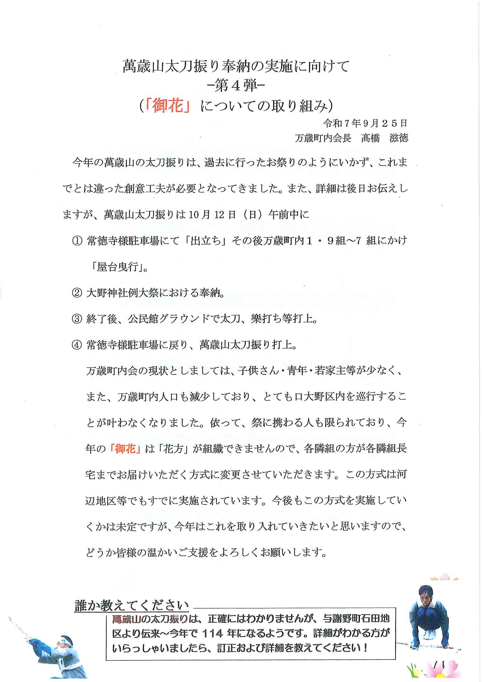 <万歳町内会あて>・太刀振り奉納の実施に向けて 練習等日程表