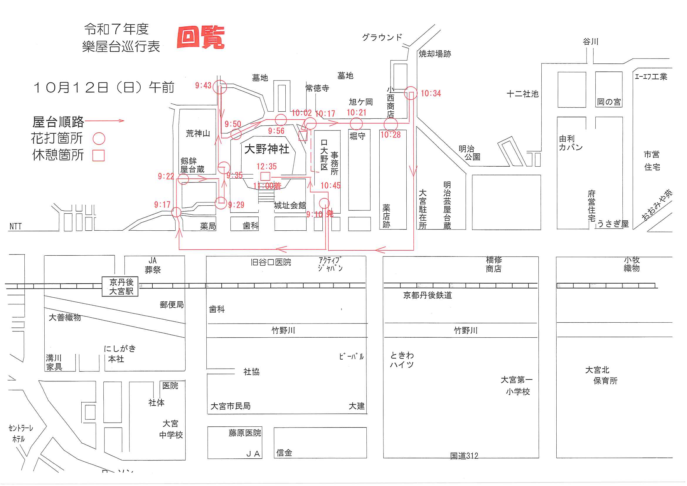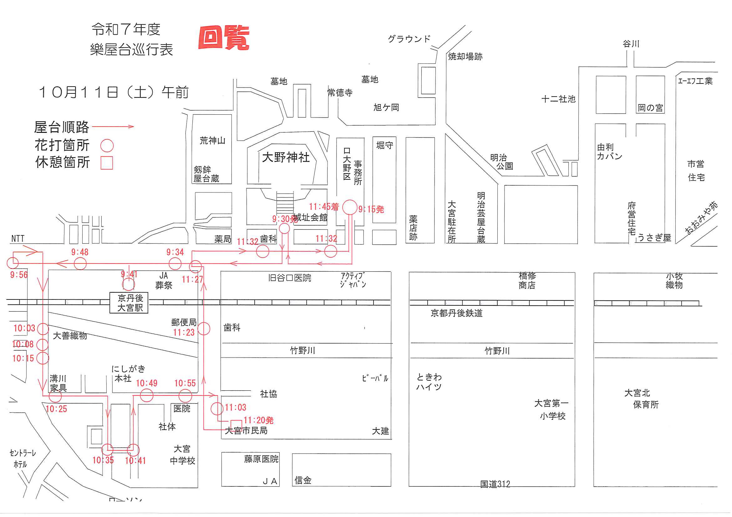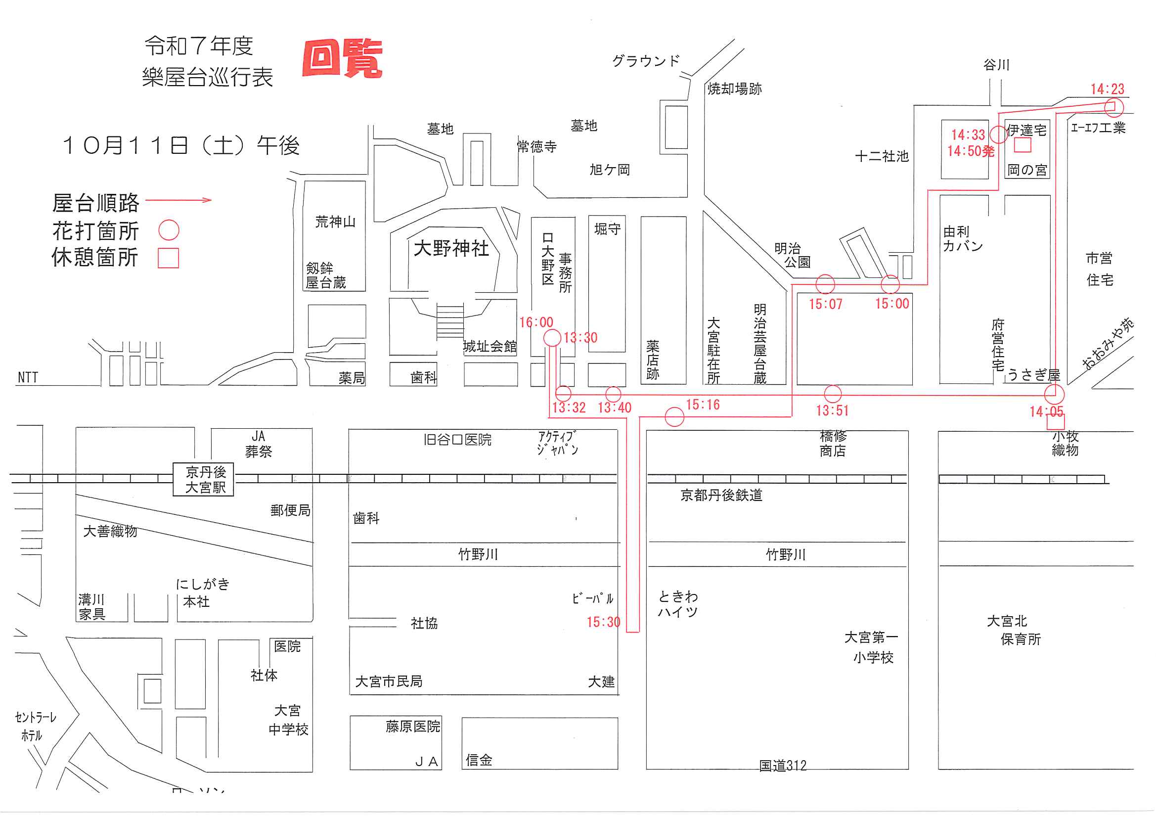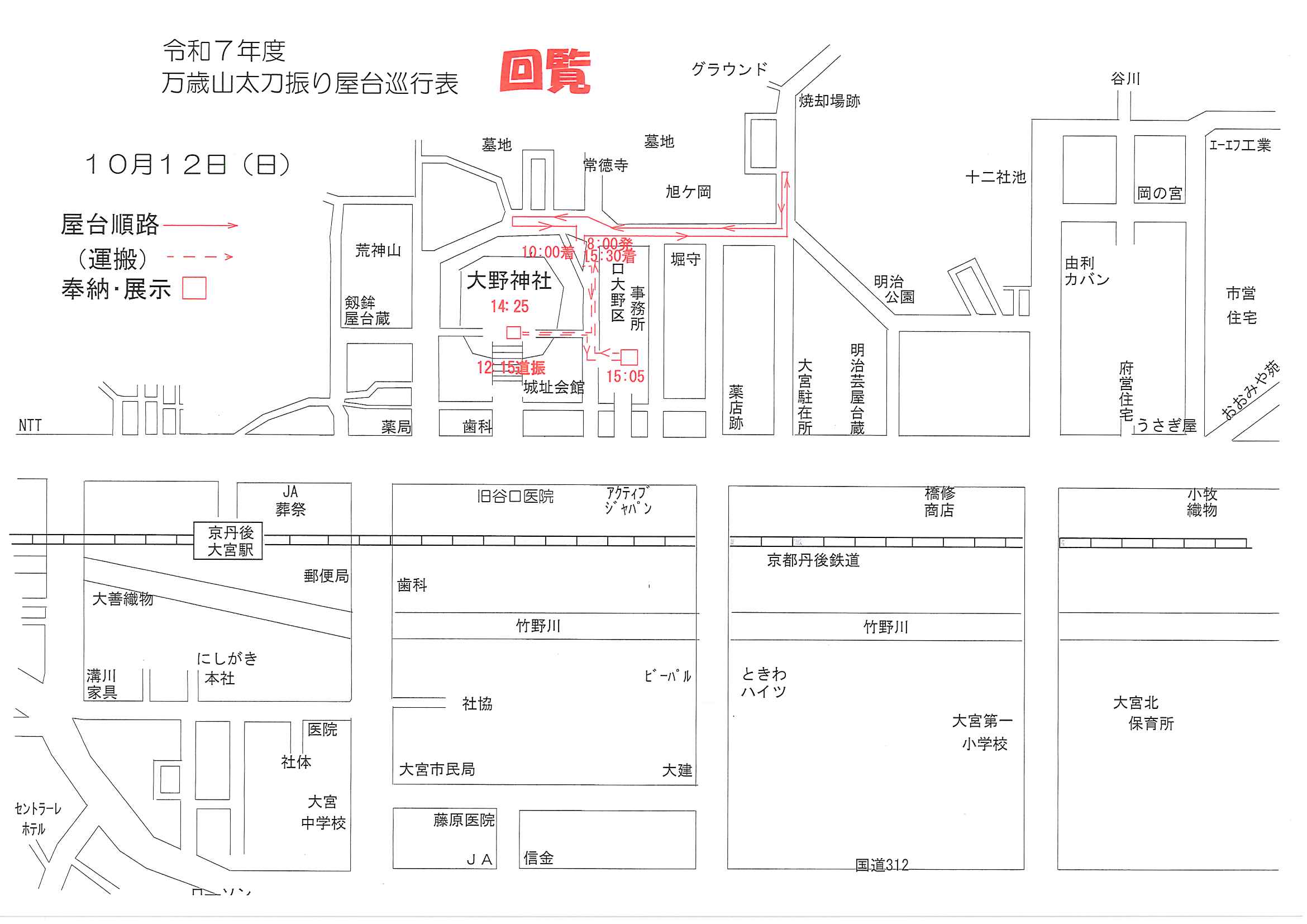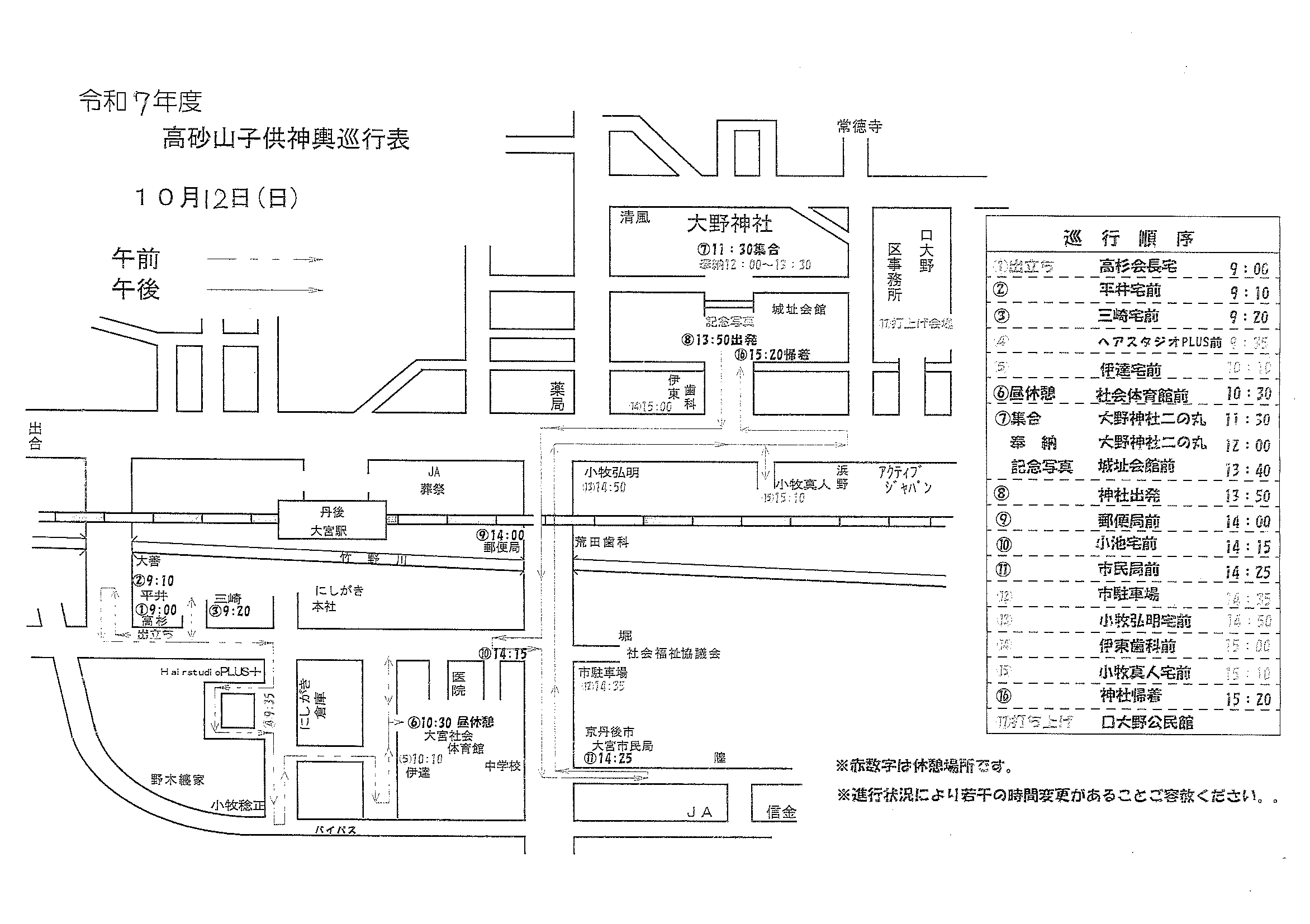 ★令和7年大野神社例大祭樂屋台・神輿等巡行表⇒ ①宵宮_午前 ➁宵宮_午後 ③本宮_午前 ④本宮_神輿 ⑤本宮_万歳山太刀振り