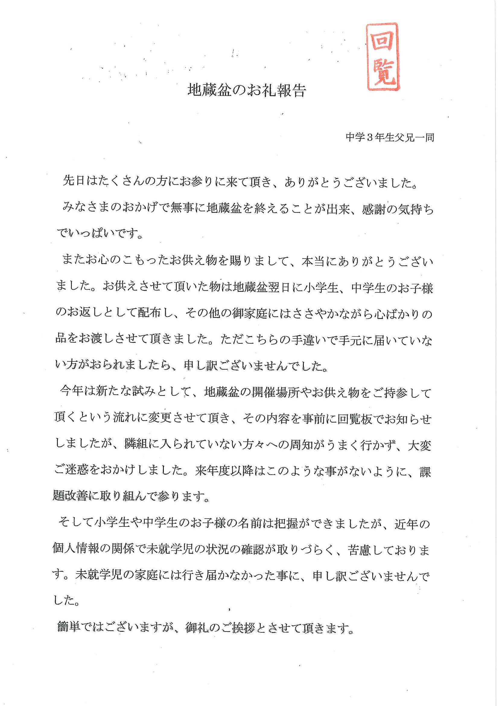 <高砂町内会あて>・地蔵盆のお礼報告 ・秋の例大祭こぶし固め