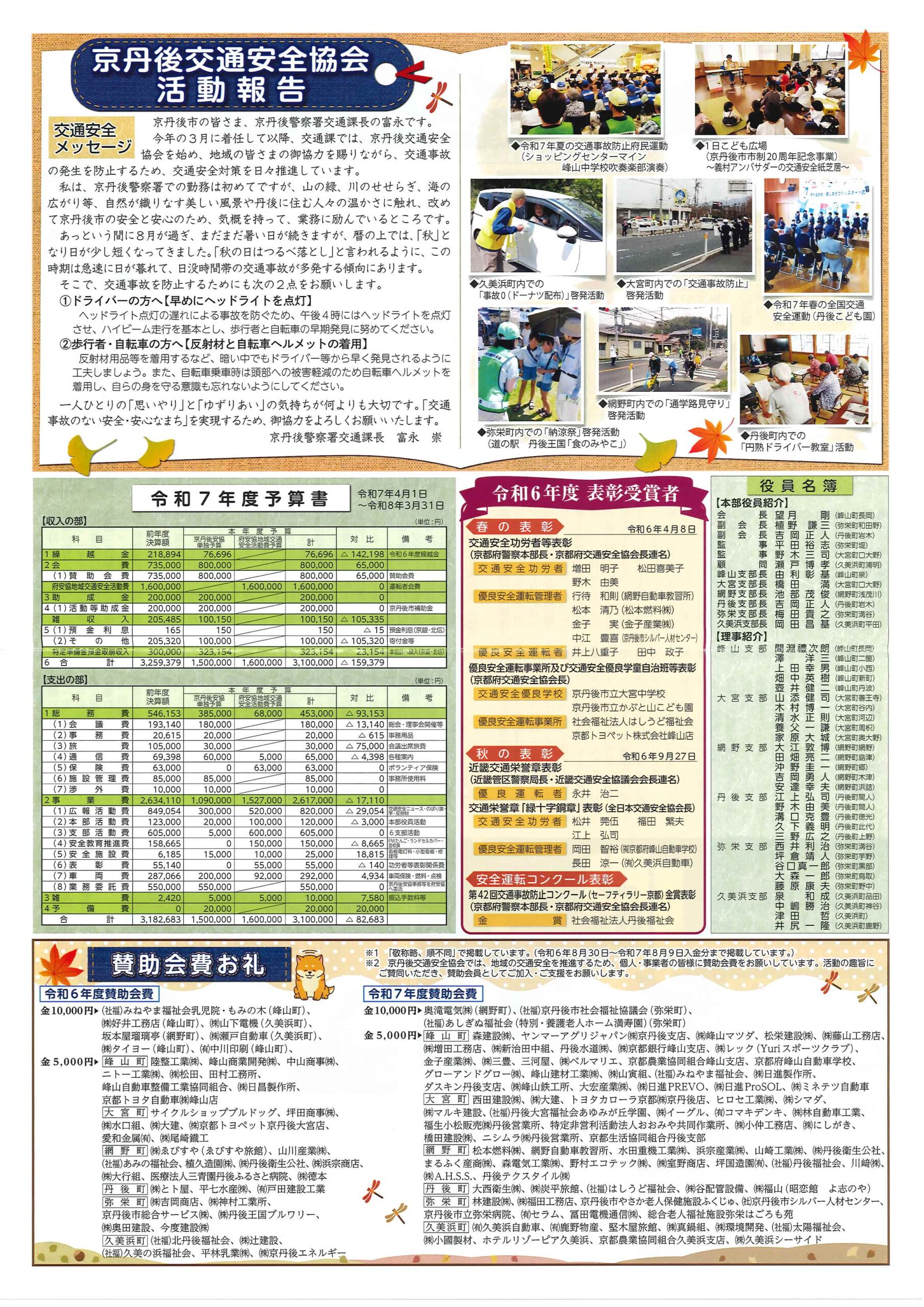 ・令和7年度口大野区一般会計歳入歳出予算書 ・令和7年度口大野地区公民館収支予算書 ・令和7年度大野神社会計収支予算書 裏面 ・4月ふれあいサロン ・口大野振興対策事業補助金について 裏面 ・口大野区民だより04_08号 ・大宮駐在所ミニ広報紙大宮パトロール ・丹後を語る番組地域おこしラジオ放送中 ・モルック体験会 ・一小の子 裏面 ・きたほいくしょだより