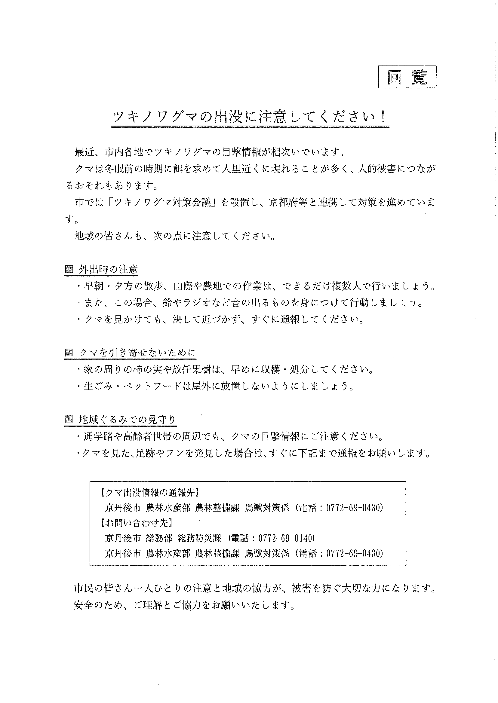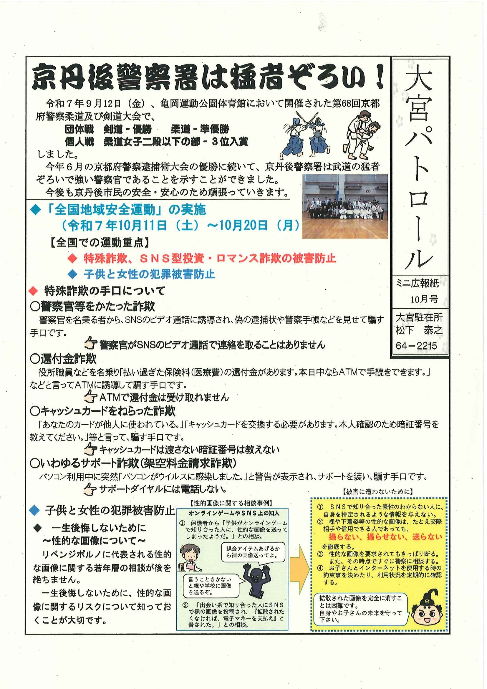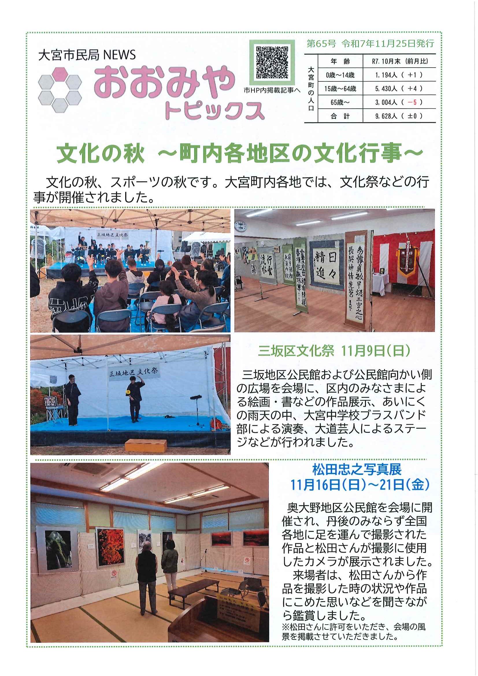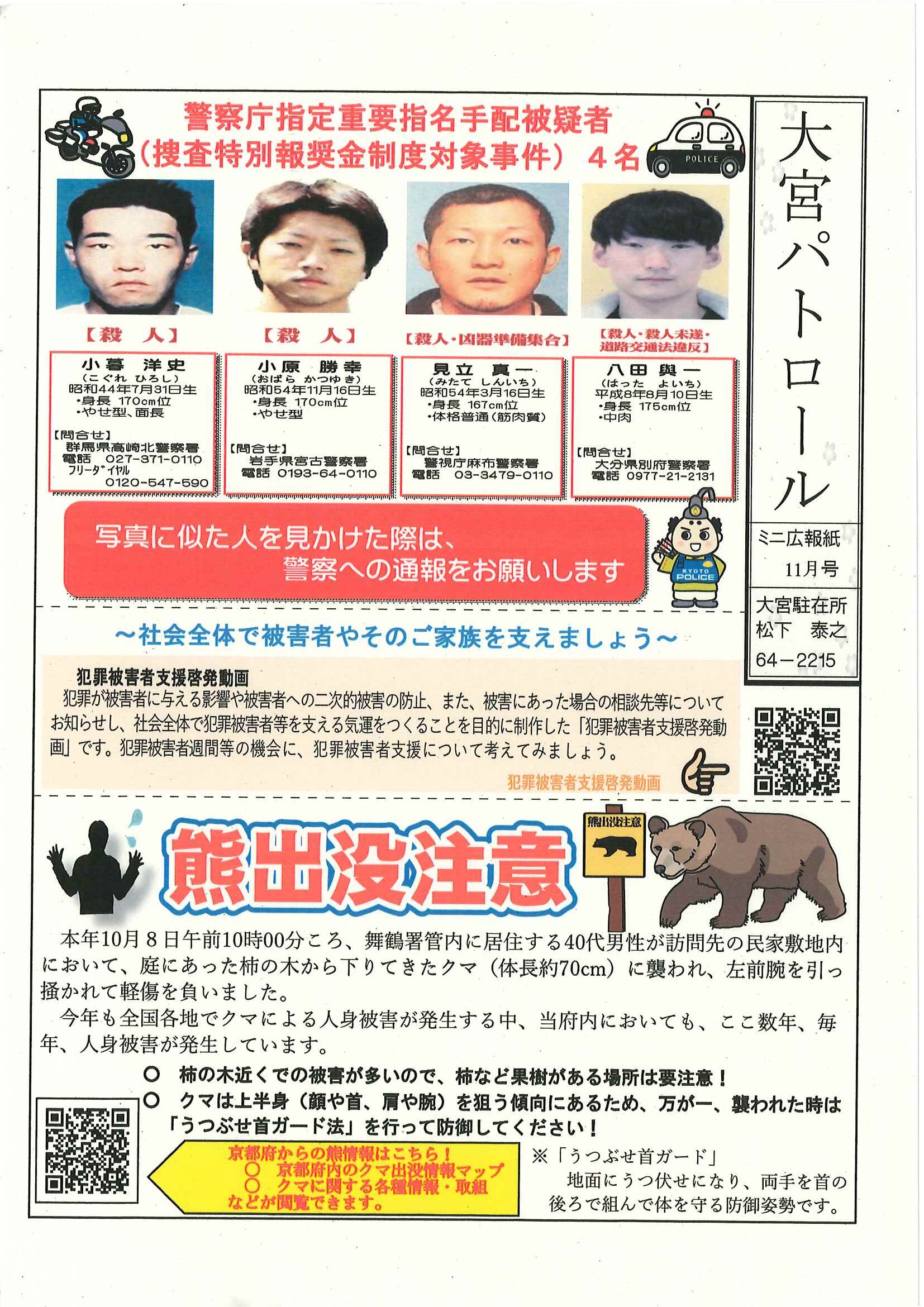 ・ツキノワグマの出没に注意 ・大野神社神札の注文 ・令和8年厄除け・健康長寿祈願祭のお知らせ ・11月ふれあいサロン ・ハロウィンおたのしみ会 ・令和7年度赤い羽根共同募金の集計 ・京丹後公共ライドシェアマイカー活用について 裏面 ・スマホでぽちっと申告 裏面 ・6つのまちの未来を描こう 裏面 ・大宮駐在所ミニ広報紙大宮パトロール ・ほっとはあと製品展&障害者週間記念作品展 ・口大野井堰(山本川)改修工事について 裏面 ・保幼小中一貫教育だより 裏面 ・一小の子 裏面 ・きたほいくしょだより