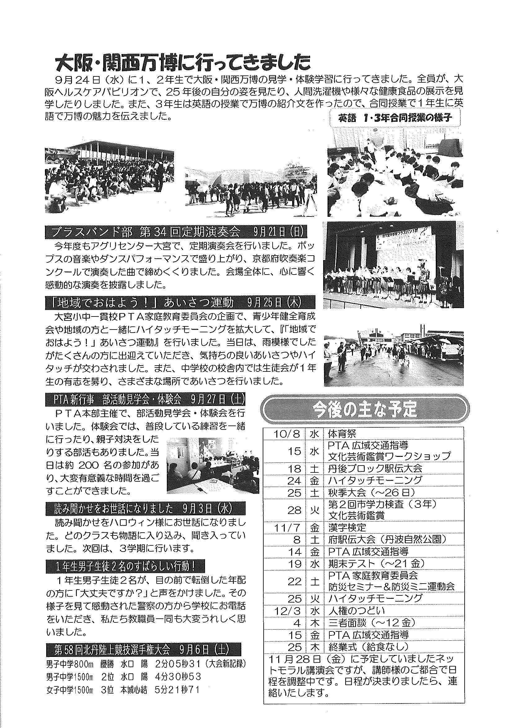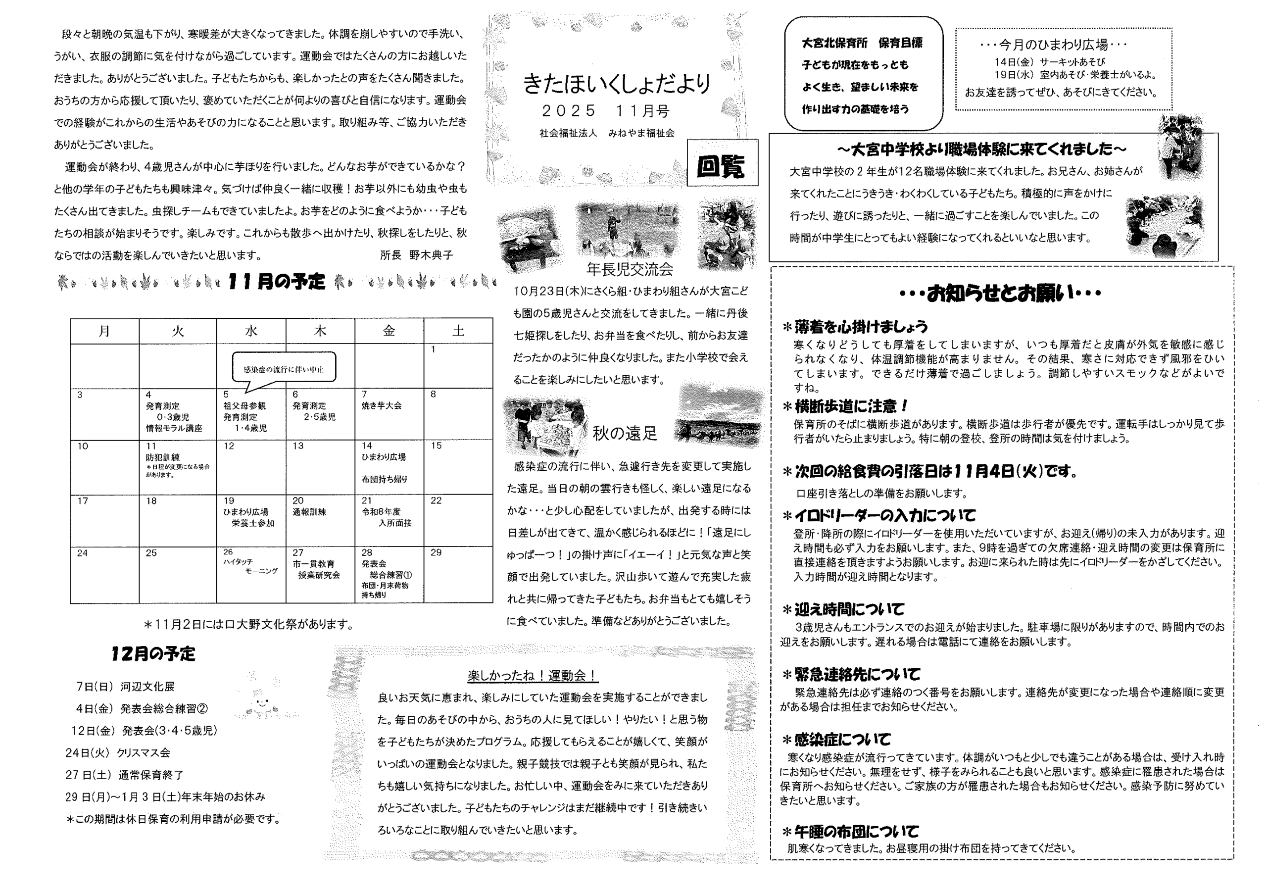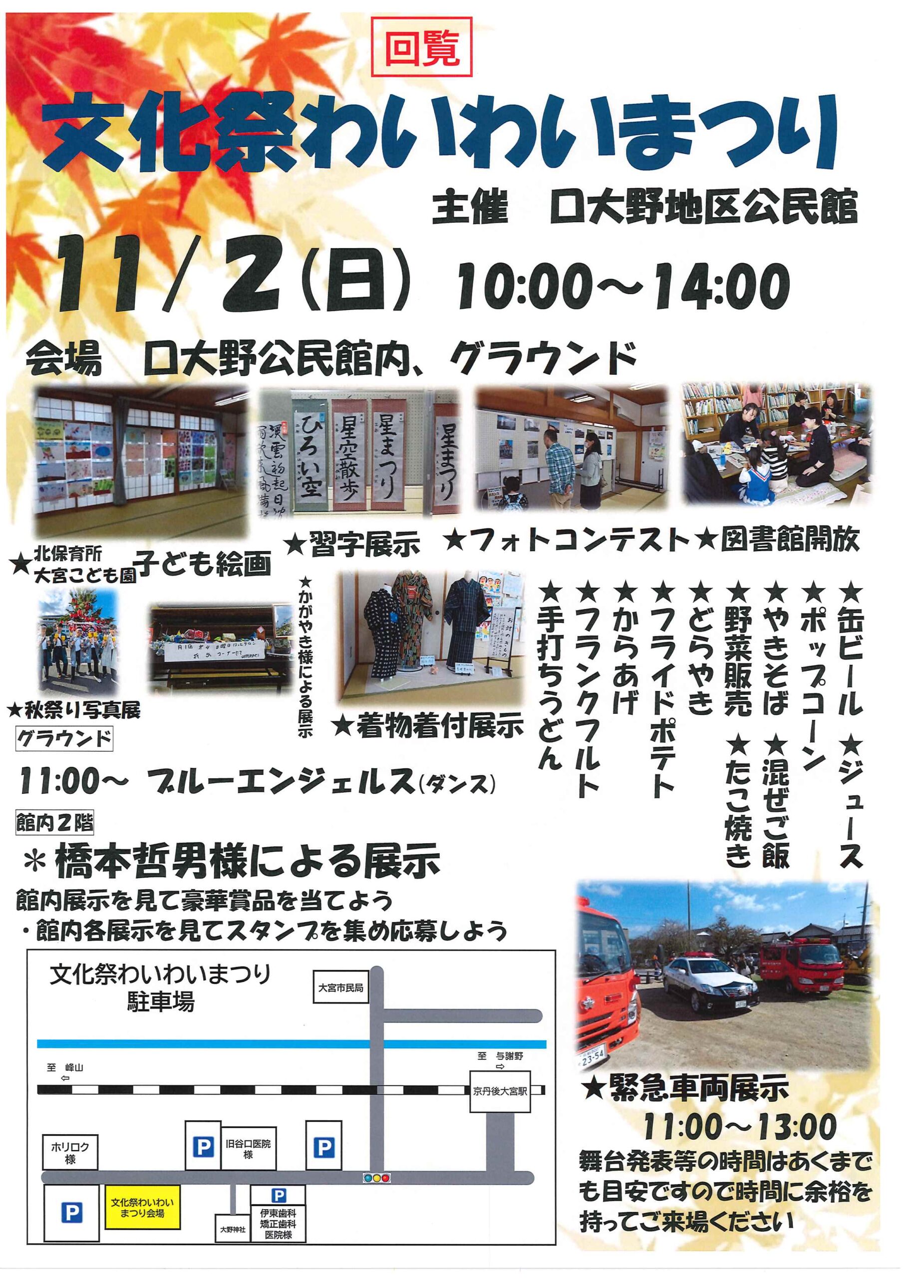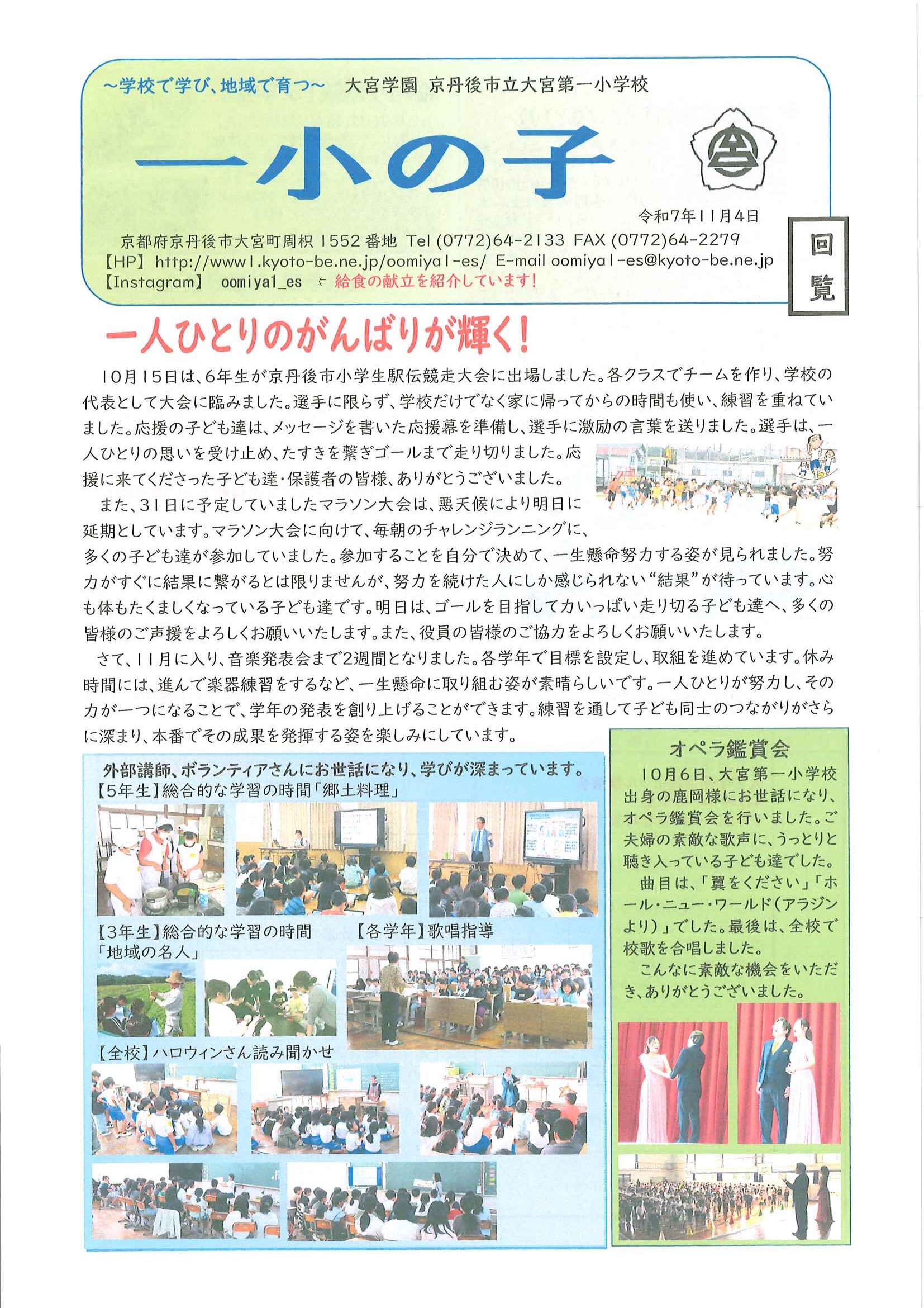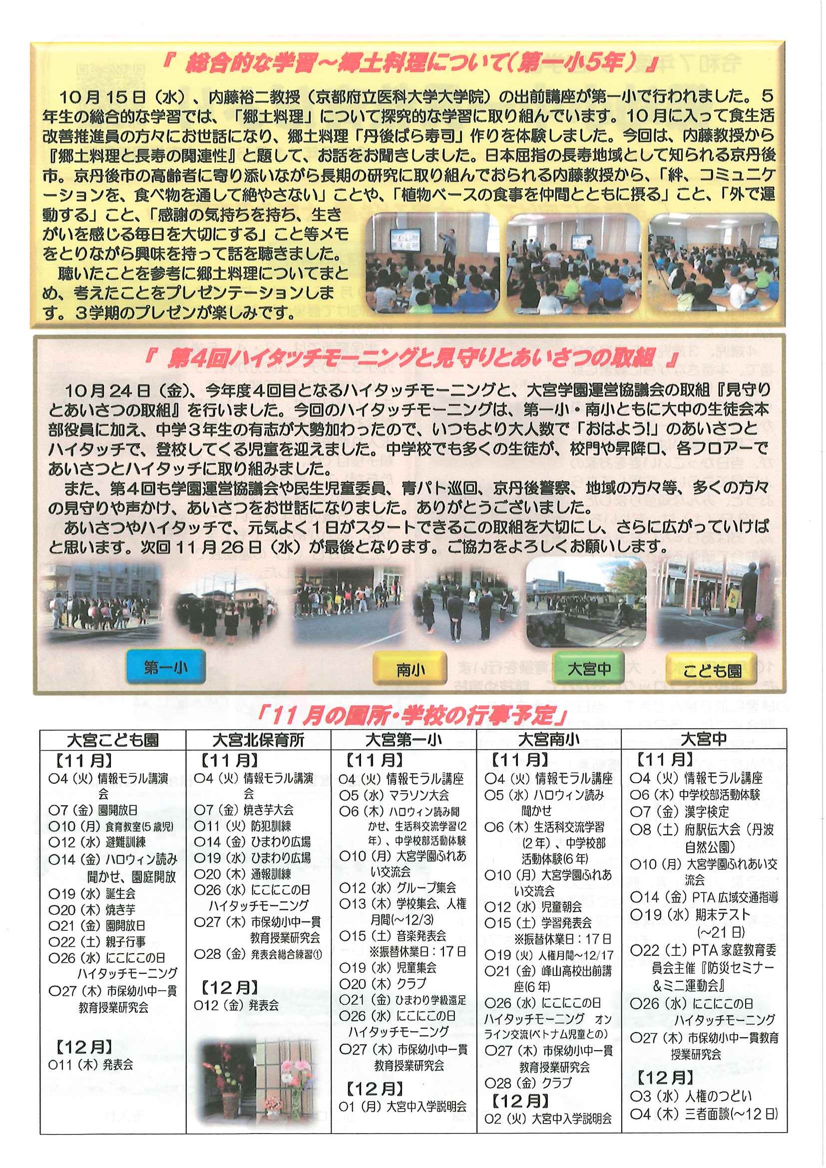・ツキノワグマの出没に注意 ・大野神社神札の注文 ・令和8年厄除け・健康長寿祈願祭のお知らせ ・11月ふれあいサロン ・ハロウィンおたのしみ会 ・令和7年度赤い羽根共同募金の集計 ・京丹後公共ライドシェアマイカー活用について 裏面 ・スマホでぽちっと申告 裏面 ・6つのまちの未来を描こう 裏面 ・大宮駐在所ミニ広報紙大宮パトロール ・ほっとはあと製品展&障害者週間記念作品展 ・口大野井堰(山本川)改修工事について 裏面 ・保幼小中一貫教育だより 裏面 ・一小の子 裏面 ・きたほいくしょだより