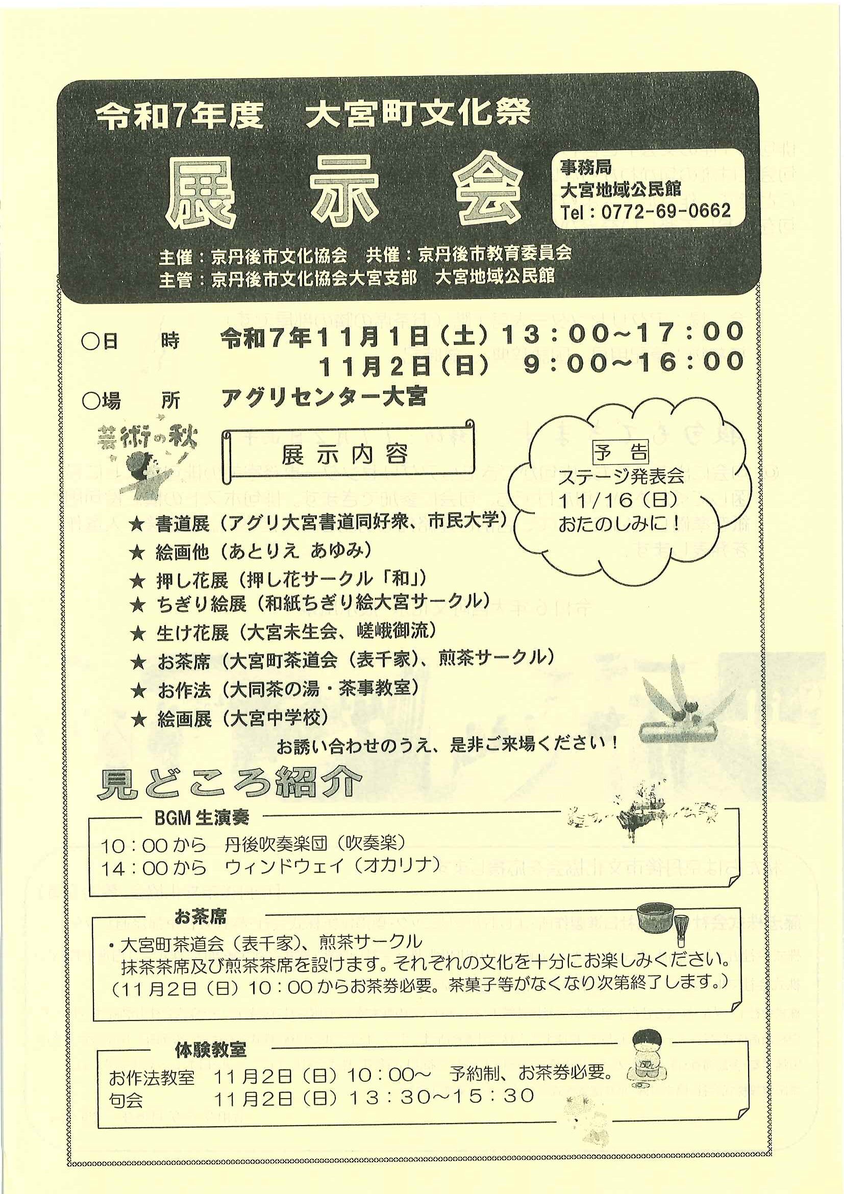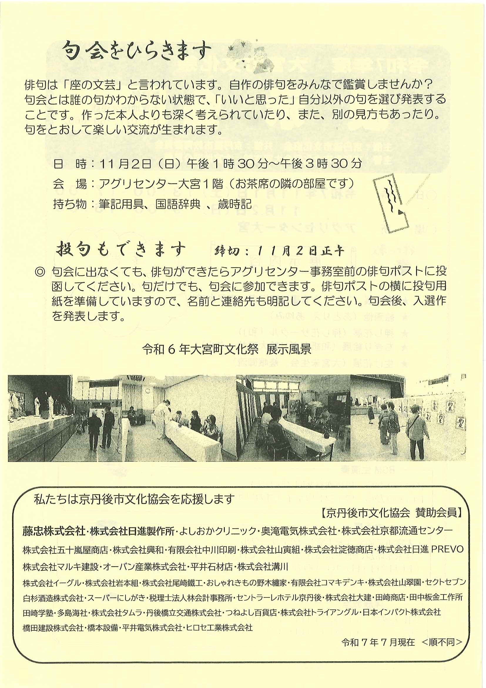 <10月27日> ・広報京丹後11月号 ・京丹後市職員(医療技術)採用試験案内 ・きょうたんご就職フェア2025 裏面 ・市民と議会の懇談会 ・健康教室「正しい姿勢」を意識していますか ・歳末たすけあい募金にご協力ください ・歳末お見舞金のご案内 ・府民公開講座(北部医療センター) ・大宮町文化祭ステージ発表会 裏面 ・丹後文化会館だより たんぶん 裏面 ・火の用心ステッカー ・歳末たすけあい募金のお願い ・文化祭わいわいまつり ・にこにこサロン11月(子育てサロン) ・大野神社歳時記第27号 ・ノルディックで歩こう会 裏面 ・大学駅伝交通規制への協力のお願い ・下水道工事の予定表10/25- ・わたしの未来発見理工チャレンジ教室 ・日米交流音楽会 ・丹後を語る番組 地域おこしラジオ ・口大野図書館ハロウィンだより ・大宮市民局NEWSおおみやトピックス <各町内会から>➀高砂町内会:町内会グラウンドゴルフ参加者募集 ➁万歳町内会;例大祭の御礼 ③明治町内会;例大祭道具部協力御礼 裏面